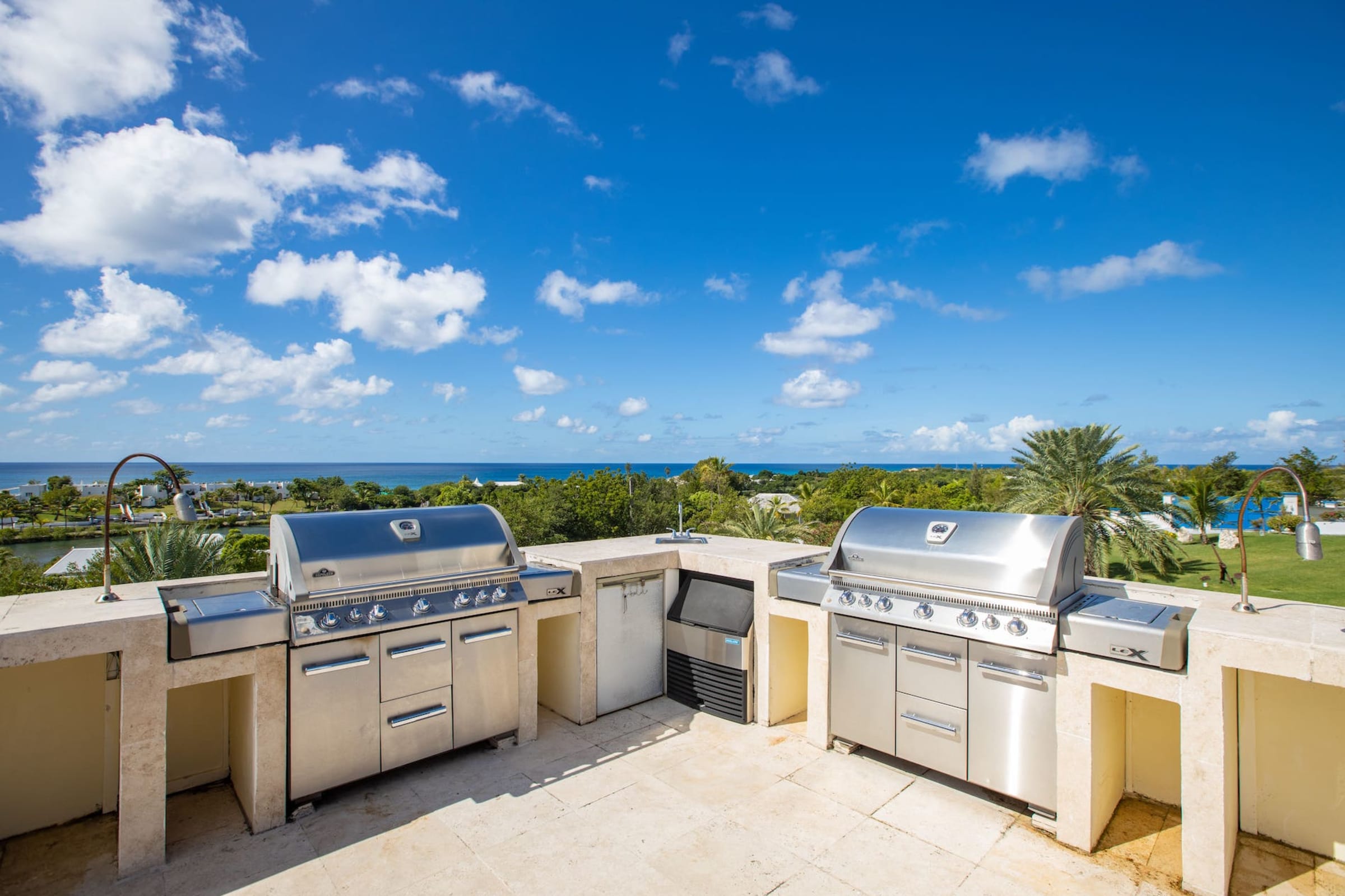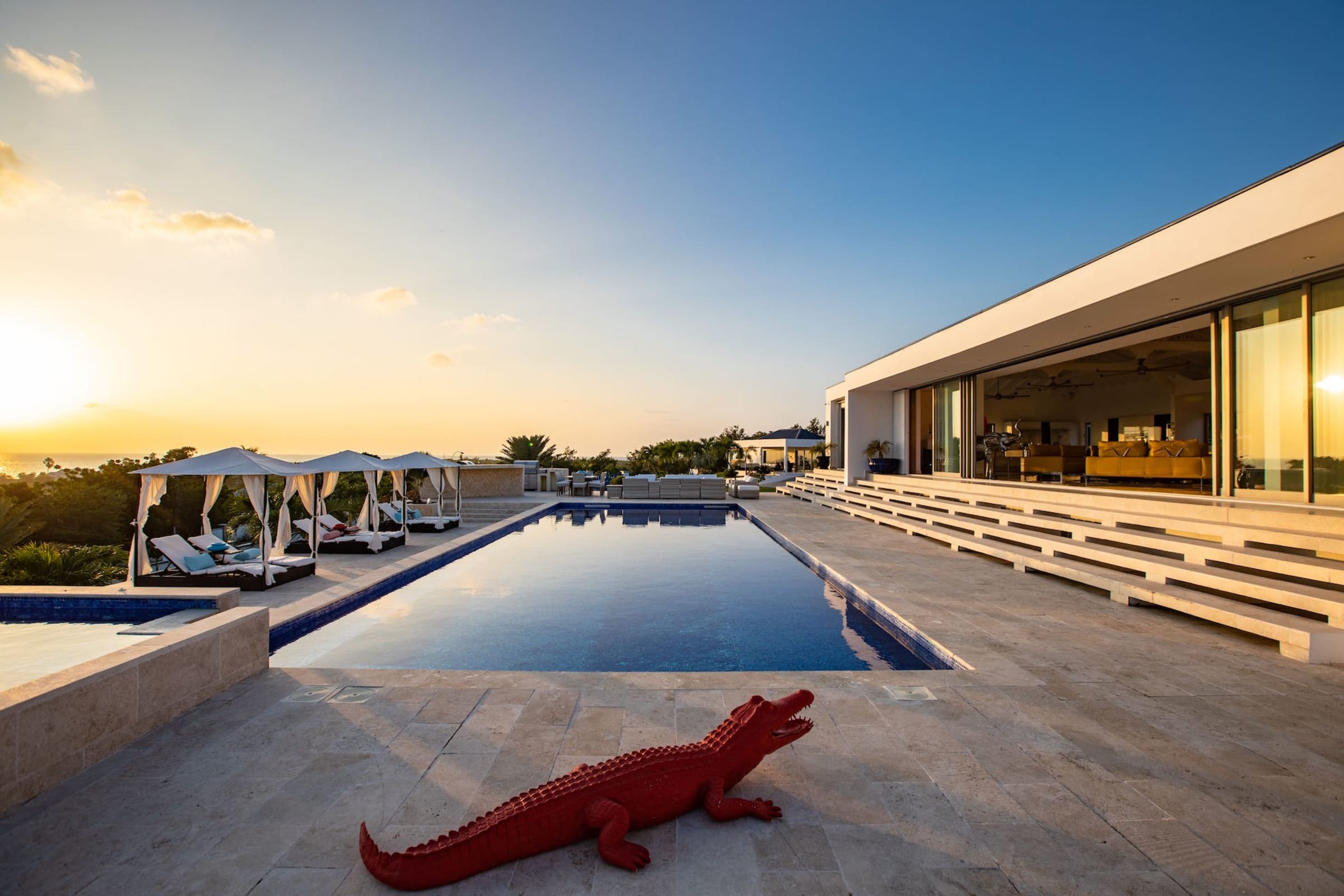 Villa El Grande Azure is a property with stunning views of the Caribbean Sea. It offers a total of 5 bedrooms, each equipped with its own ensuite bathroom. Four of the bedrooms have interior access within the main villa, while the fifth bedroom is located in a separate bungalow that includes its own kitchen.