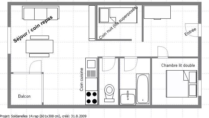 Rented for 4 to 6 people, it consists of an entrance hall, a sleeping area with two bunk beds, a bedroom with a double bed, a bathroom with separate toilet, a kitchen area open to the living room equipped with a bench seat + pull-out bed.