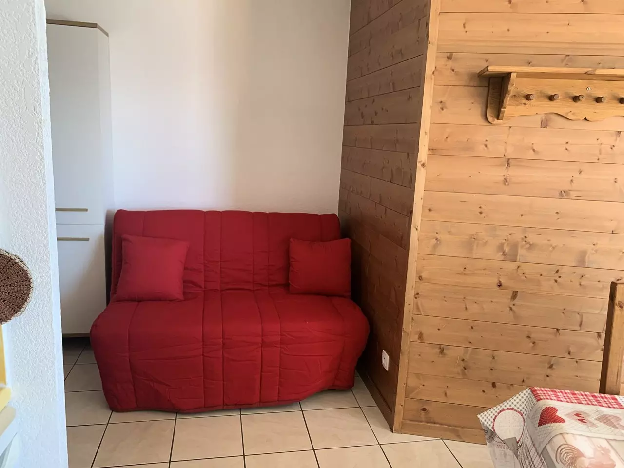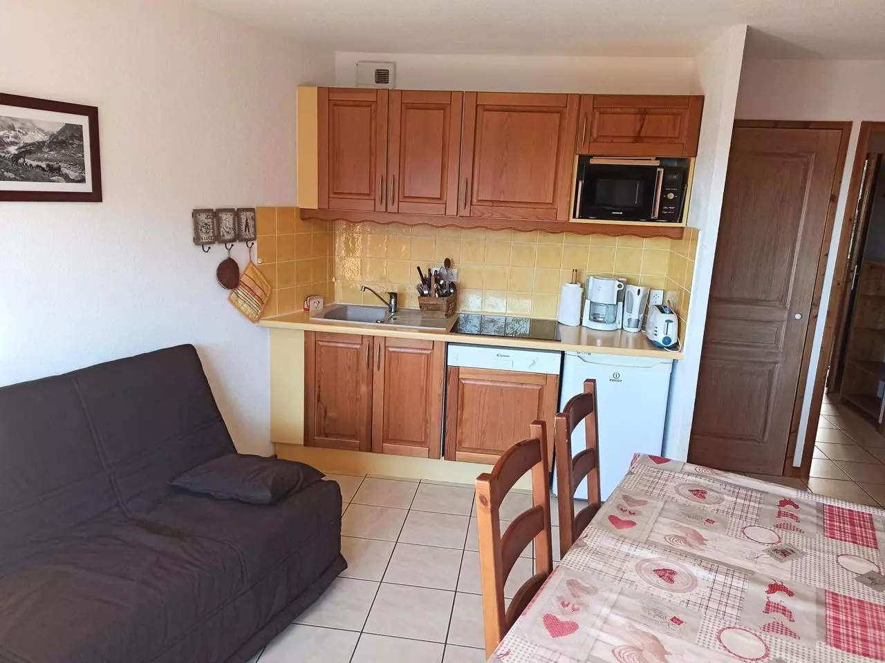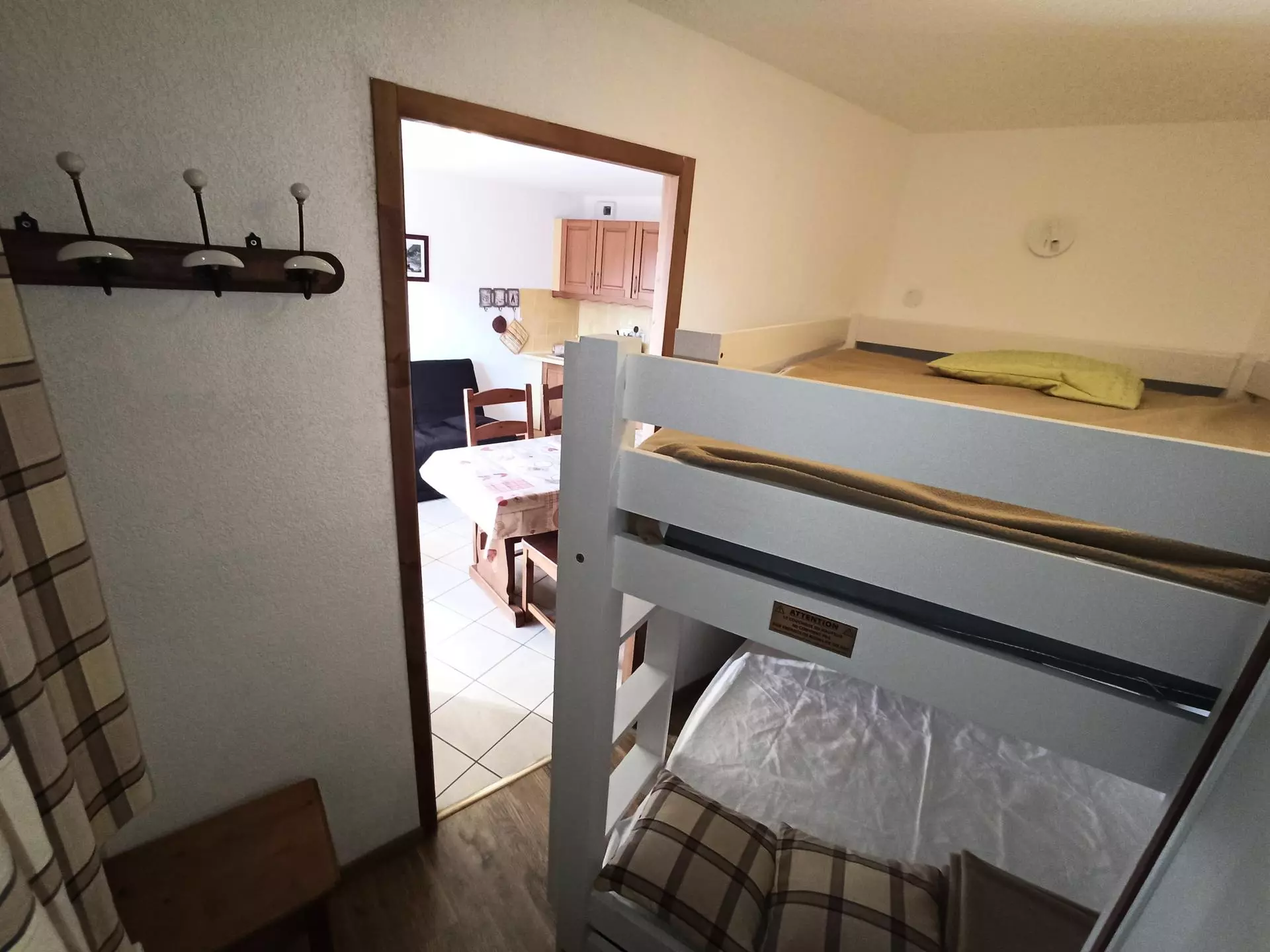 This property is composed of an entrance hall, a bathroom with bathtub and separate WC, a living room with open-plan kitchen, a bedroom with a double bed and a single bed on top, as well as a sofa bed in the living room.