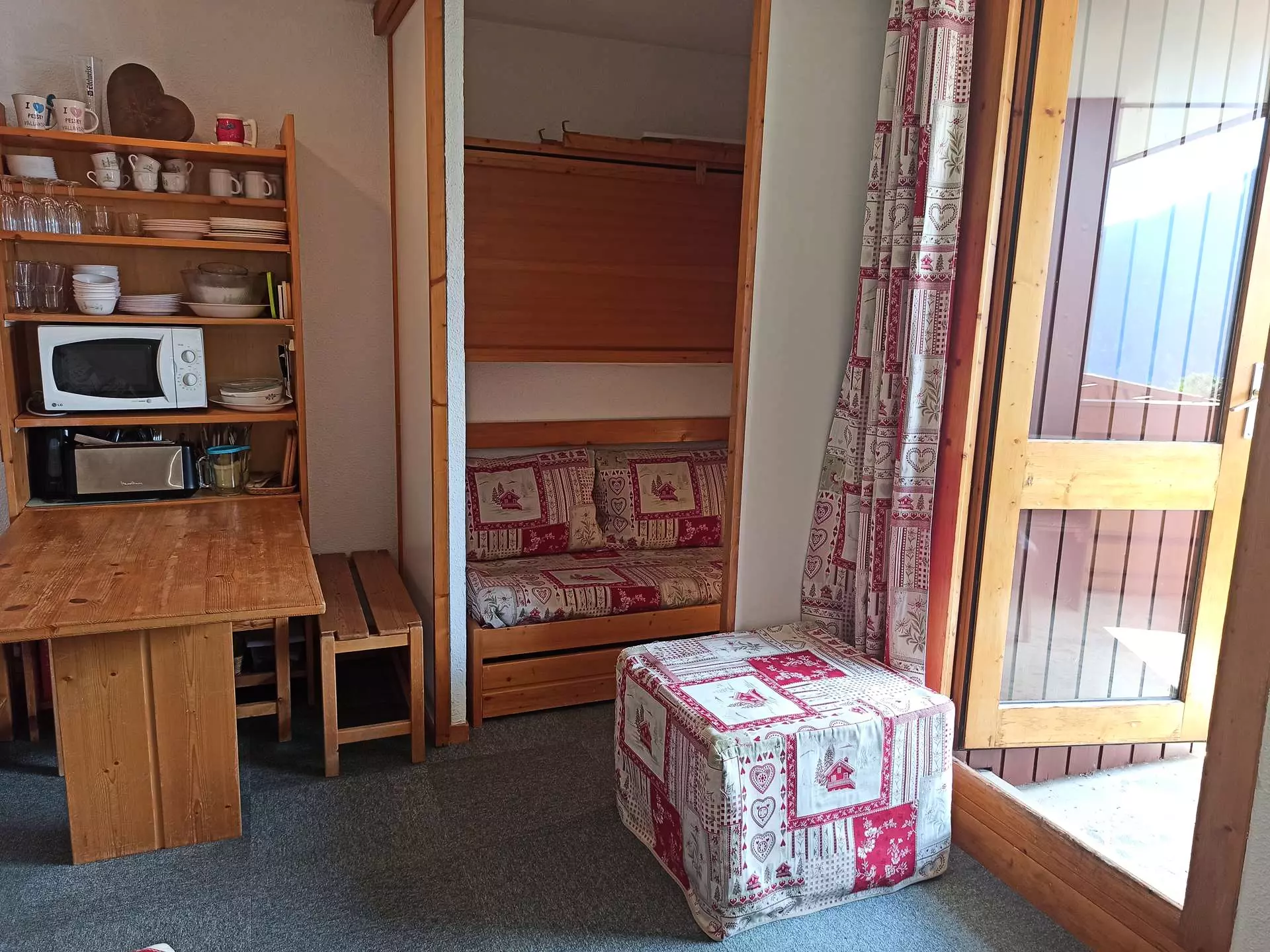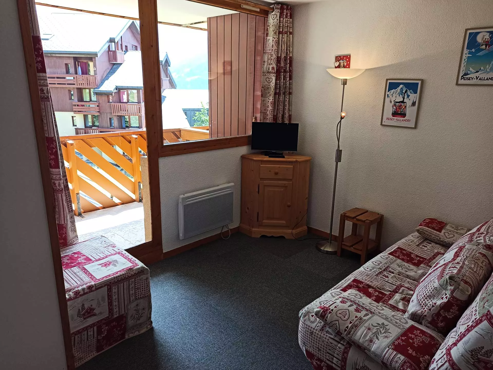 Located in a residence offering direct access to the slopes, this apartment of approximately 25m² is composed of a living room equipped with a convertible sofa with a kitchen area opening onto the balcony, a bathroom with bathtub and separate WC, a cabin with a single bed and a sleeping area in the entrance, with bunk beds.