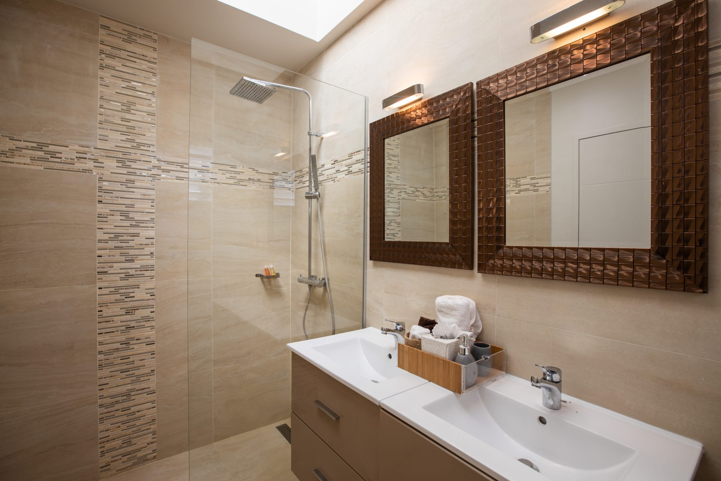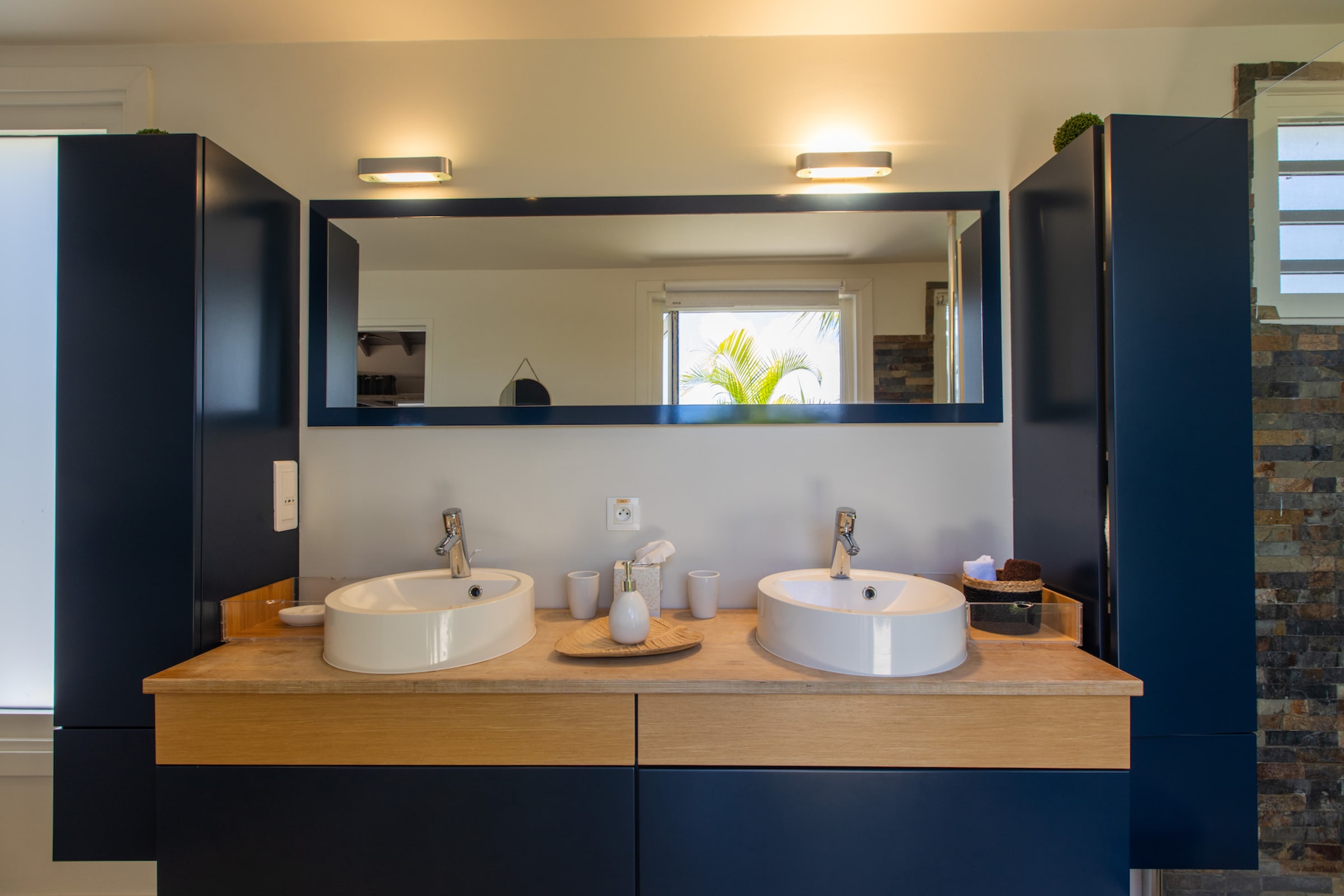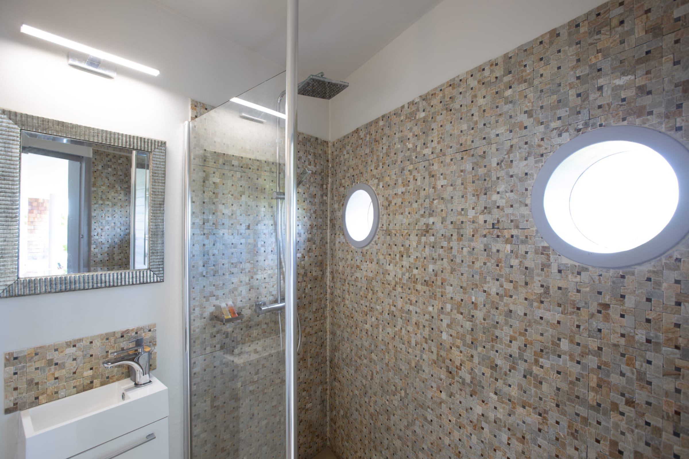 The four bedrooms are of equal size, one of which has an outdoor shower on its private terrace. Two bedrooms are accessible from the inside and offer a view of the garden. From the living room, a few steps provide access from the outside to the other two bedrooms, located on the lower pool level.