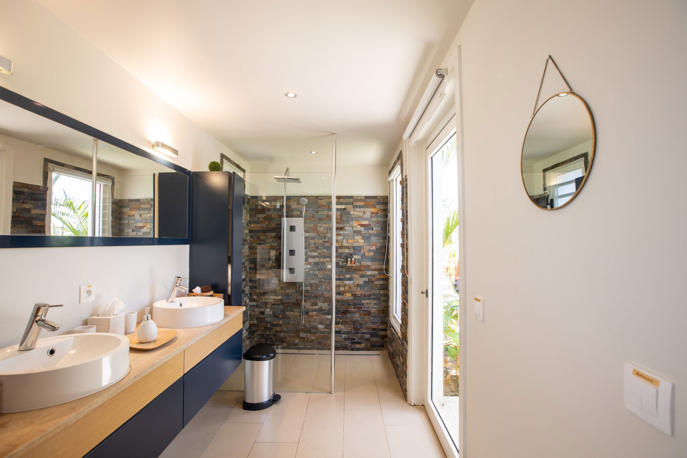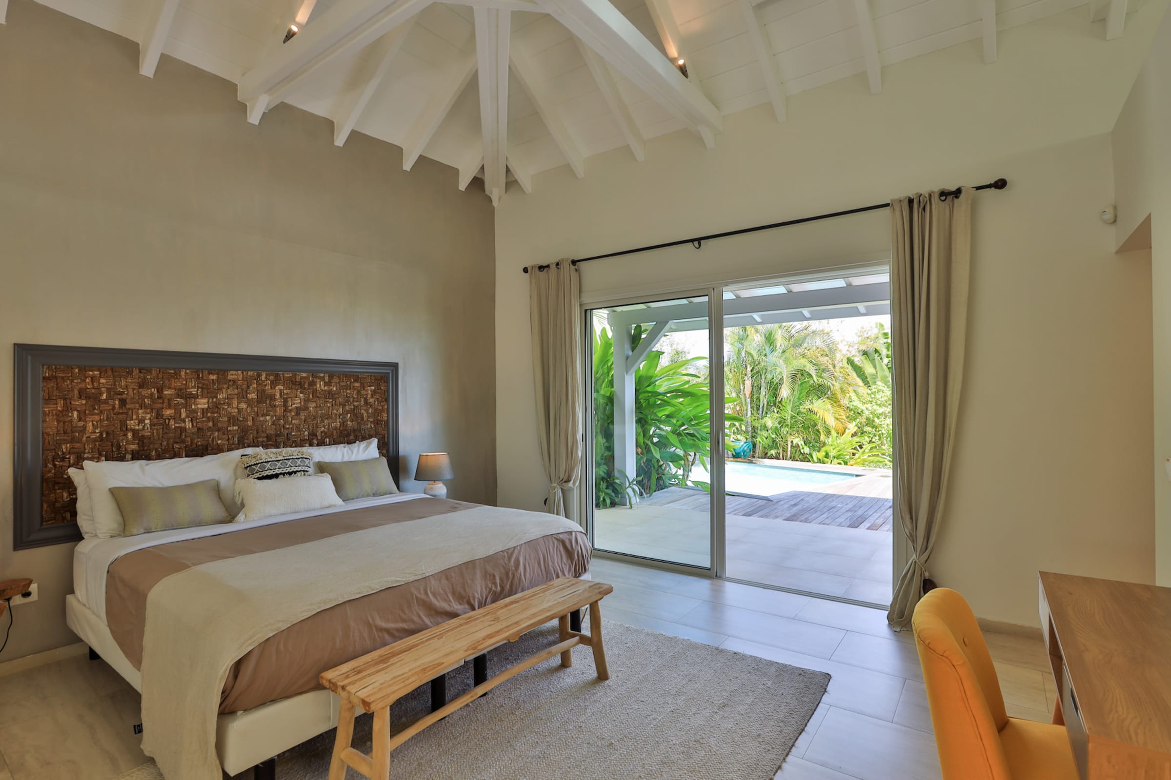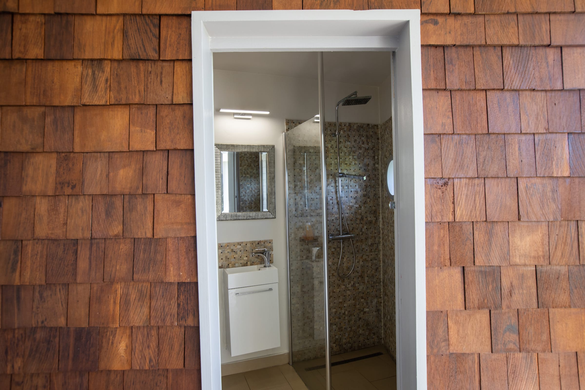 The four bedrooms are of equal size, one of which has an outdoor shower on its private terrace. Two bedrooms are accessible from the inside and offer a view of the garden. From the living room, a few steps provide access from the outside to the other two bedrooms, located on the lower pool level.