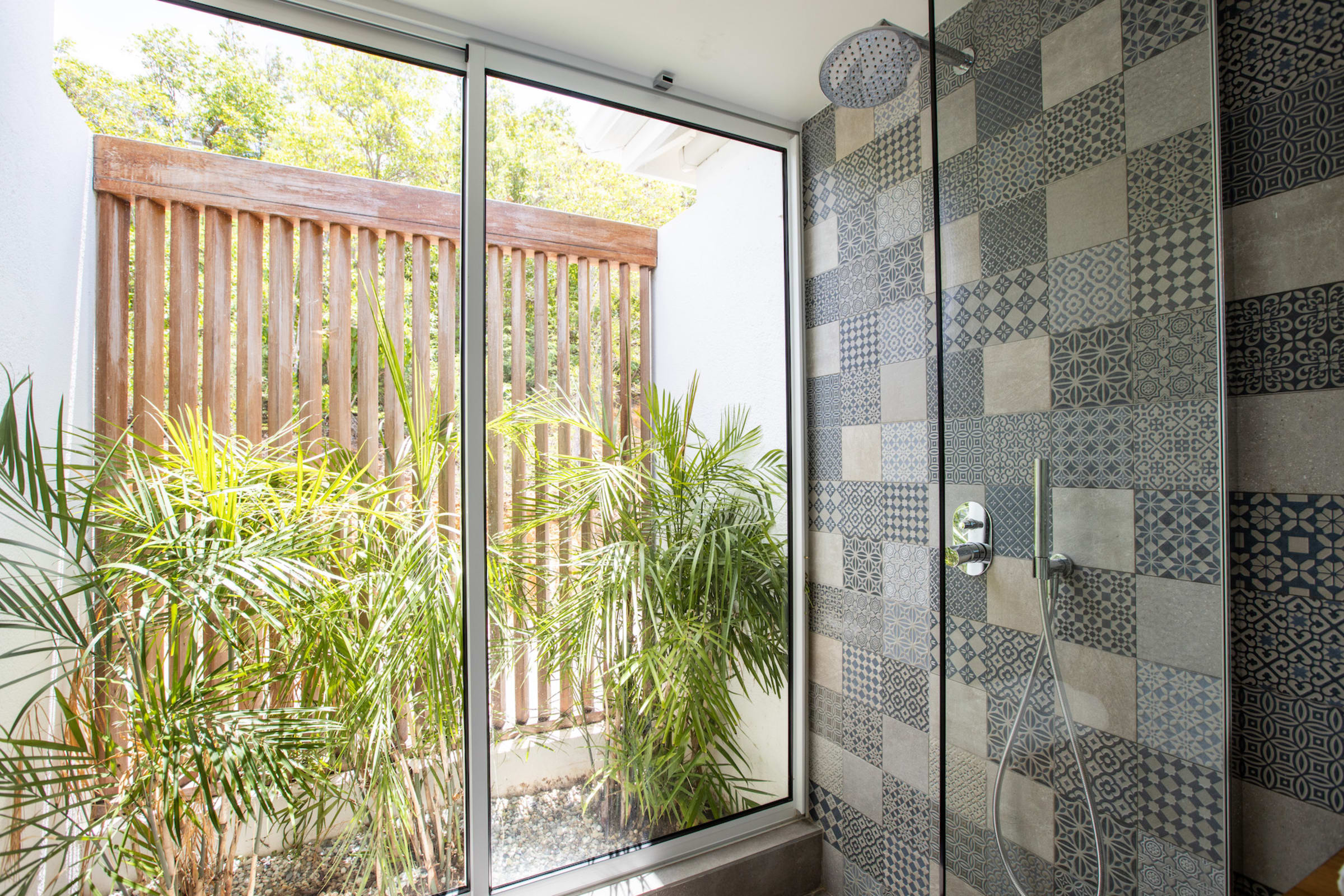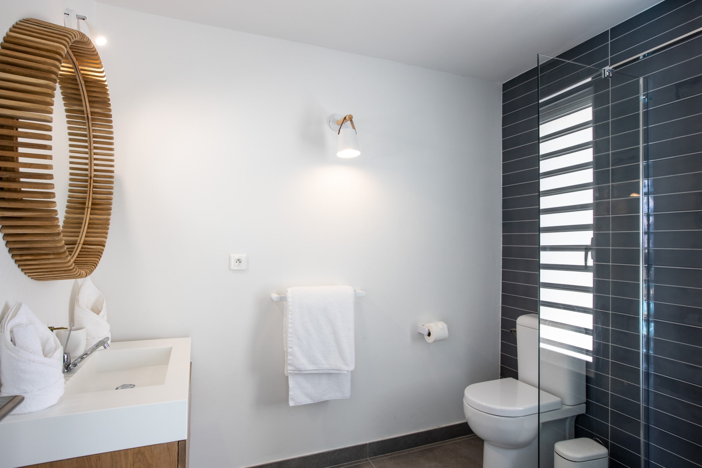 This stunning villa features 4 bedrooms, each equipped with its own ensuite bathroom. Three of the bedrooms are situated on the upper level, providing privacy and comfort. The fourth bedroom is located on the lower level, along with a gym where you can stay active during your stay.
