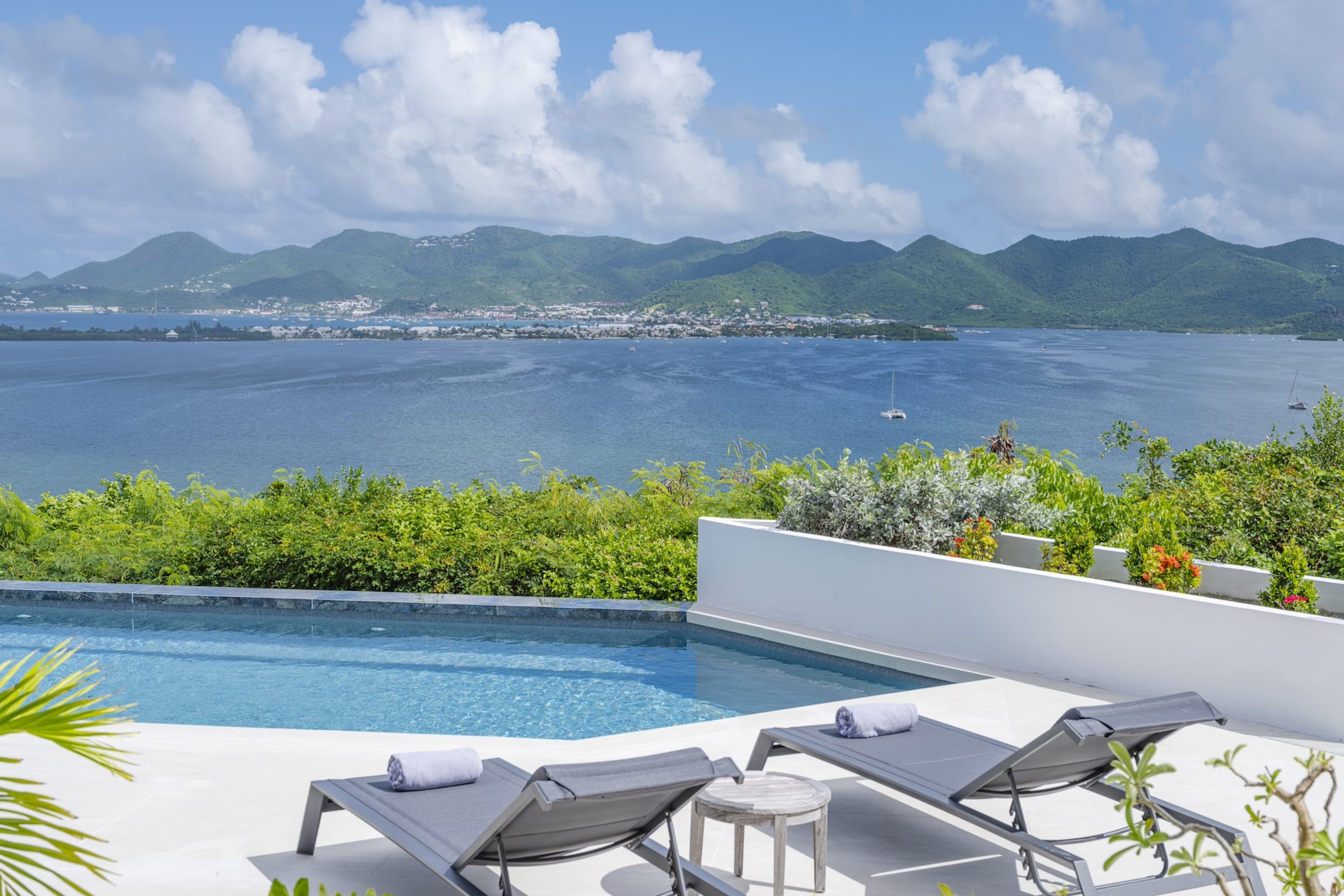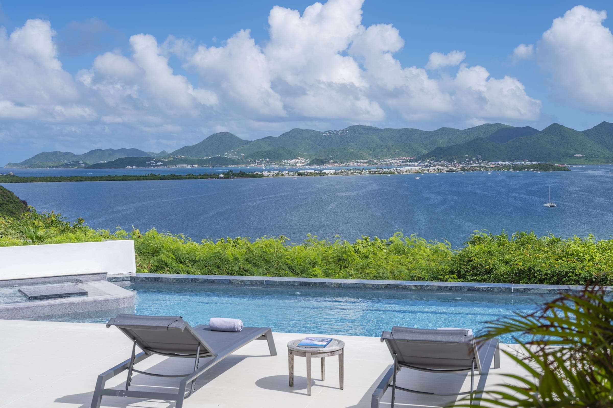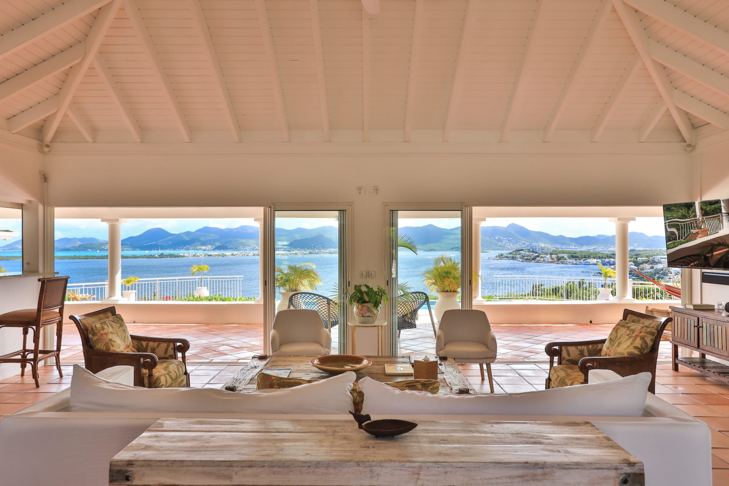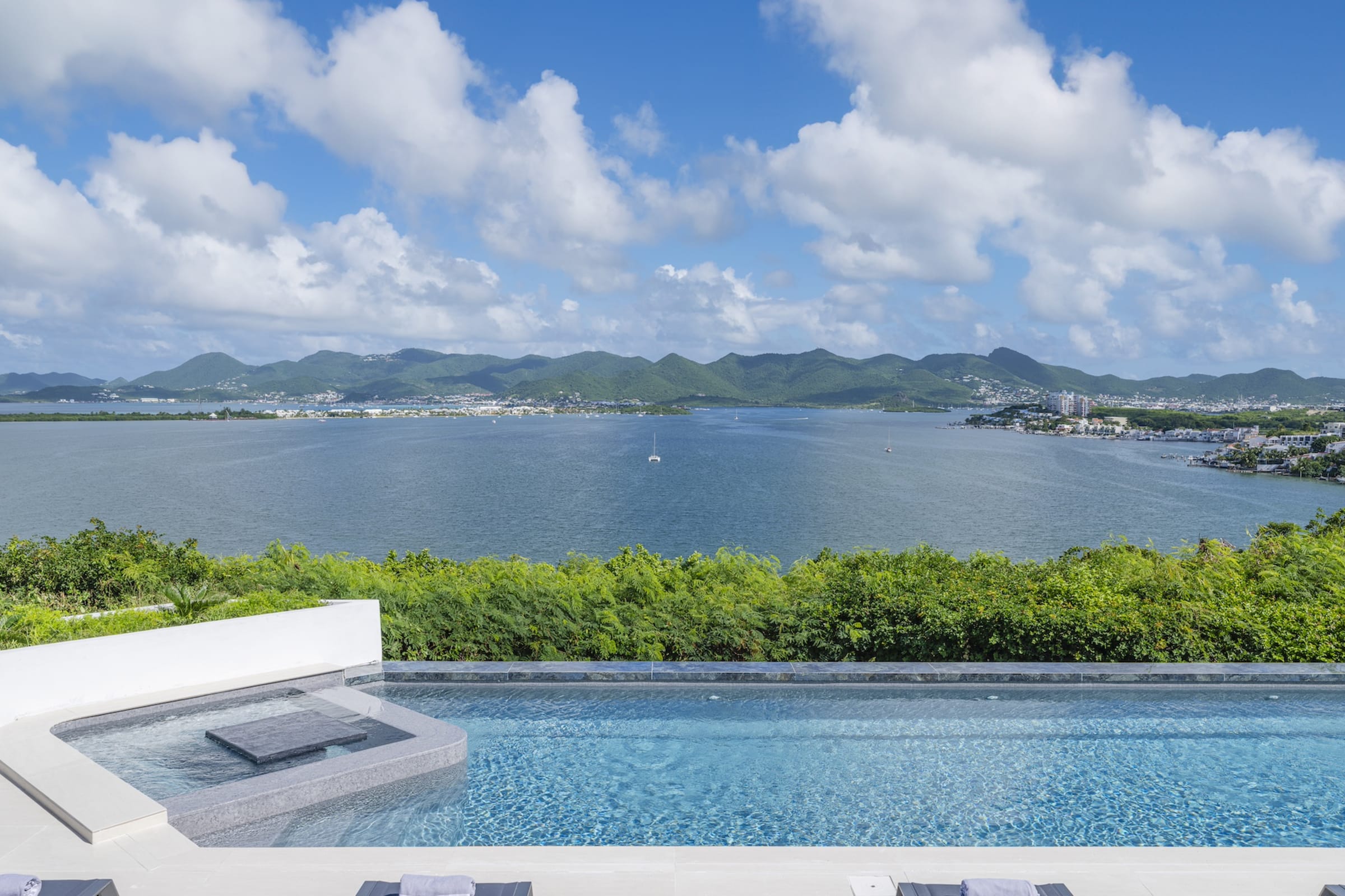 This cliff-side villa offers amazing views of the Lagoon and the gorgeous verdant mountains of St. Martin.