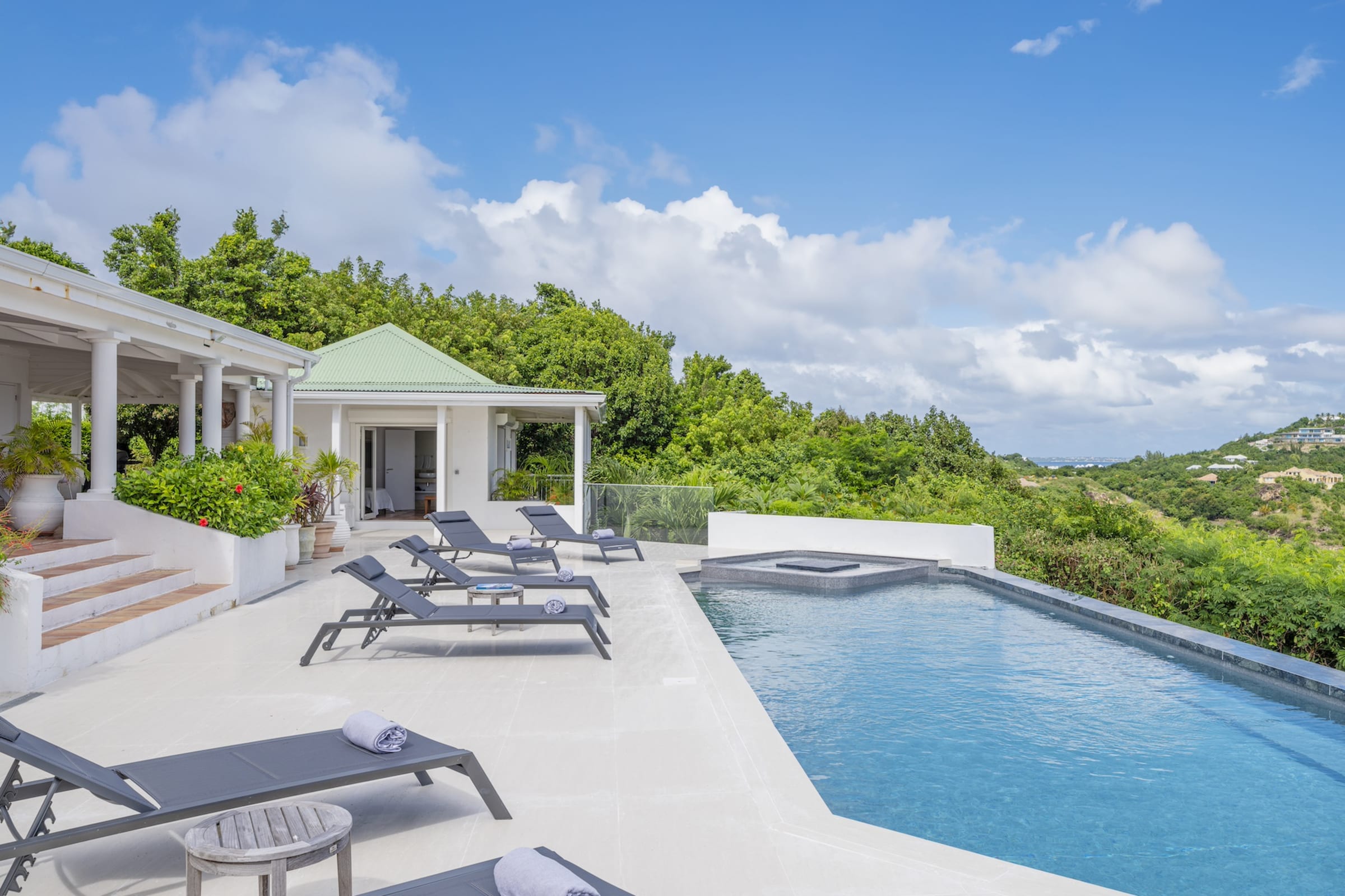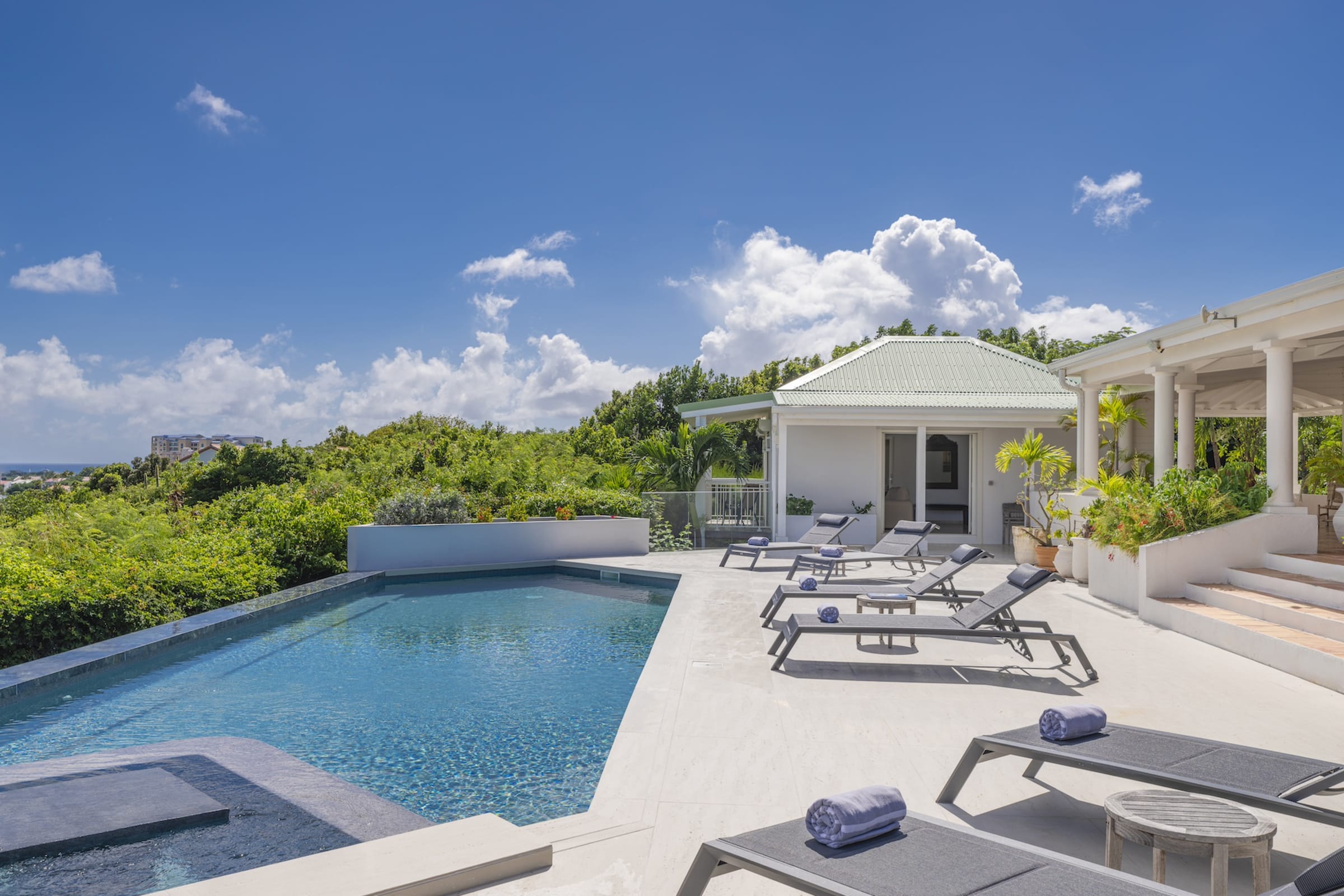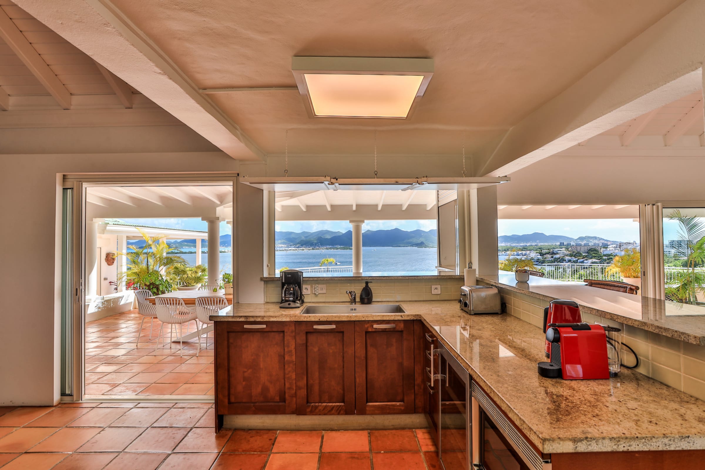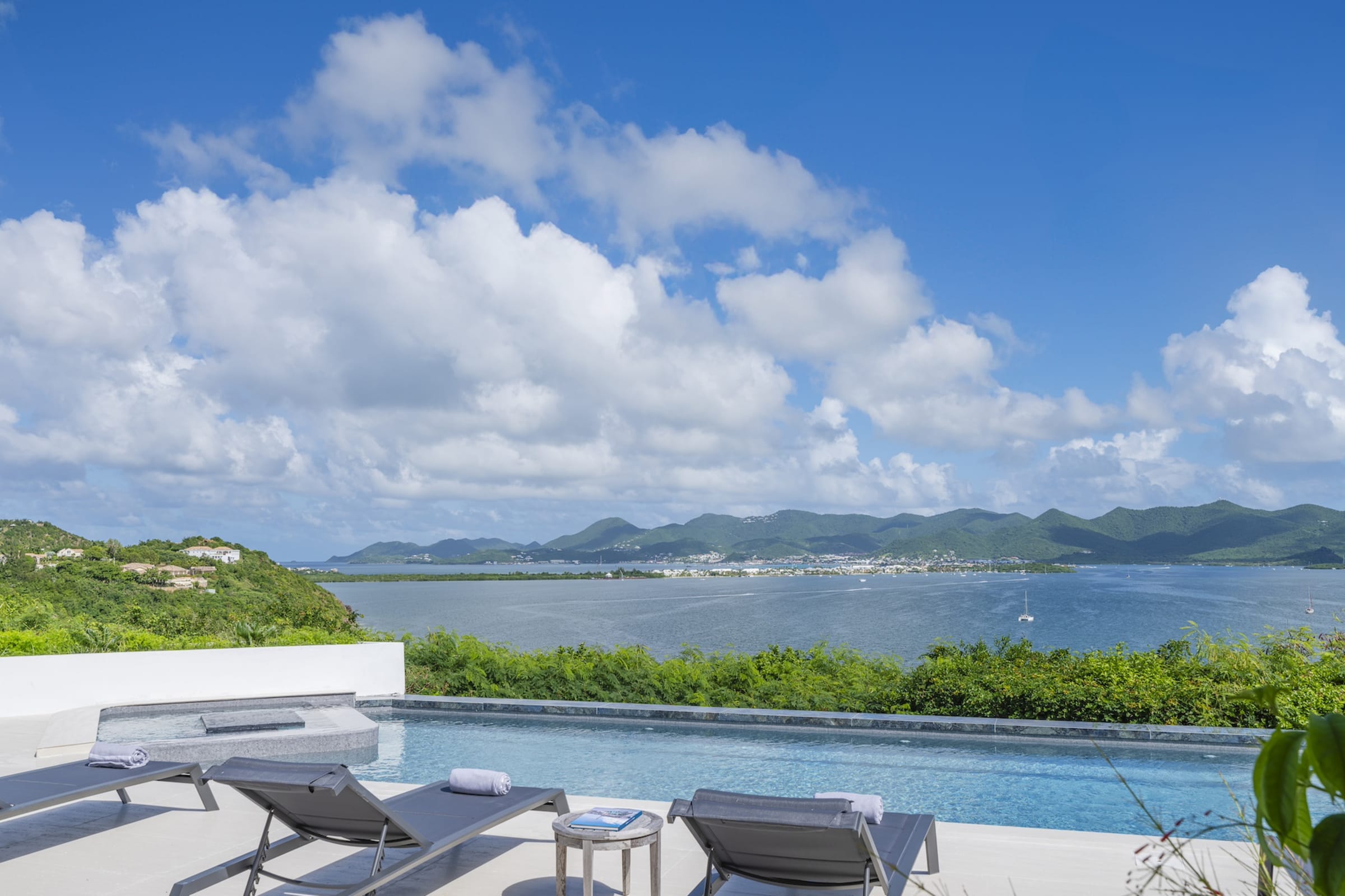 This cliff-side villa offers amazing views of the Lagoon and the gorgeous verdant mountains of St. Martin.