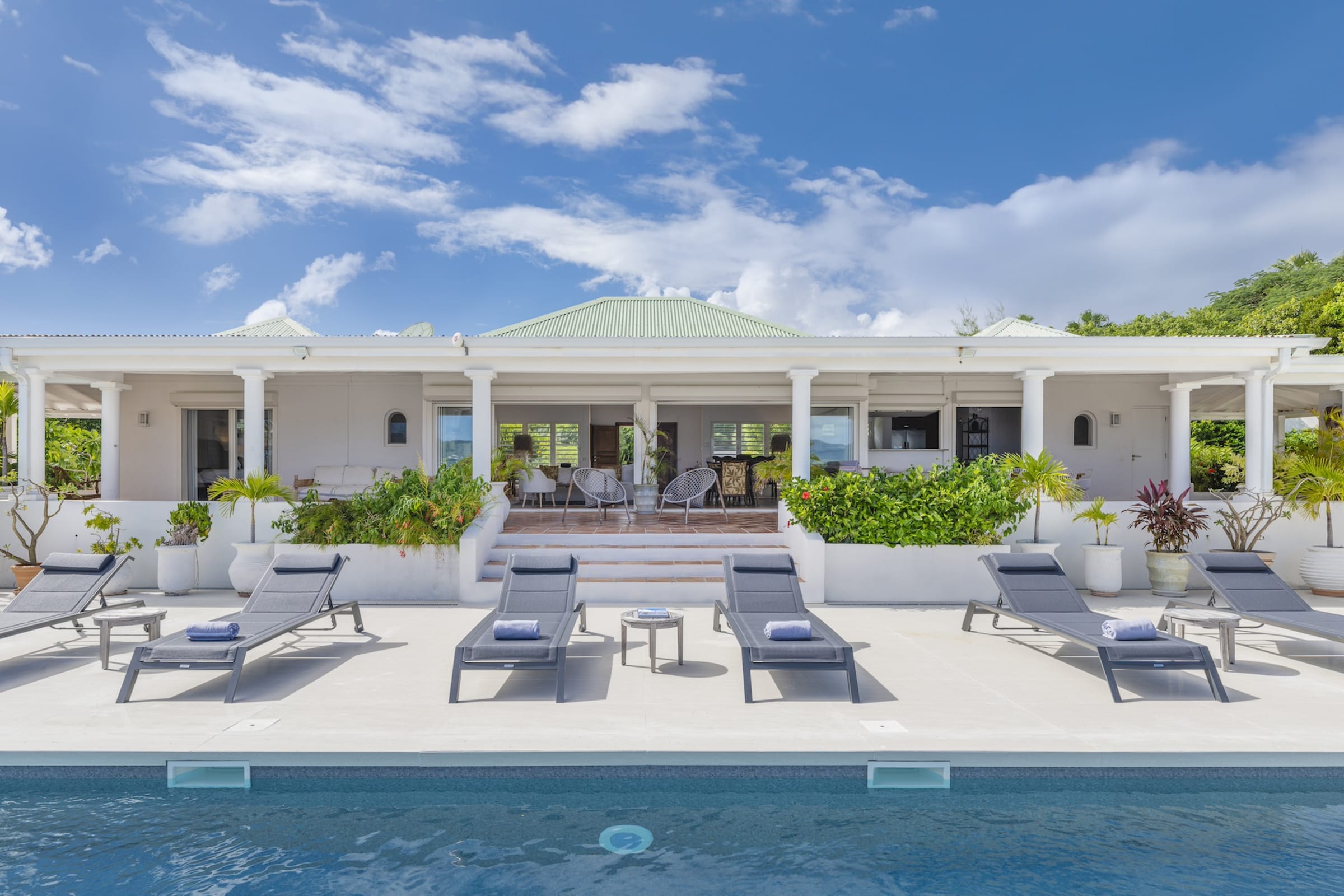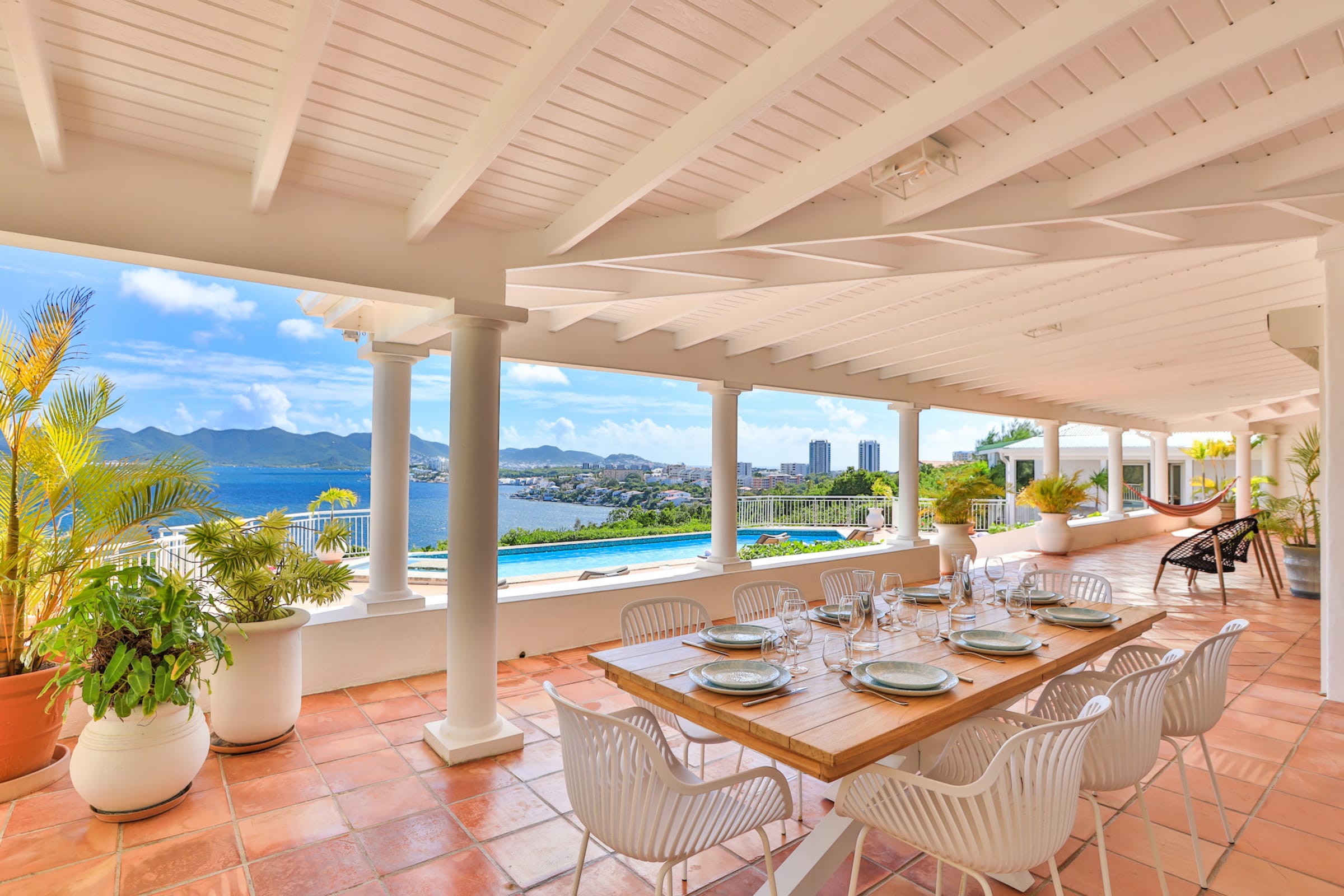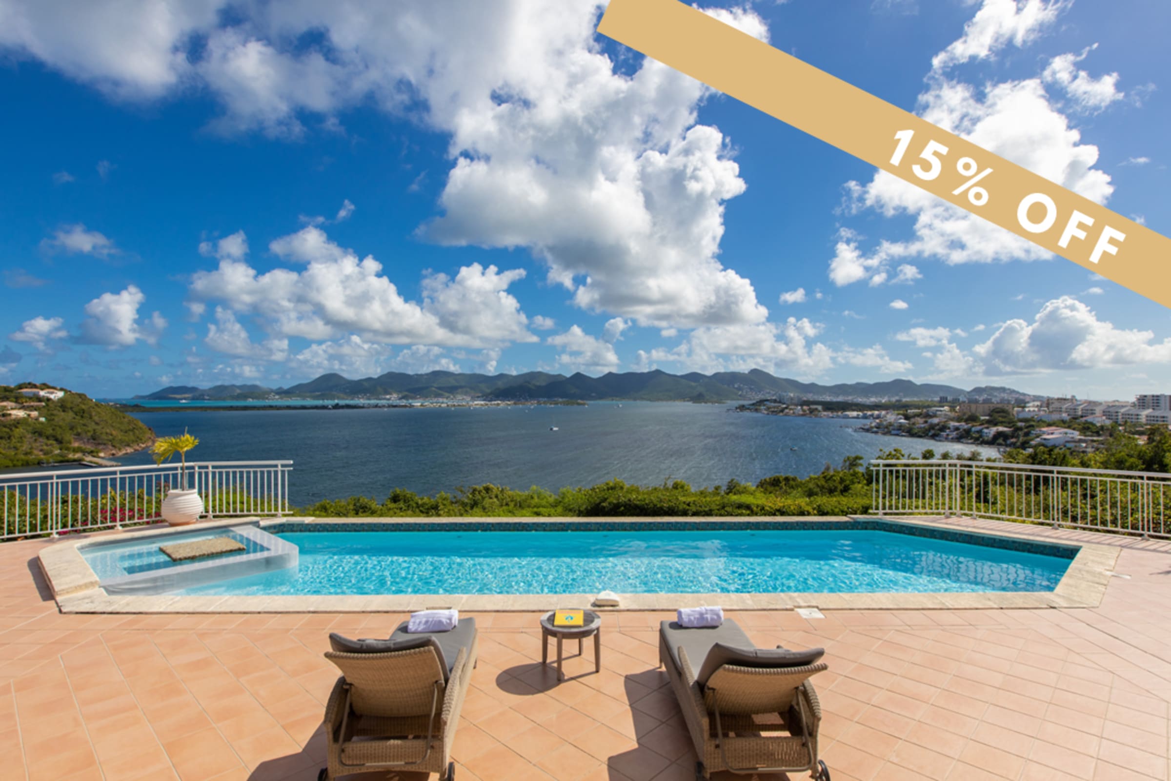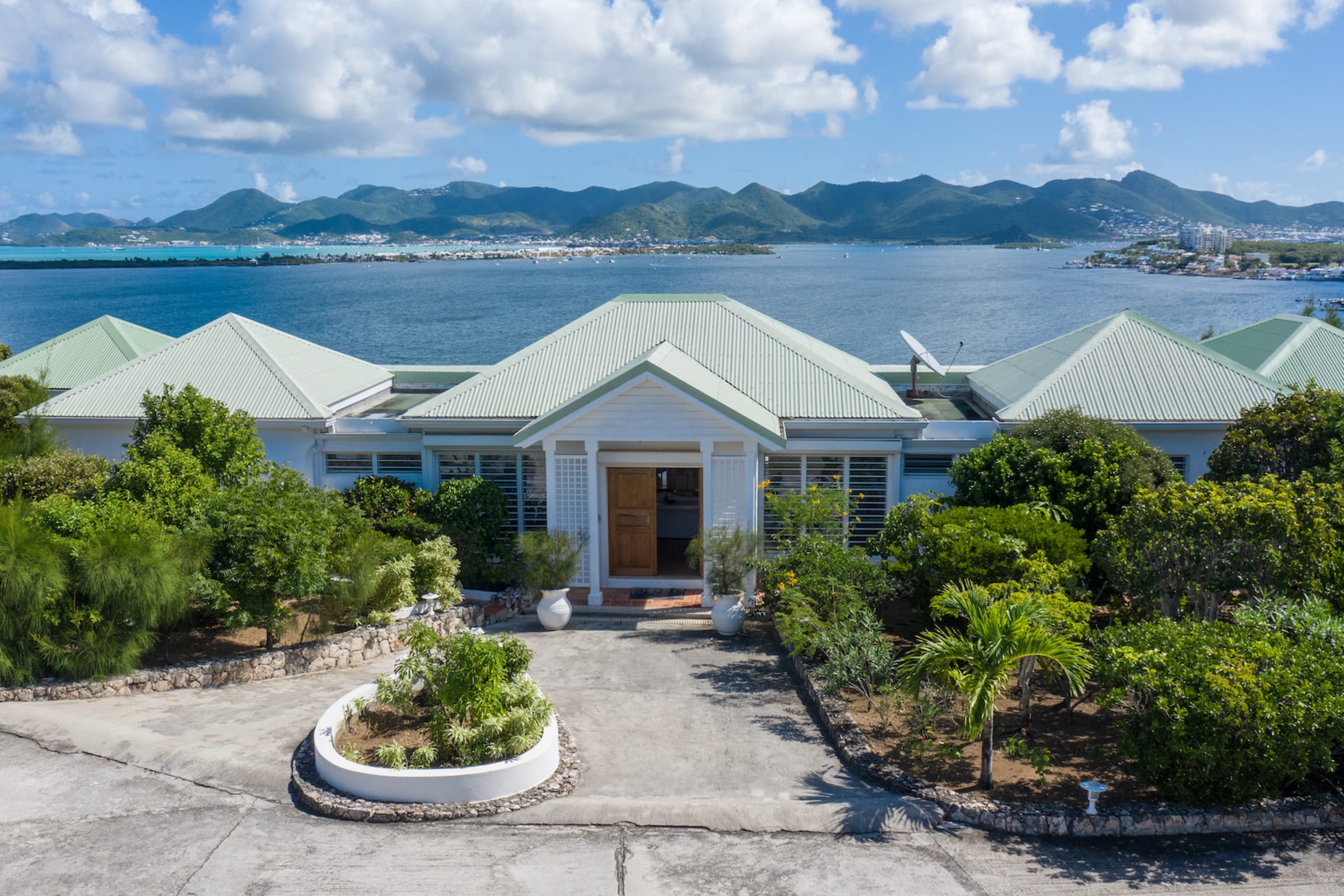 This cliff-side villa offers amazing views of the Lagoon and the gorgeous verdant mountains of St. Martin.