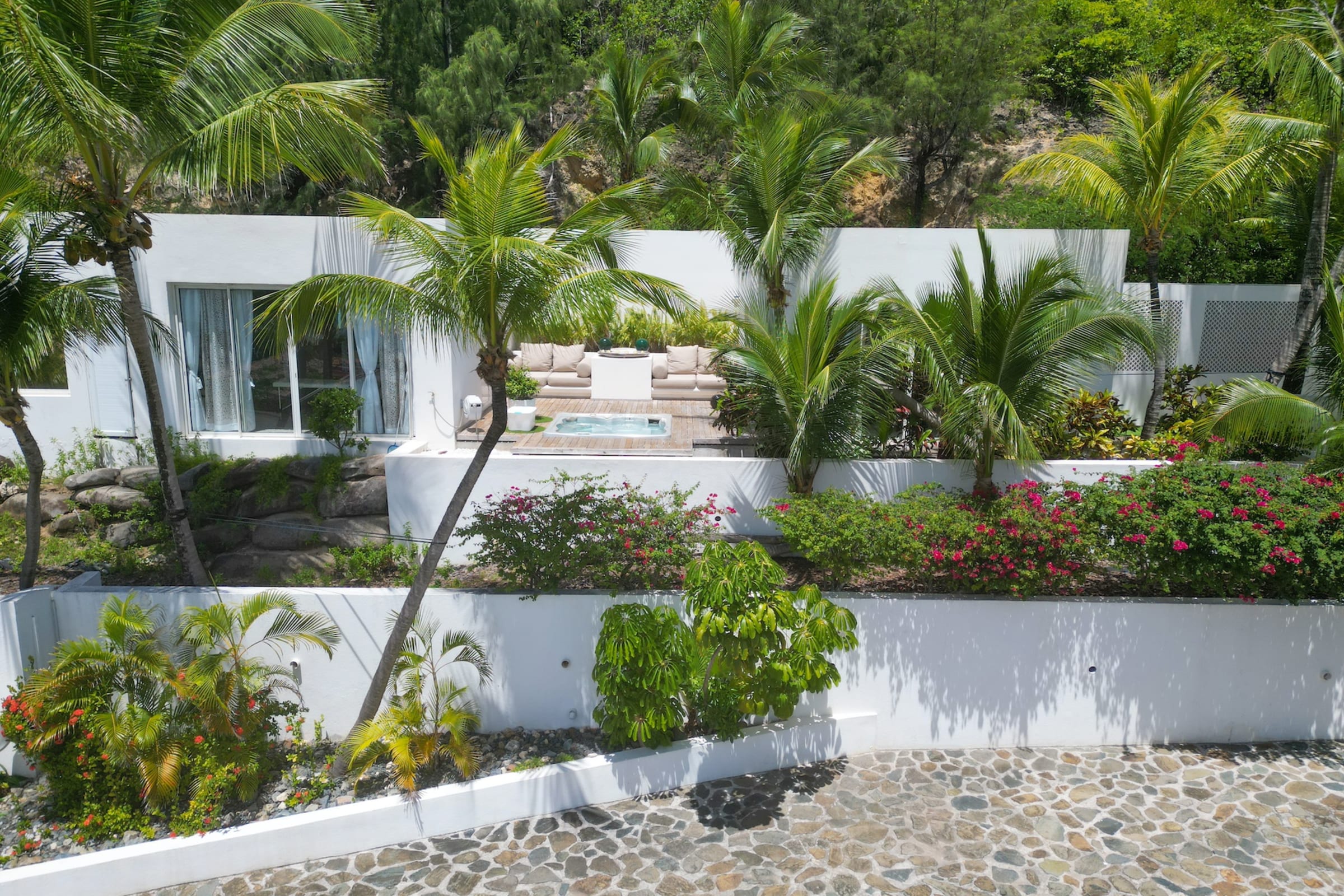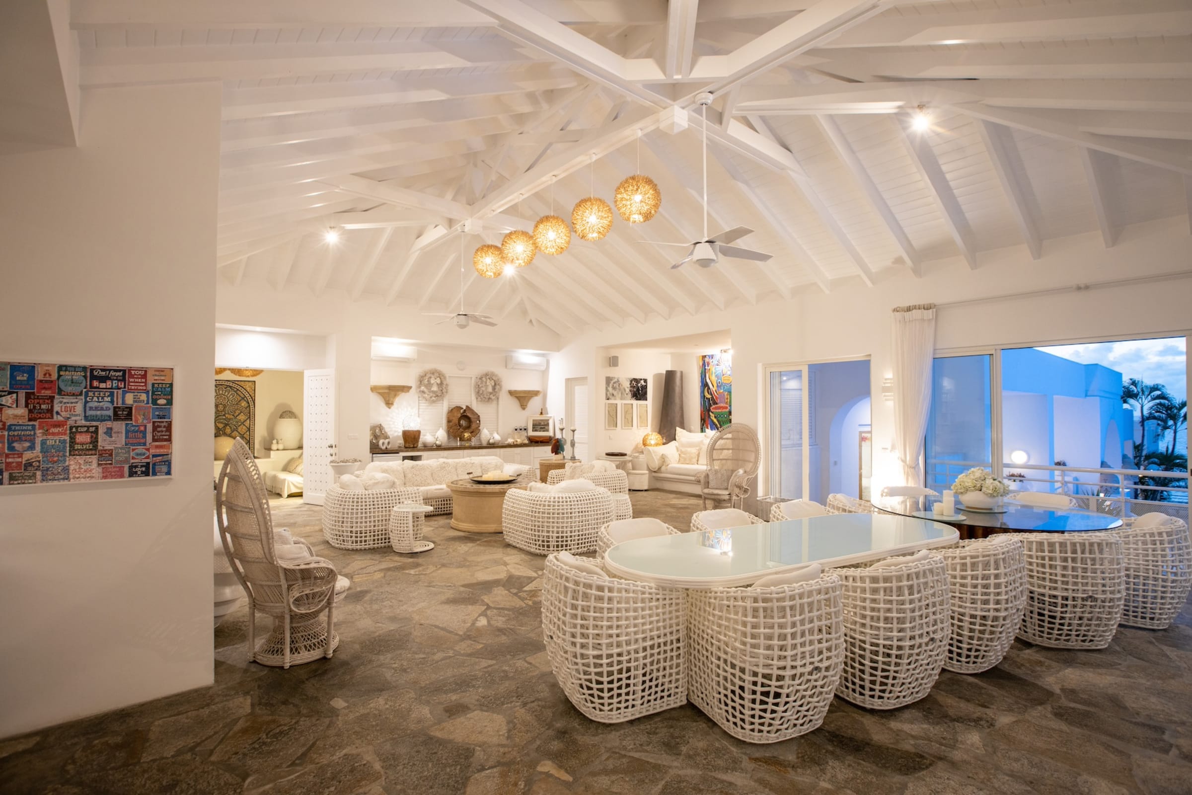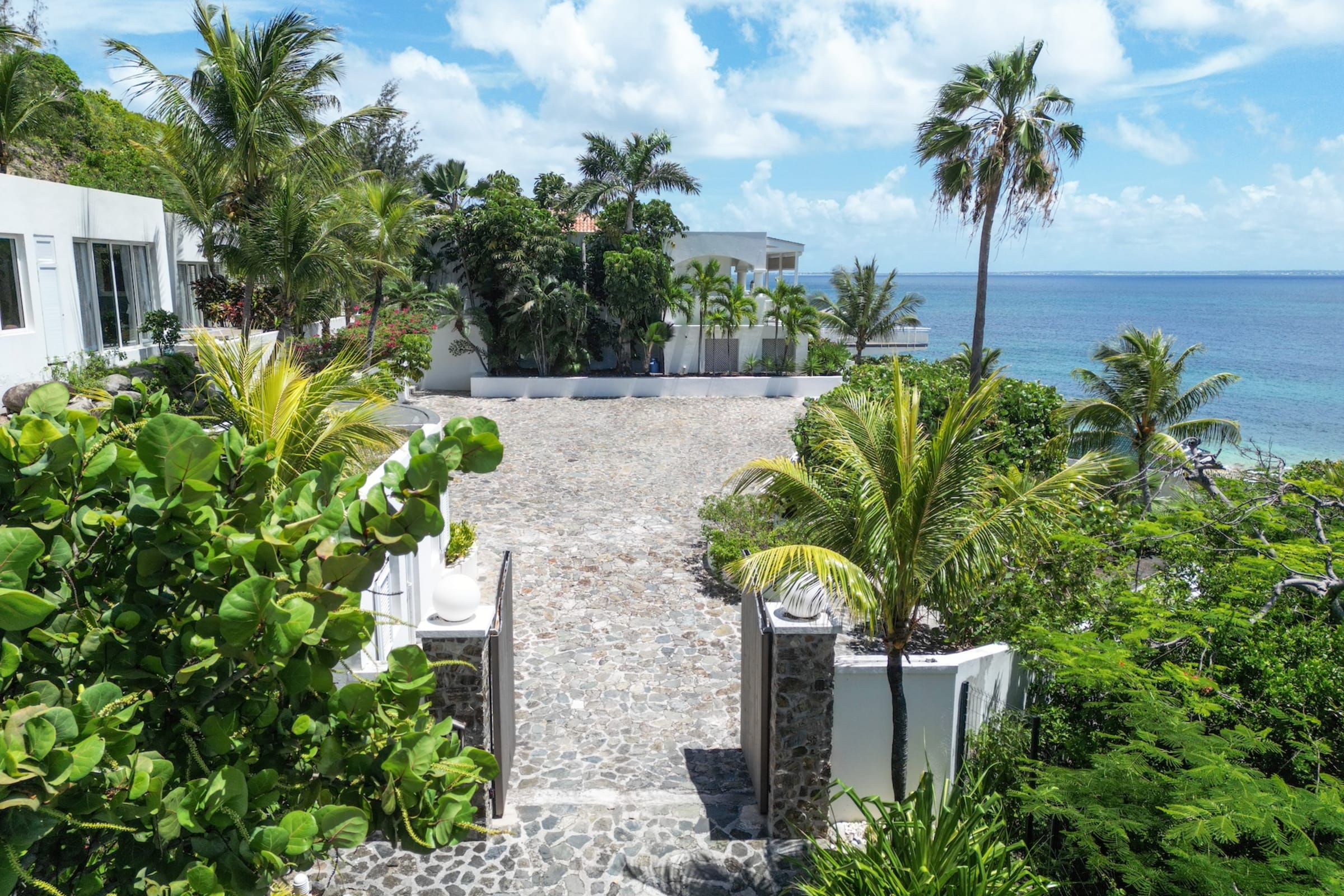 The villa's facade showcases the iconic Greek-style white-washed walls, creating a striking contrast against the vibrant blue of the Caribbean sky and sea. The exterior is adorned with elements reminiscent of the Greek Cycladic islands, with domed architecture, arched doorways, and rocky stone pathways that wind through the lush gardens.