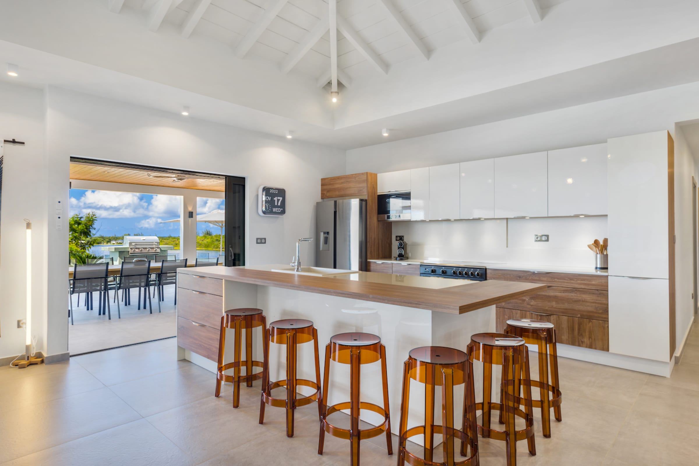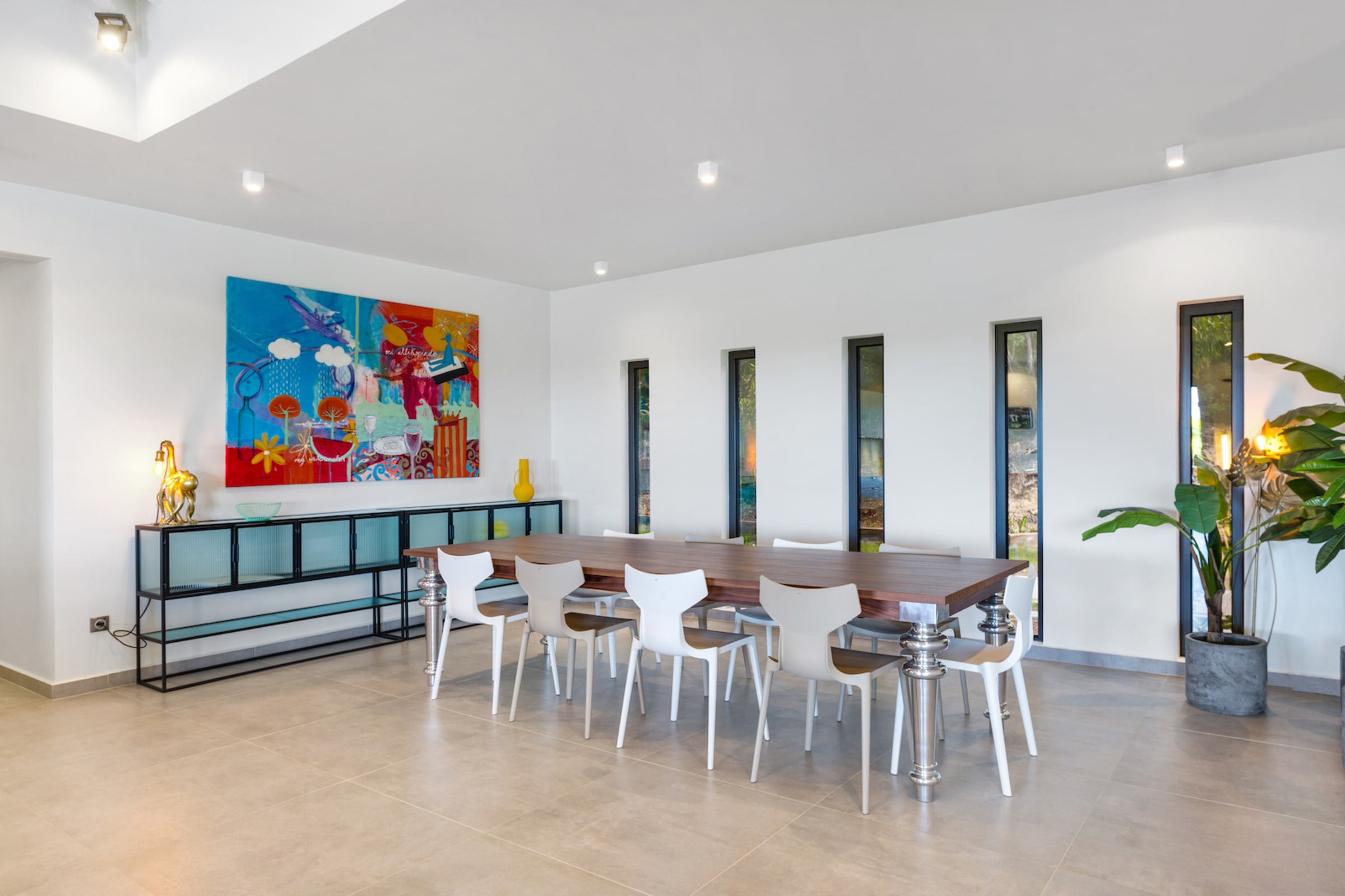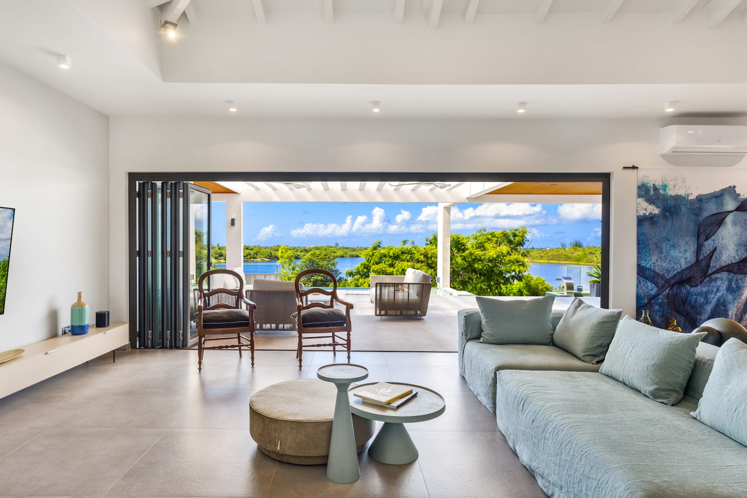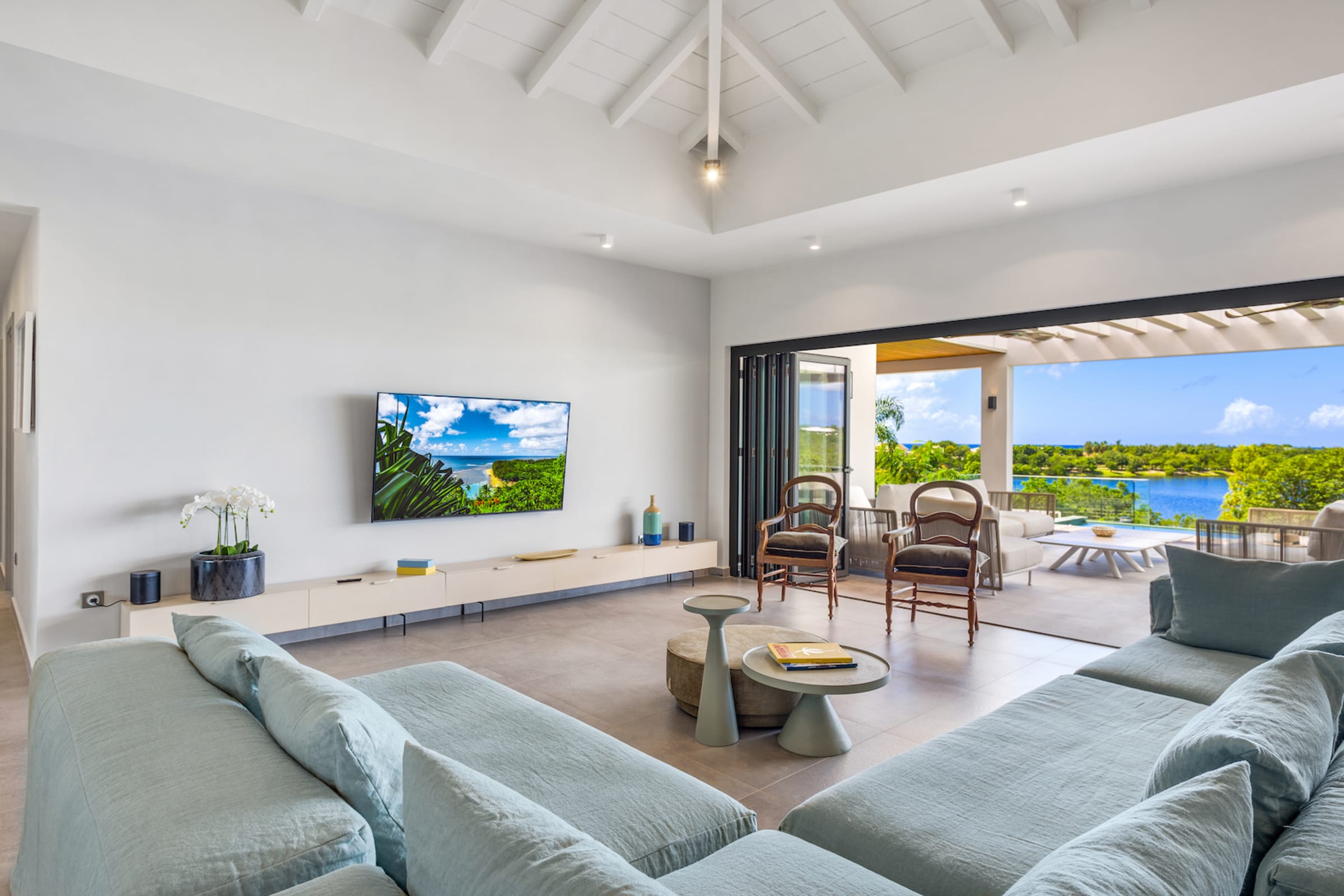 The expansive living area beckons you to unwind and relax. Air-conditioned for your comfort, this space is equipped with a smart TV and an immersive SONOS audio system, creating the perfect ambiance for leisure and entertainment.