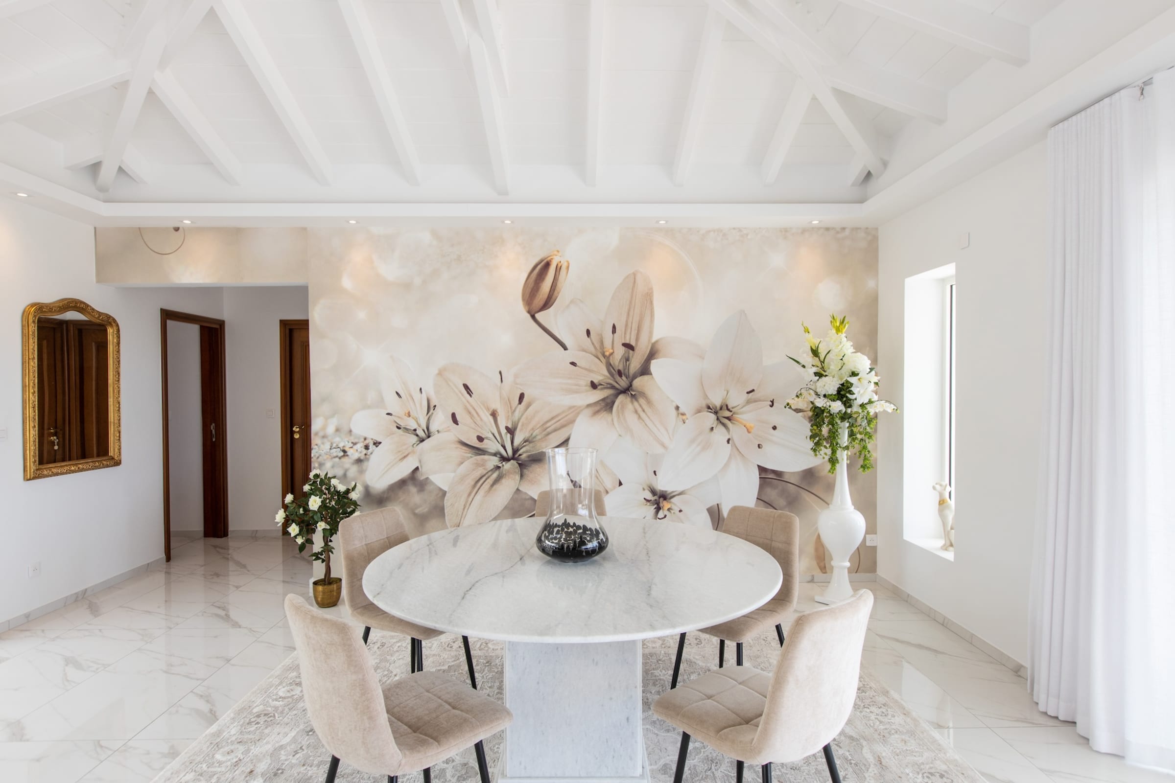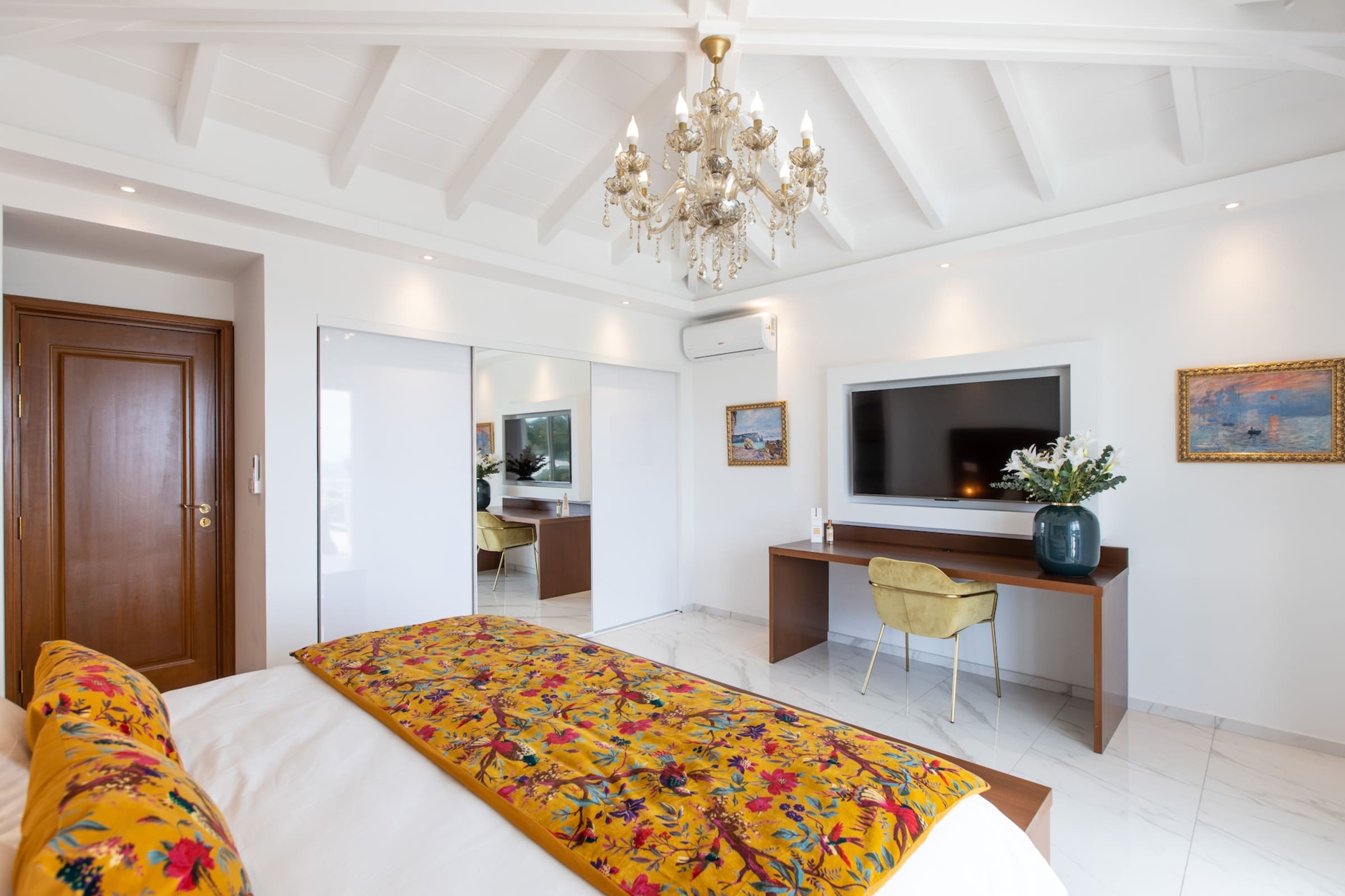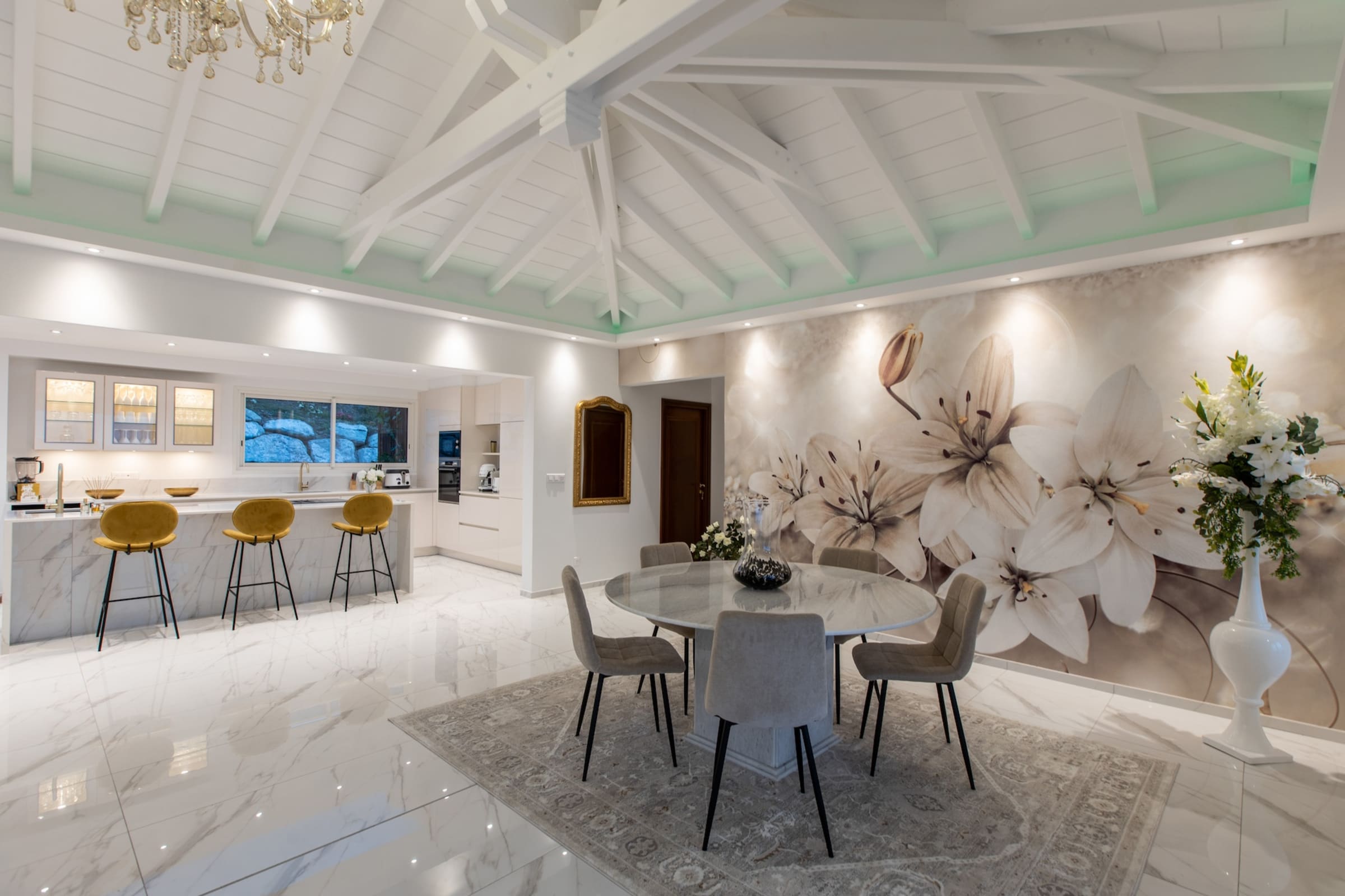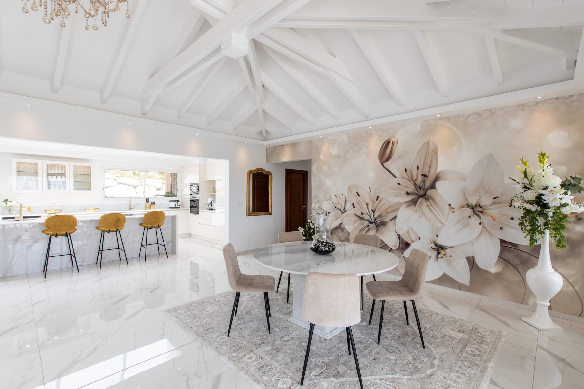 The interior of Villa Fleurs de Lys is a harmonious blend of classic French luxury and contemporary elegance, adorned with modern art pieces that enhance its sophisticated ambiance. The decor features sumptuous fabrics, fine furnishings, and intricate detailing, creating an atmosphere of opulence and refinement.