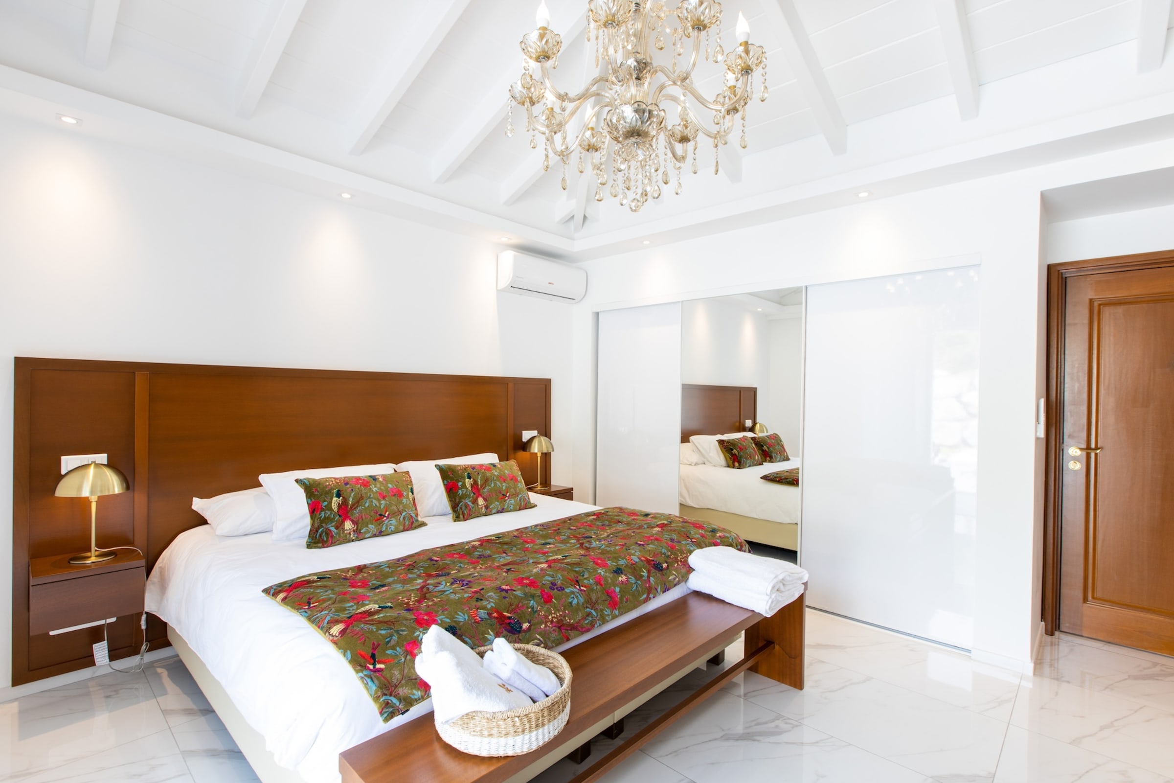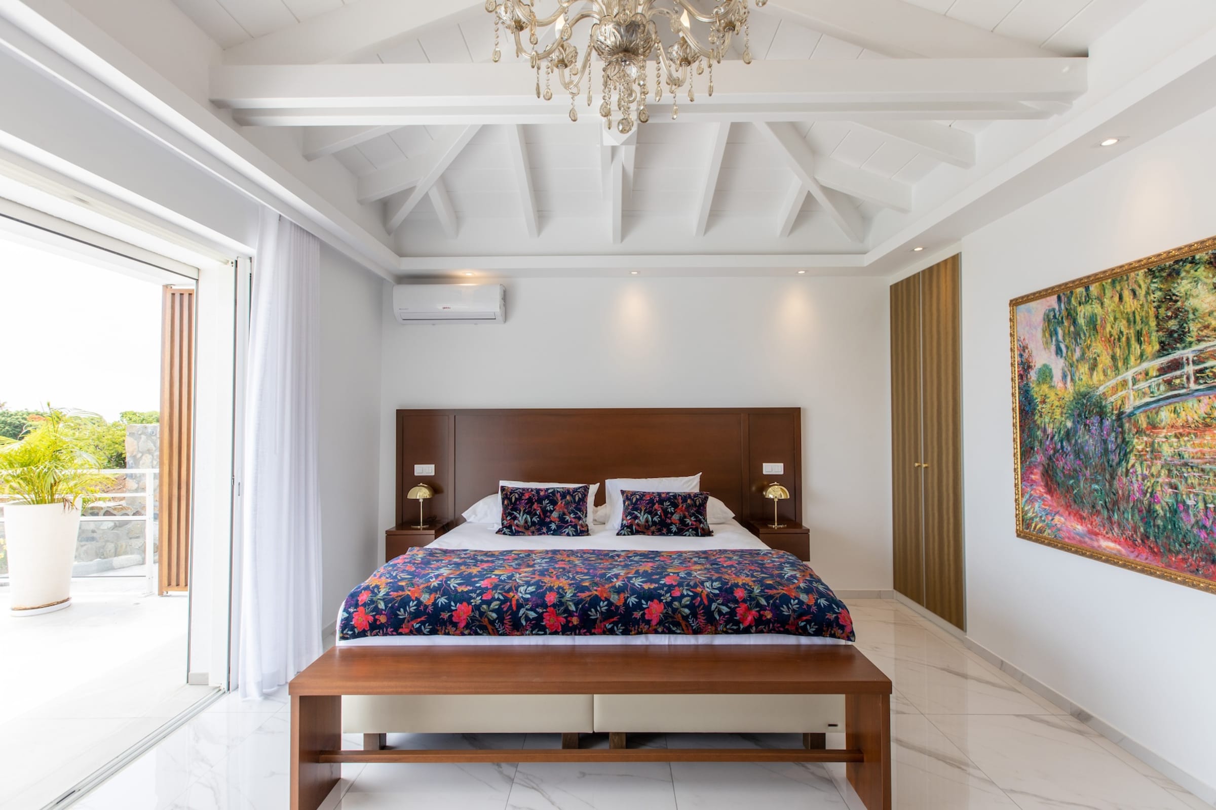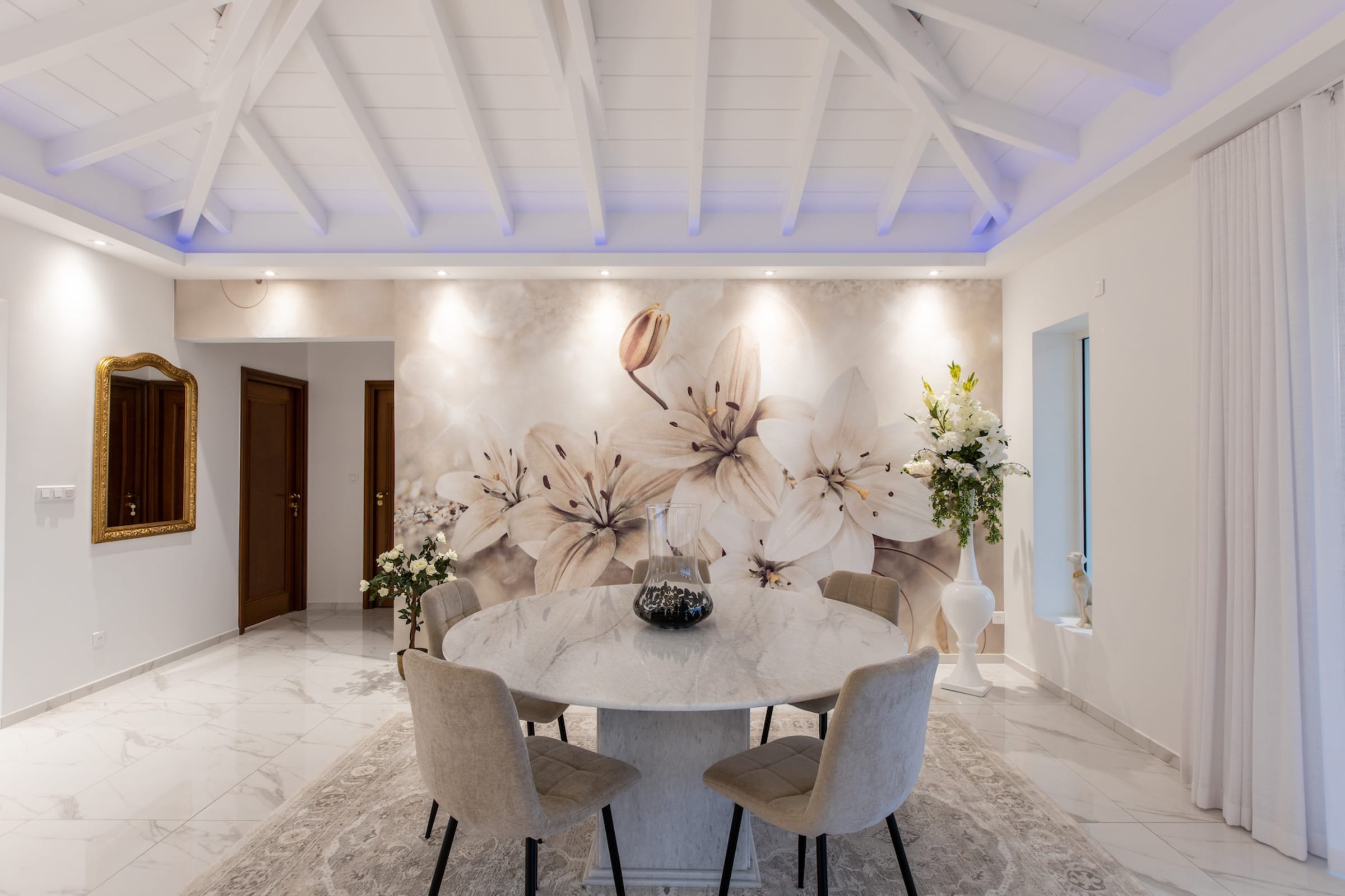 The interior of Villa Fleurs de Lys is a harmonious blend of classic French luxury and contemporary elegance, adorned with modern art pieces that enhance its sophisticated ambiance. The decor features sumptuous fabrics, fine furnishings, and intricate detailing, creating an atmosphere of opulence and refinement.