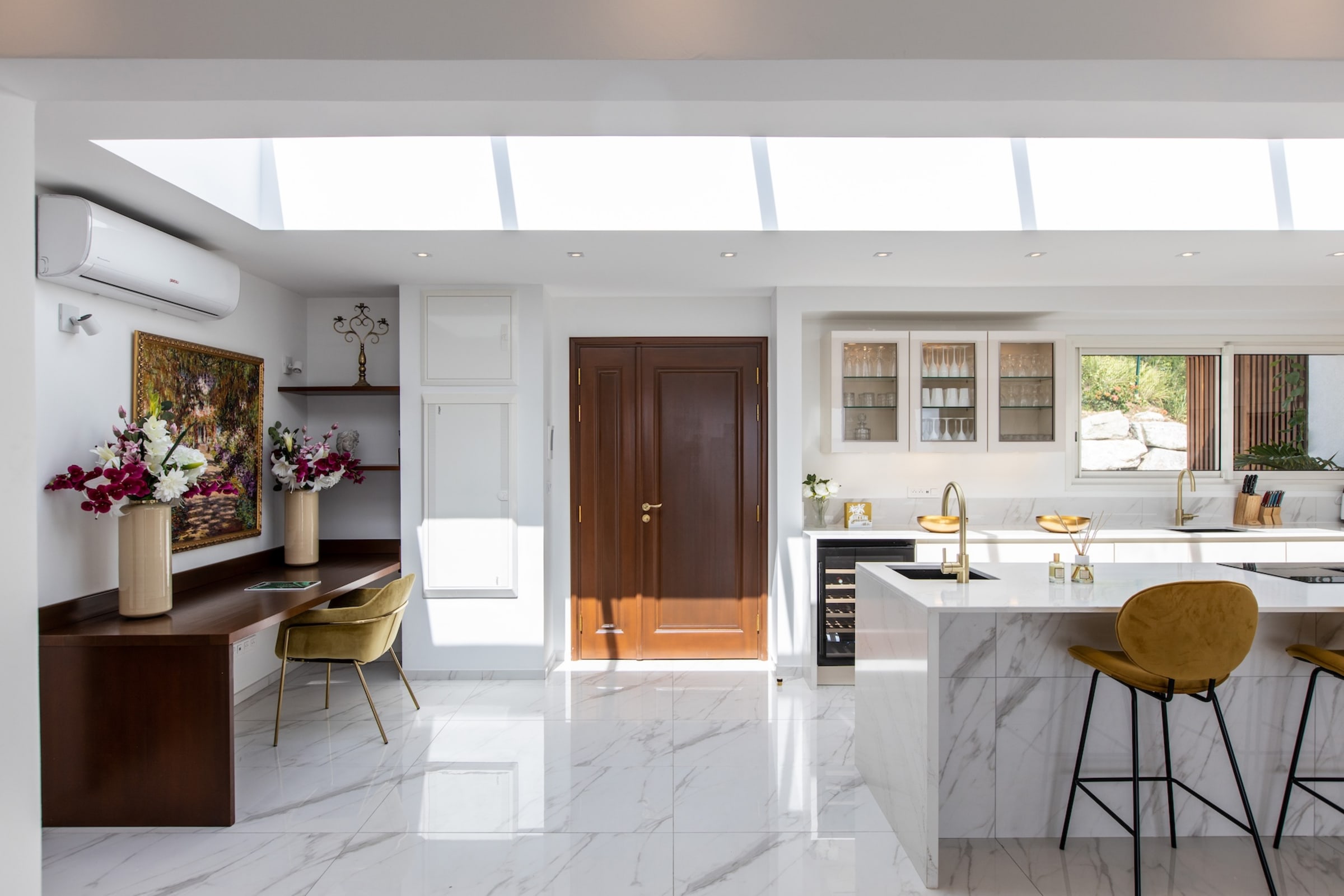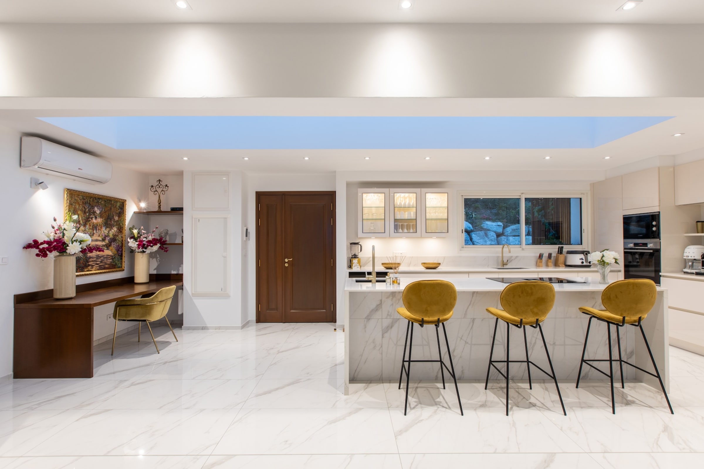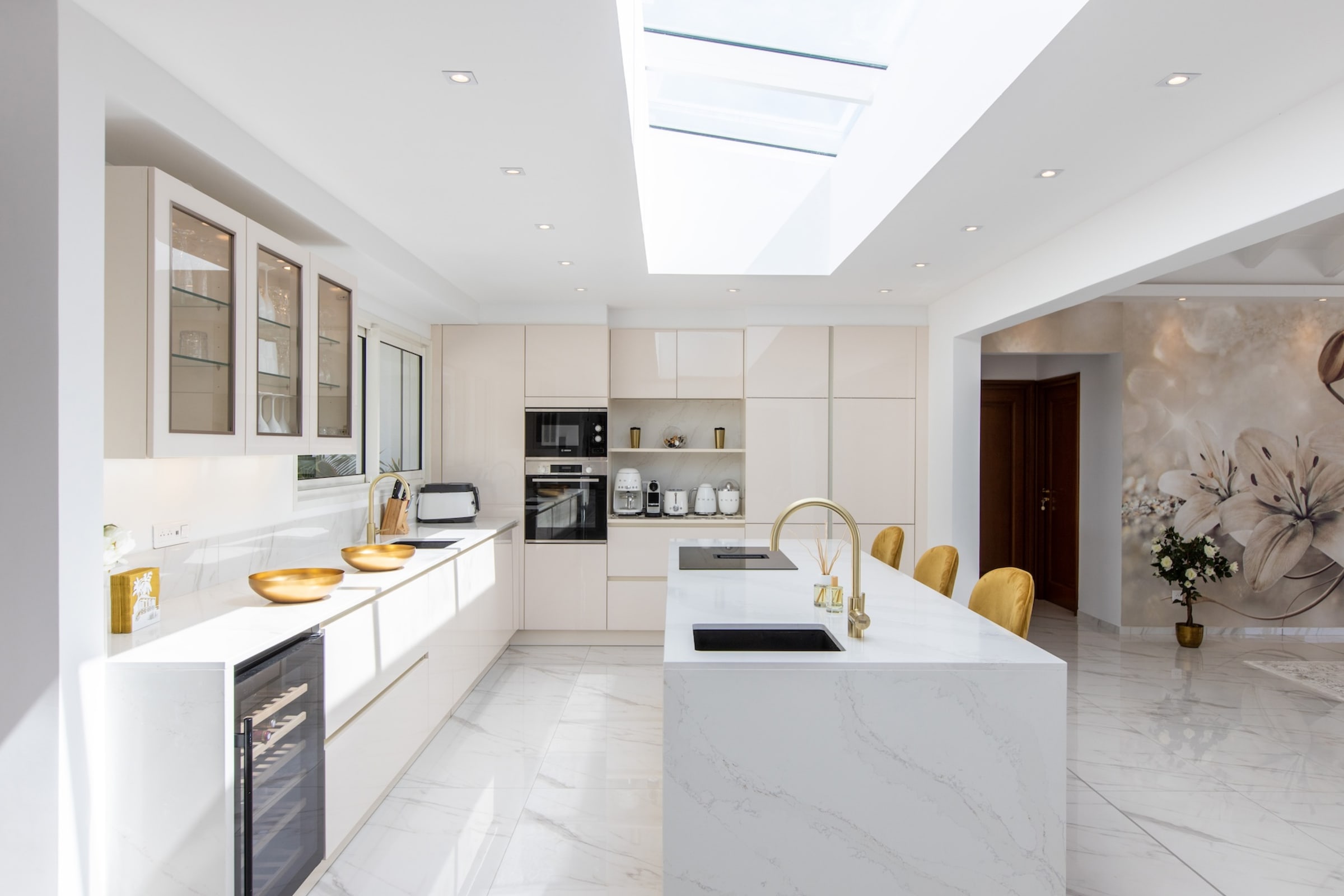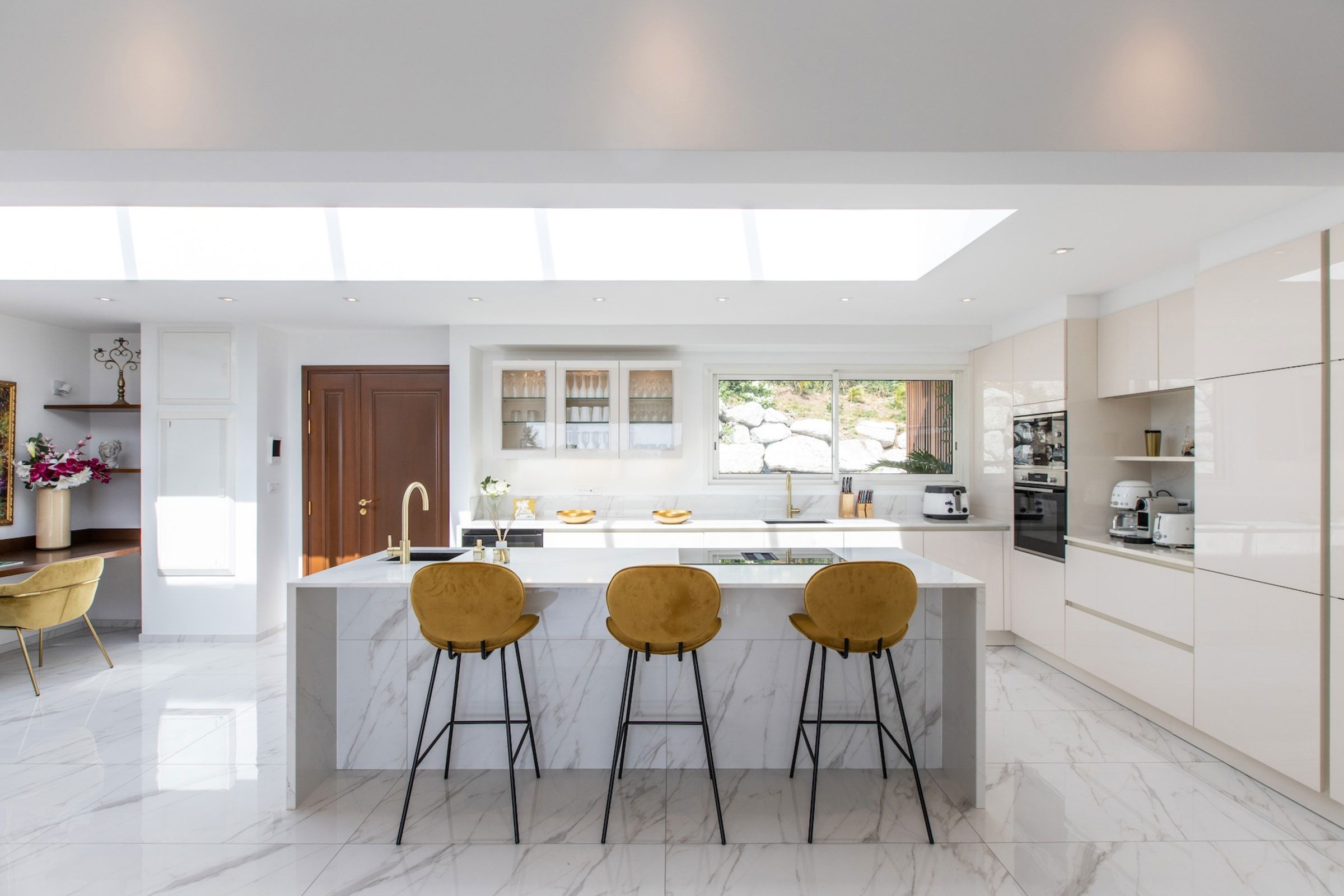 The interior of Villa Fleurs de Lys is a harmonious blend of classic French luxury and contemporary elegance, adorned with modern art pieces that enhance its sophisticated ambiance. The decor features sumptuous fabrics, fine furnishings, and intricate detailing, creating an atmosphere of opulence and refinement.