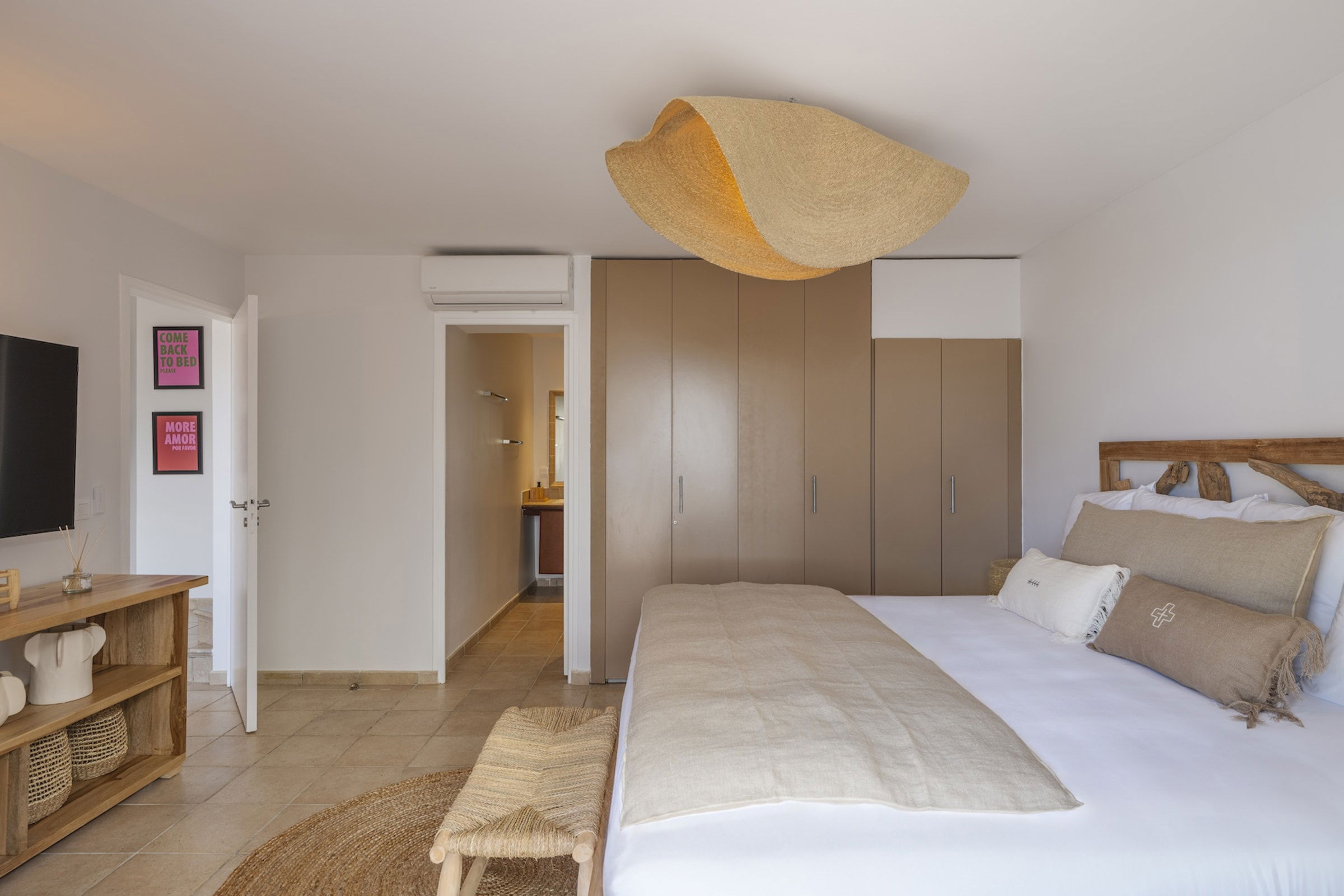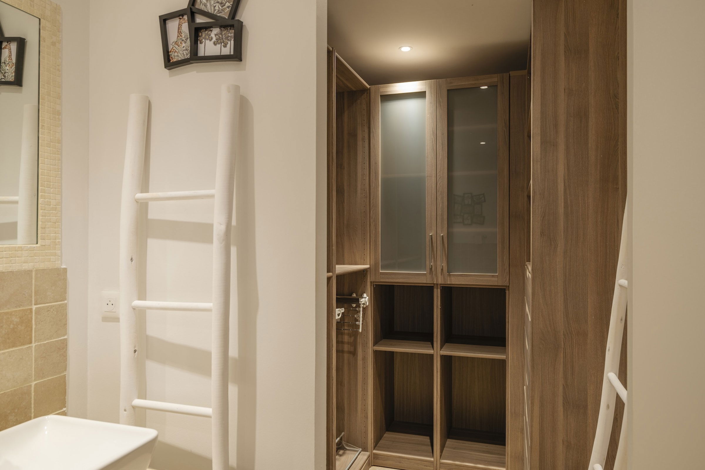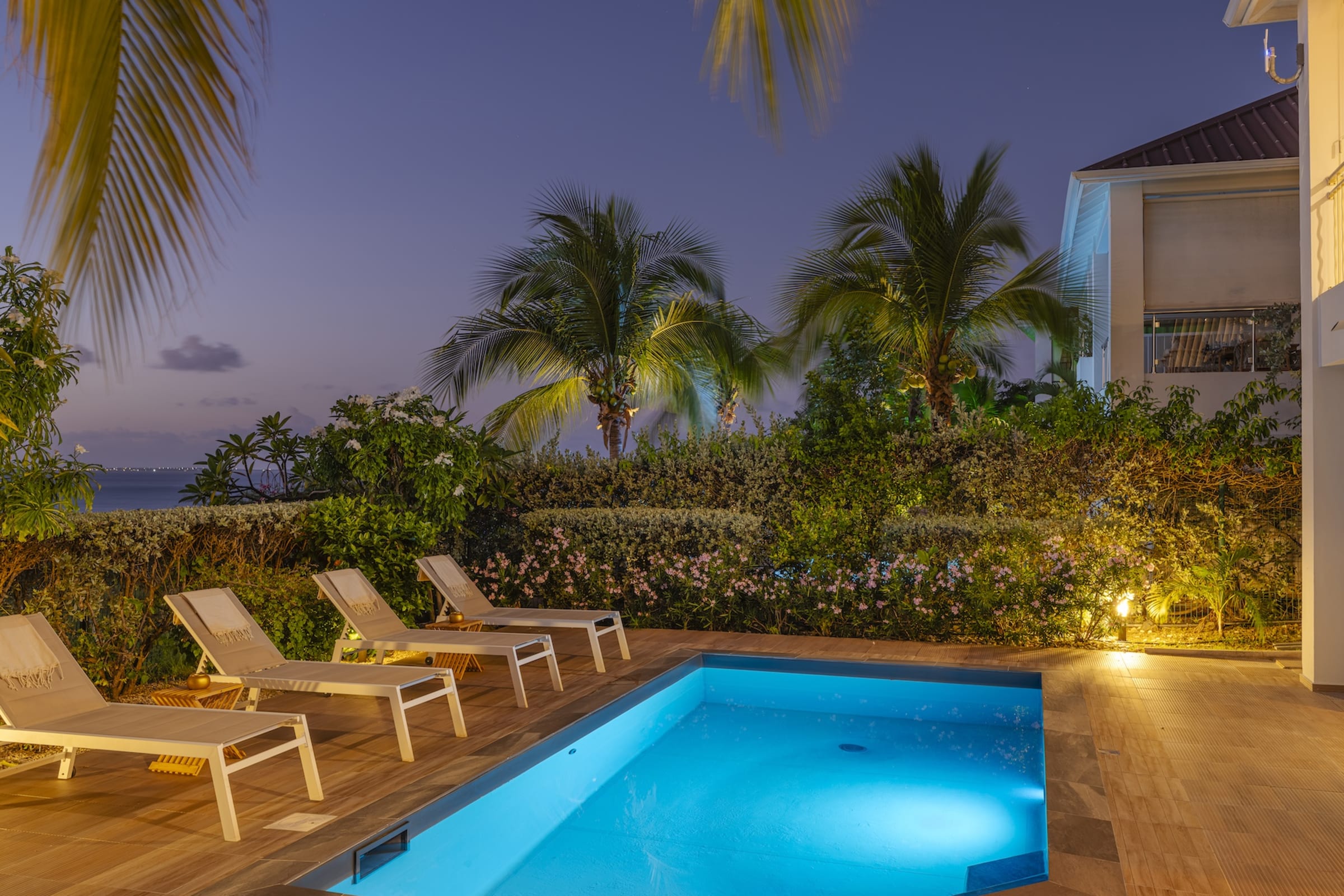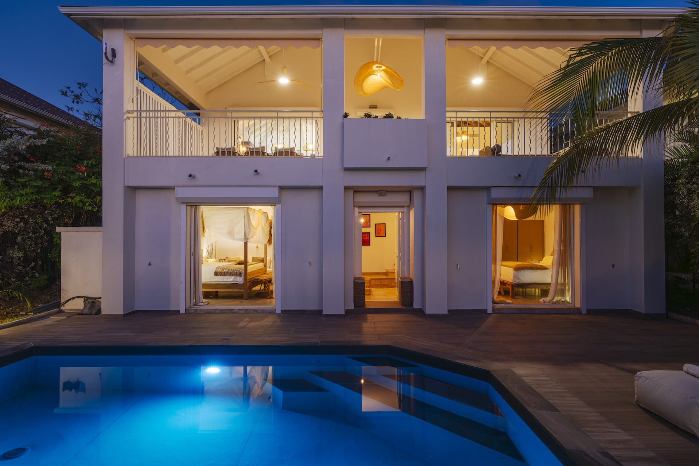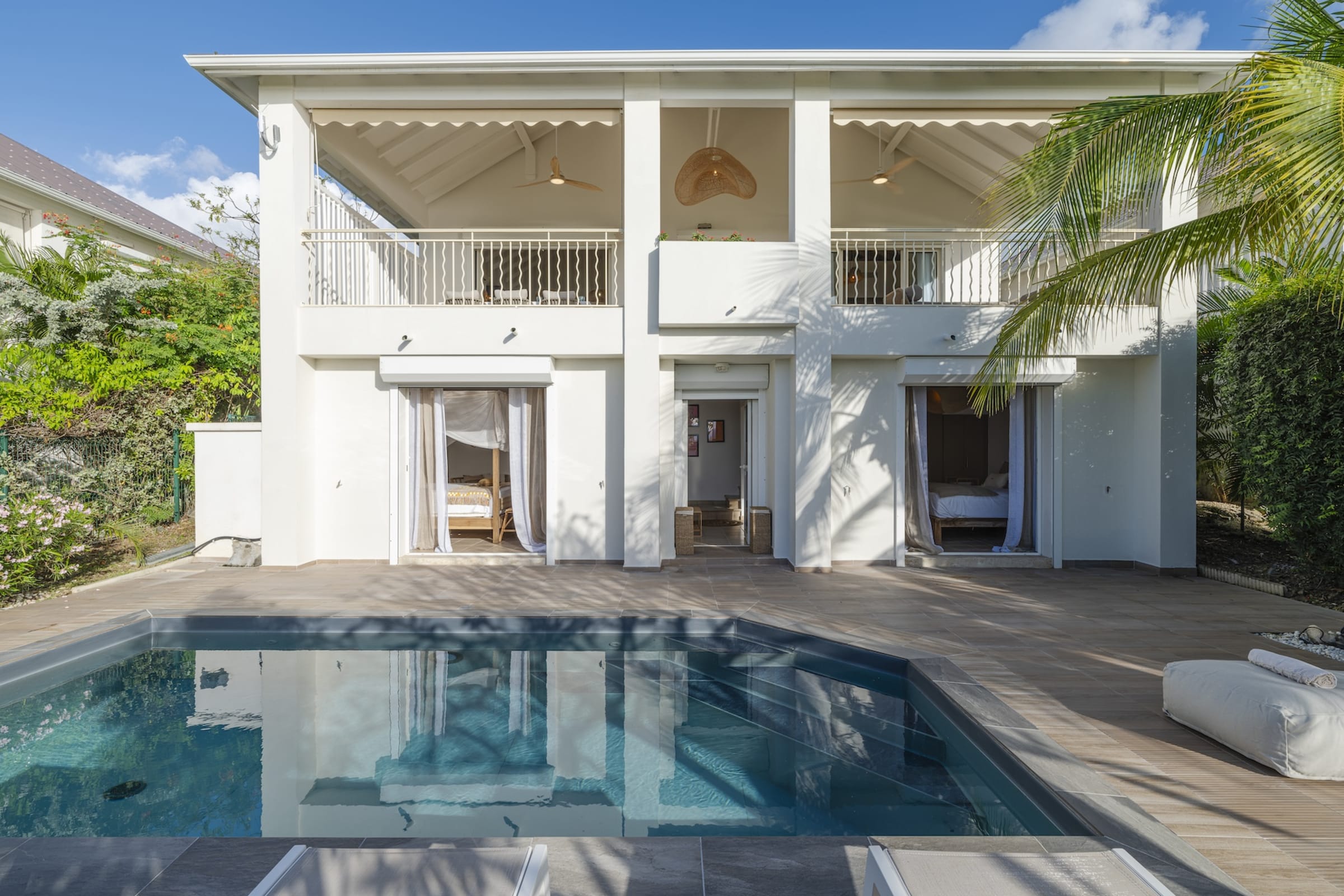 The lower floor features two beautifully decorated bedrooms with direct access to a private pool. Imagine savoring a quiet moment by the water, gently caressed by the sea breeze. Each bedroom is equipped with an en-suite bathroom, guaranteeing a stay marked by privacy and tranquility.