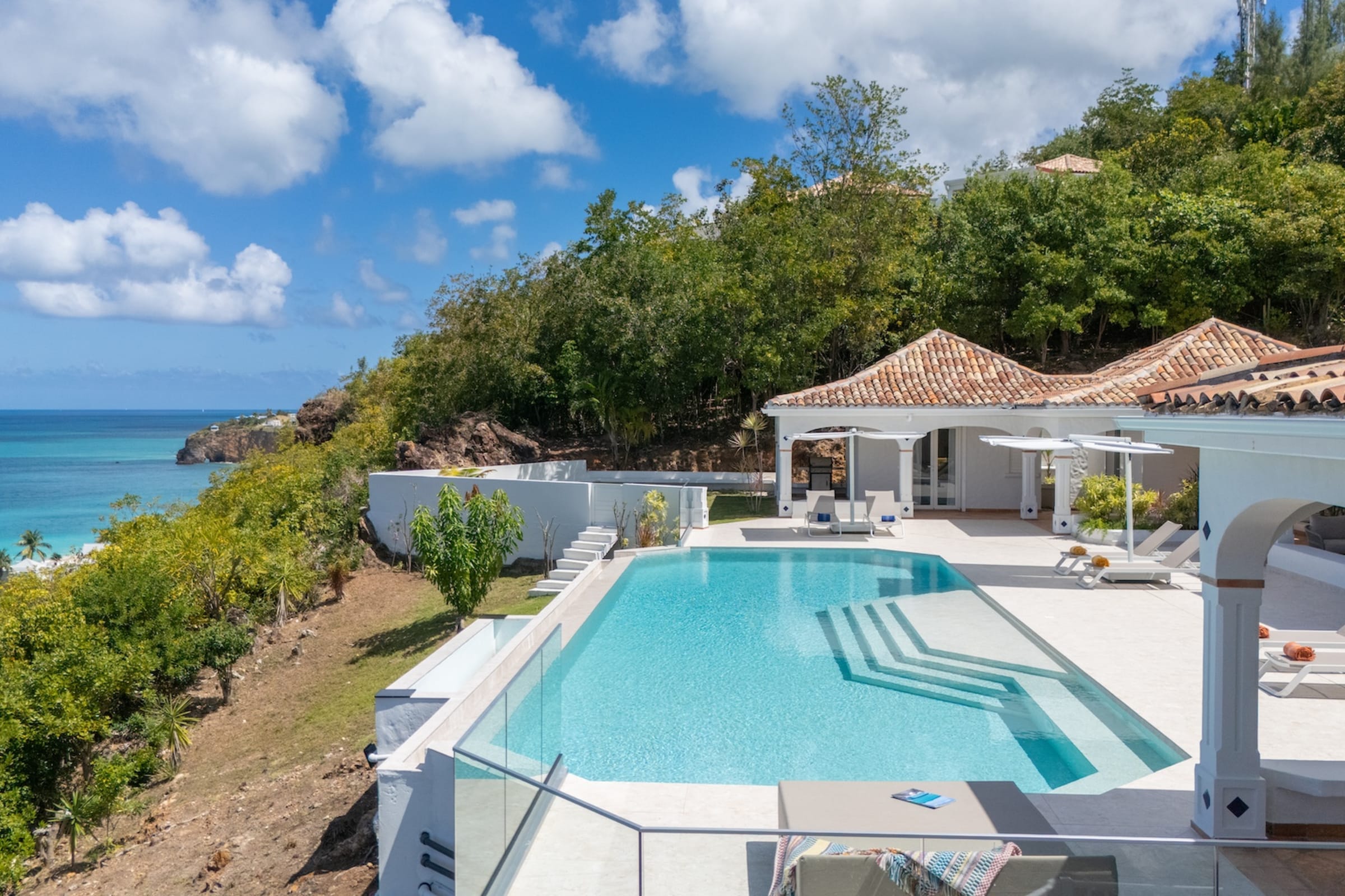 The heated infinity pool invites you to unwind while offering unobstructed views of the ocean and Anguilla Island. The outdoor spaces, including a sun-drenched terrace and a cozy lounge area, are perfect for enjoying al fresco meals or simply relaxing.