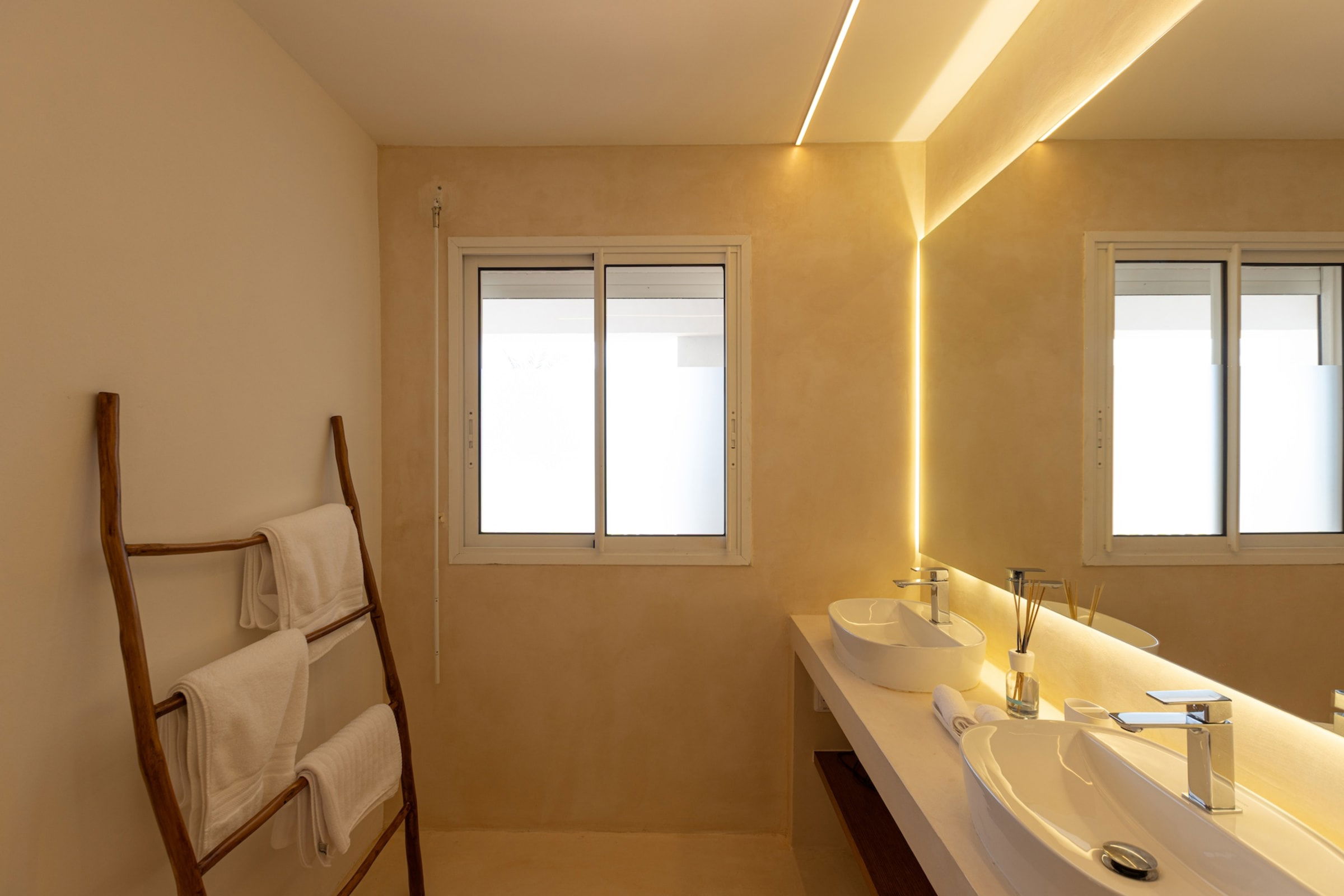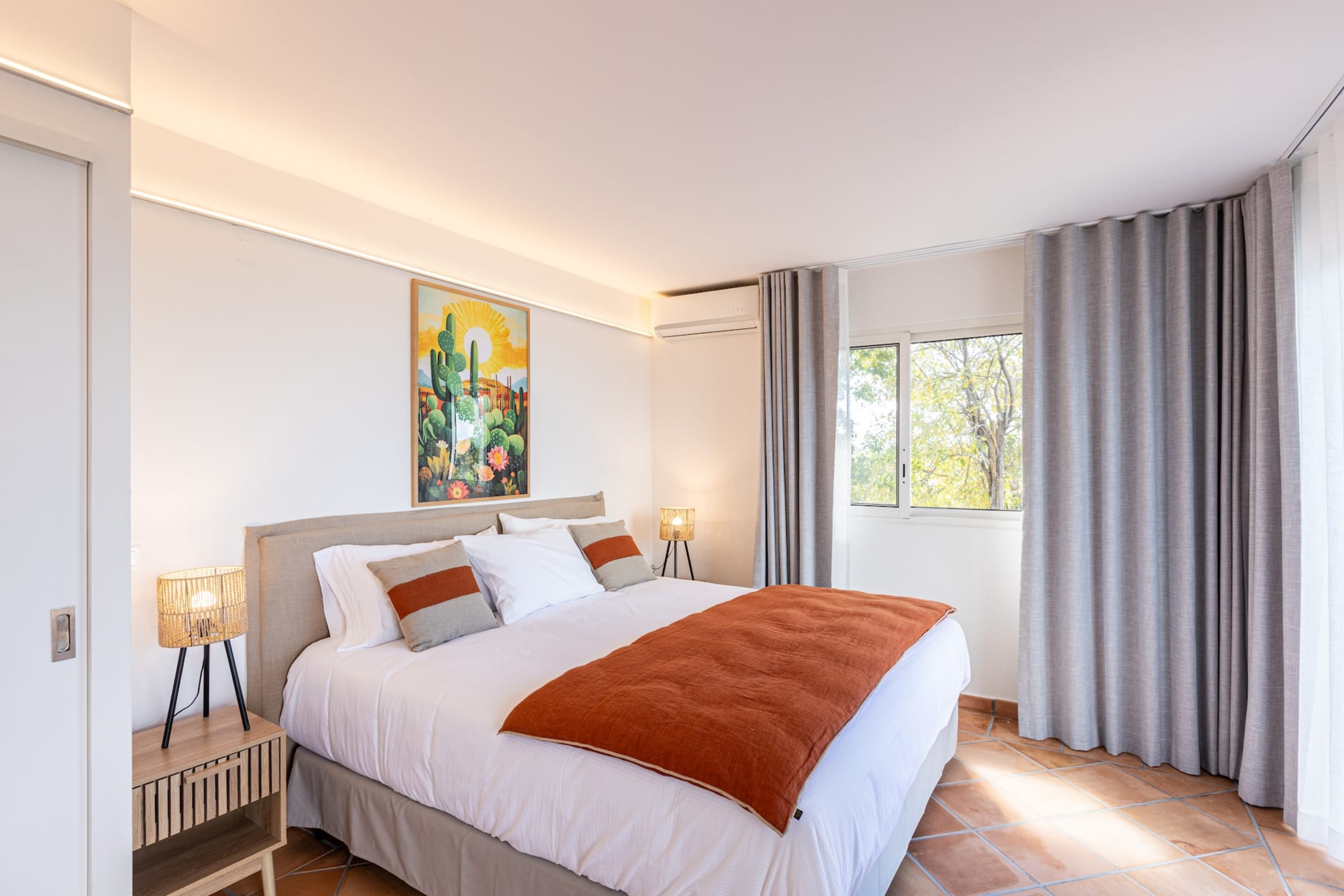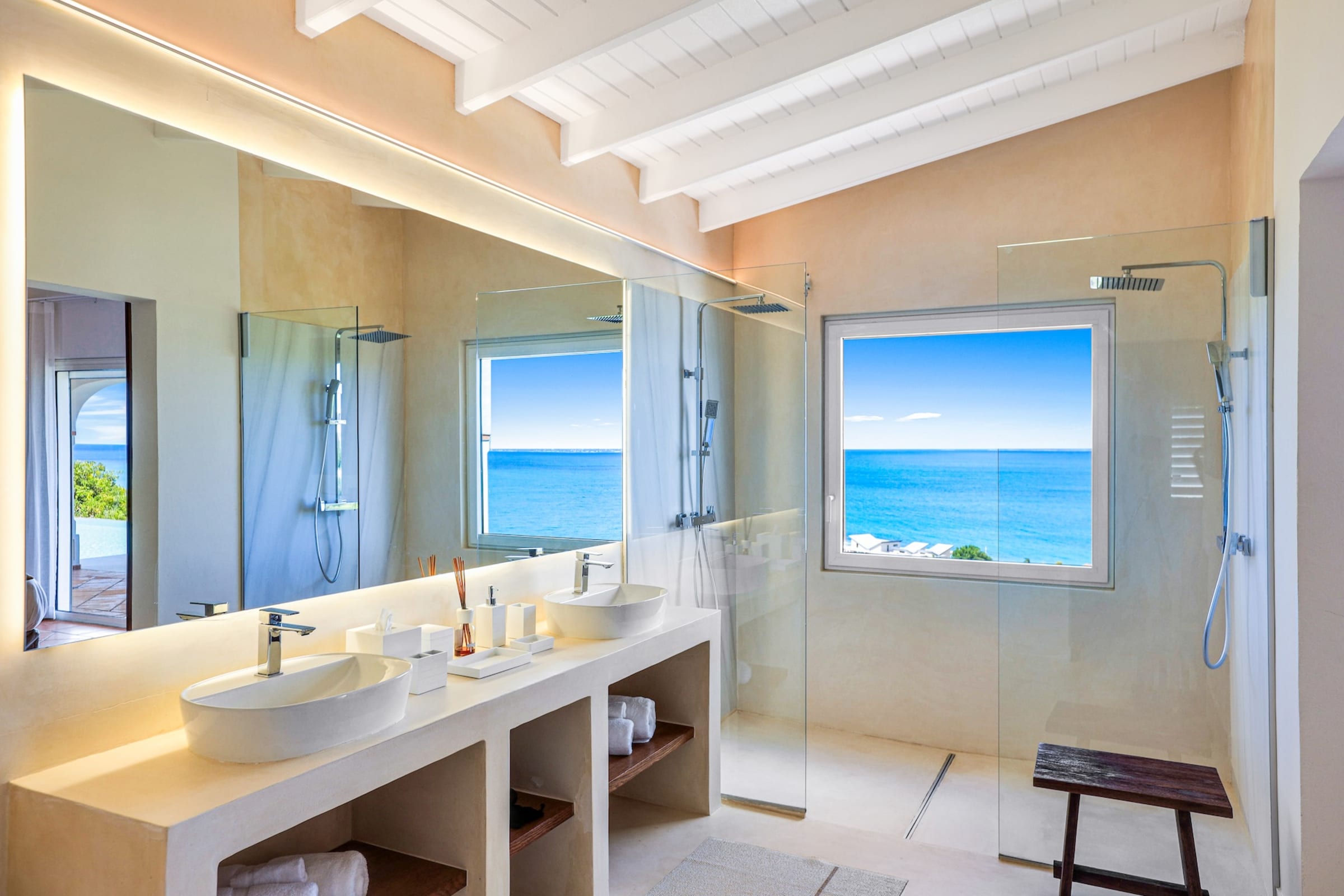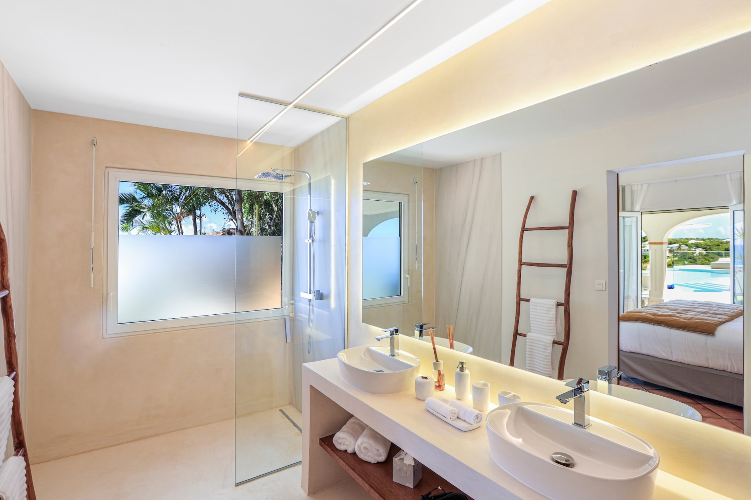 Spread over two levels, the villa features spacious bedrooms, each equipped with a king-size bed. Three of the bedrooms are located on the main level, close to the kitchen and living room, while the other two are situated on the lower level. Each bedroom has its own modern and refined en-suite bathroom. For your comfort, all rooms are equipped with smart TVs, ideal for unwinding in the evening.