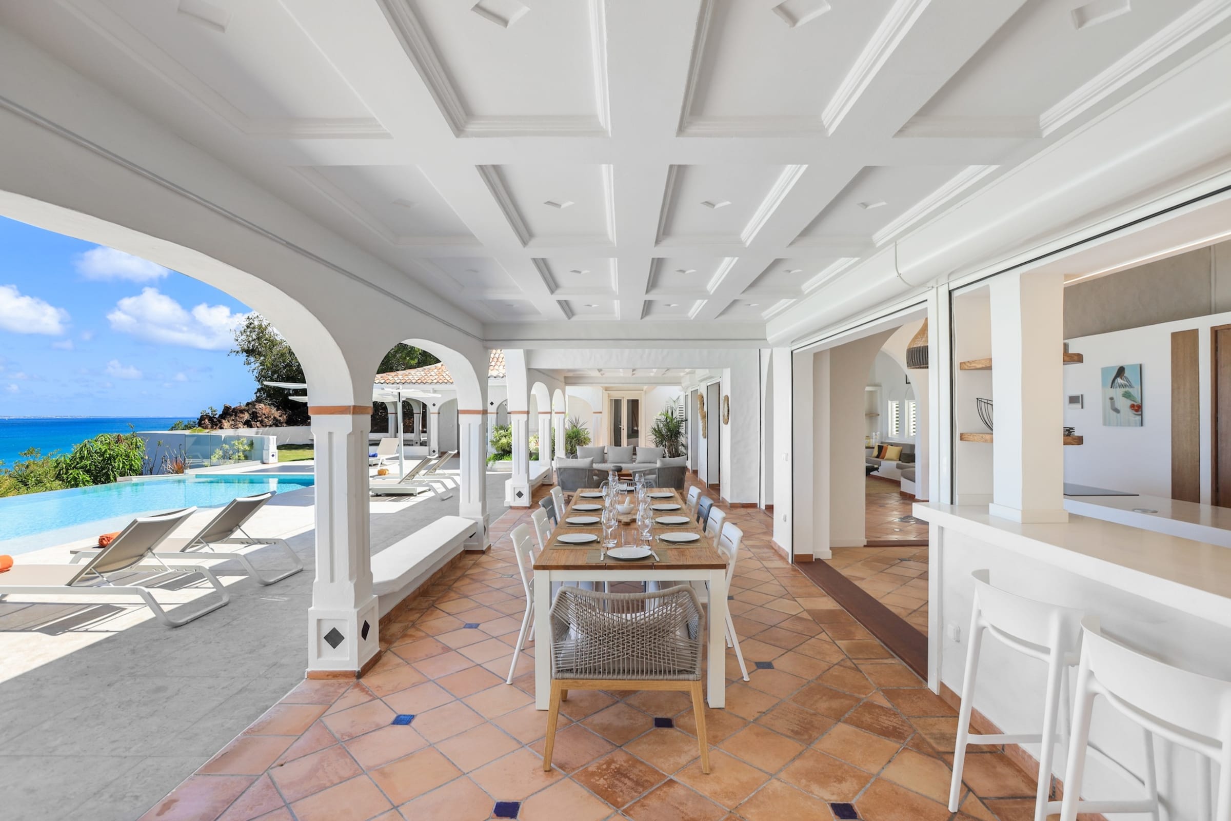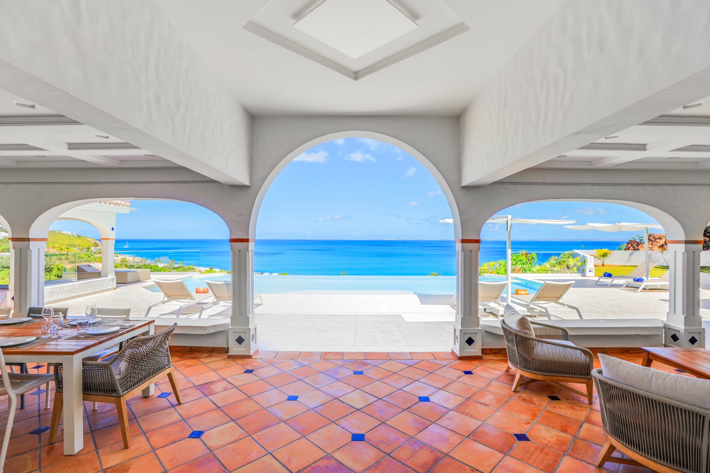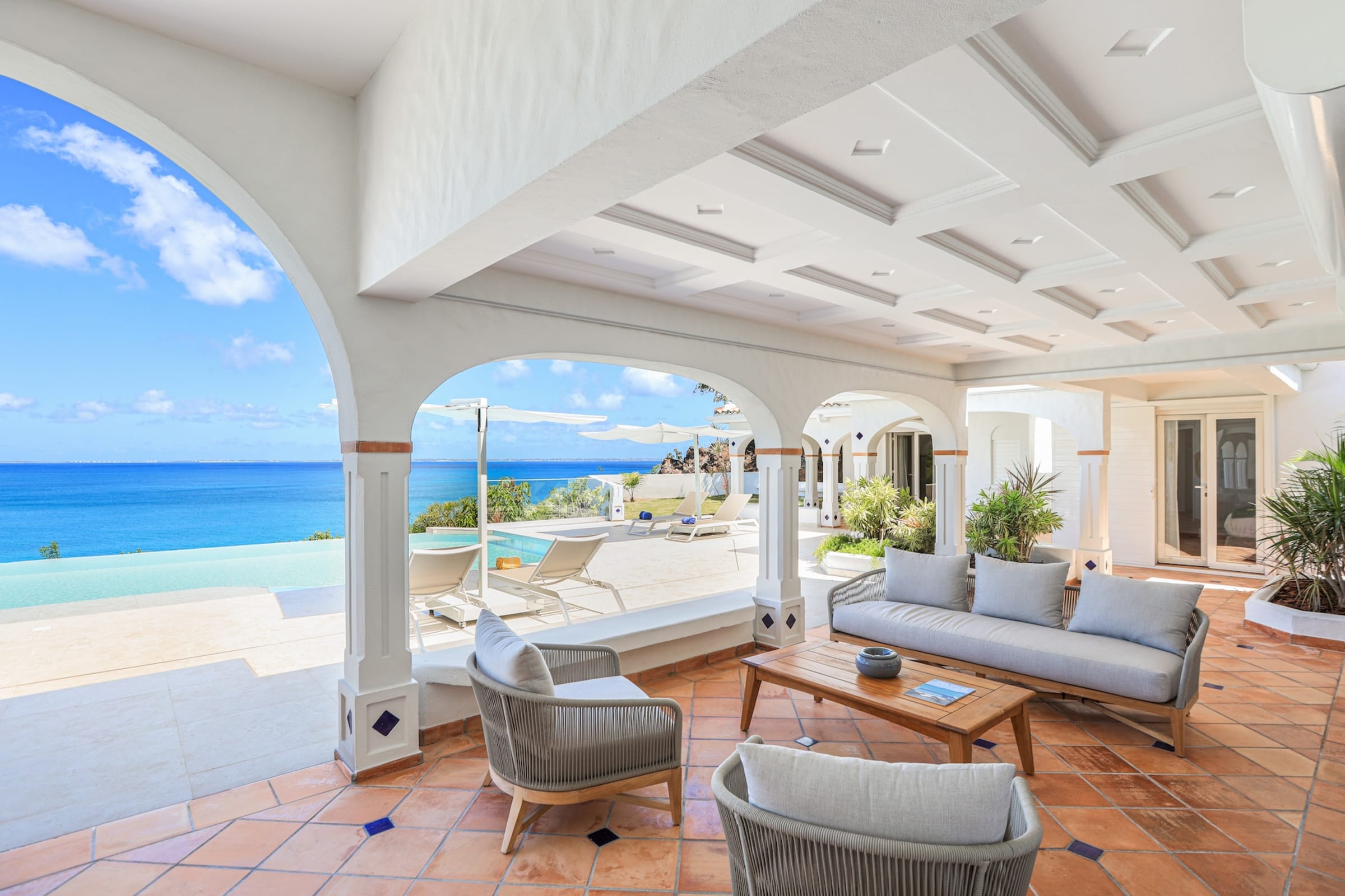 The heated infinity pool invites you to unwind while offering unobstructed views of the ocean and Anguilla Island. The outdoor spaces, including a sun-drenched terrace and a cozy lounge area, are perfect for enjoying al fresco meals or simply relaxing.