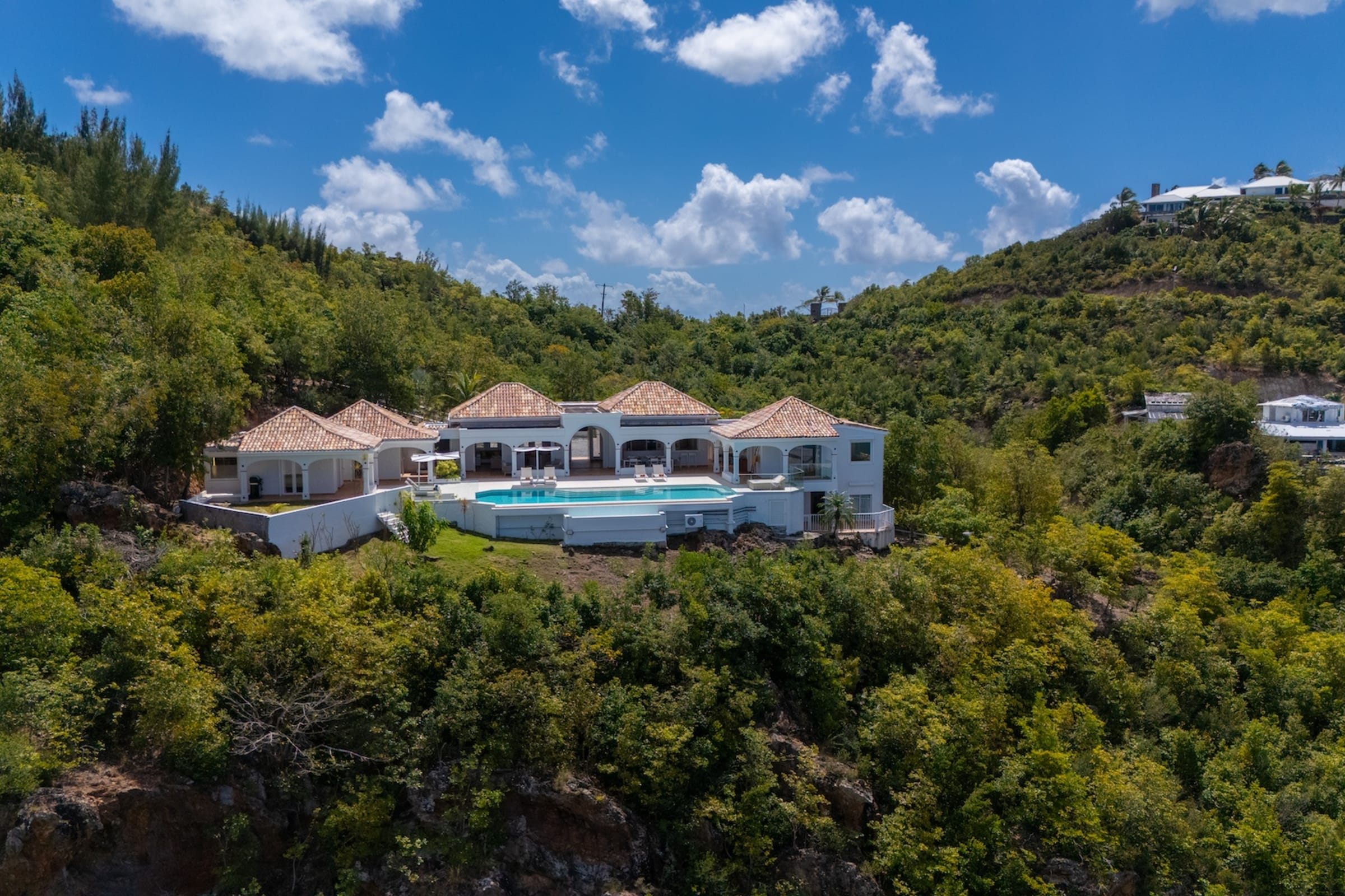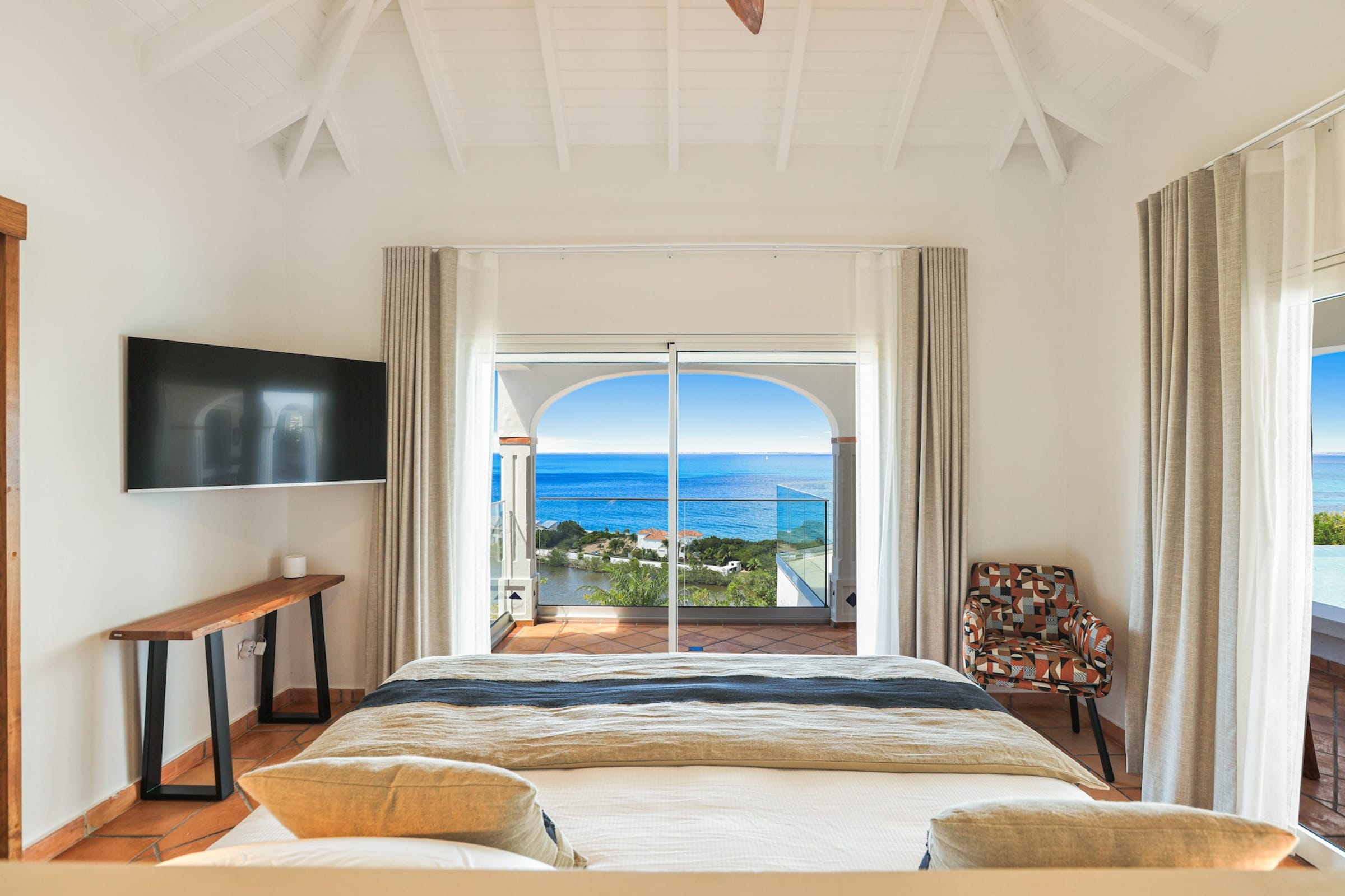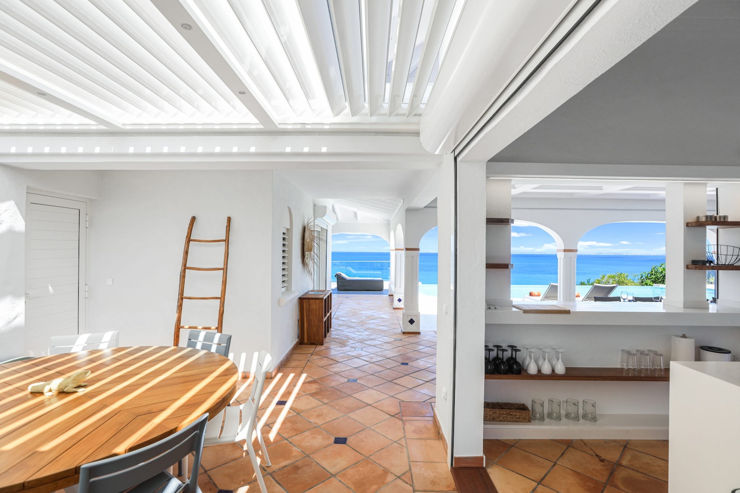 The heated infinity pool invites you to unwind while offering unobstructed views of the ocean and Anguilla Island. The outdoor spaces, including a sun-drenched terrace and a cozy lounge area, are perfect for enjoying al fresco meals or simply relaxing.