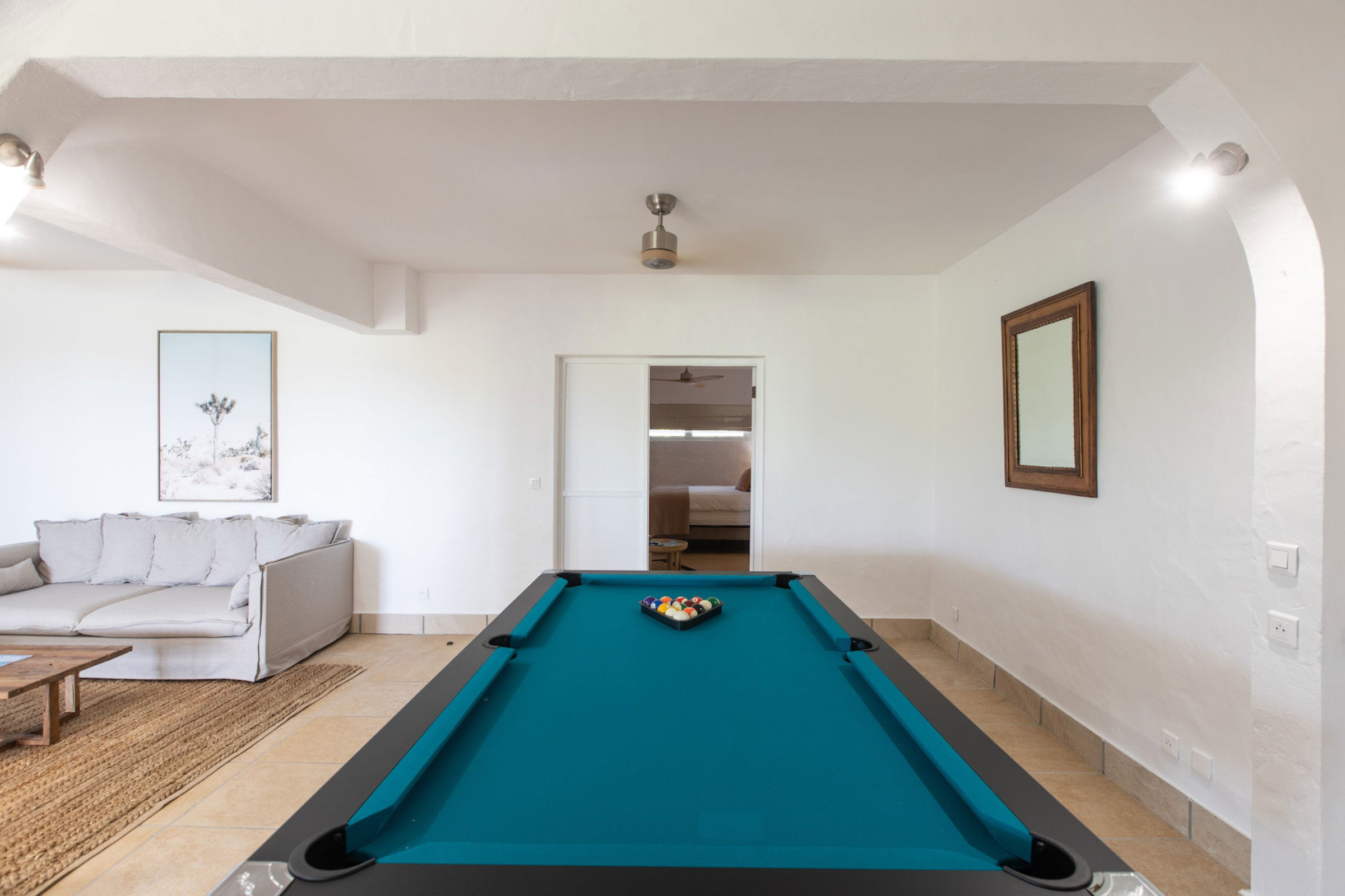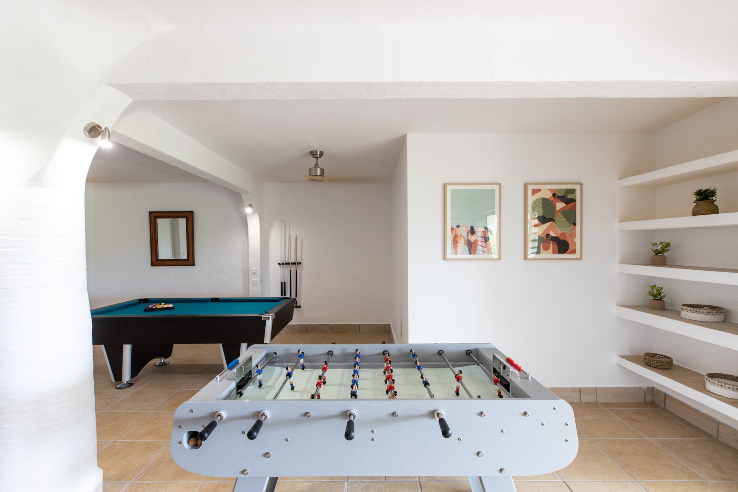 The clever bedroom layout ensures total privacy for residents, with three bedrooms located on the main level, each with its own en-suite bathroom. Descending the outside stairs, you'll discover an independent space comprising two additional bedrooms, each with its own bathroom. A well-equipped games room, with foosball table and pool table, adds a playful dimension to the villa.