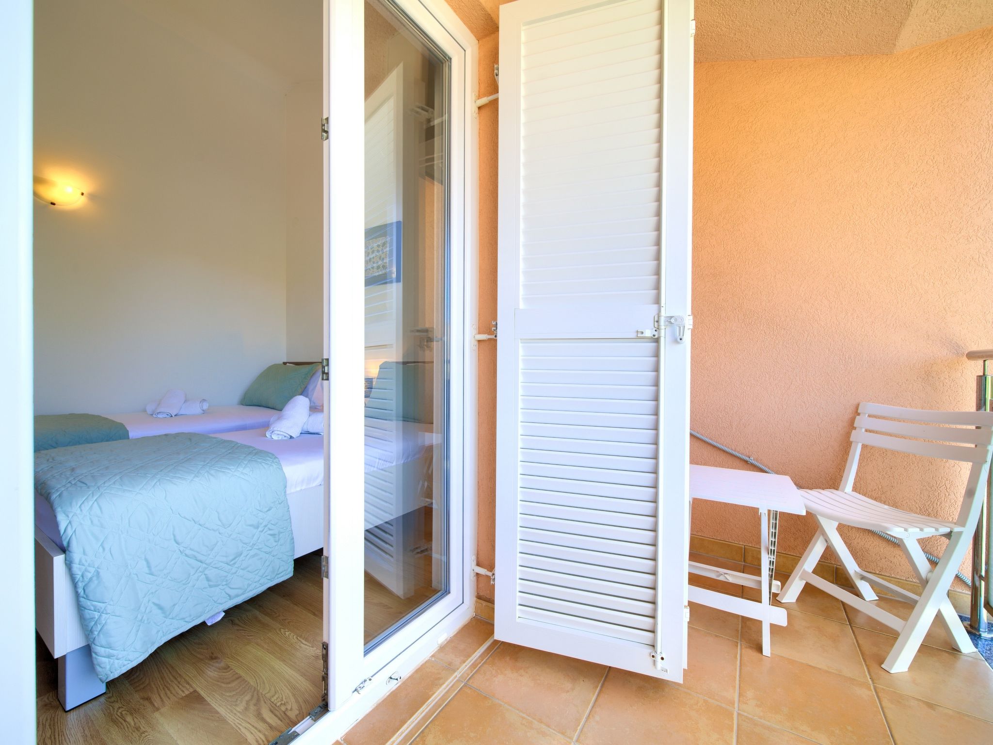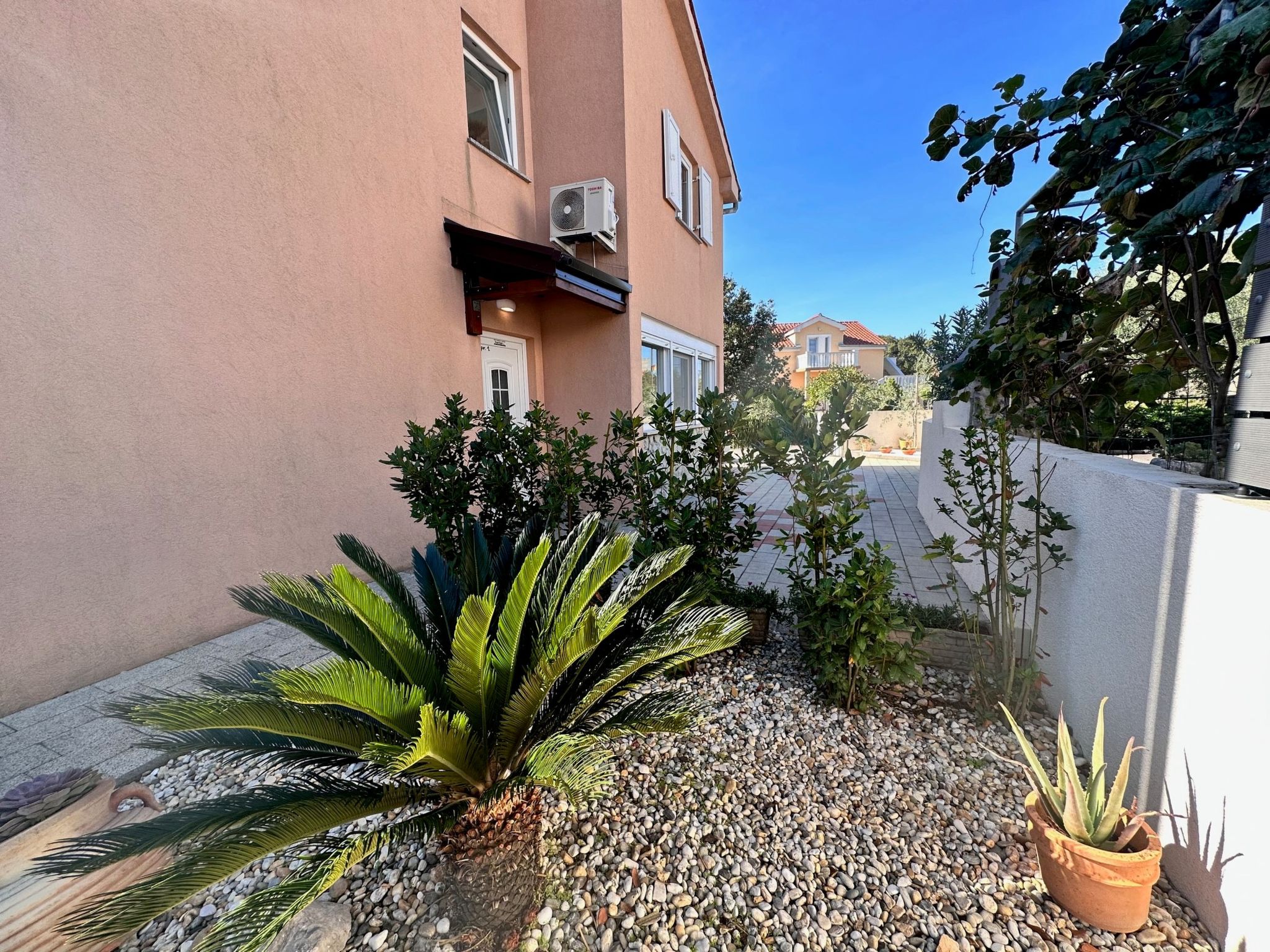 3-room semi-detached house 90 m2 on 2 levels. Comfortable and tasteful furnishings: living/dining room with 1 sofabed (80 cm, length 200 cm), cable TV, digital TV and air conditioning. Exit to the terrace. Open kitchen (oven, dishwasher, 4 induction hot plates, toaster, kettle, microwave, freezer, electric coffee machine). Shower/WC. Upper floor: 1 room with 1 double bed (160 cm, length 200 cm), air conditioning. Exit to the balcony. 1 room with 2 beds (90 cm, length 200 cm), air conditioning. Exit to the balcony. Bath/WC. Forced-air heating. Balcony 8 m2, terrace 30 m2 partly roofed. Terrace furniture, balcony furniture, barbecue, deck chairs (2). Partial view of the sea. Facilities: baby cot (extra). Internet (WiFi, free).