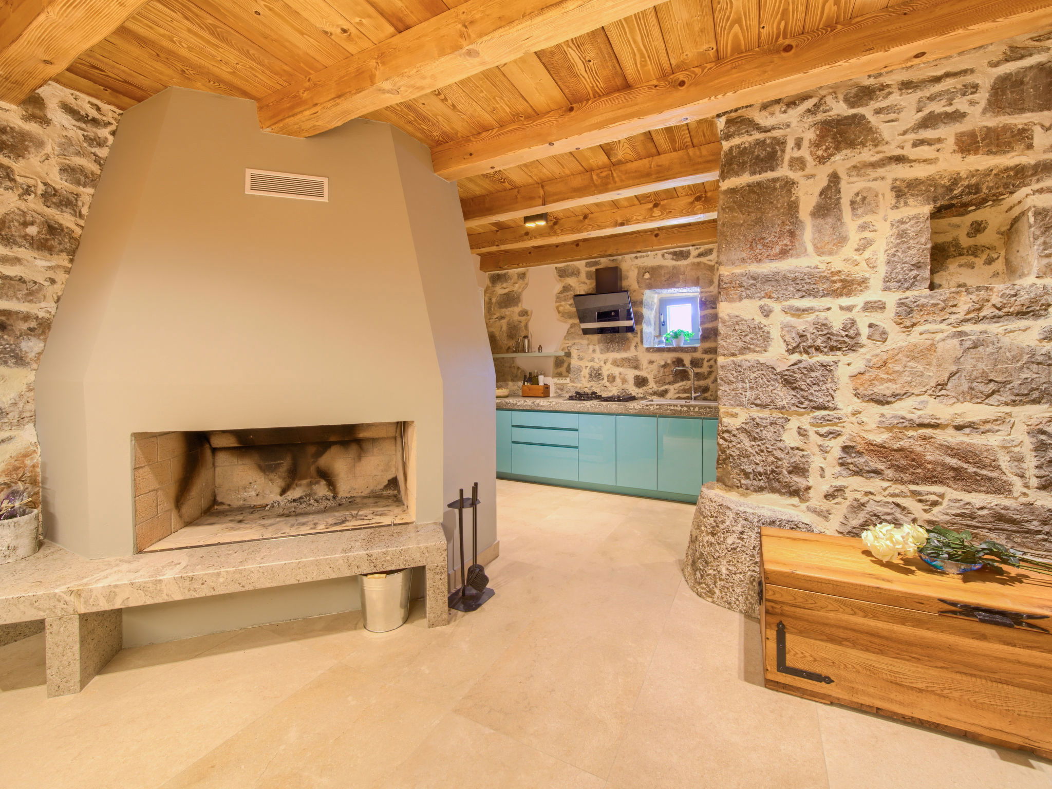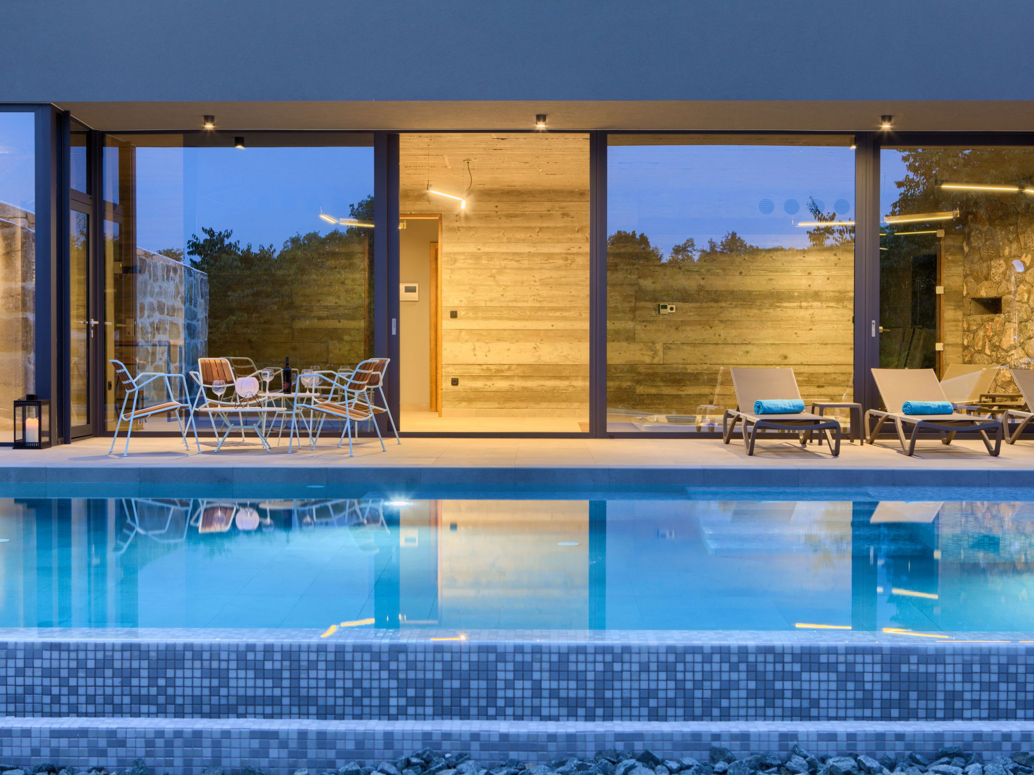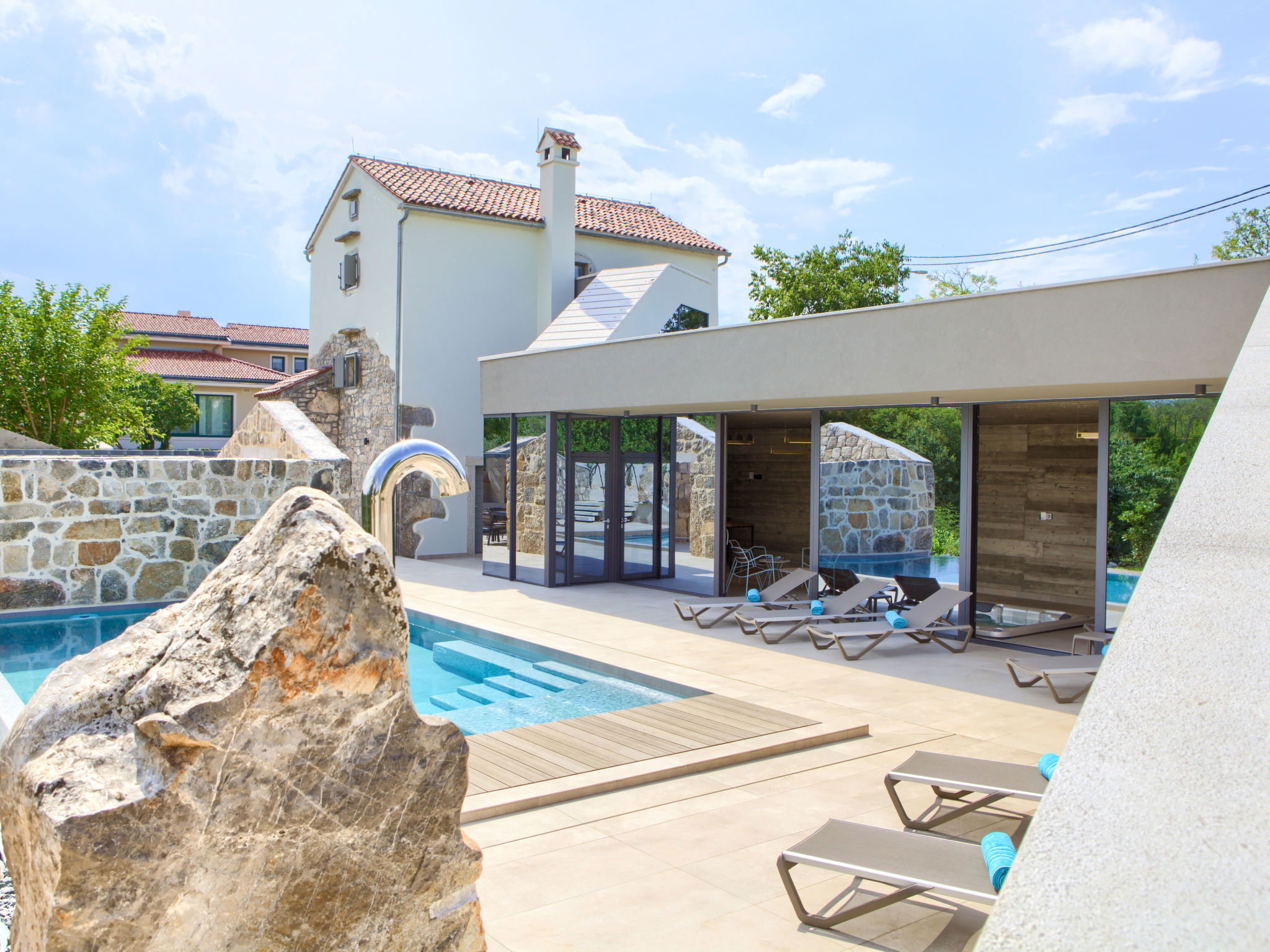Washing machine, tumble dryer (for shared use) at detached small house. Beautiful, rustic, comfortable single-family house "Jerini Main House", 3 storeys. In the hamlet Bajčići 10 km from the centre of Krk, in a quiet, sunny position, 5.5 km from the sea, in the countryside. Private: property 1'500 m2, well-kept garden (fenced) with wildlife garden and trees, swimming pool angular, heated (50 m2, depth 145 cm, seasonal availability: 01.Jan. - 31.Dec.) with internal staircase and salt-electrolysis pool-cleaning system. Shower/WC in the pool area, outdoor shower, hot tub, terrace (140 m2), garden furniture, barbecue, pool maintenance by the owner/gardener. In the house: internet access, sauna, fitness room, spa area, air conditioning. Parking (for 3 cars) at the house on the premises. Shop 450 m, supermarket 9 km, restaurant 550 m, bus stop 400 m, pebble beach 6 km. The owner does not accept any youth groups. Please note: airfield 22 km from the property.