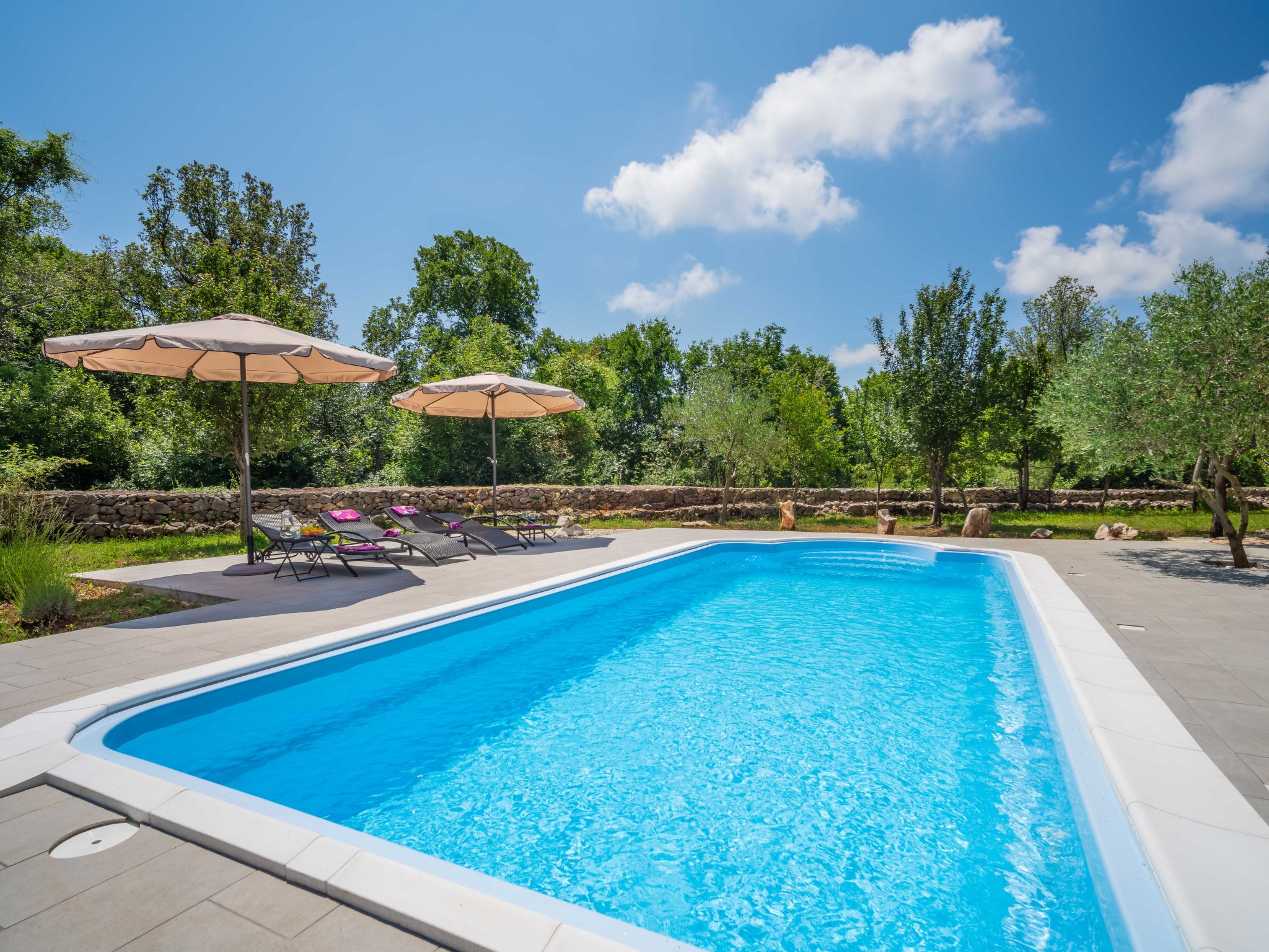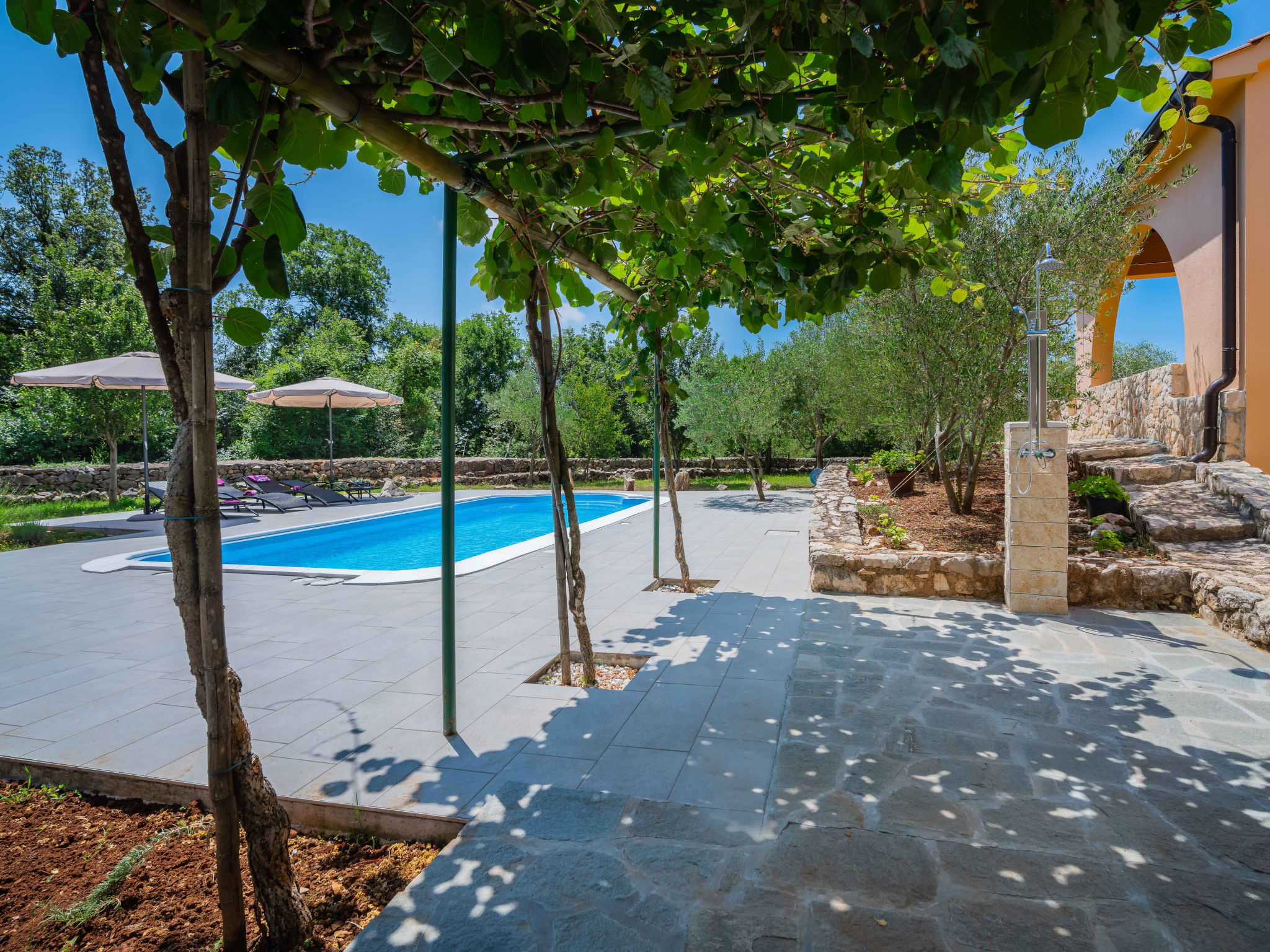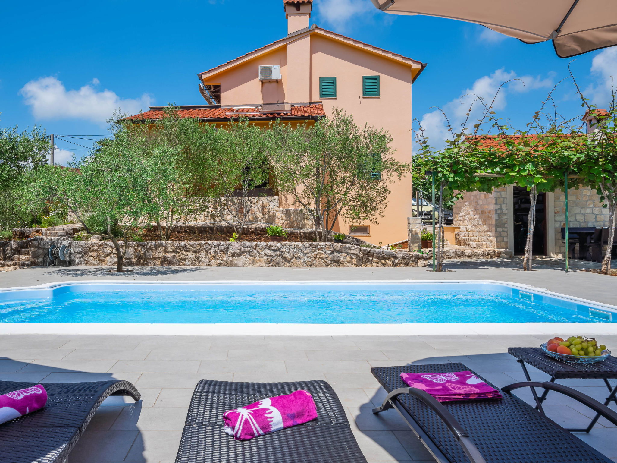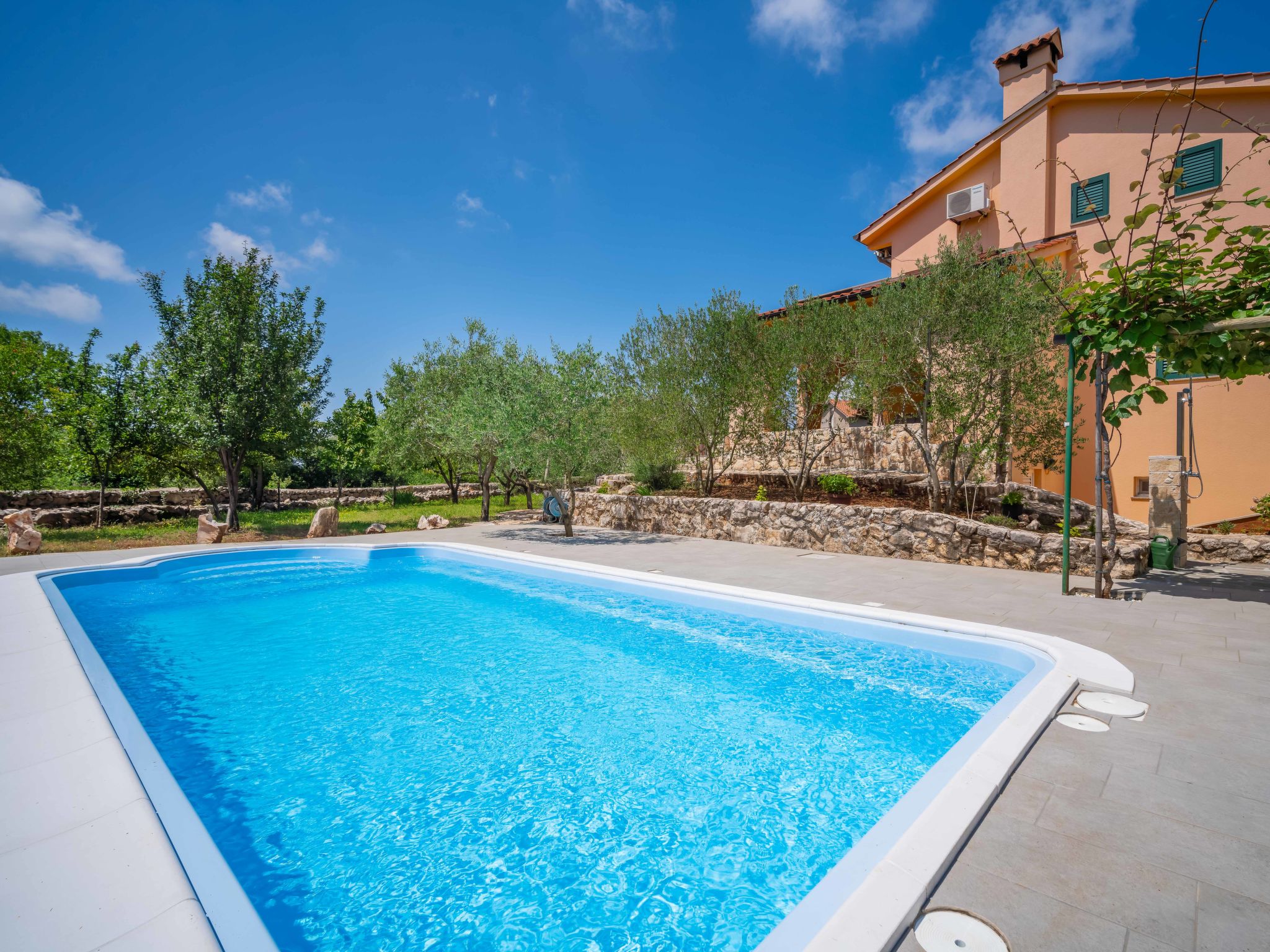 Kras: Single-family house "Mila", 2 storeys. 3.5 km from the centre of Dobrinj, 9 km from the centre of Malinska, 11 km from the centre of Krk, in a quiet, sunny position, 8.5 km from the sea, in the countryside. Private: property 1'400 m2, lawn 400 m2 trees, swimming pool angular (8 x 4 m, depth 140 cm, seasonal availability: 01.May. - 15.Oct.) with internal staircase. Outdoor shower, terrace (24 m2), garden furniture, barbecue. In the house: internet access, washing machine. Parking (for 4 cars) at the house on the premises. Grocery 700 m, supermarket 8.5 km, restaurant 3.5 km, bus stop 6.3 km, pebble beach 8.5 km, concrete beach 8.5 km. Groups of teenagers on request only. By groups of young people double deposit is requested on arrival.