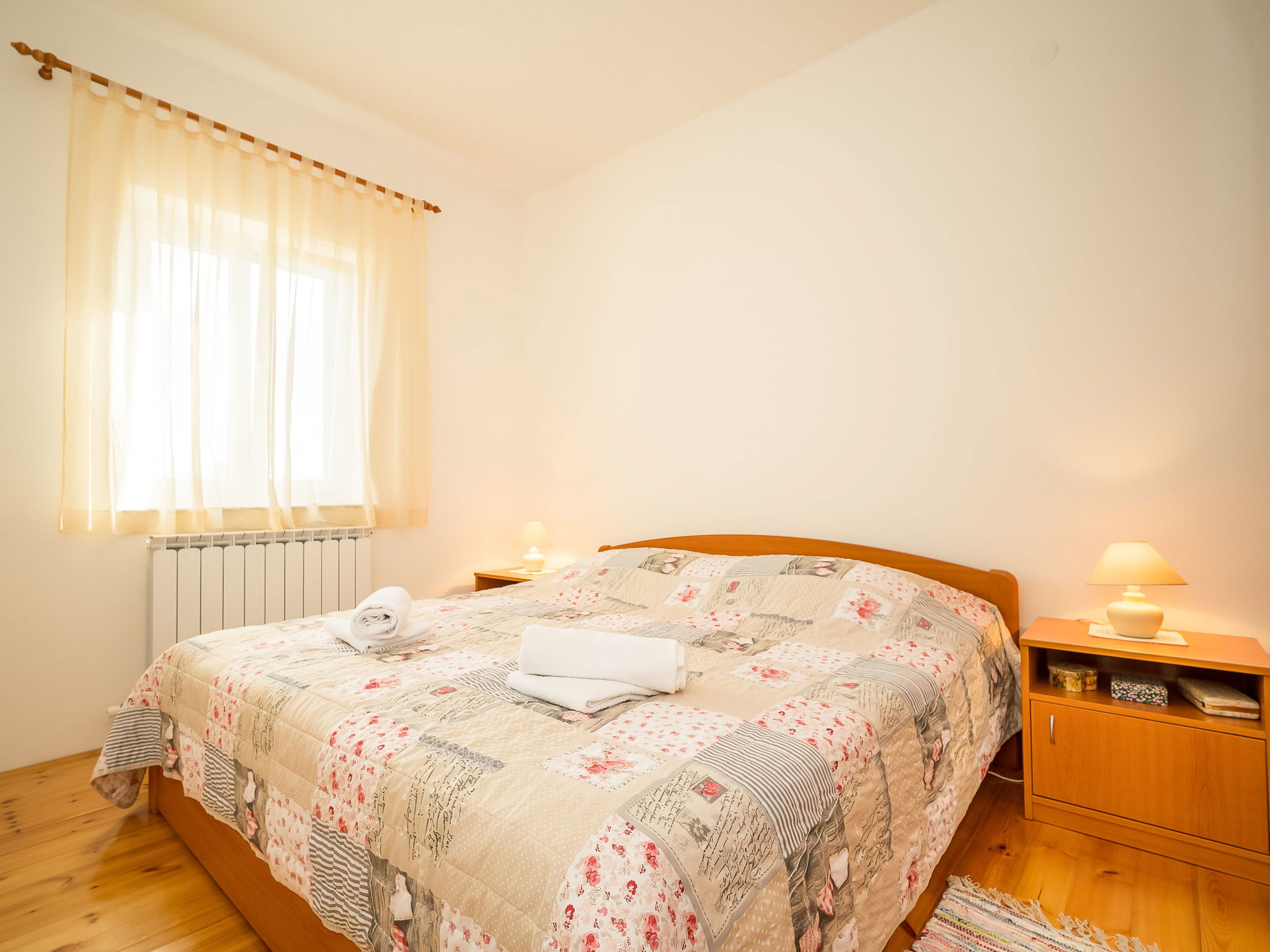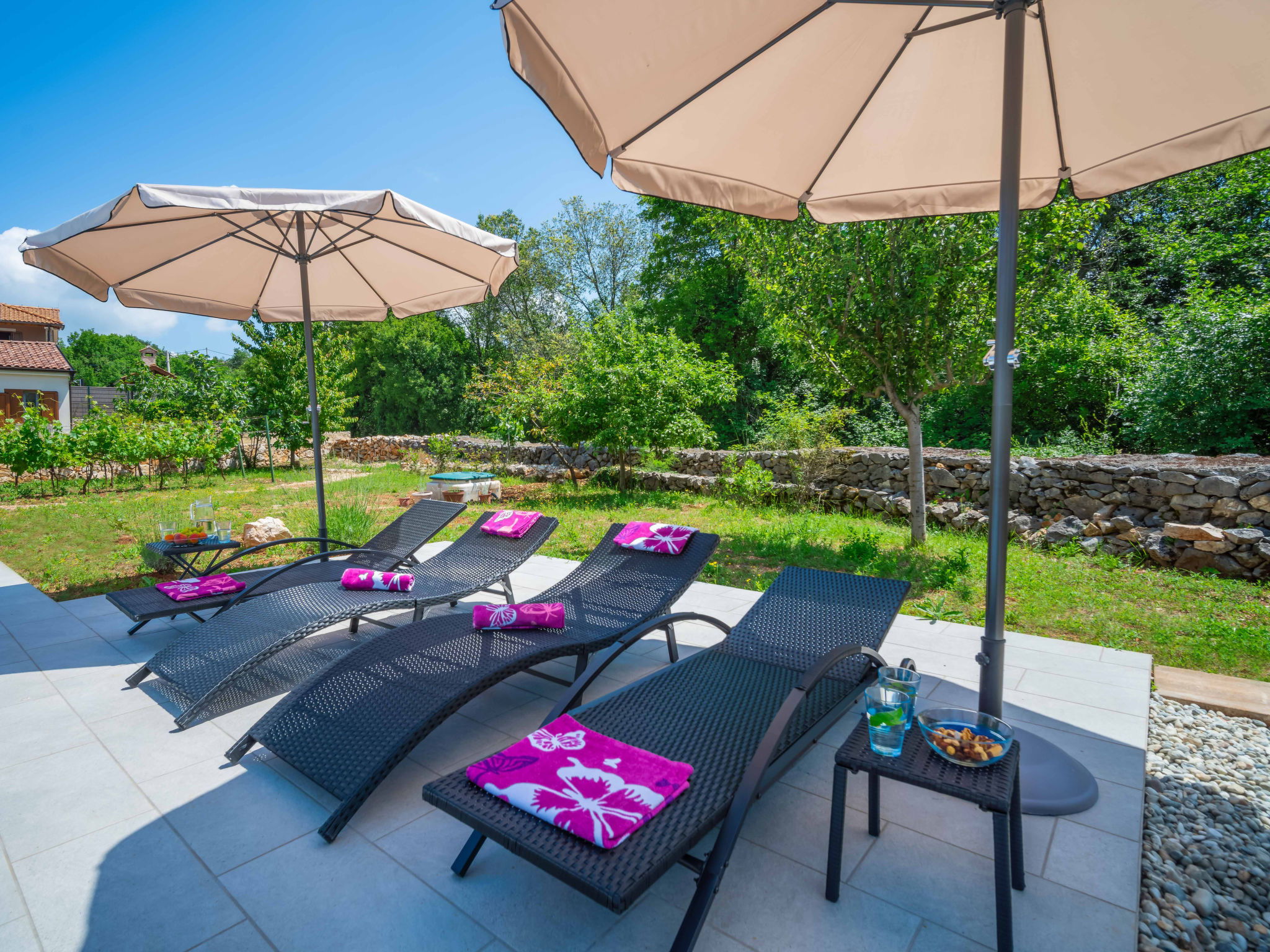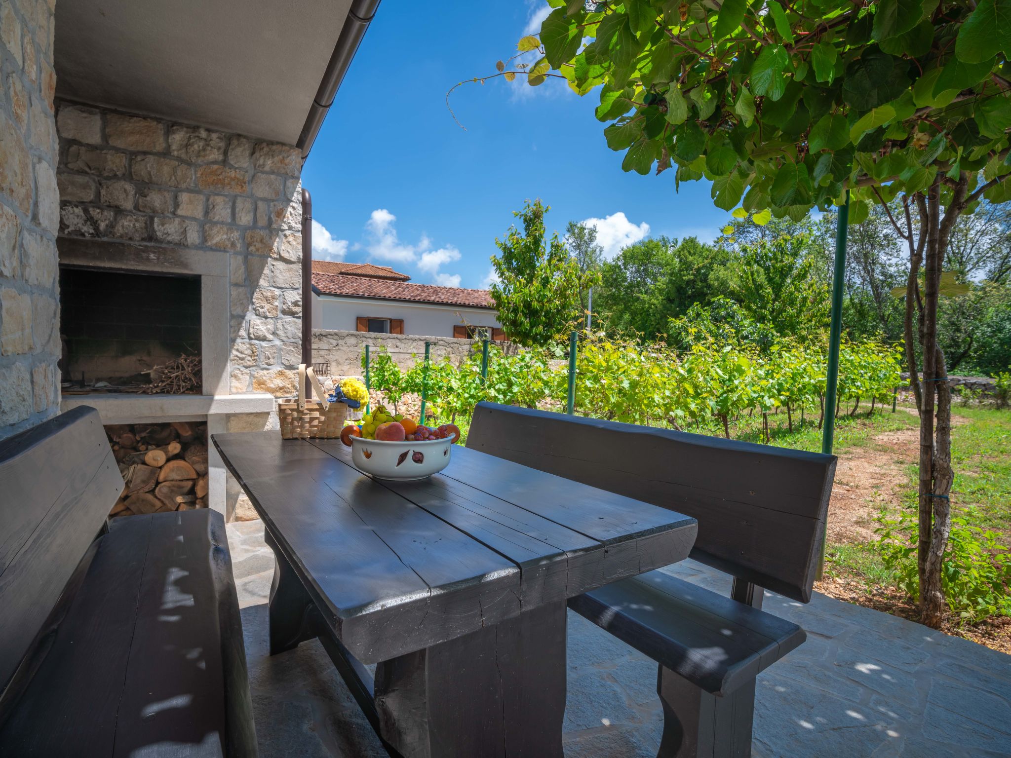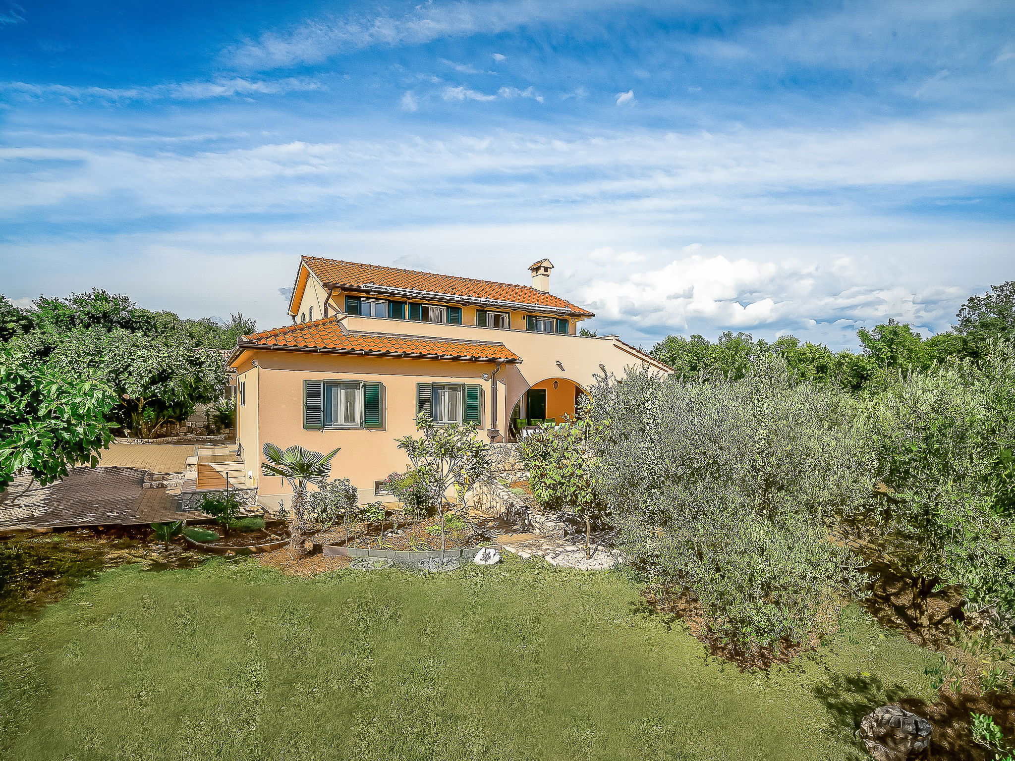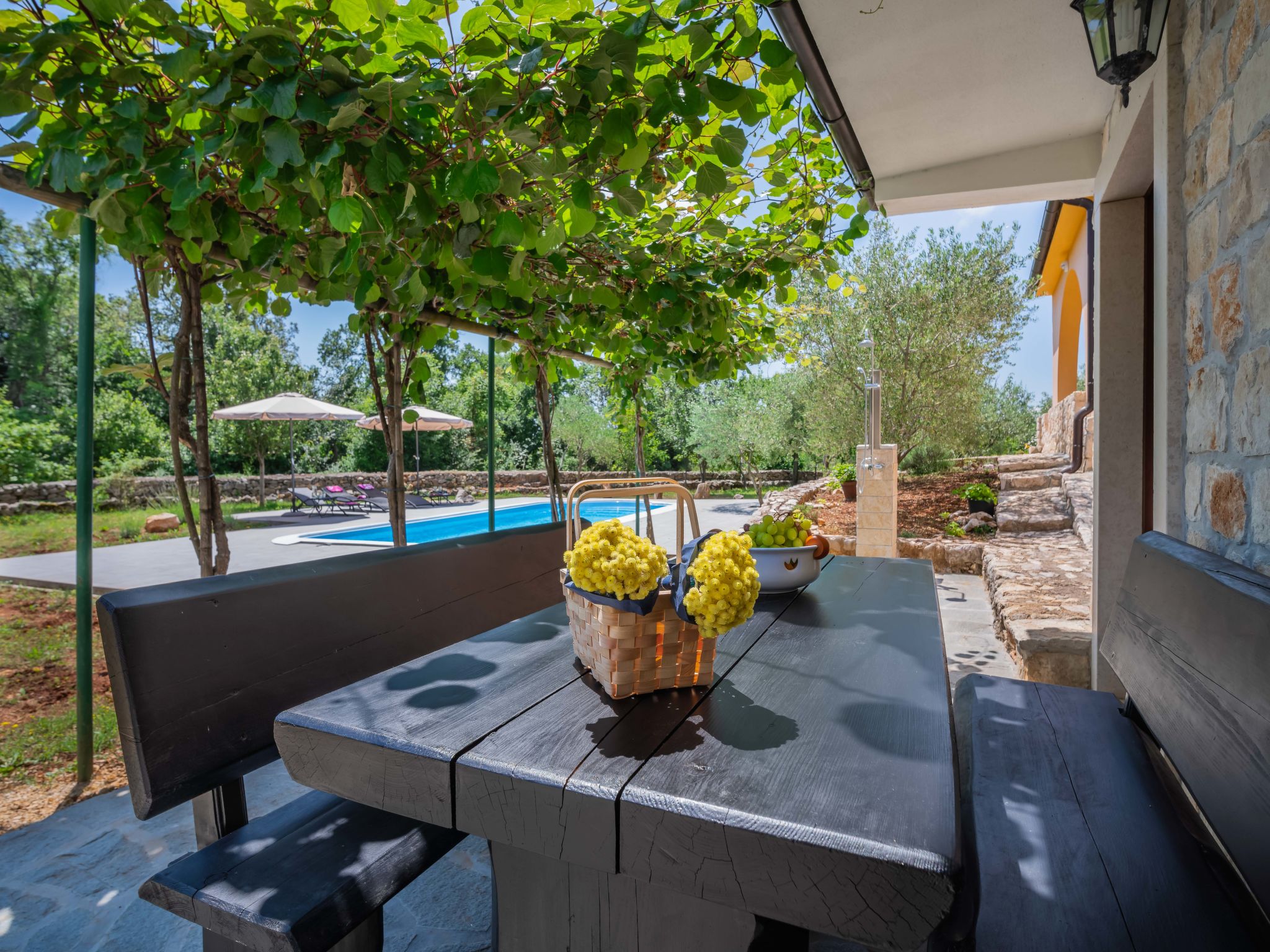 Kras: Single-family house "Mila", 2 storeys. 3.5 km from the centre of Dobrinj, 9 km from the centre of Malinska, 11 km from the centre of Krk, in a quiet, sunny position, 8.5 km from the sea, in the countryside. Private: property 1'400 m2, lawn 400 m2 trees, swimming pool angular (8 x 4 m, depth 140 cm, seasonal availability: 01.May. - 15.Oct.) with internal staircase. Outdoor shower, terrace (24 m2), garden furniture, barbecue. In the house: internet access, washing machine. Parking (for 4 cars) at the house on the premises. Grocery 700 m, supermarket 8.5 km, restaurant 3.5 km, bus stop 6.3 km, pebble beach 8.5 km, concrete beach 8.5 km. Groups of teenagers on request only. By groups of young people double deposit is requested on arrival.