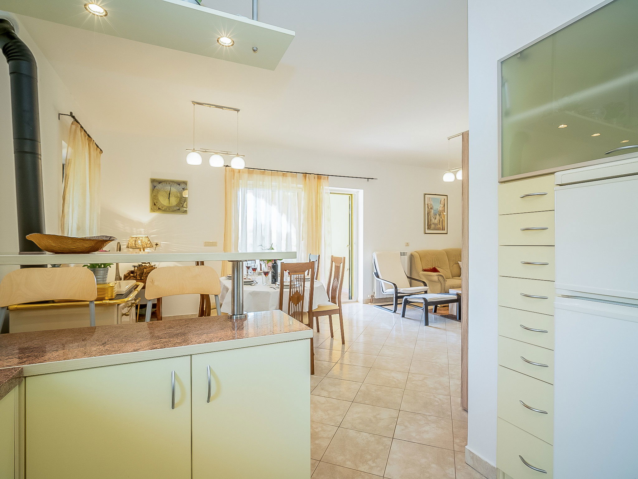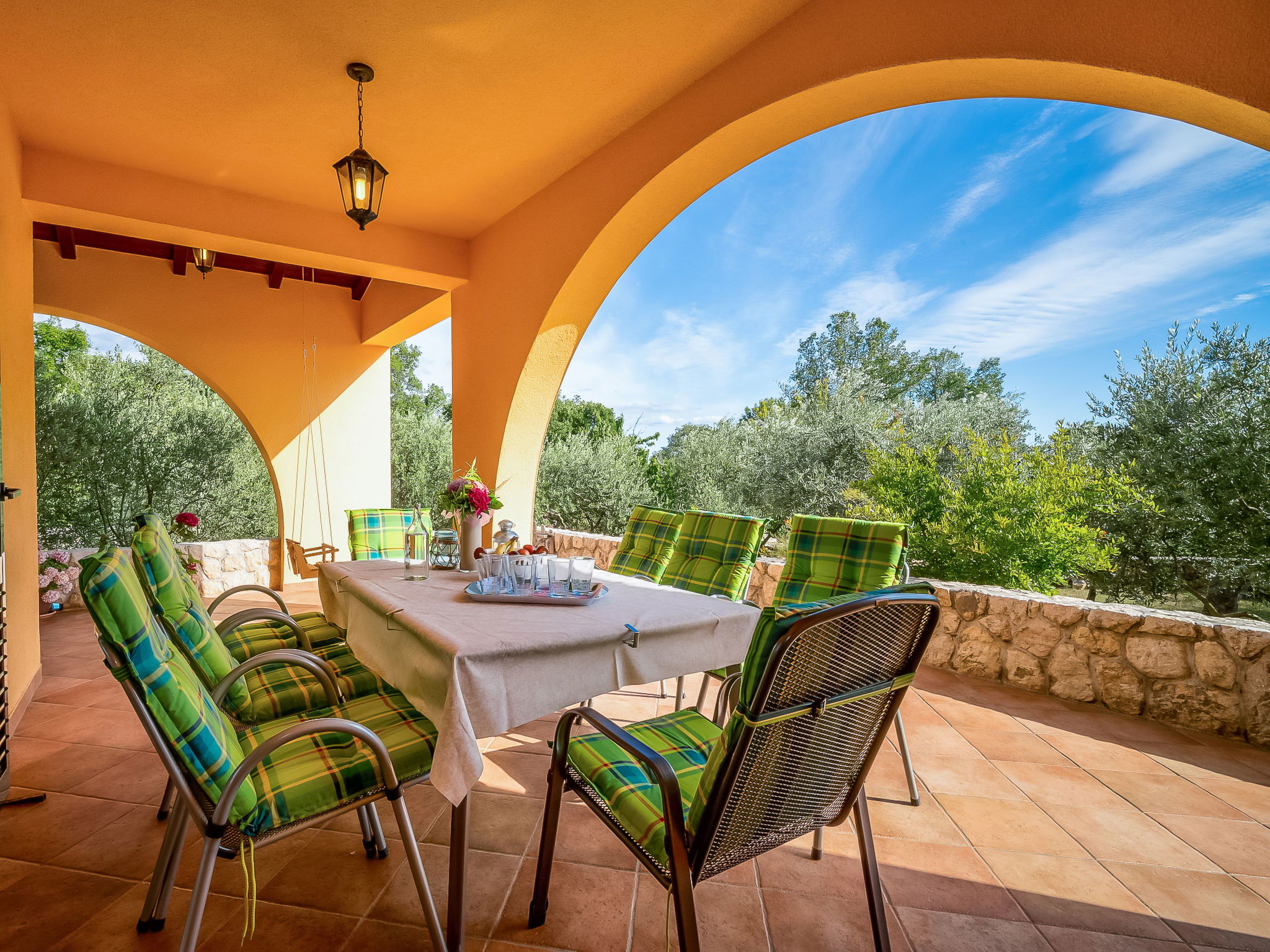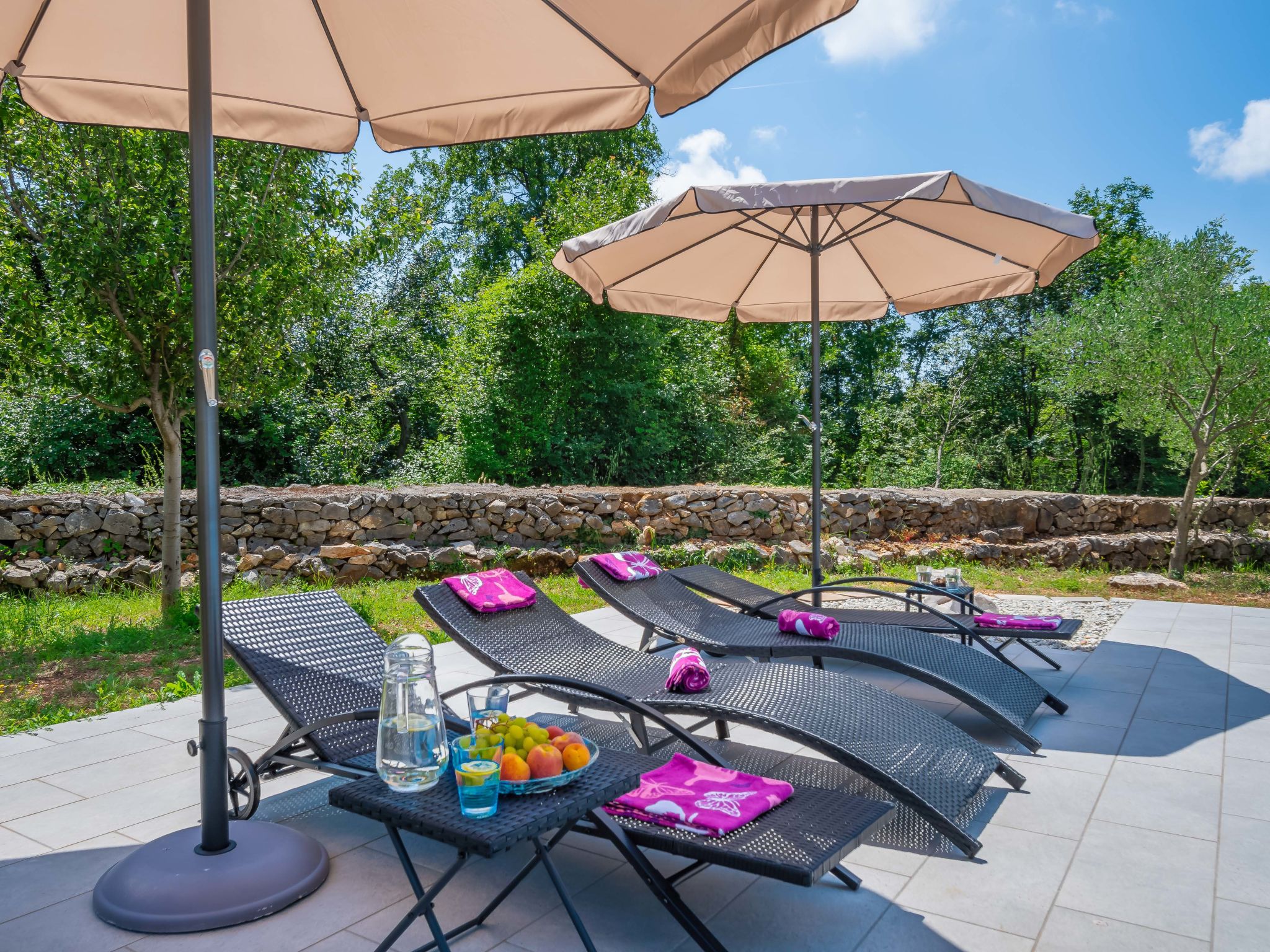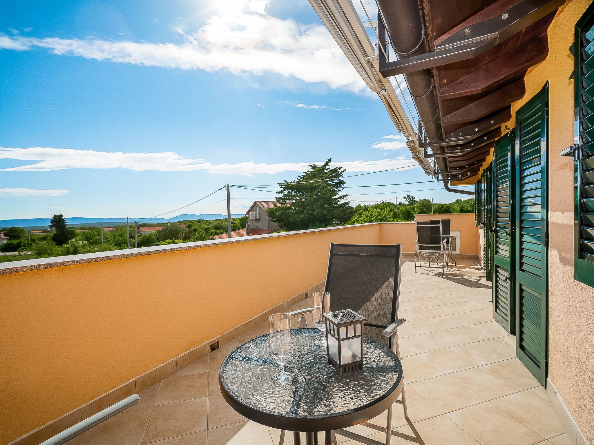 Kras: Single-family house "Mila", 2 storeys. 3.5 km from the centre of Dobrinj, 9 km from the centre of Malinska, 11 km from the centre of Krk, in a quiet, sunny position, 8.5 km from the sea, in the countryside. Private: property 1'400 m2, lawn 400 m2 trees, swimming pool angular (8 x 4 m, depth 140 cm, seasonal availability: 01.May. - 15.Oct.) with internal staircase. Outdoor shower, terrace (24 m2), garden furniture, barbecue. In the house: internet access, washing machine. Parking (for 4 cars) at the house on the premises. Grocery 700 m, supermarket 8.5 km, restaurant 3.5 km, bus stop 6.3 km, pebble beach 8.5 km, concrete beach 8.5 km. Groups of teenagers on request only. By groups of young people double deposit is requested on arrival.