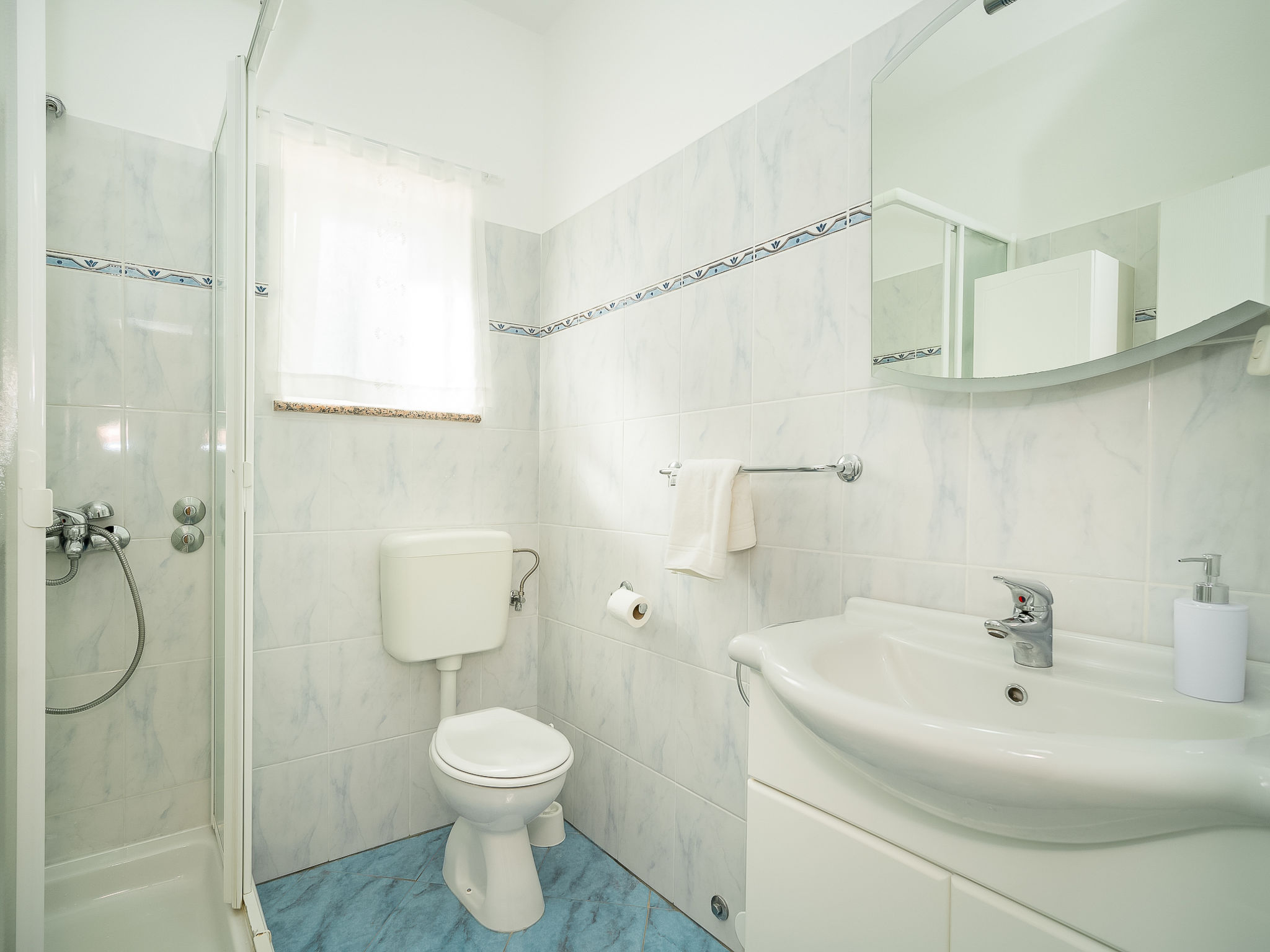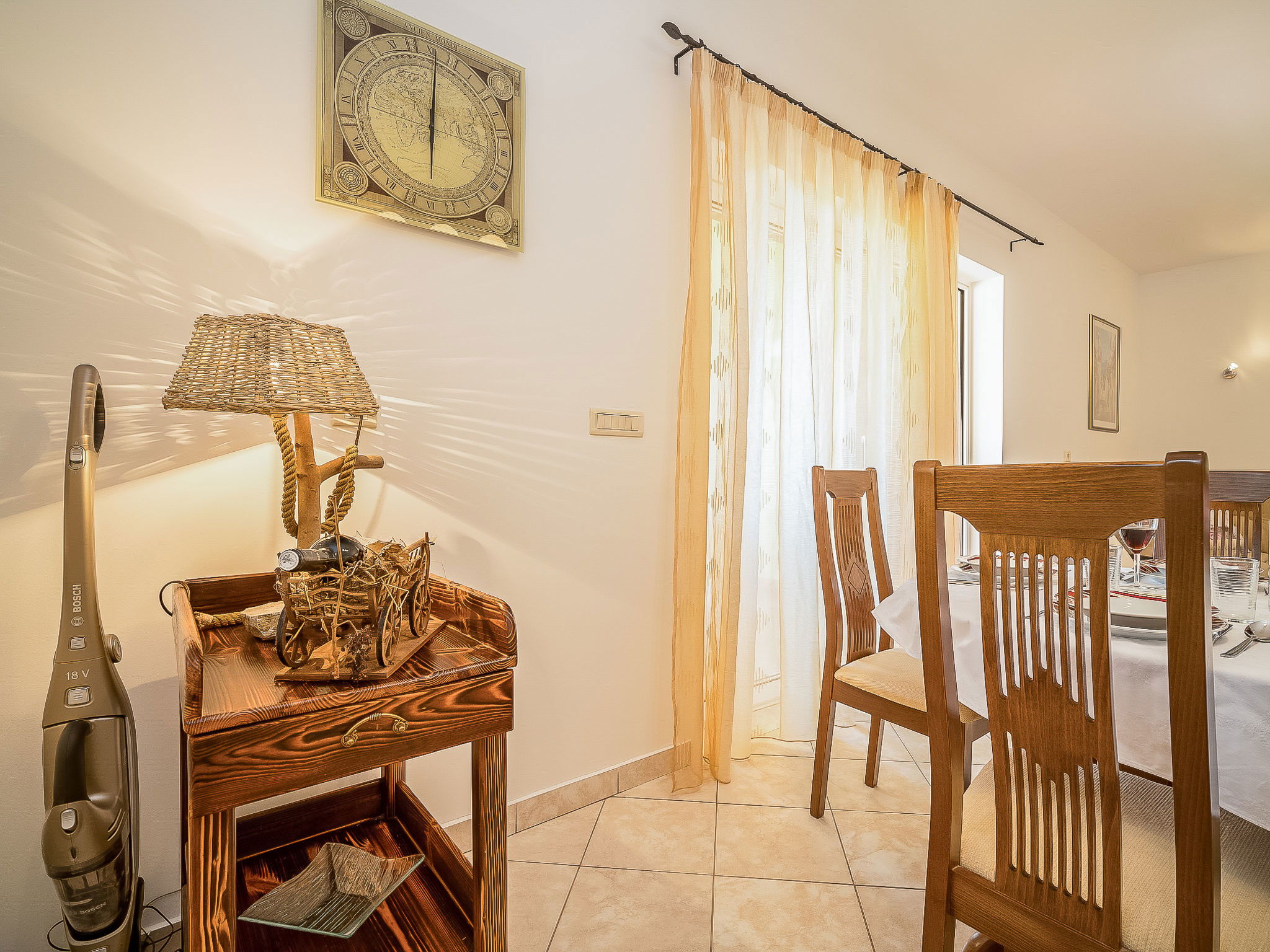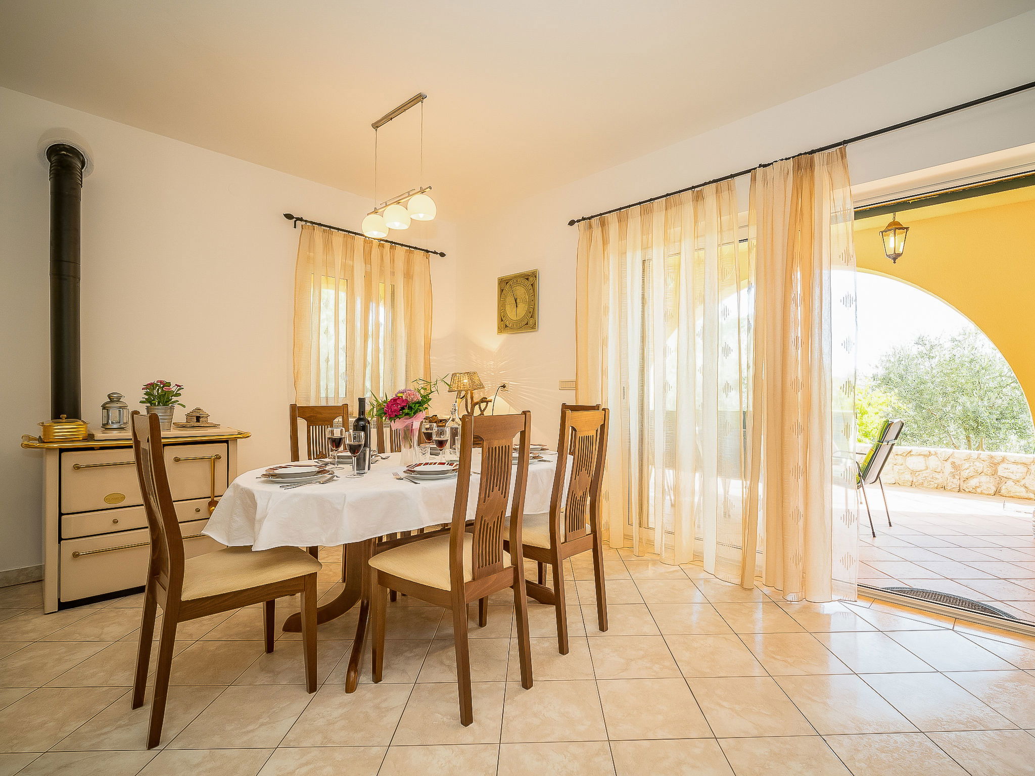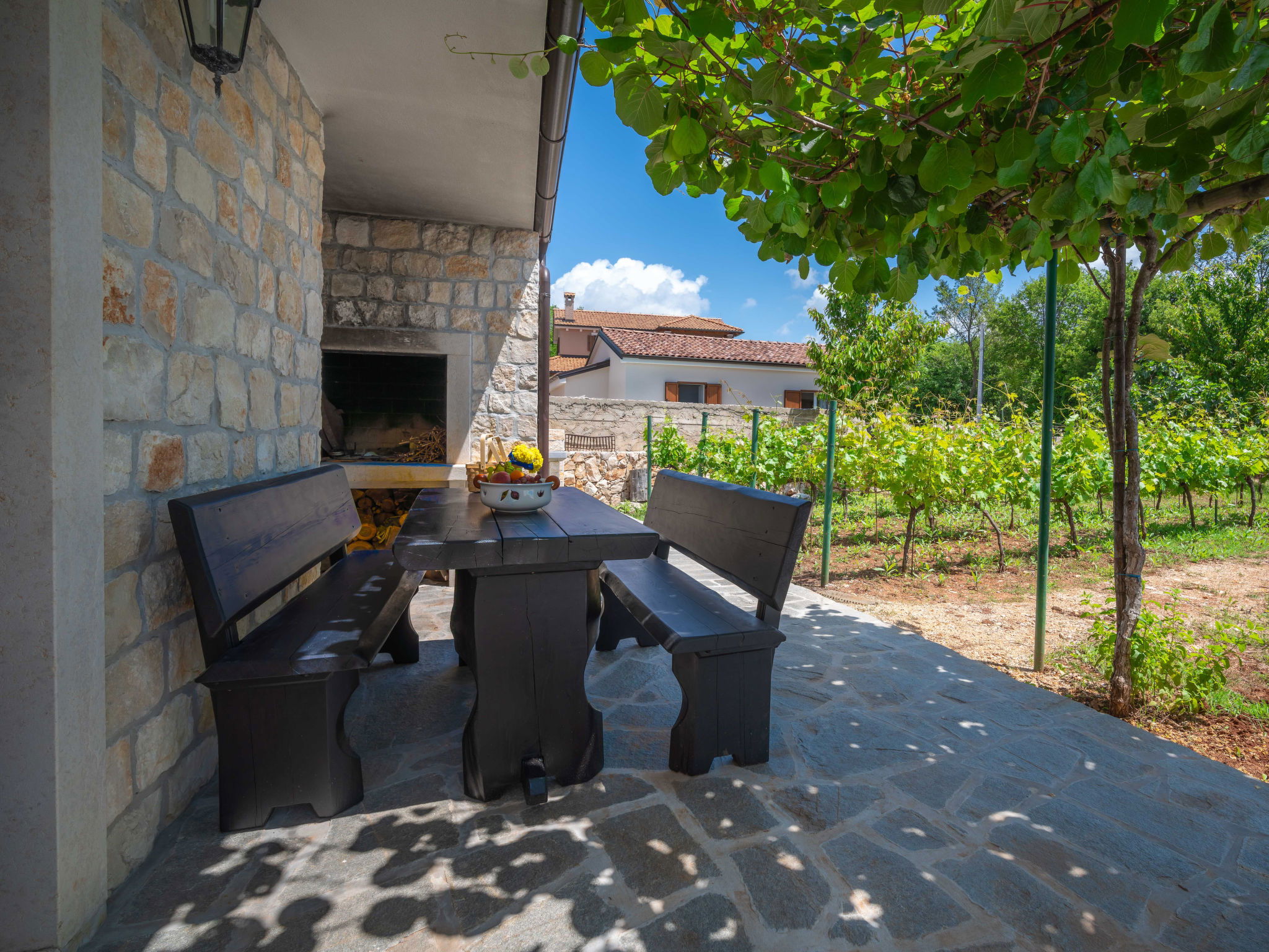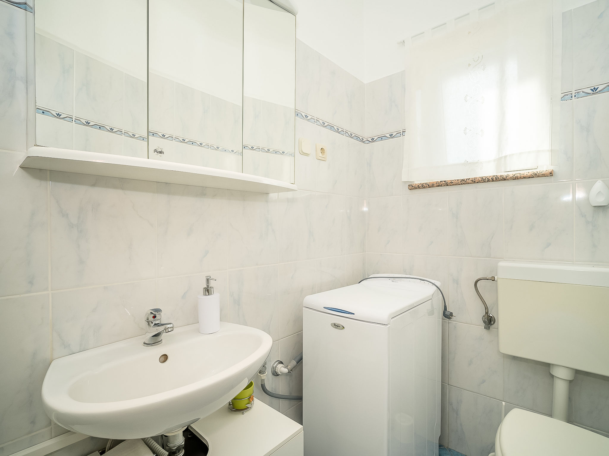 Kras: Single-family house "Mila", 2 storeys. 3.5 km from the centre of Dobrinj, 9 km from the centre of Malinska, 11 km from the centre of Krk, in a quiet, sunny position, 8.5 km from the sea, in the countryside. Private: property 1'400 m2, lawn 400 m2 trees, swimming pool angular (8 x 4 m, depth 140 cm, seasonal availability: 01.May. - 15.Oct.) with internal staircase. Outdoor shower, terrace (24 m2), garden furniture, barbecue. In the house: internet access, washing machine. Parking (for 4 cars) at the house on the premises. Grocery 700 m, supermarket 8.5 km, restaurant 3.5 km, bus stop 6.3 km, pebble beach 8.5 km, concrete beach 8.5 km. Groups of teenagers on request only. By groups of young people double deposit is requested on arrival.