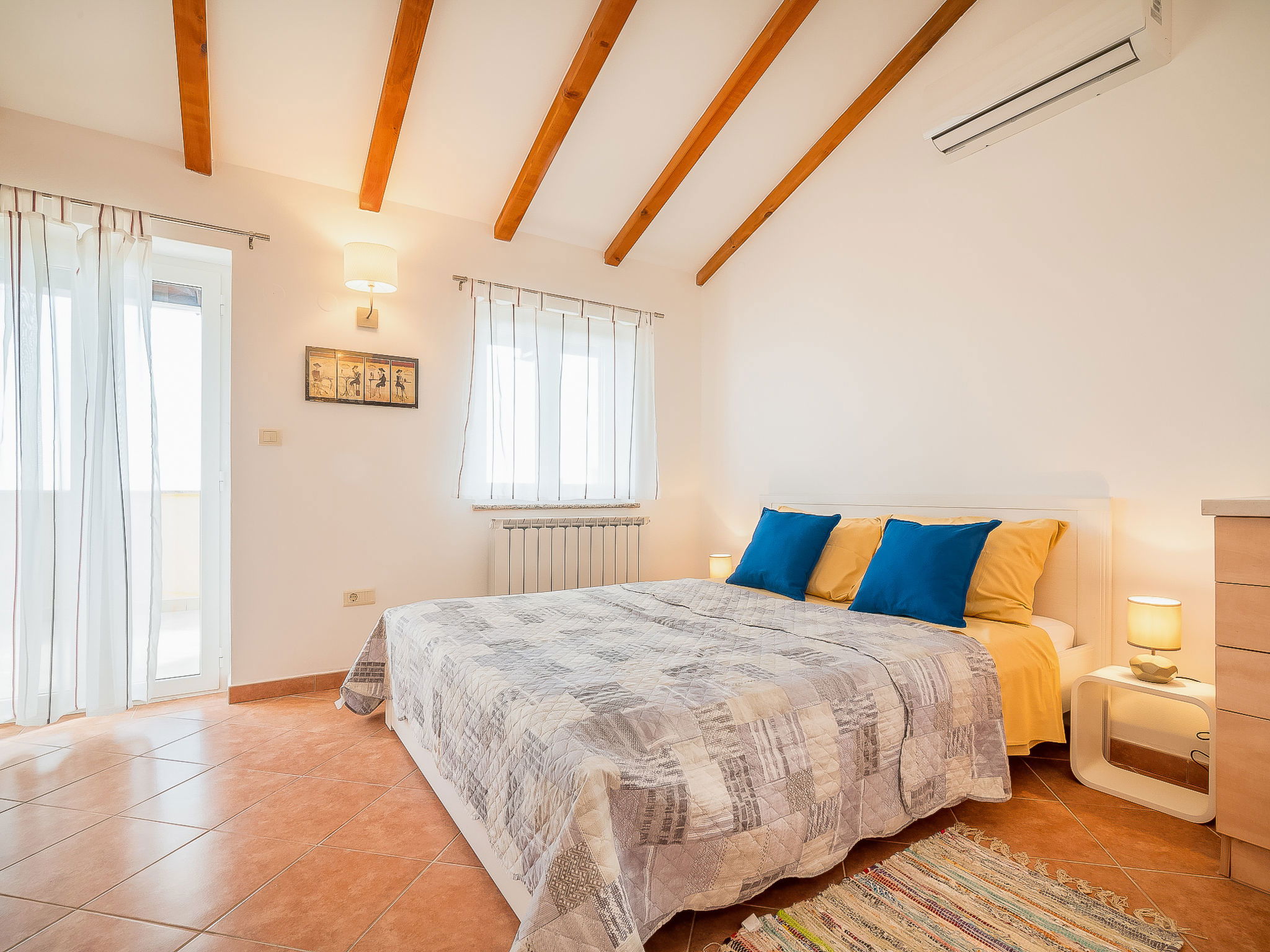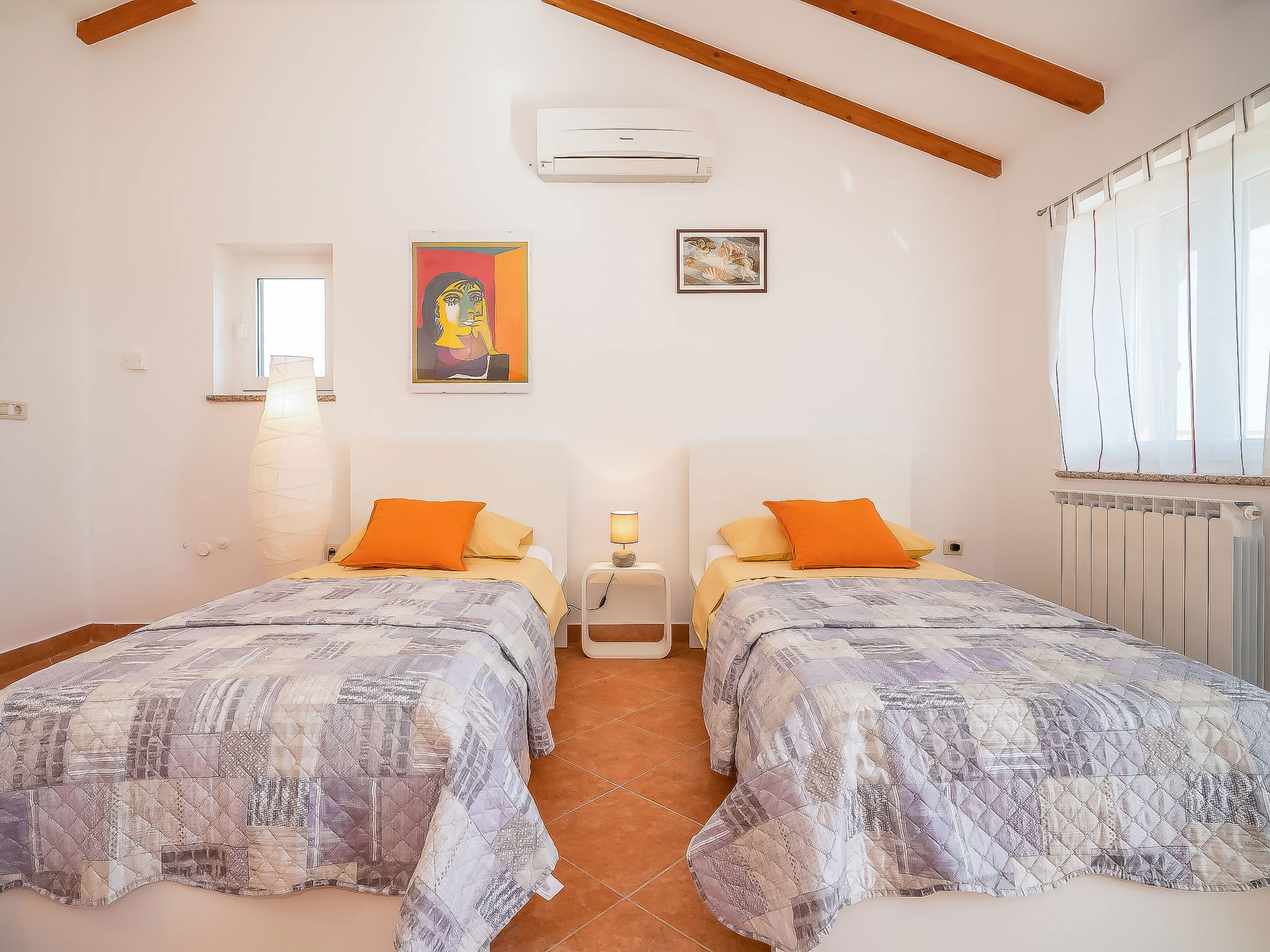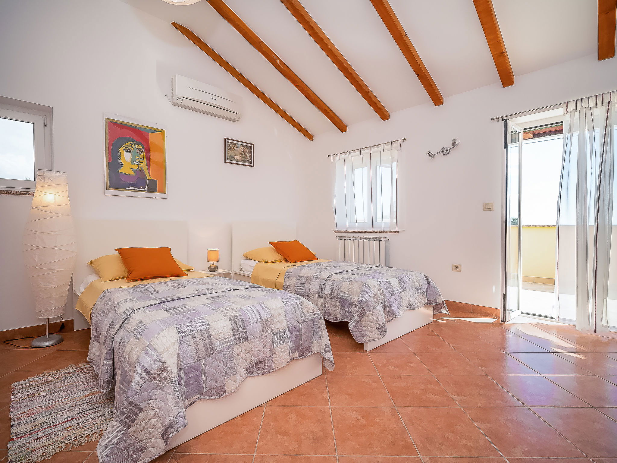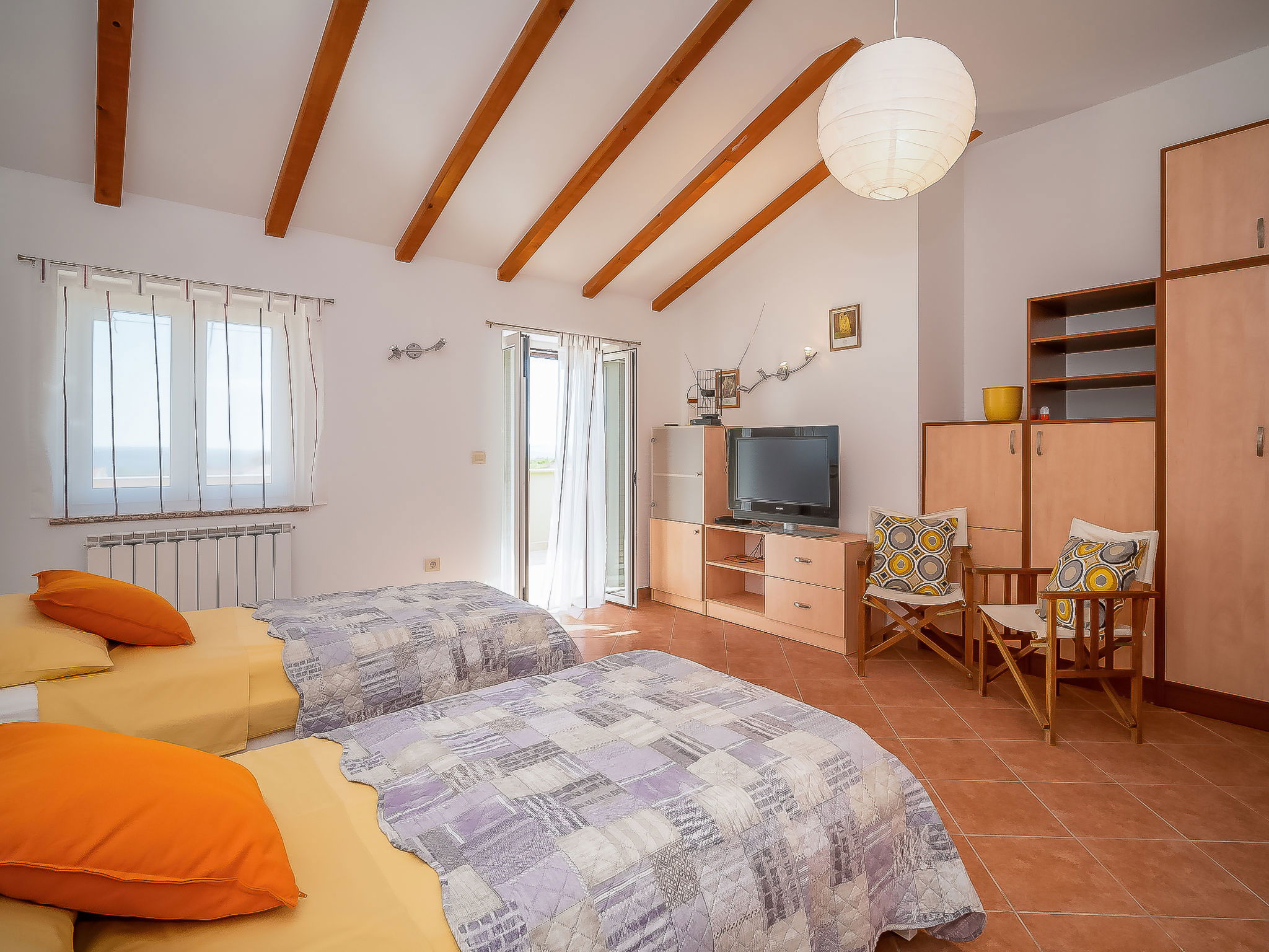 5-room house 130 m2 on 2 levels. Living/dining room 35 m2 with satellite TV (flat screen), air conditioning. Exit to the terrace. Entrance hall with air conditioning. 2 rooms, each room with 1 double bed (2 x 90 cm, length 200 cm). Open kitchen (oven, dishwasher, 4 ceramic glass hob hotplates, microwave, freezer, electric coffee machine). Shower/WC, sep. WC. Upper floor: 1 room 20 m2 with 1 french bed (160 cm, length 200 cm), kitchen corner, shower/WC and satellite TV (flat screen), air conditioning. Exit to the terrace. 1 room 20 m2 with 2 beds (90 cm, length 200 cm), shower/WC and satellite TV (flat screen), air conditioning. Exit to the terrace. Terrace 45 m2 partly roofed, terrace 23 m2. Terrace furniture, deck chairs. View of the countryside. Facilities: children's high chair, baby cot. Internet (WiFi, free).
