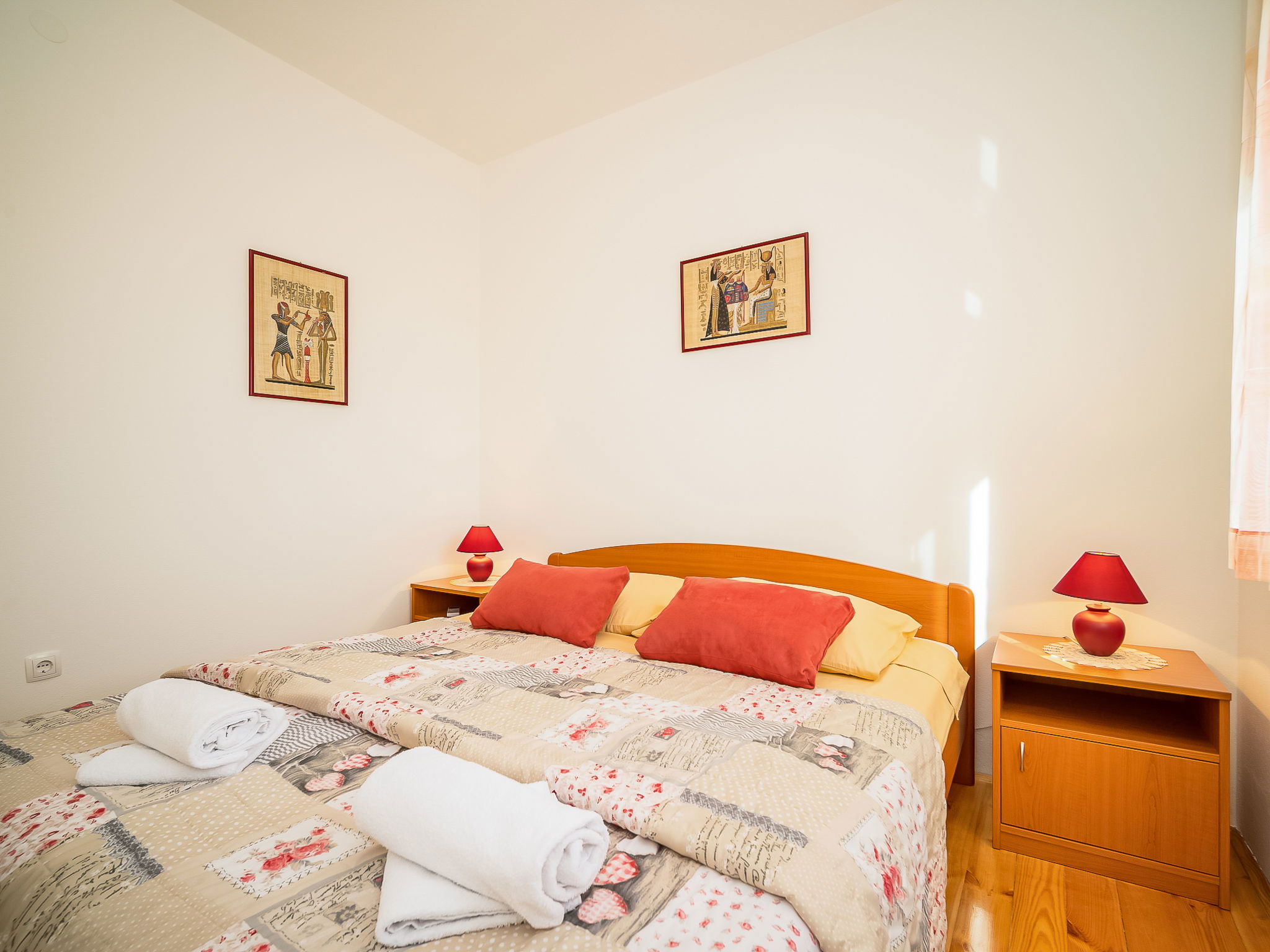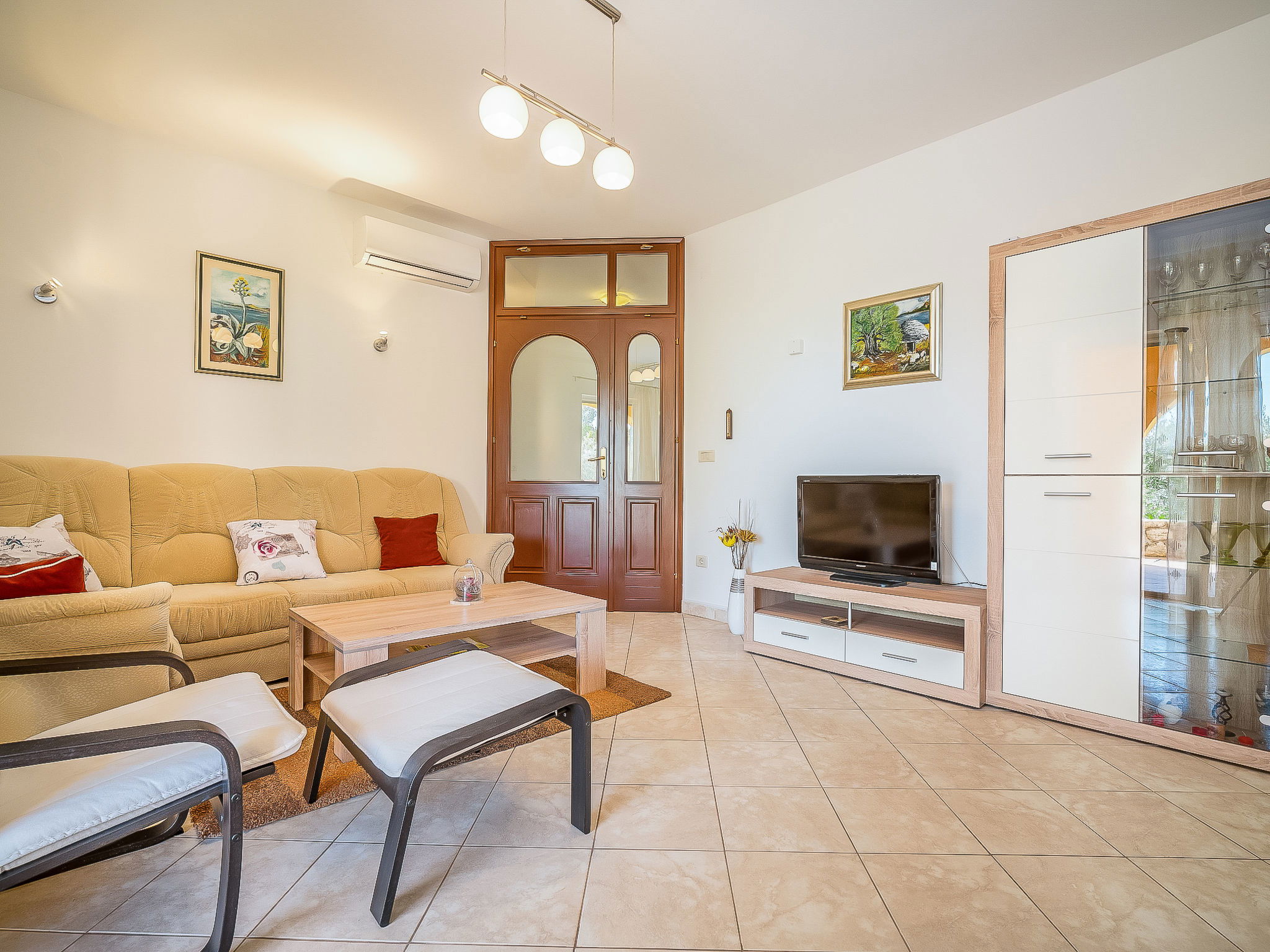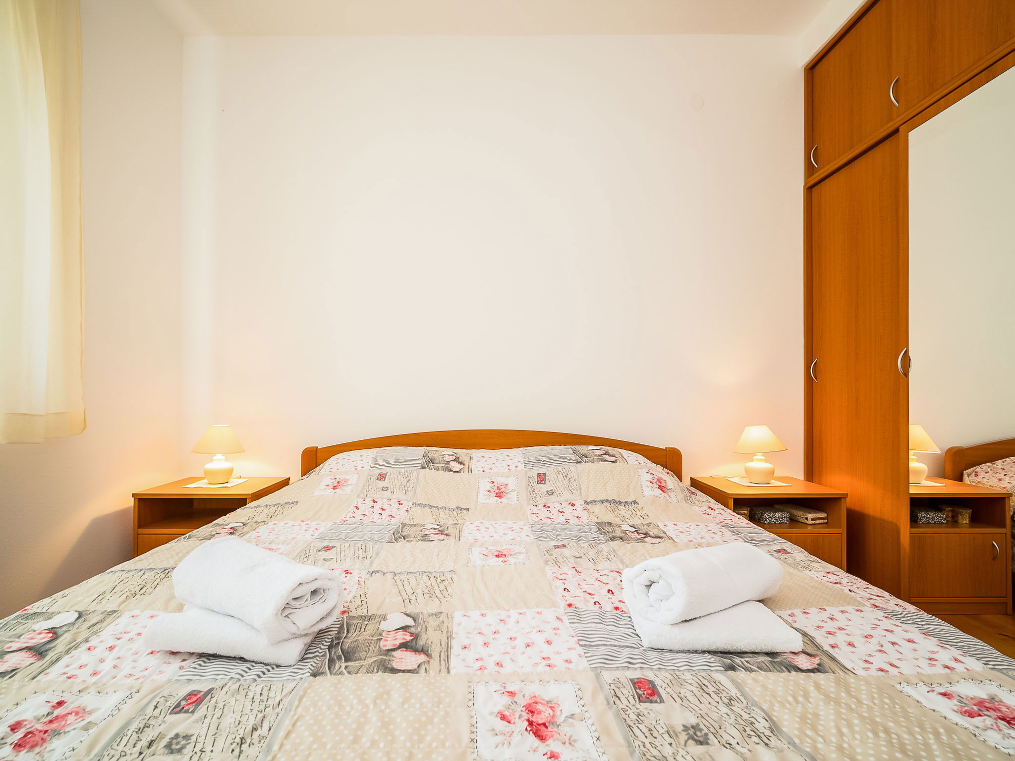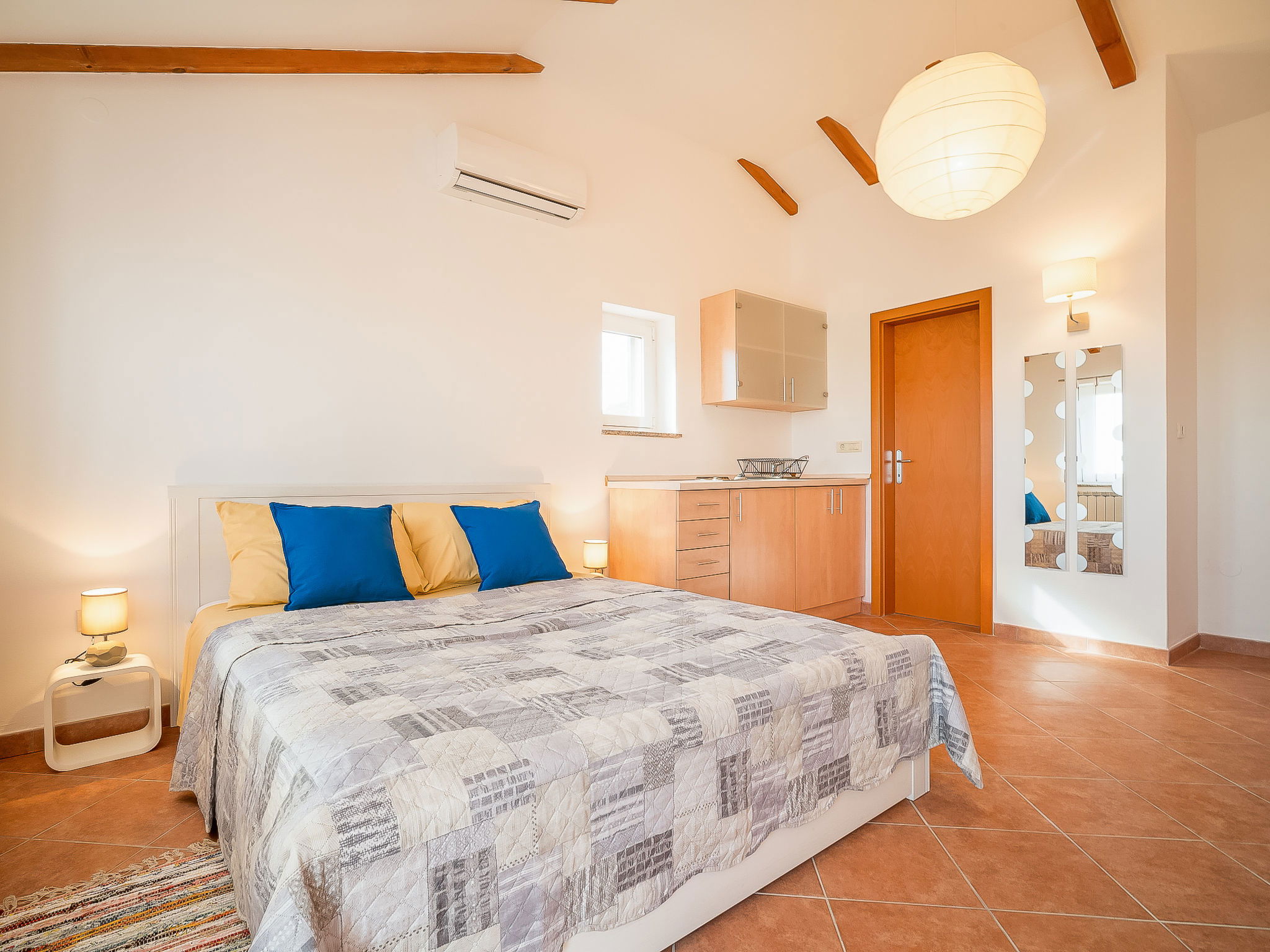 5-room house 130 m2 on 2 levels. Living/dining room 35 m2 with satellite TV (flat screen), air conditioning. Exit to the terrace. Entrance hall with air conditioning. 2 rooms, each room with 1 double bed (2 x 90 cm, length 200 cm). Open kitchen (oven, dishwasher, 4 ceramic glass hob hotplates, microwave, freezer, electric coffee machine). Shower/WC, sep. WC. Upper floor: 1 room 20 m2 with 1 french bed (160 cm, length 200 cm), kitchen corner, shower/WC and satellite TV (flat screen), air conditioning. Exit to the terrace. 1 room 20 m2 with 2 beds (90 cm, length 200 cm), shower/WC and satellite TV (flat screen), air conditioning. Exit to the terrace. Terrace 45 m2 partly roofed, terrace 23 m2. Terrace furniture, deck chairs. View of the countryside. Facilities: children's high chair, baby cot. Internet (WiFi, free).