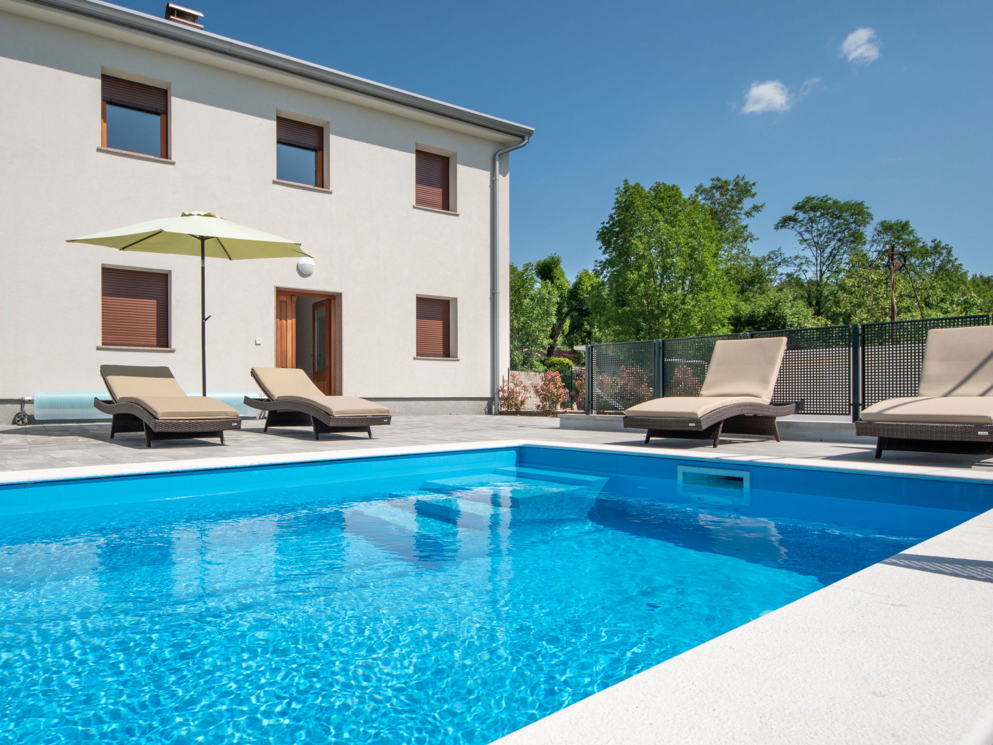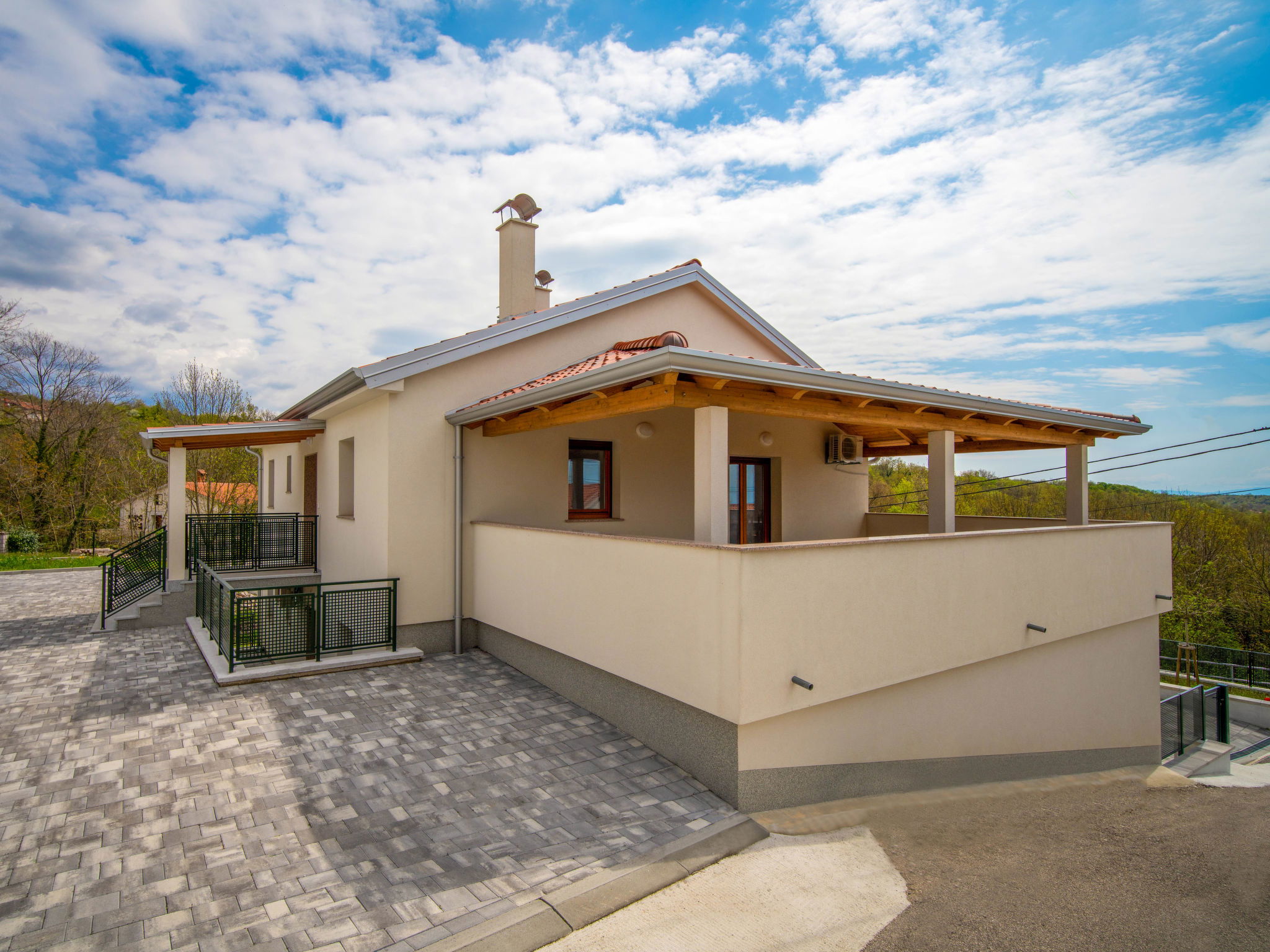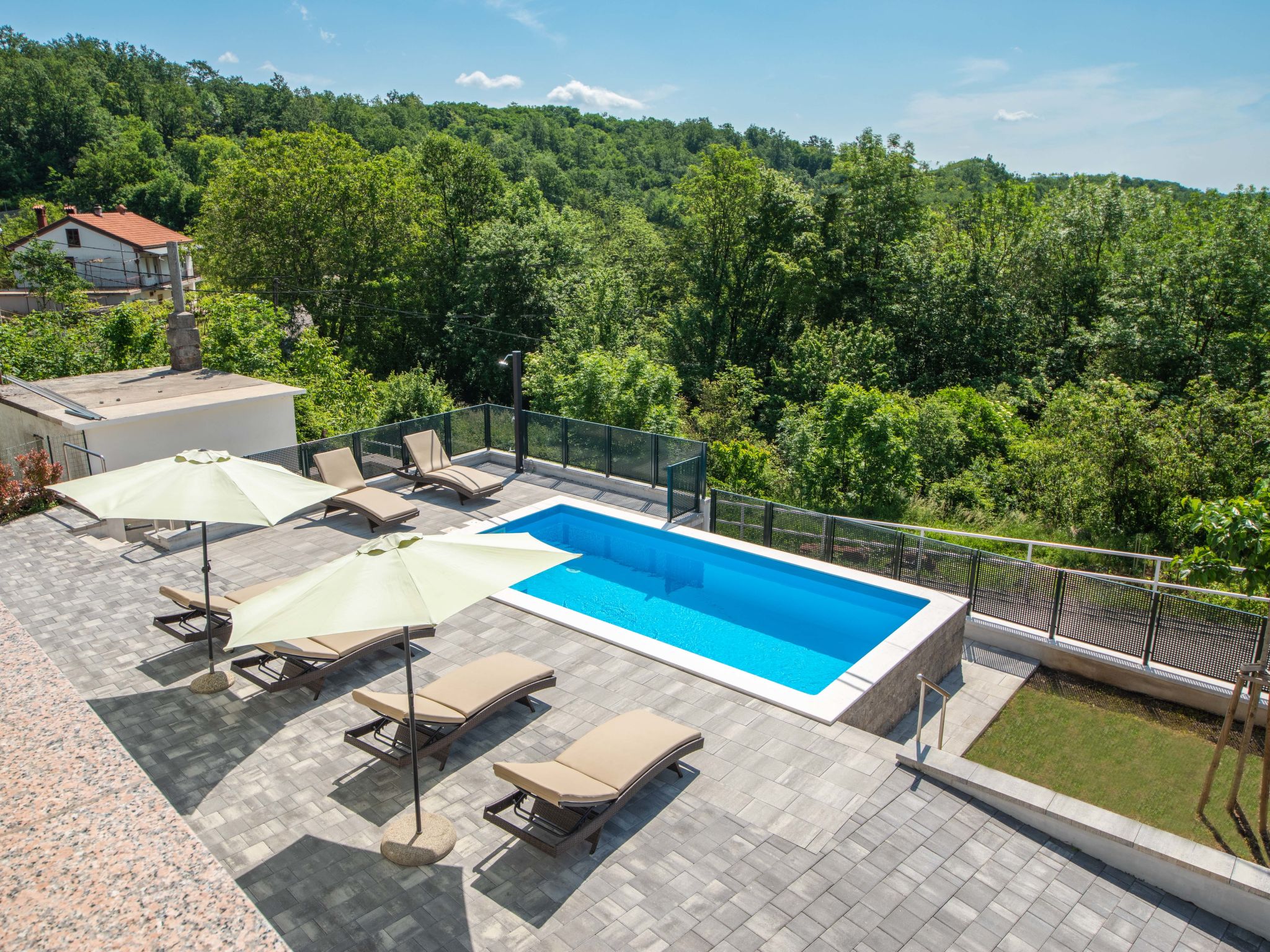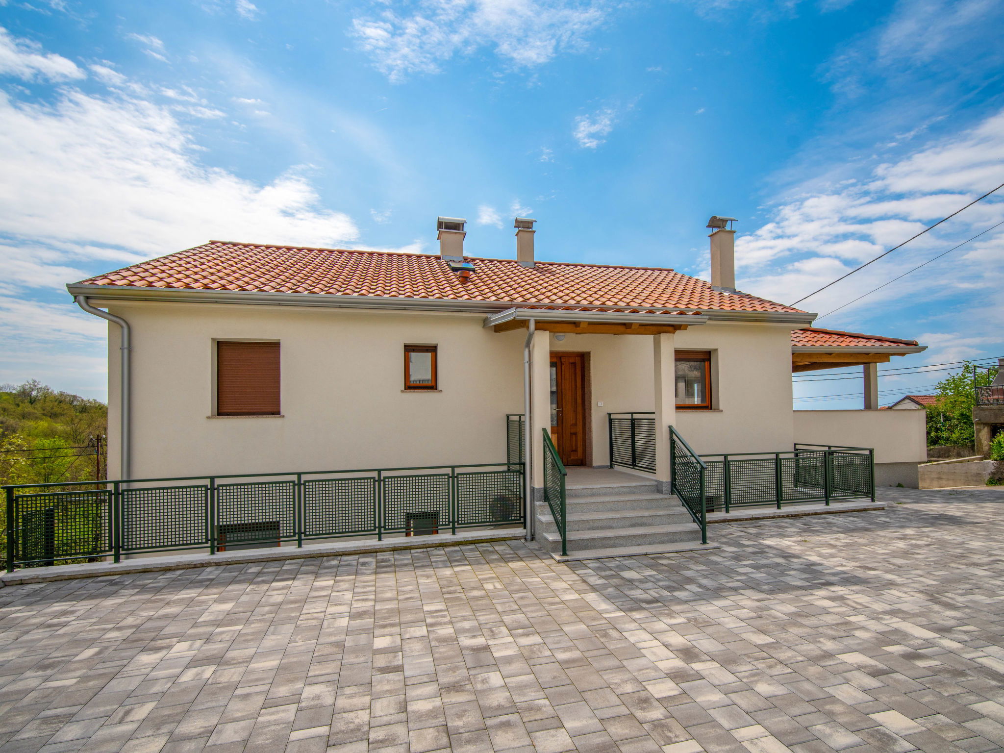 Kastav 7 km from Opatija: Cosy single-family house "Nola", 2 storeys, built in 2023. In the hamlet Marčelji 6 km from the centre of Kastav, 10 km from the centre of Rijeka, 13 km from the centre of Opatija, in a sunny, elevated position, 11 km from the sea, 11 km from the beach, in the countryside. Private: property 860 m2 (fenced), swimming pool angular, heated (6 x 3 m, depth 140 cm, seasonal availability: 01.May. - 15.Oct.) with internal staircase. Outdoor shower, terrace (60 m2), barbecue, pool maintenance by the owner/gardener. In the house: internet access, washing machine, tumble dryer. Parking (for 4 cars) at the house on the premises. Shop 900 m, supermarket 2.2 km, restaurant 1.9 km, bus stop 500 m, pebble beach 11 km, public bathing area 11 km, concrete beach 11 km.