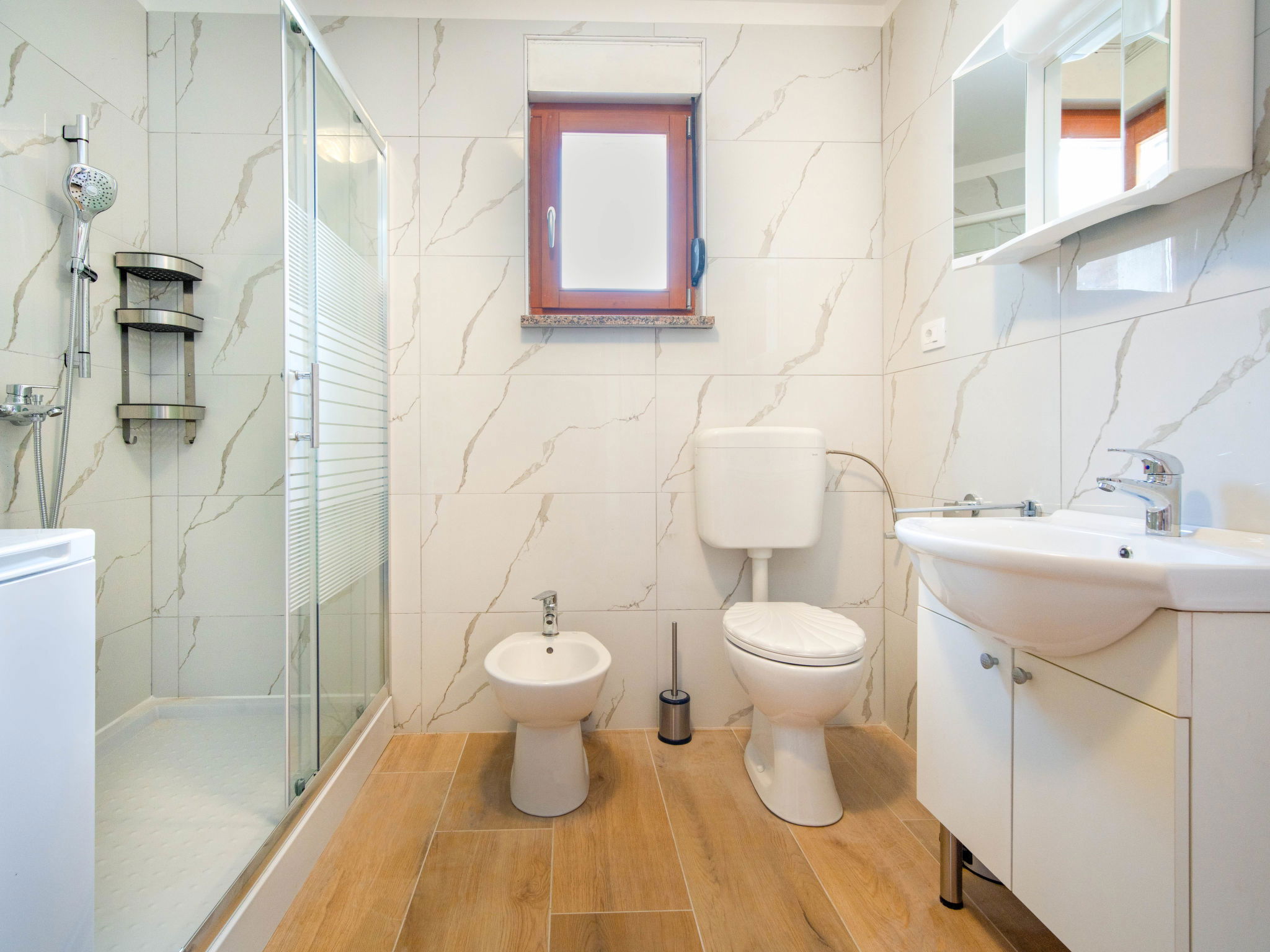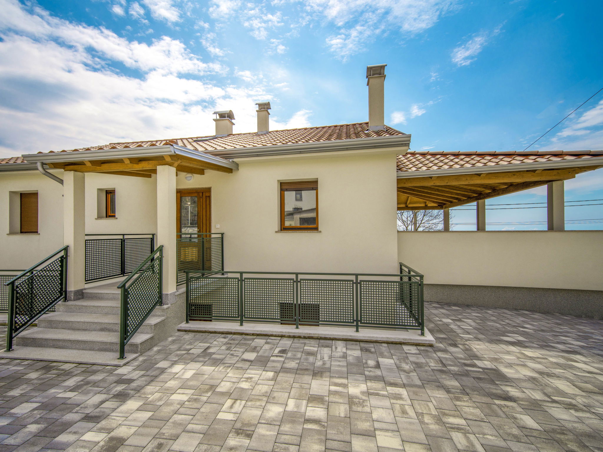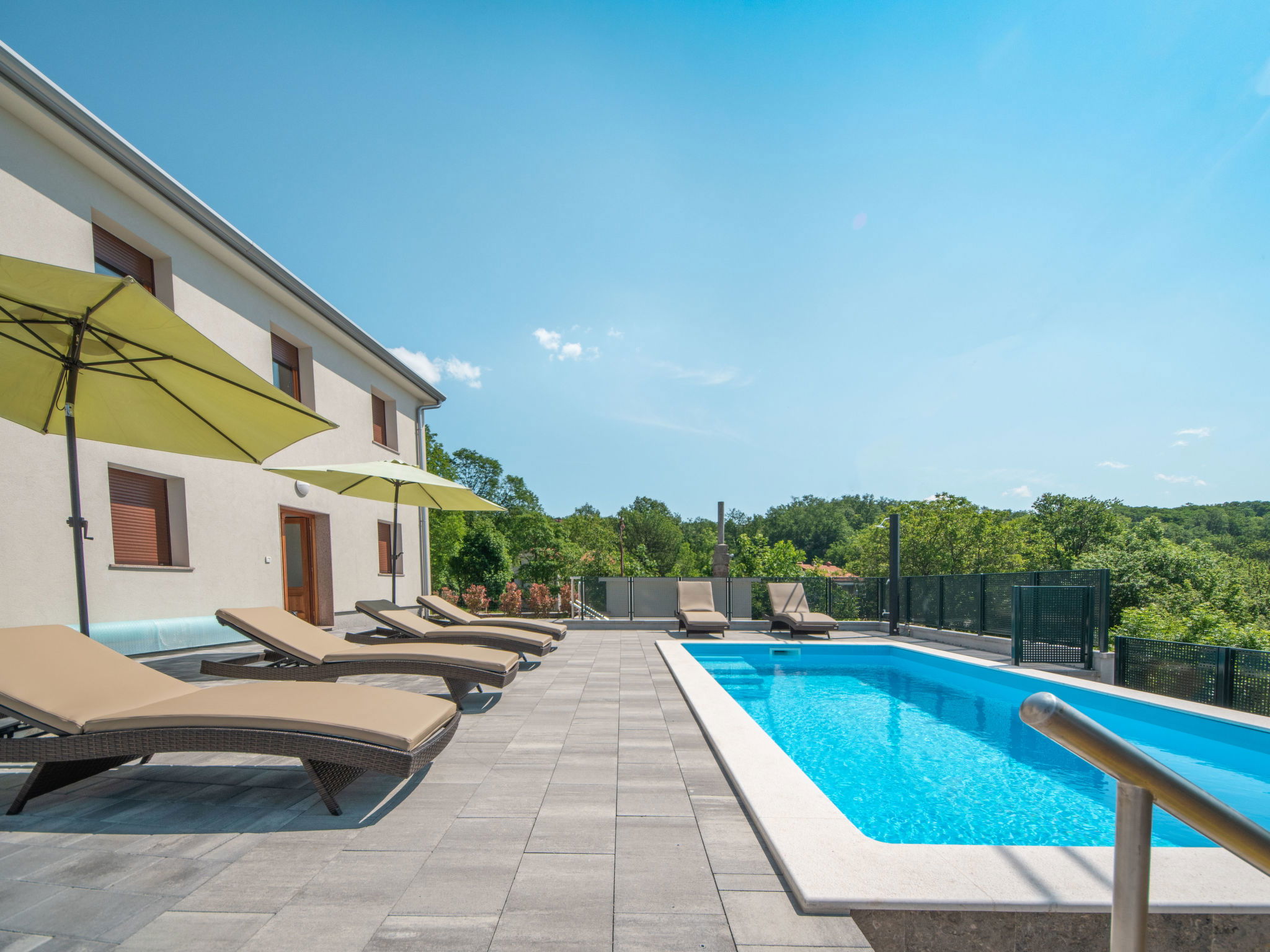 Kastav 7 km from Opatija: Cosy single-family house "Nola", 2 storeys, built in 2023. In the hamlet Marčelji 6 km from the centre of Kastav, 10 km from the centre of Rijeka, 13 km from the centre of Opatija, in a sunny, elevated position, 11 km from the sea, 11 km from the beach, in the countryside. Private: property 860 m2 (fenced), swimming pool angular, heated (6 x 3 m, depth 140 cm, seasonal availability: 01.May. - 15.Oct.) with internal staircase. Outdoor shower, terrace (60 m2), barbecue, pool maintenance by the owner/gardener. In the house: internet access, washing machine, tumble dryer. Parking (for 4 cars) at the house on the premises. Shop 900 m, supermarket 2.2 km, restaurant 1.9 km, bus stop 500 m, pebble beach 11 km, public bathing area 11 km, concrete beach 11 km.
