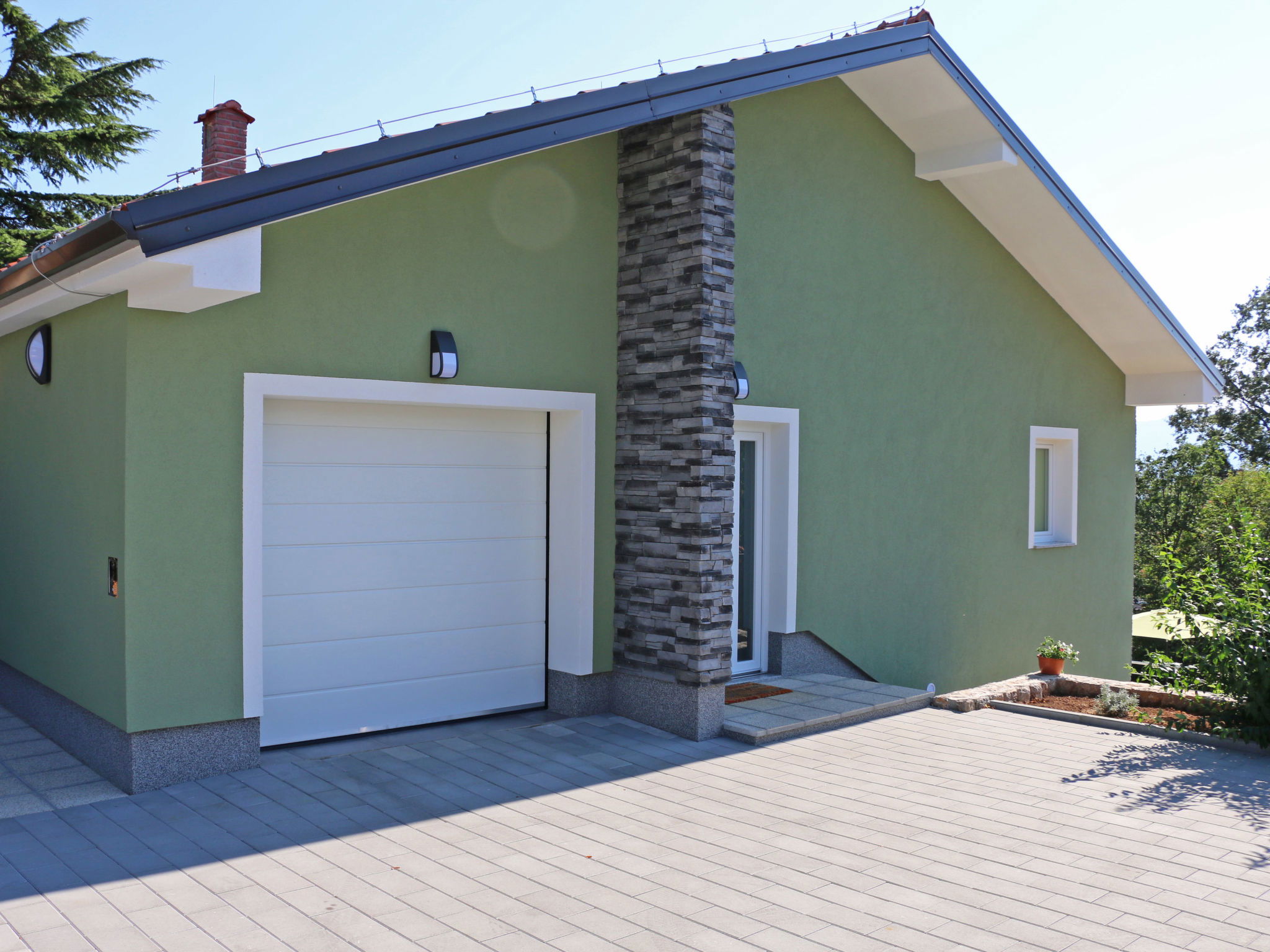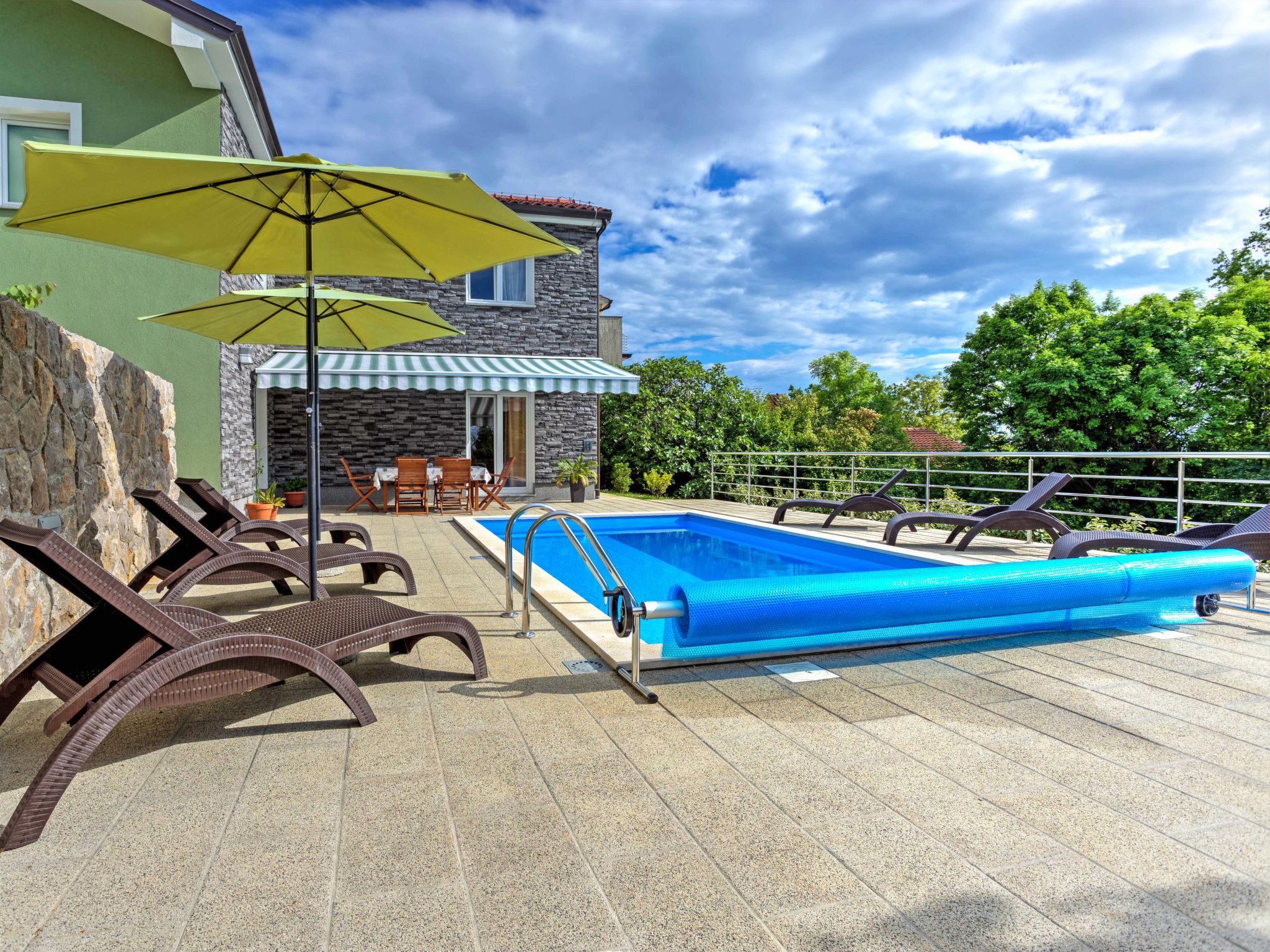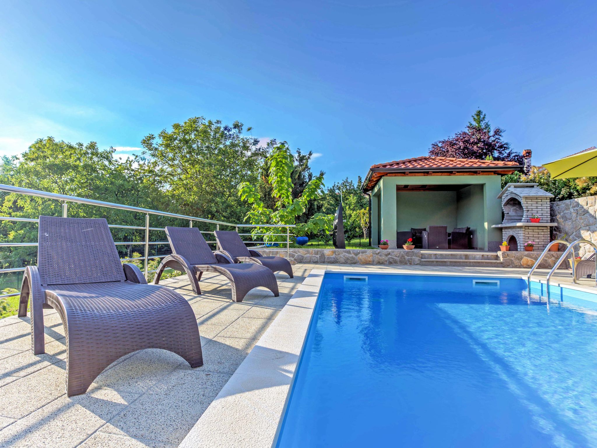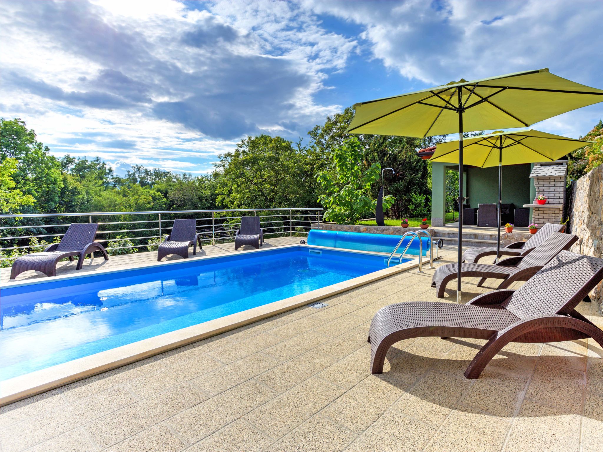 Kastav 7 km from Opatija: Single-family house "Dante", 2 storeys. In the hamlet Marčelji 6 km from the centre of Kastav, 10 km from the centre of Rijeka, 12 km from the centre of Opatija, in a quiet, sunny position, 11 km from the sea, in the countryside. Private: property 1'600 m2 (fenced), swimming pool angular, heated (7 x 3 m, 24 m2, depth 140 cm, seasonal availability: 18.Apr. - 10.Oct.) with salt-electrolysis pool-cleaning system. Outdoor shower, terrace (100 m2), garden furniture, barbecue. In the house: internet access, sauna, washing machine. Parking (for 4 cars) at the house on the premises, single garage. Shop 150 m, restaurant 1.7 km, bus stop 300 m, pebble beach 11 km.