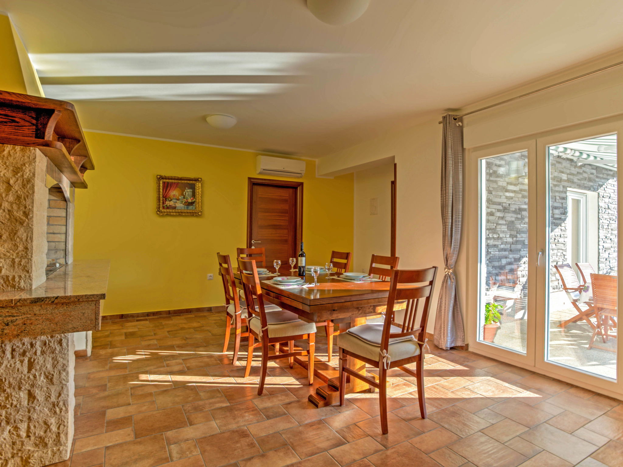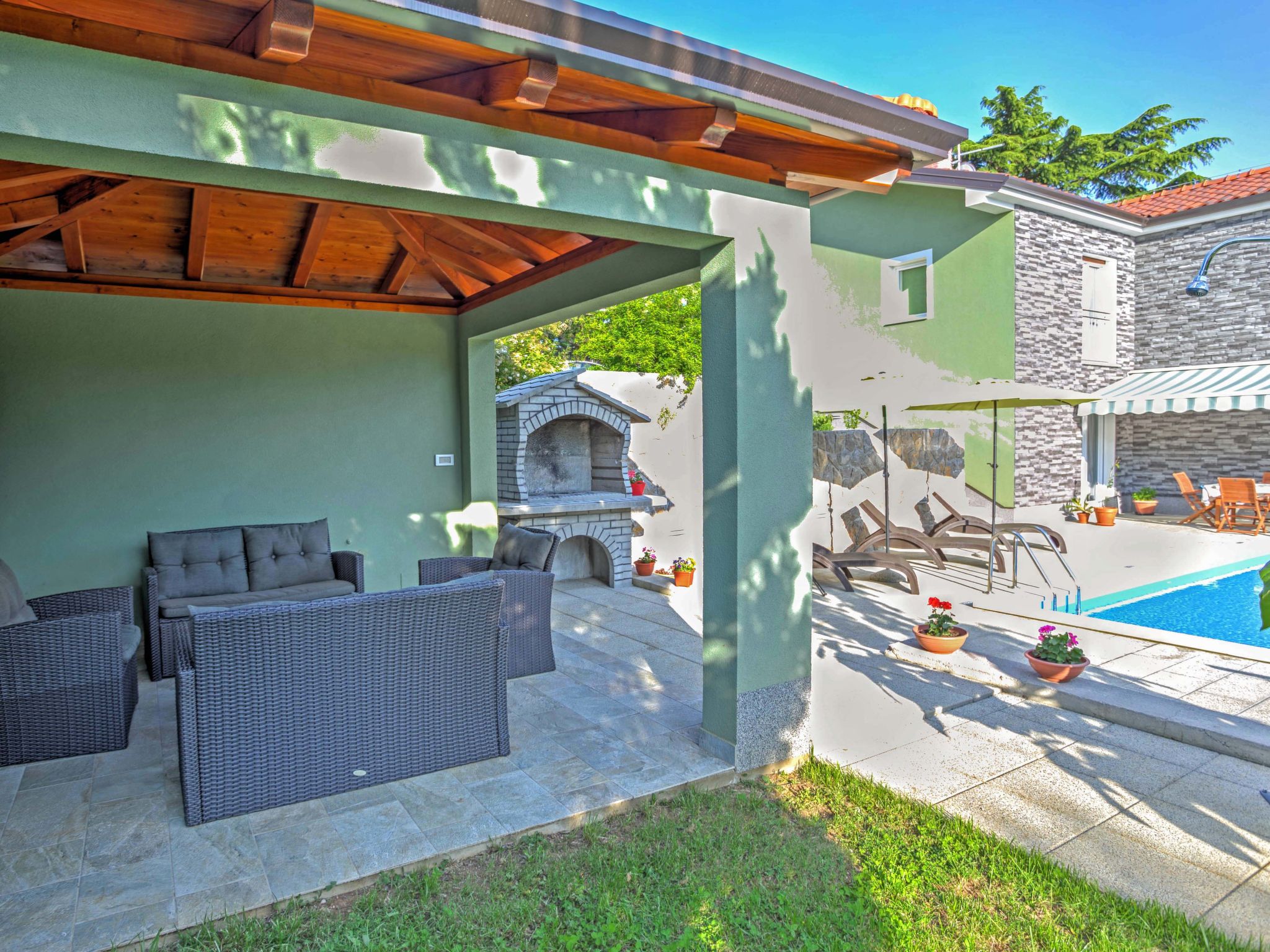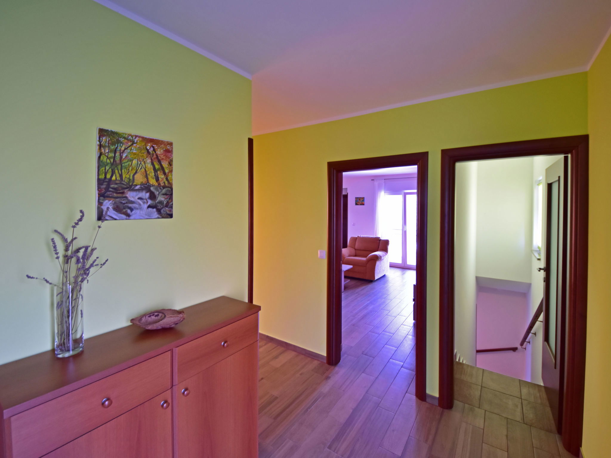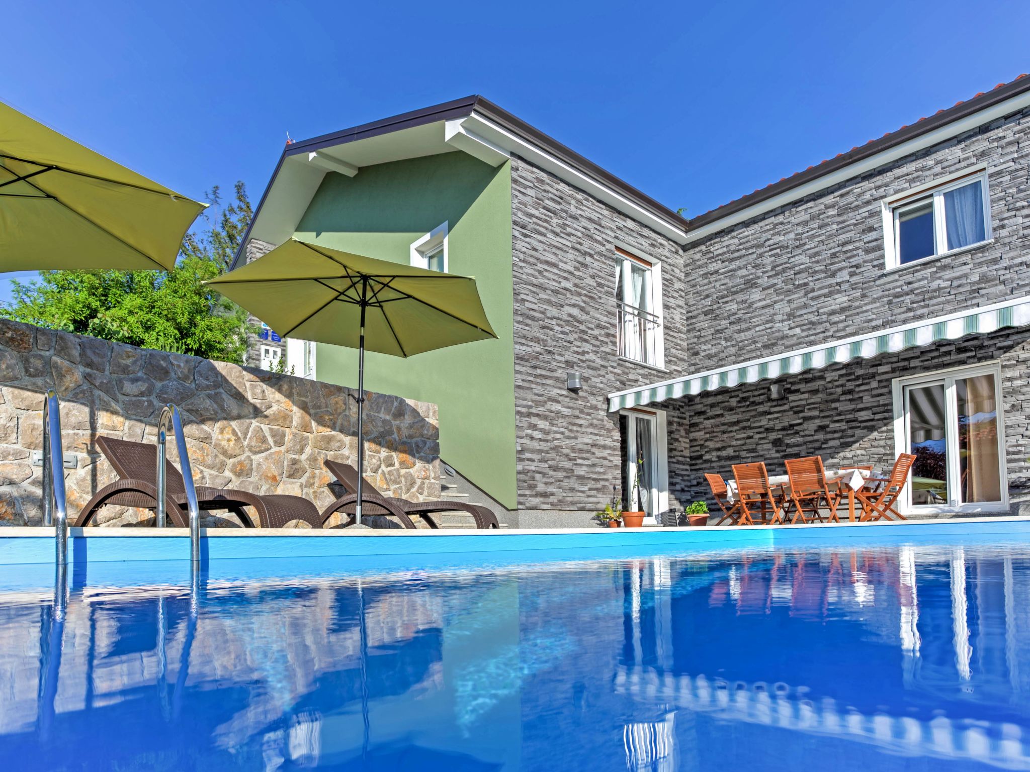 Kastav 7 km from Opatija: Single-family house "Dante", 2 storeys. In the hamlet Marčelji 6 km from the centre of Kastav, 10 km from the centre of Rijeka, 12 km from the centre of Opatija, in a quiet, sunny position, 11 km from the sea, in the countryside. Private: property 1'600 m2 (fenced), swimming pool angular, heated (7 x 3 m, 24 m2, depth 140 cm, seasonal availability: 18.Apr. - 10.Oct.) with salt-electrolysis pool-cleaning system. Outdoor shower, terrace (100 m2), garden furniture, barbecue. In the house: internet access, sauna, washing machine. Parking (for 4 cars) at the house on the premises, single garage. Shop 150 m, restaurant 1.7 km, bus stop 300 m, pebble beach 11 km.