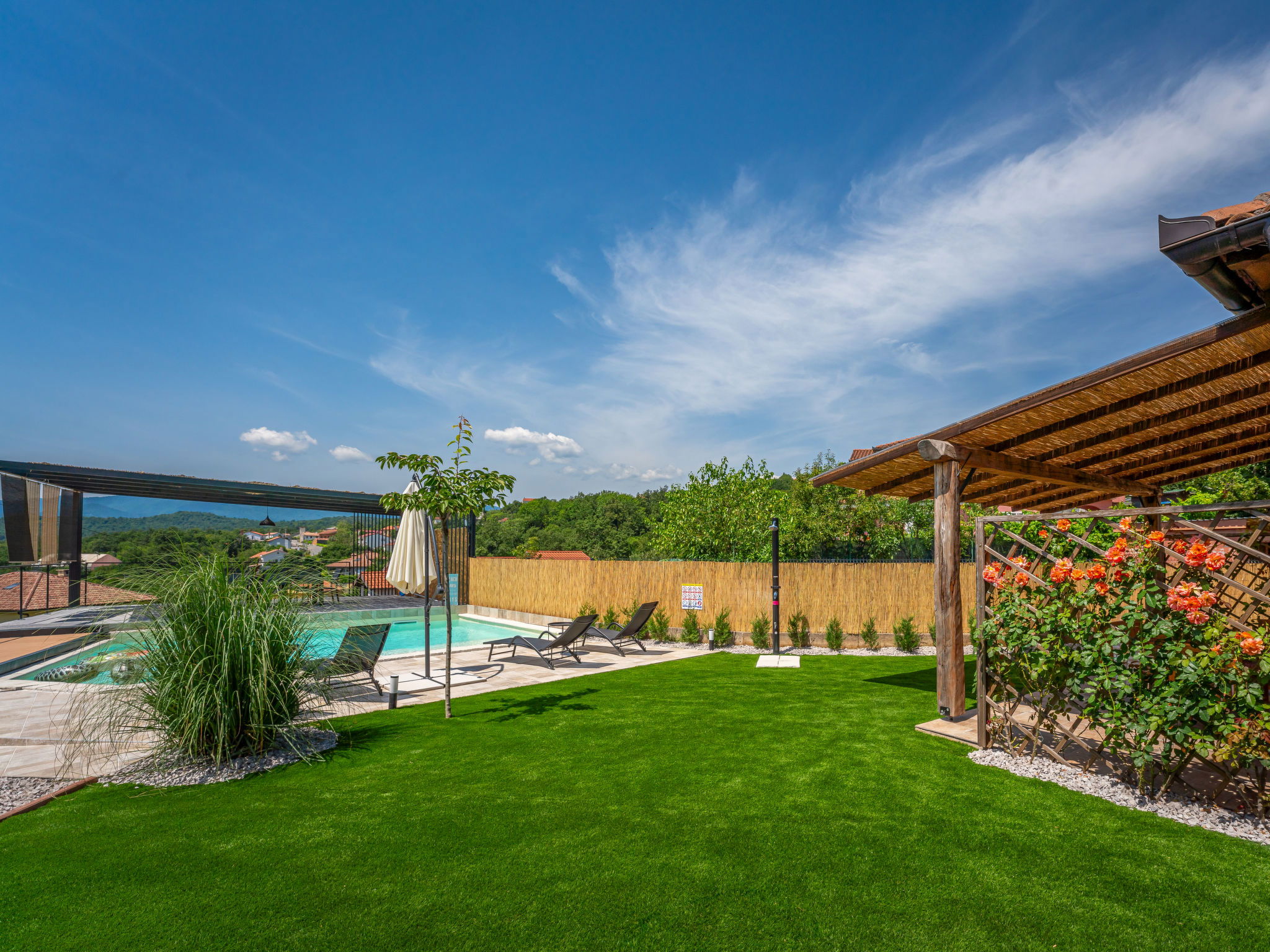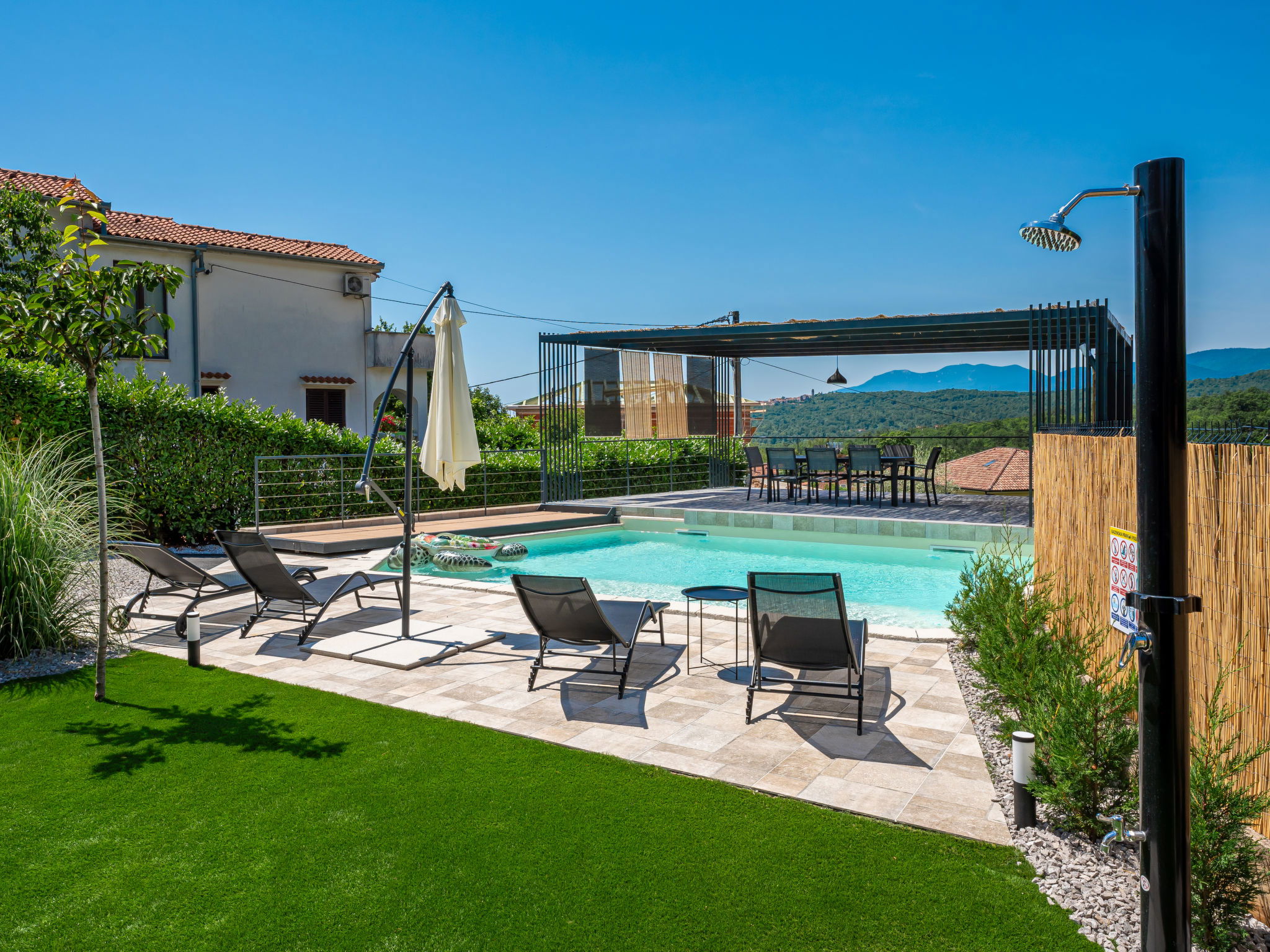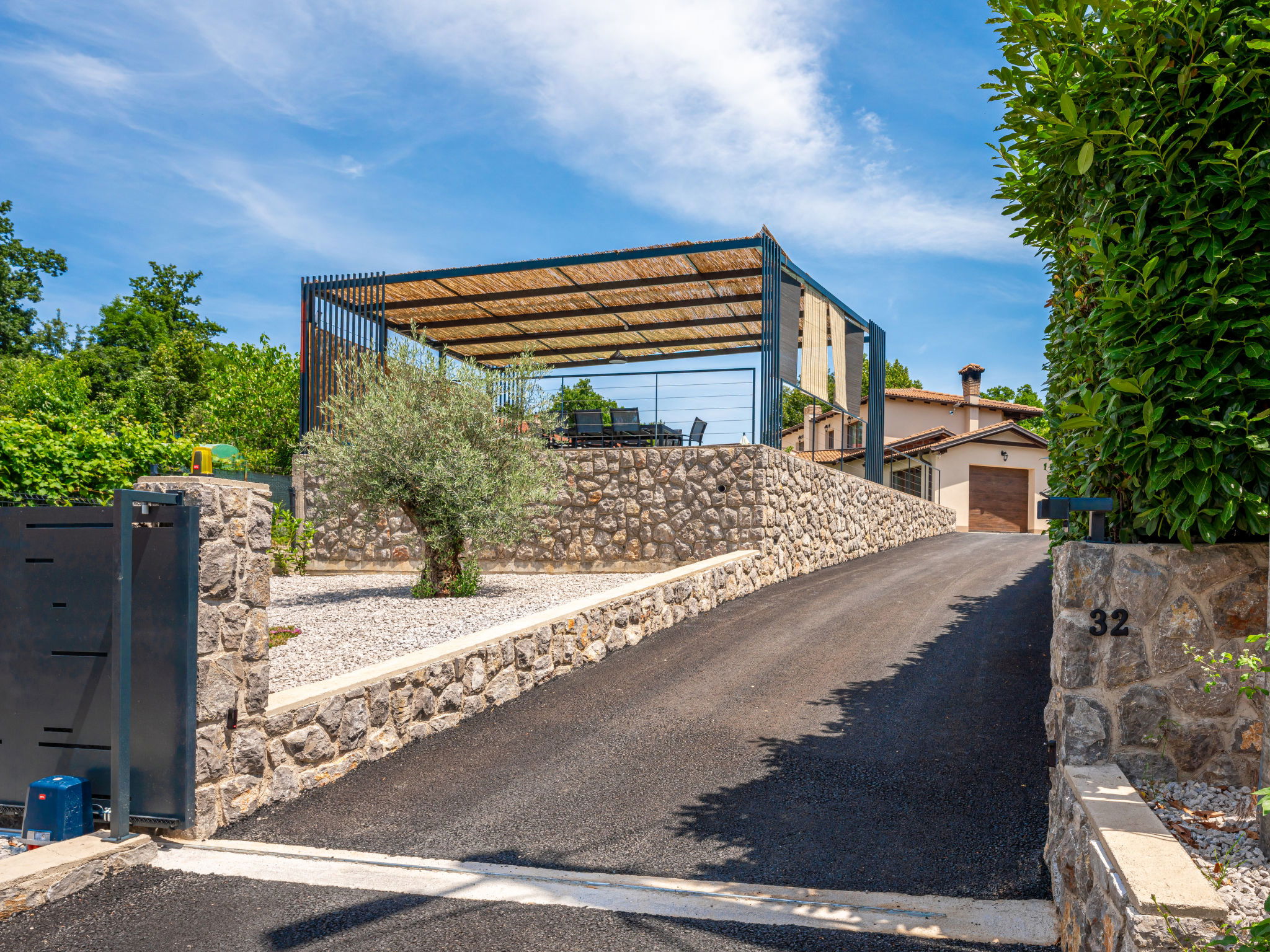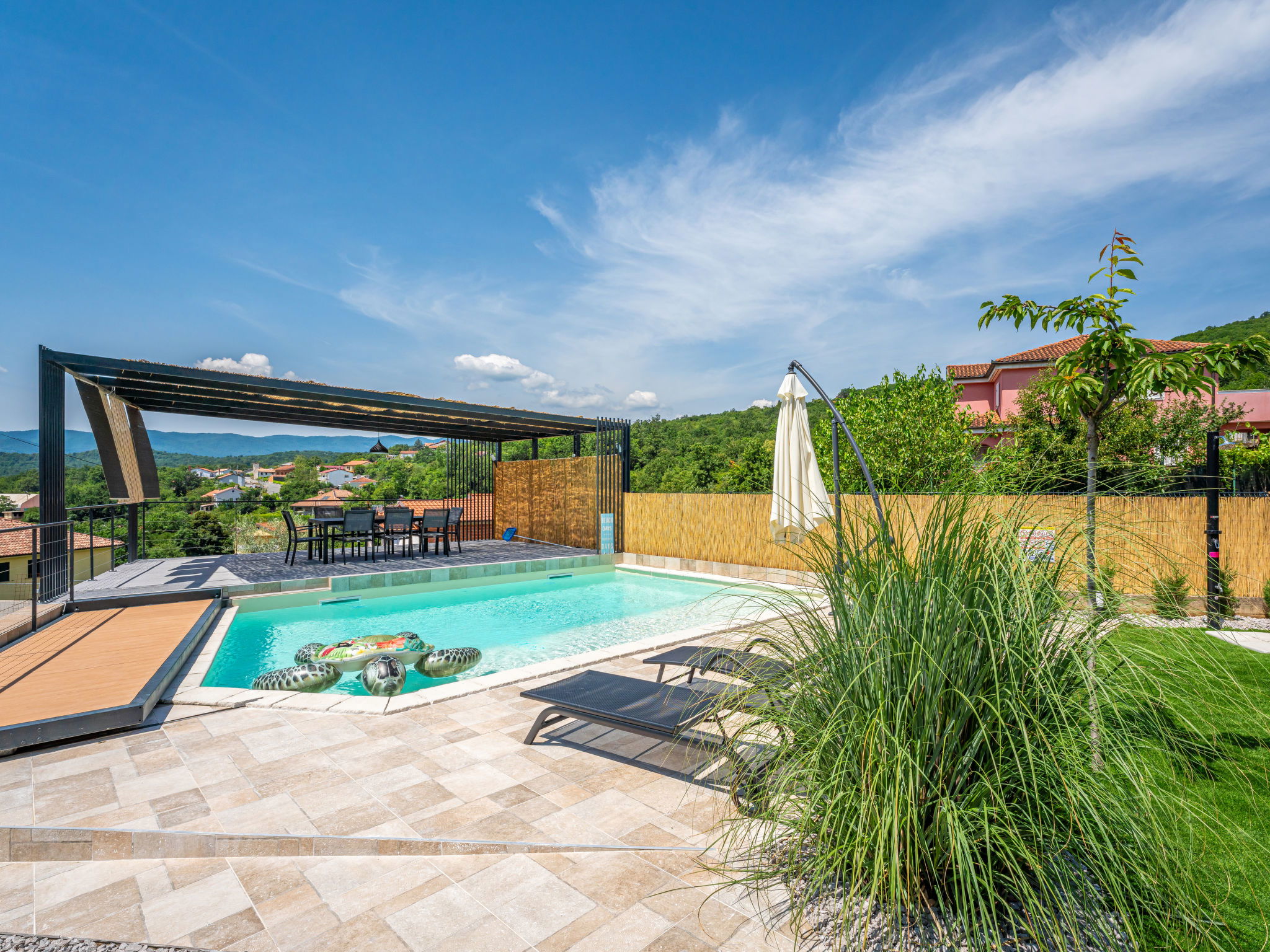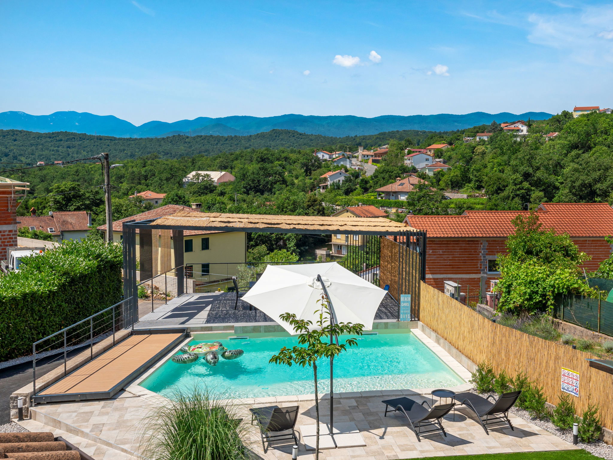 Kastav 6 km from Opatija: Comfortable single-family house "Campanero", 2 storeys, built in 2023. In the hamlet Kudeji 2.4 km from the centre of Viškovo, 3.7 km from the centre of Kastav, 9 km from the centre of Opatija, in a sunny, elevated position, 8 km from the sea, 8 km from the beach, in a cul-de-sac. Private: property 900 m2 (fenced), garden with lawn 300 m2, swimming pool angular (6 x 6 m, depth 140 cm, seasonal availability: 01.Jun. - 30.Sep.). WC in the pool area, outdoor shower, terrace, garden furniture. In the house: internet access. Parking at the house on the premises. Supermarket 2.4 km, shopping centre 2.4 km, restaurant 1.8 km, bakery 2.4 km, café 2.4 km, bus stop 160 m, pebble beach 8 km (small), outdoor swimming pool 10 km, indoor swimming pool 10 km, public bathing area 10 km, concrete beach 8 km. Nearby attractions: Kuća halubajskega zvončara UNESCO 2 km. Groups of teenagers on request only. Part of the house is closed and unoccupied. The owner runs dry dock marine services. By groups of young people double deposit is requested on arrival.