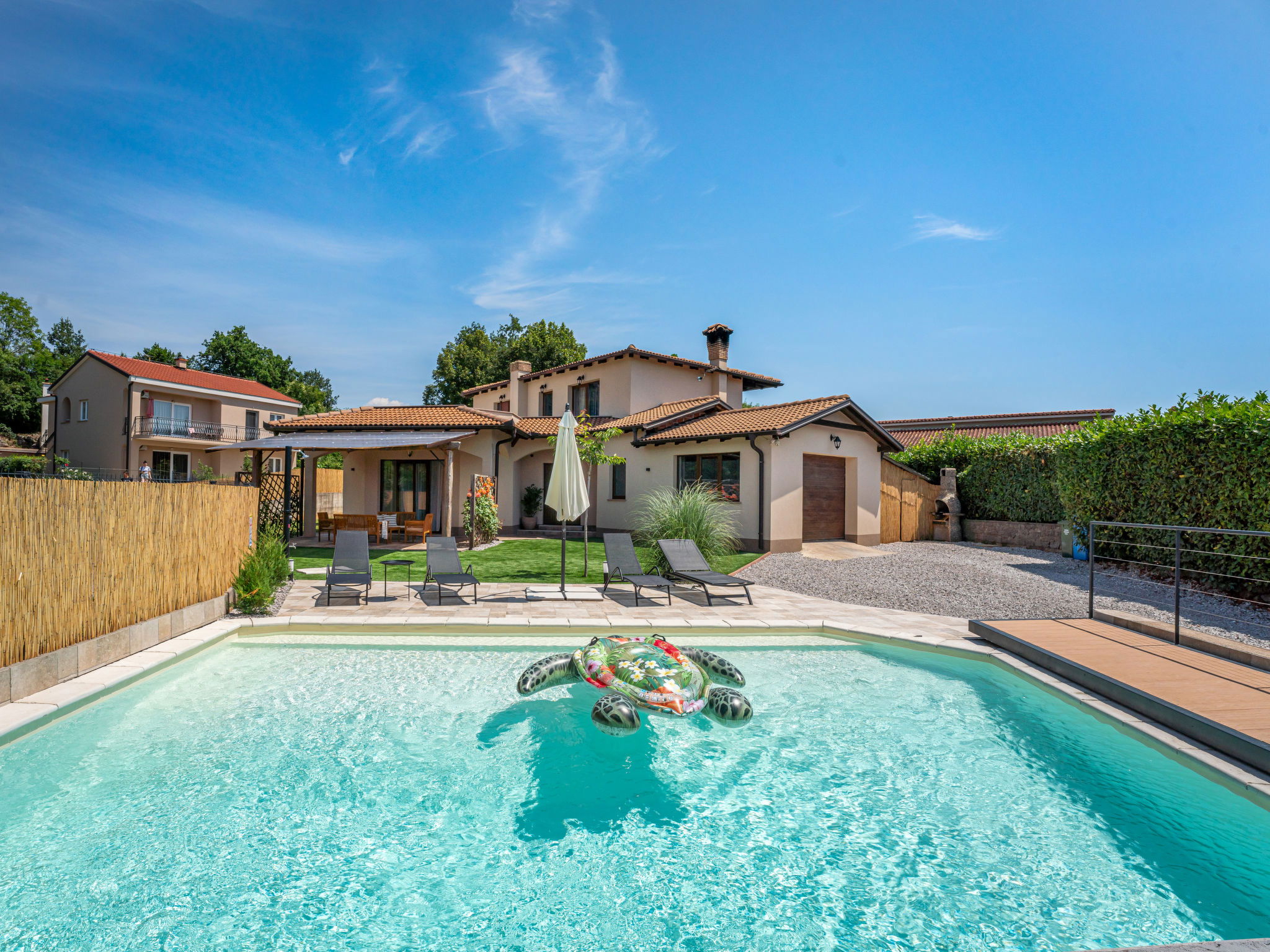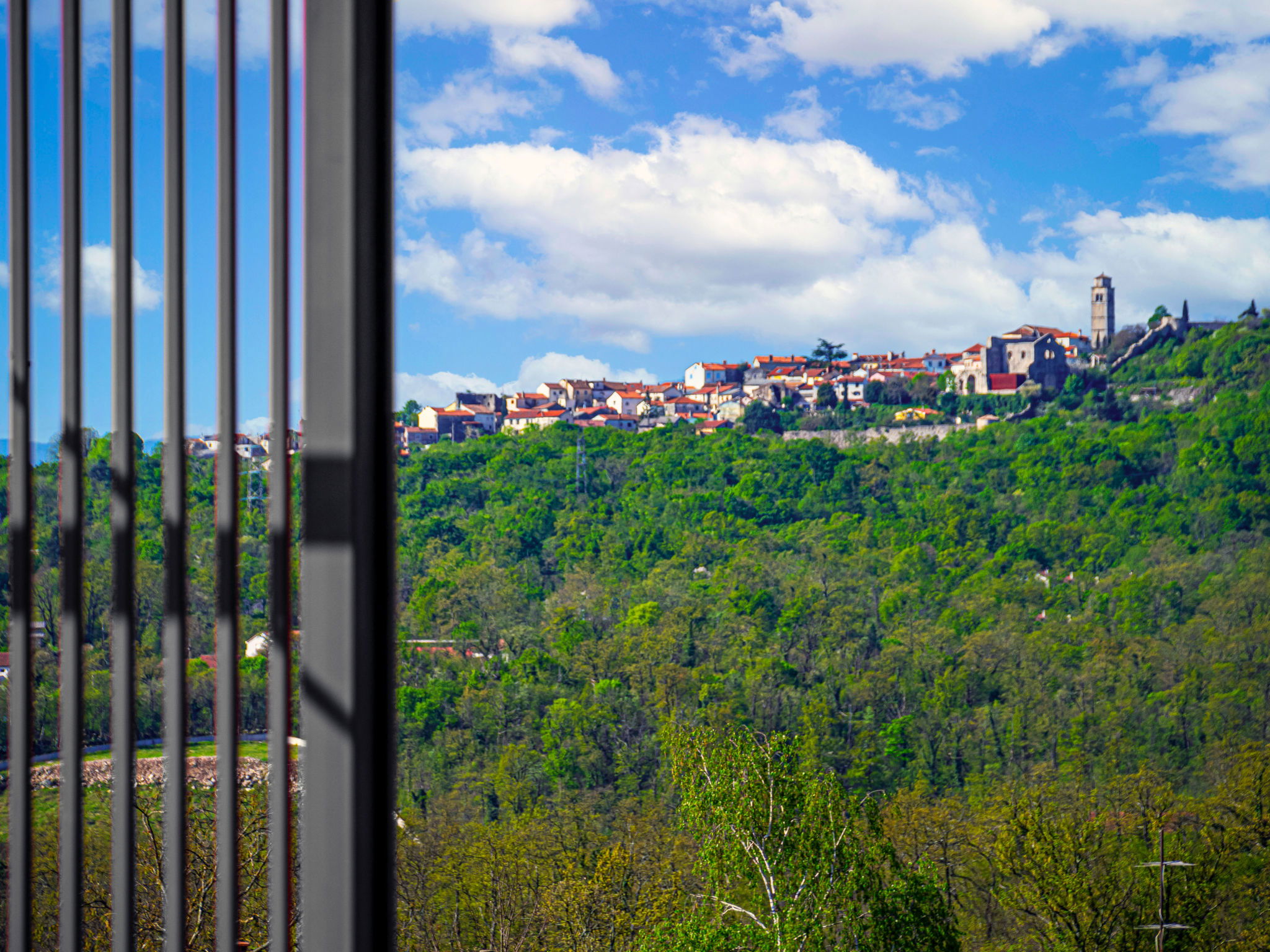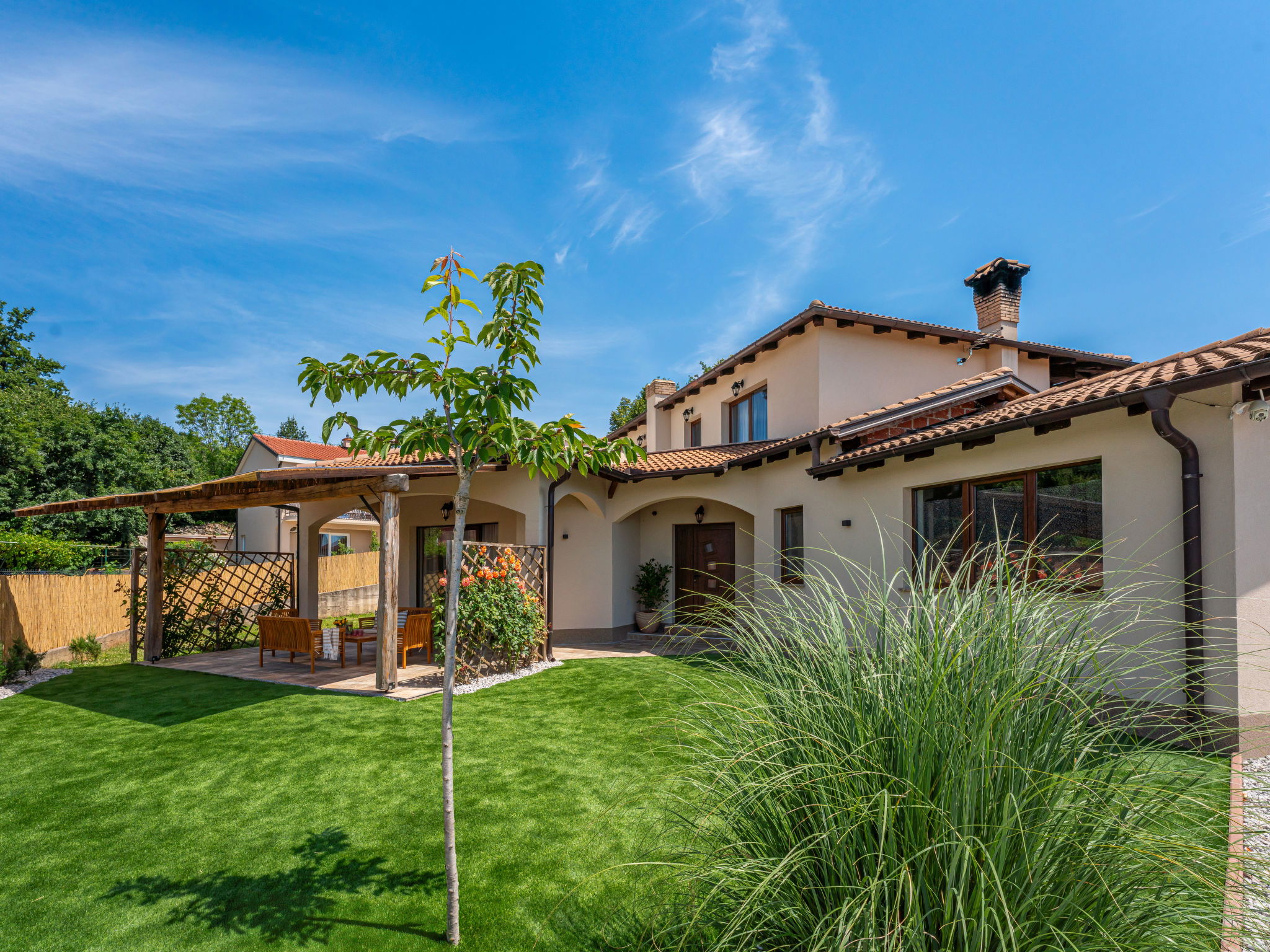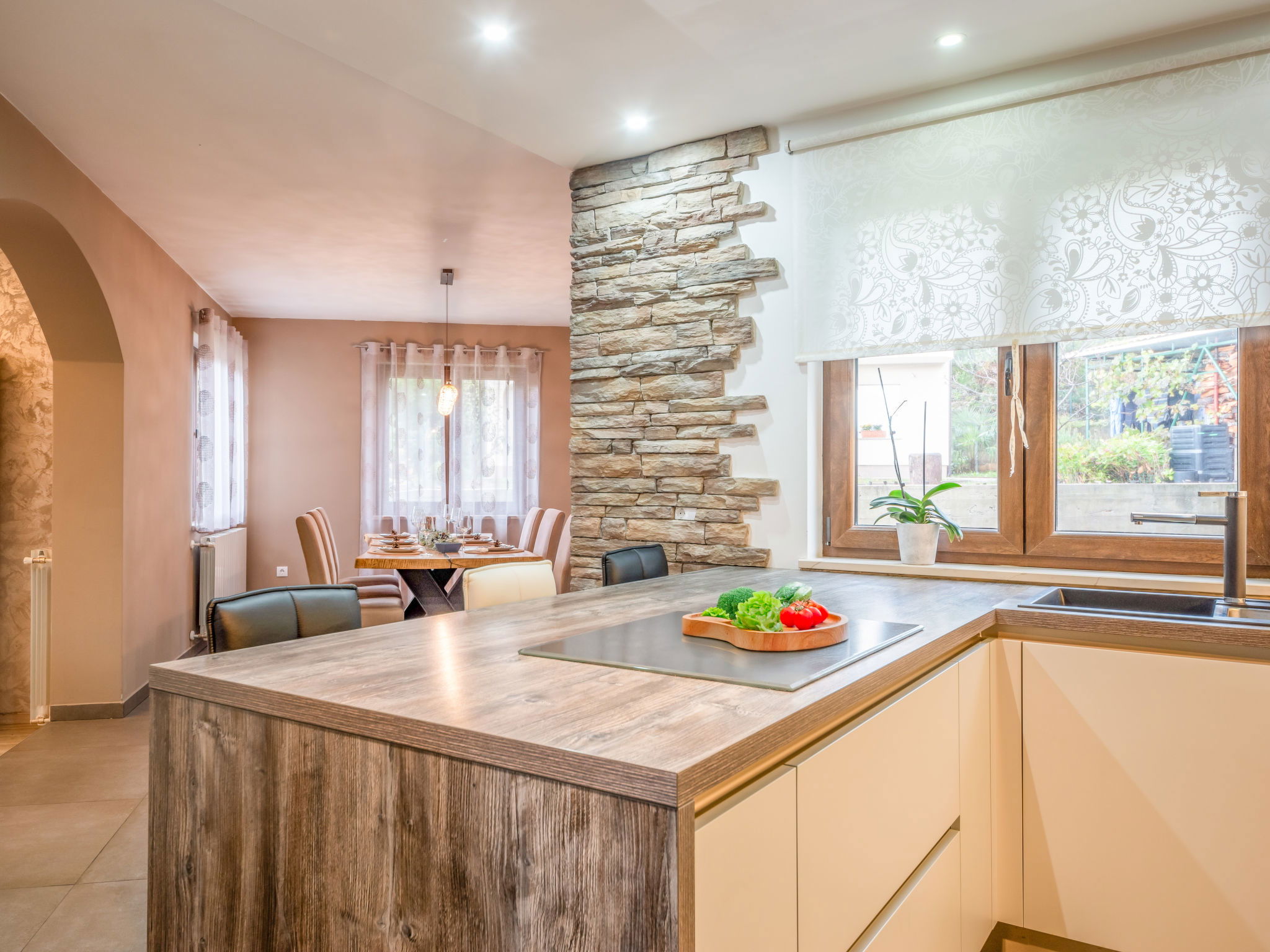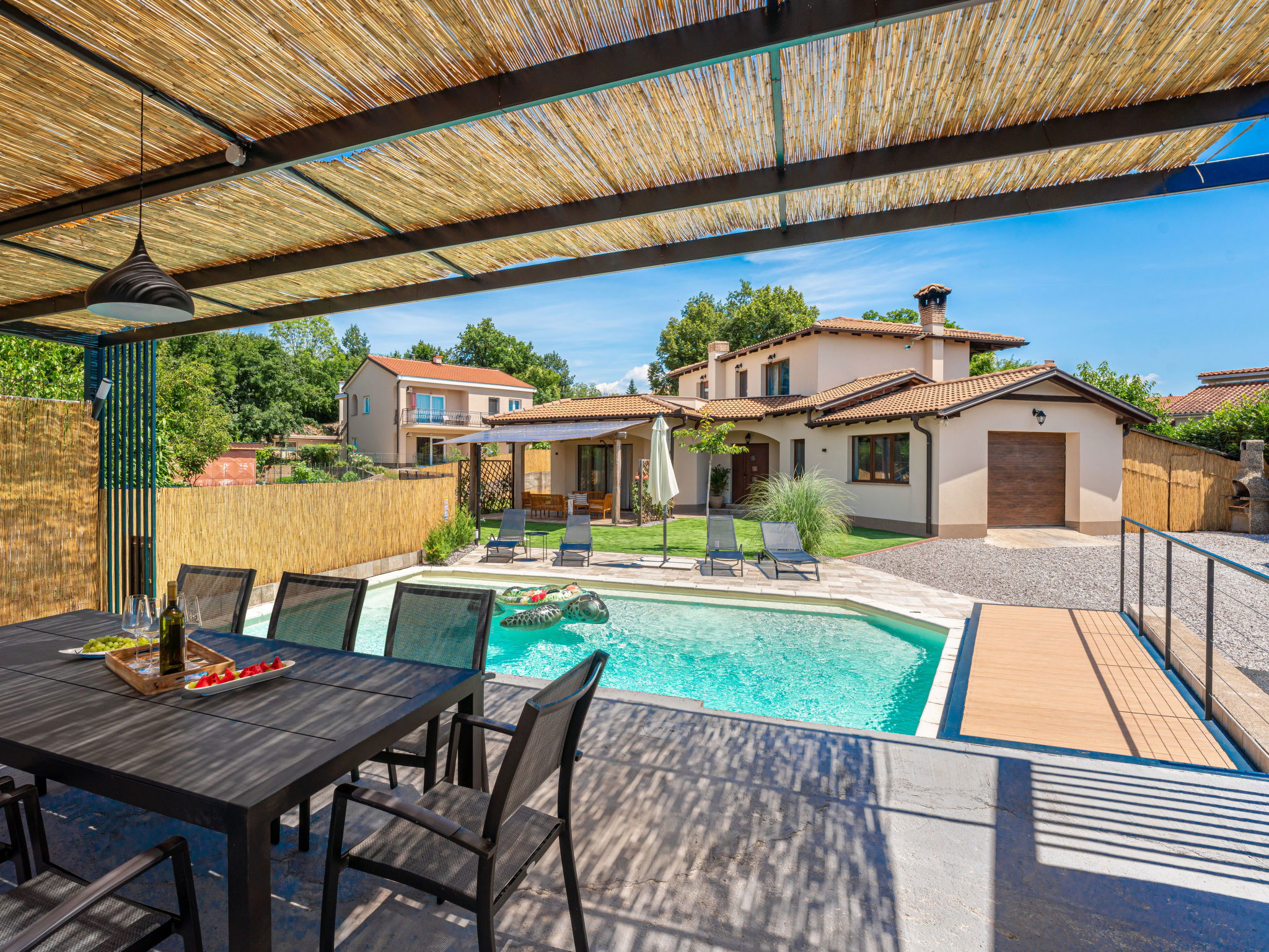 Kastav 6 km from Opatija: Comfortable single-family house "Campanero", 2 storeys, built in 2023. In the hamlet Kudeji 2.4 km from the centre of Viškovo, 3.7 km from the centre of Kastav, 9 km from the centre of Opatija, in a sunny, elevated position, 8 km from the sea, 8 km from the beach, in a cul-de-sac. Private: property 900 m2 (fenced), garden with lawn 300 m2, swimming pool angular (6 x 6 m, depth 140 cm, seasonal availability: 01.Jun. - 30.Sep.). WC in the pool area, outdoor shower, terrace, garden furniture. In the house: internet access. Parking at the house on the premises. Supermarket 2.4 km, shopping centre 2.4 km, restaurant 1.8 km, bakery 2.4 km, café 2.4 km, bus stop 160 m, pebble beach 8 km (small), outdoor swimming pool 10 km, indoor swimming pool 10 km, public bathing area 10 km, concrete beach 8 km. Nearby attractions: Kuća halubajskega zvončara UNESCO 2 km. Groups of teenagers on request only. Part of the house is closed and unoccupied. The owner runs dry dock marine services. By groups of young people double deposit is requested on arrival.