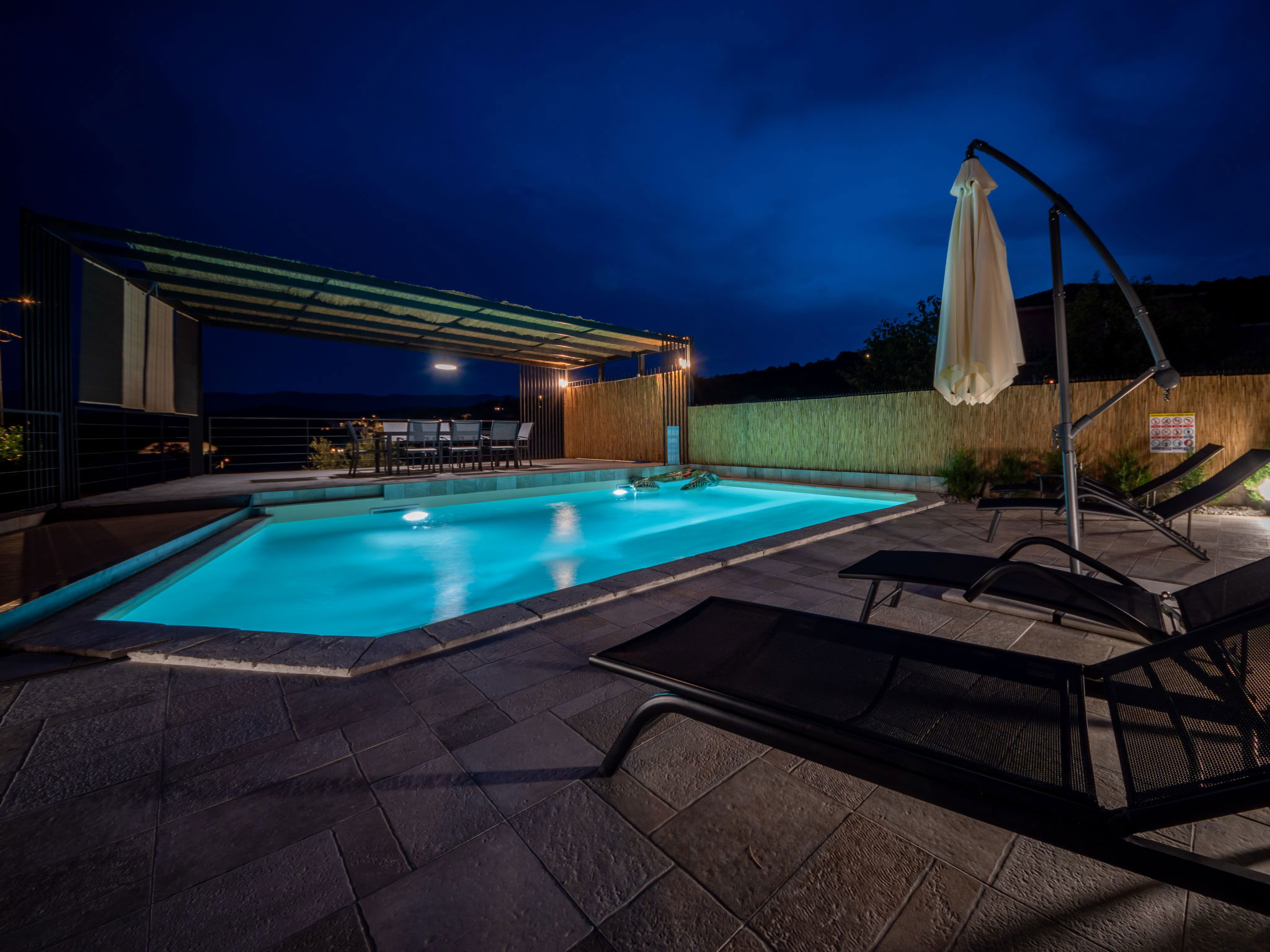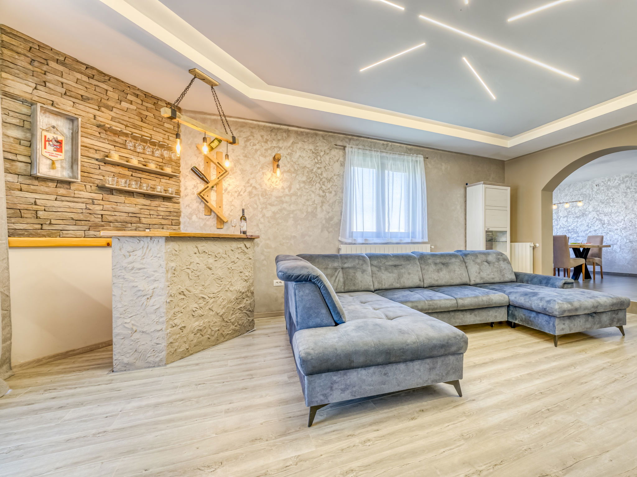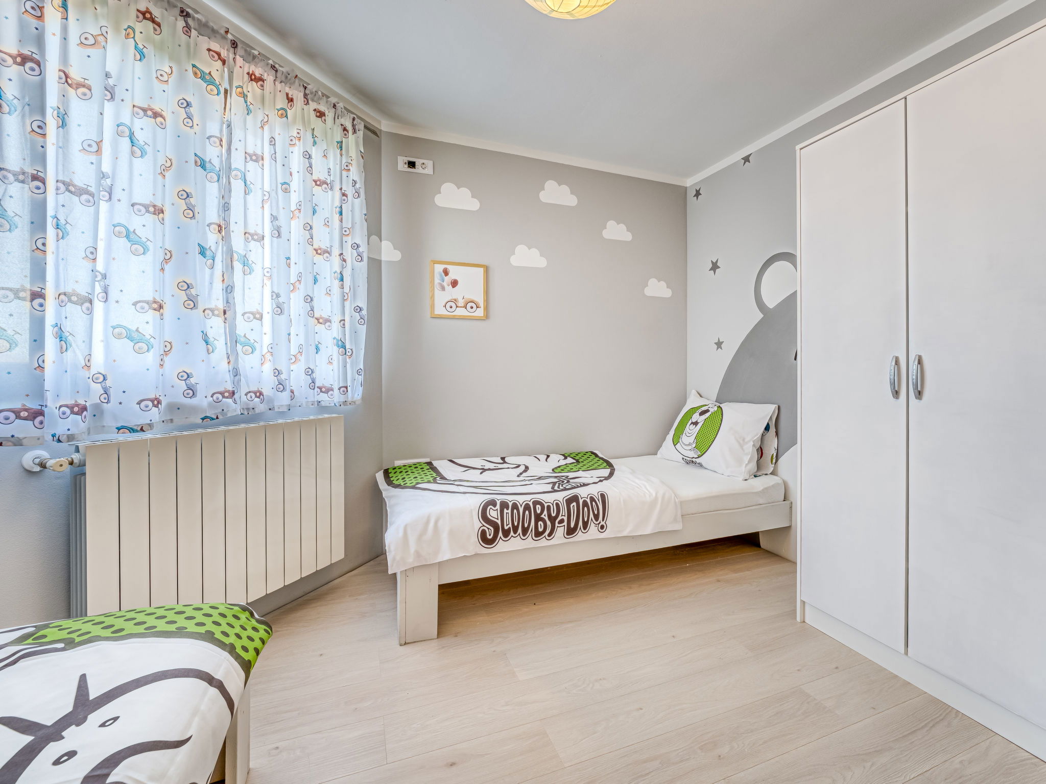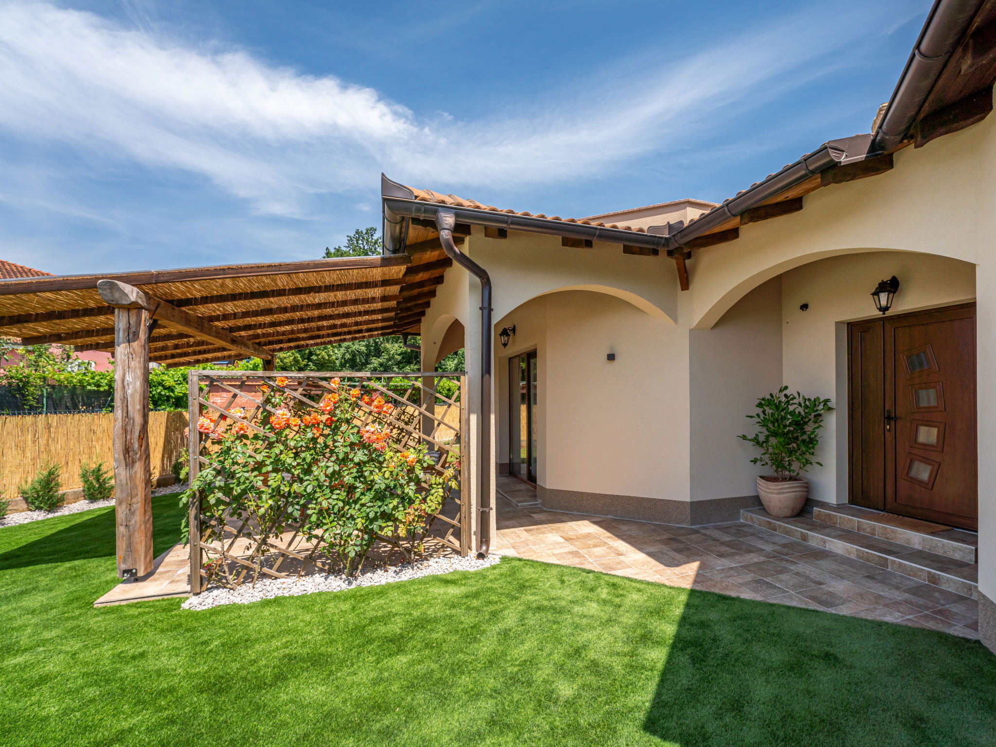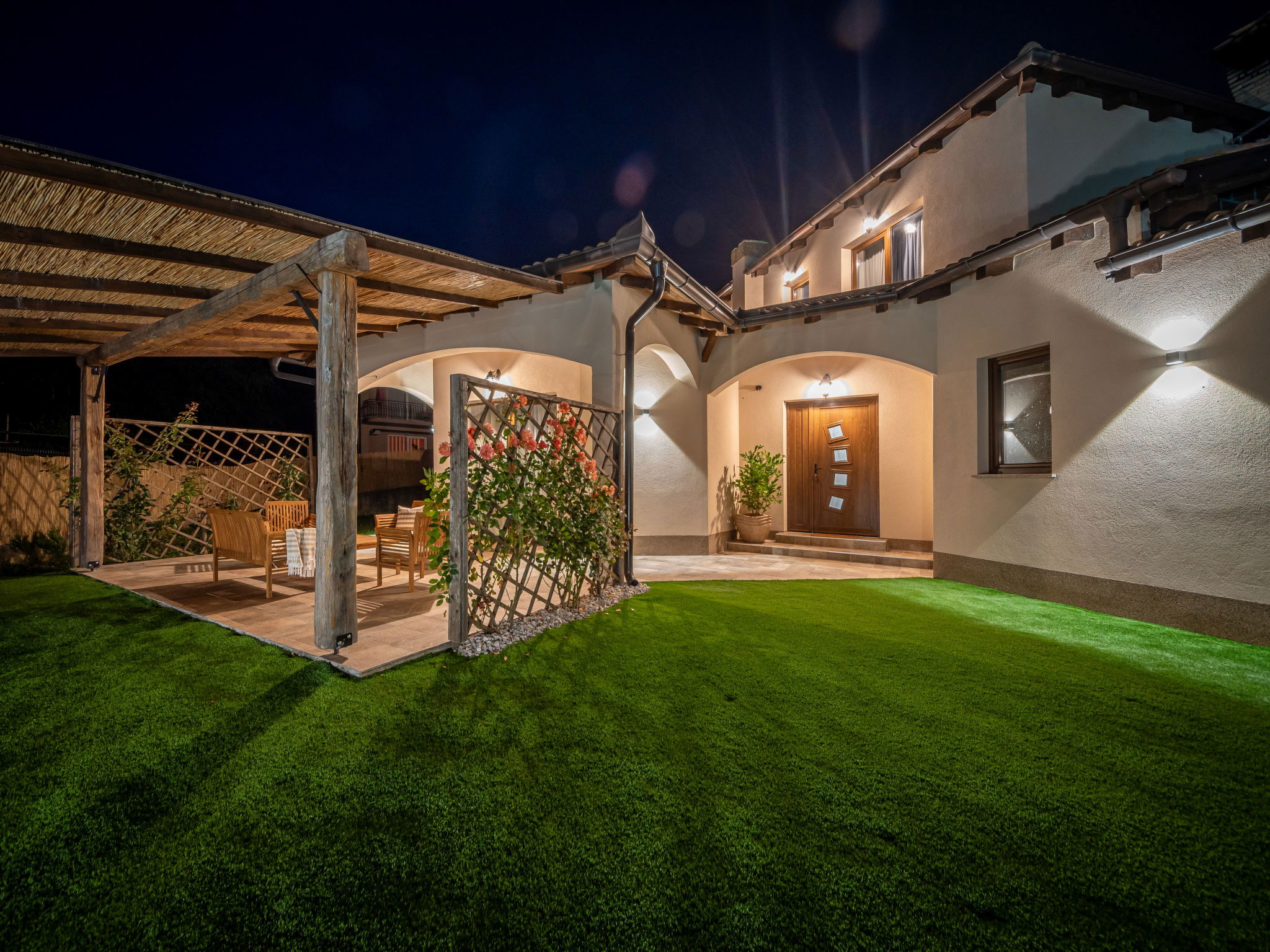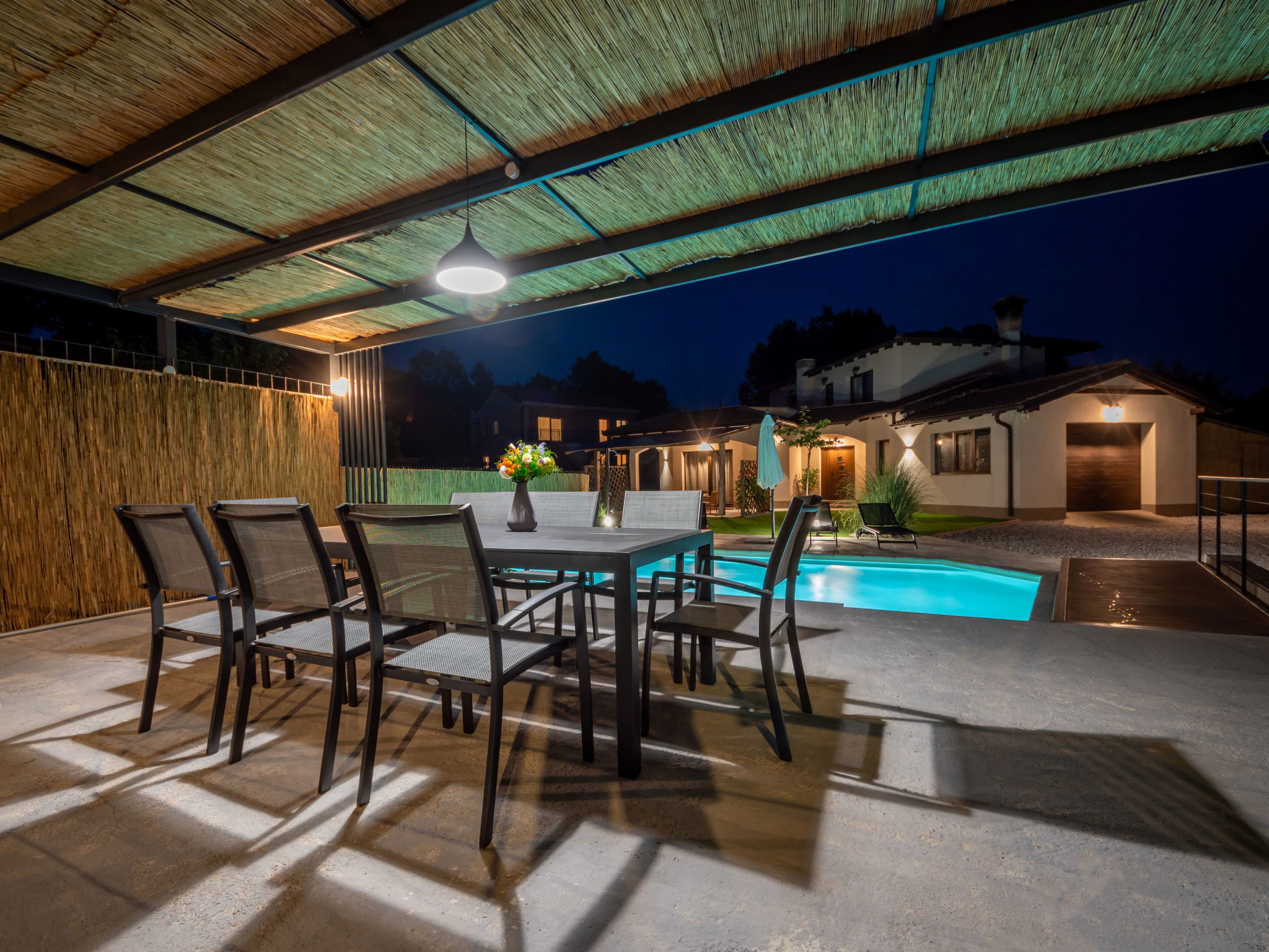Kastav 6 km from Opatija: Comfortable single-family house "Campanero", 2 storeys, built in 2023. In the hamlet Kudeji 2.4 km from the centre of Viškovo, 3.7 km from the centre of Kastav, 9 km from the centre of Opatija, in a sunny, elevated position, 8 km from the sea, 8 km from the beach, in a cul-de-sac. Private: property 900 m2 (fenced), garden with lawn 300 m2, swimming pool angular (6 x 6 m, depth 140 cm, seasonal availability: 01.Jun. - 30.Sep.). WC in the pool area, outdoor shower, terrace, garden furniture. In the house: internet access. Parking at the house on the premises. Supermarket 2.4 km, shopping centre 2.4 km, restaurant 1.8 km, bakery 2.4 km, café 2.4 km, bus stop 160 m, pebble beach 8 km (small), outdoor swimming pool 10 km, indoor swimming pool 10 km, public bathing area 10 km, concrete beach 8 km. Nearby attractions: Kuća halubajskega zvončara UNESCO 2 km. Groups of teenagers on request only. Part of the house is closed and unoccupied. The owner runs dry dock marine services. By groups of young people double deposit is requested on arrival.