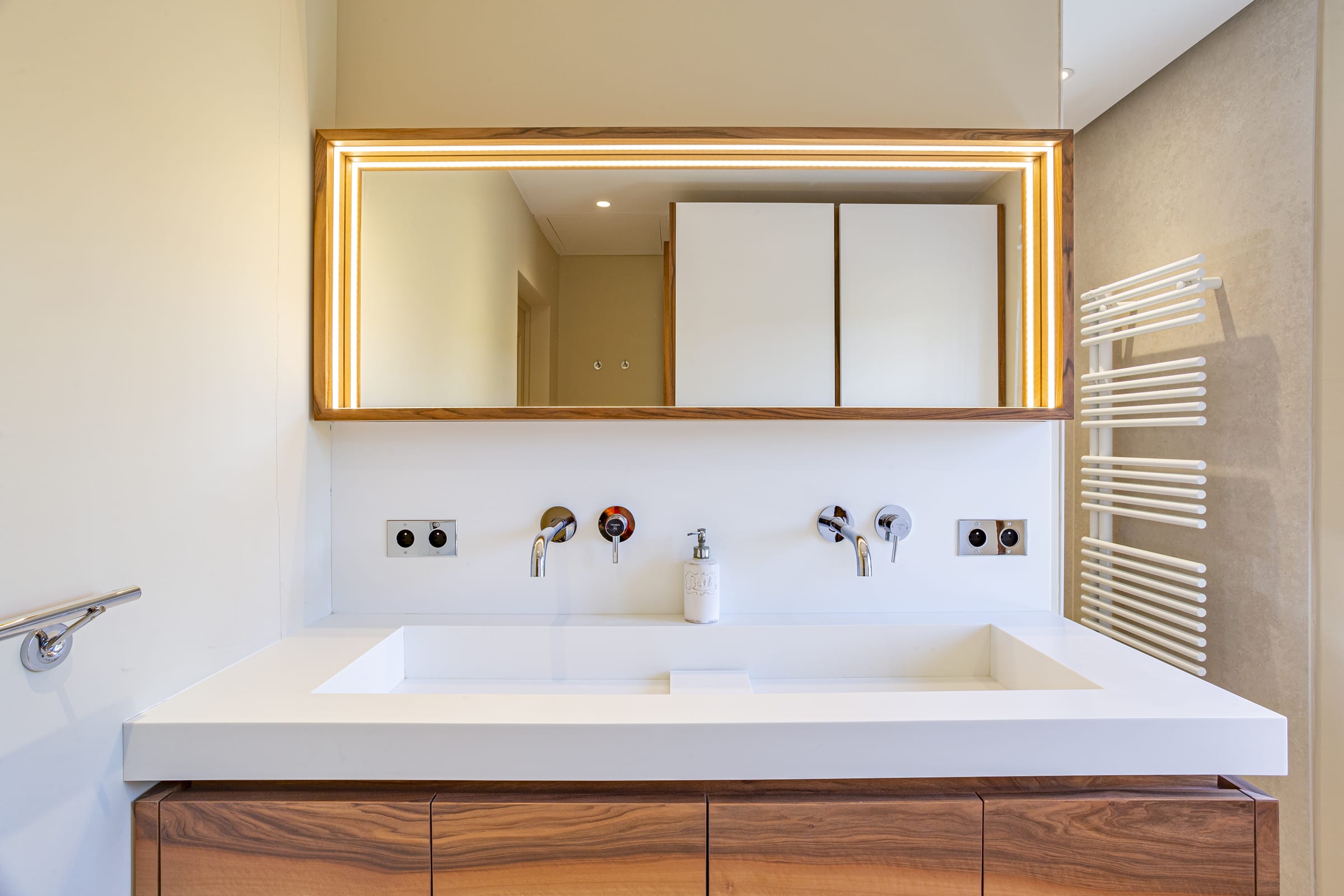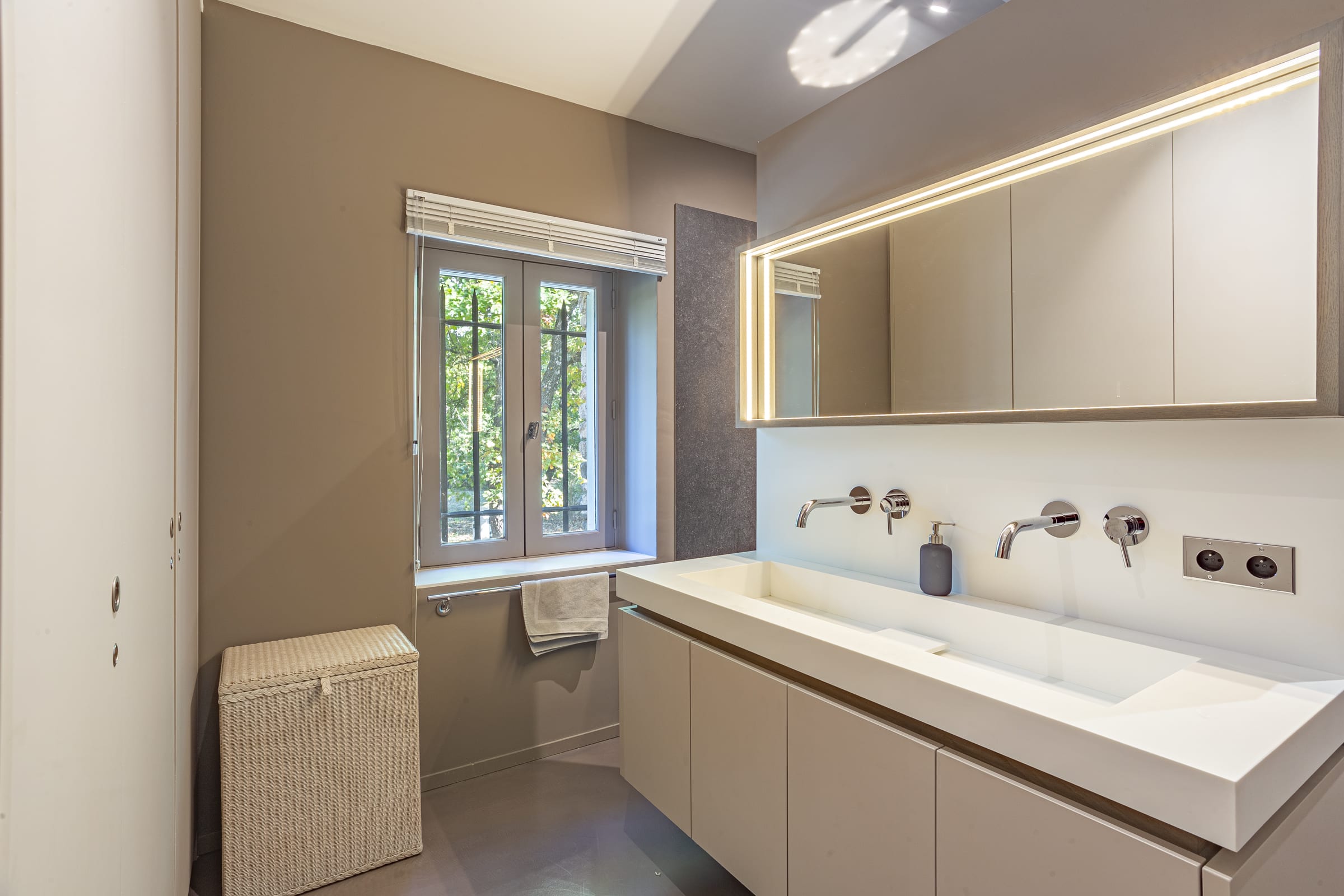 . Bathroom with bath (1.90m) and integrated shower, 2 washbasins and toilet, to be shared between bedroom 4 and 5.