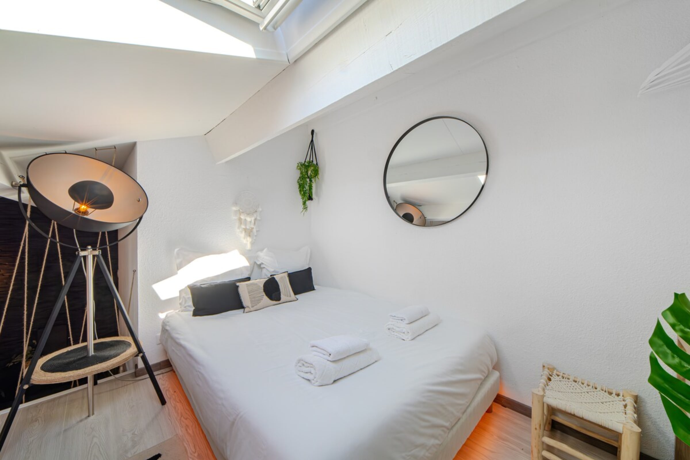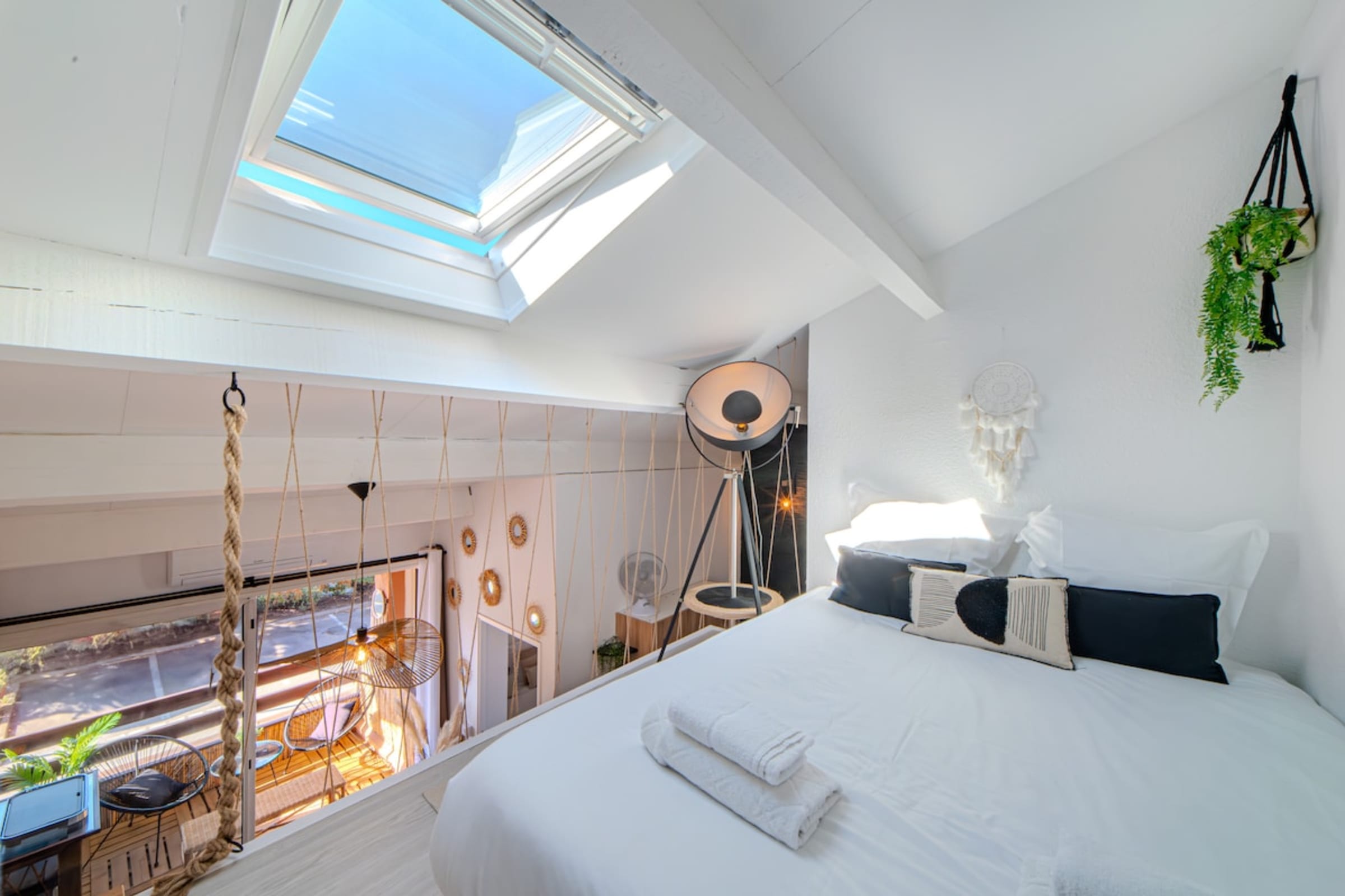 A closed bedroom with a double bed, providing a comfortable and soothing cocoon. A mezzanine bed, ideal for a second, cozy and intimate sleeping area.