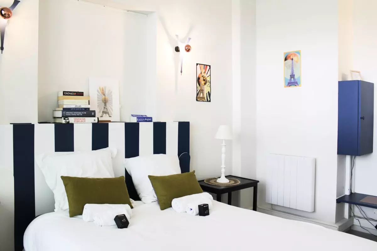 The Eiffel Tower room, inspired by the iconic monument, with graphic and bright decor.