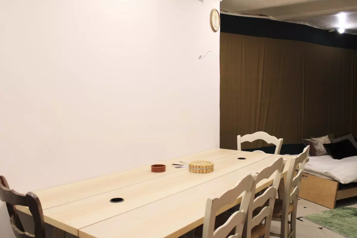 A friendly living room with a convertible sofa (2 places) and a dining area or work space.