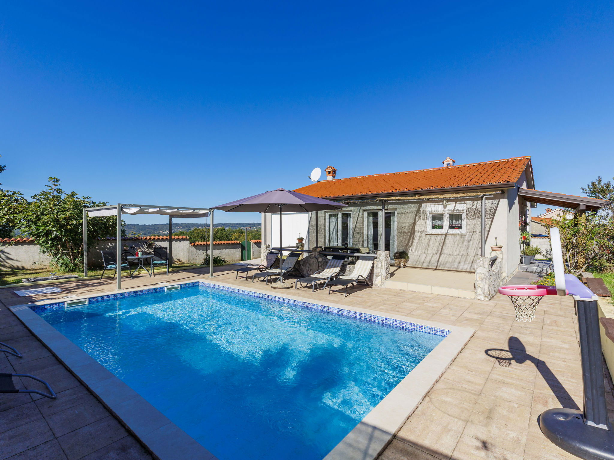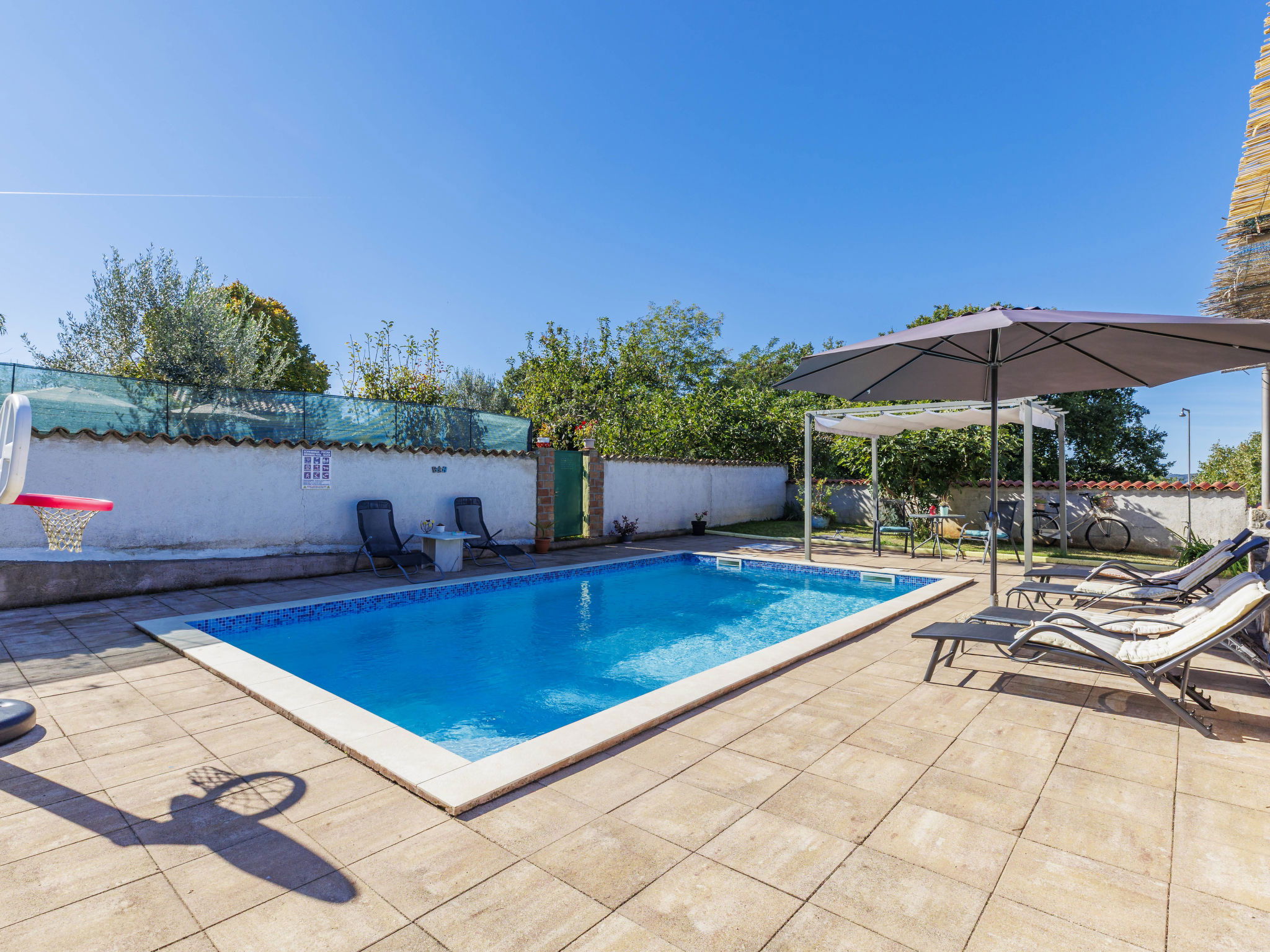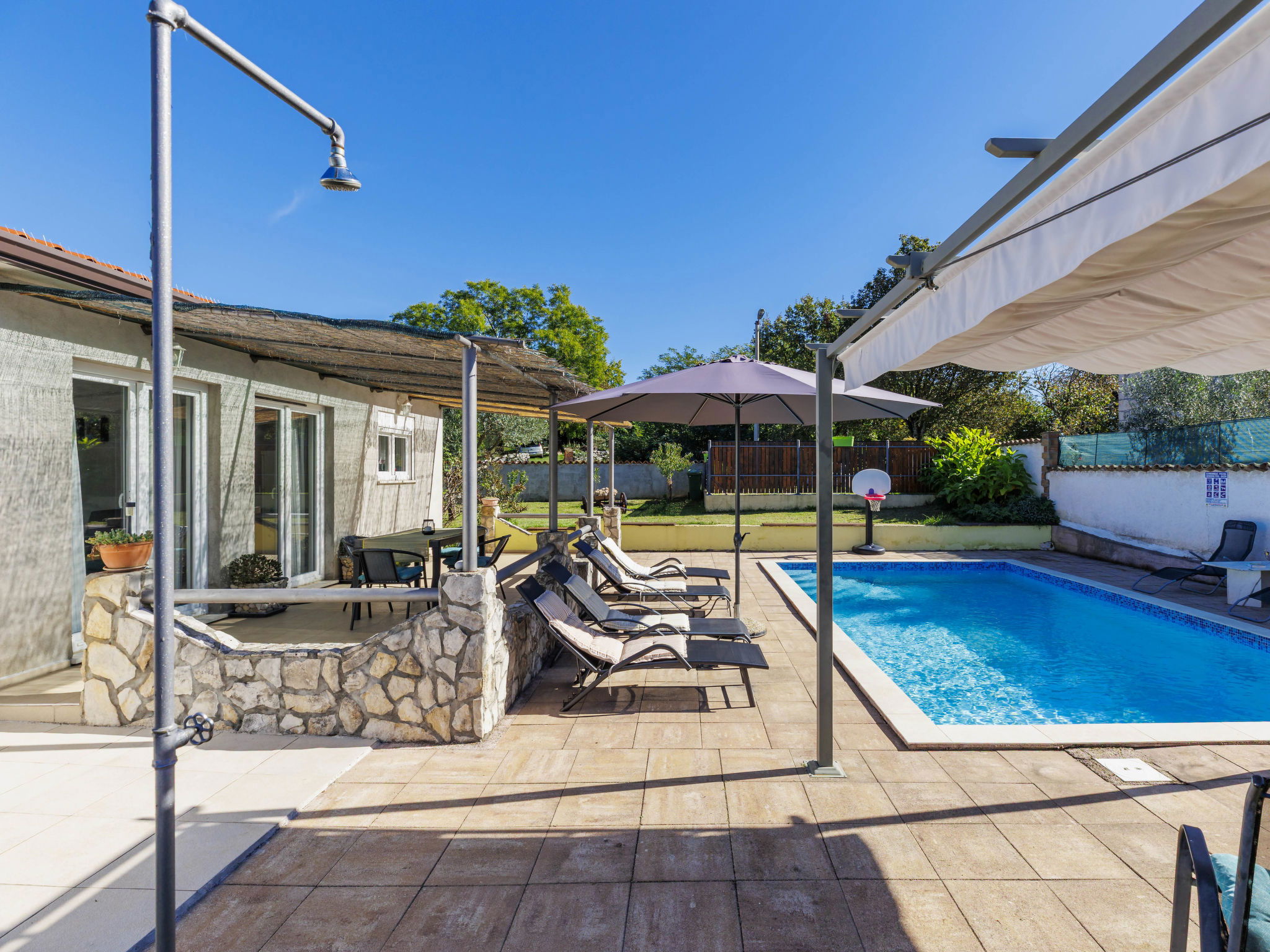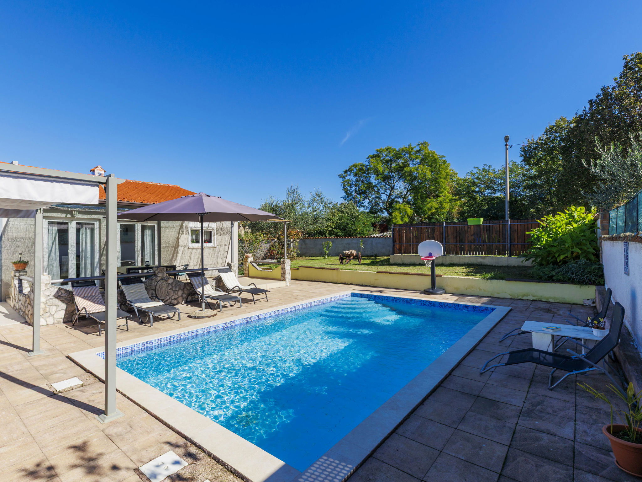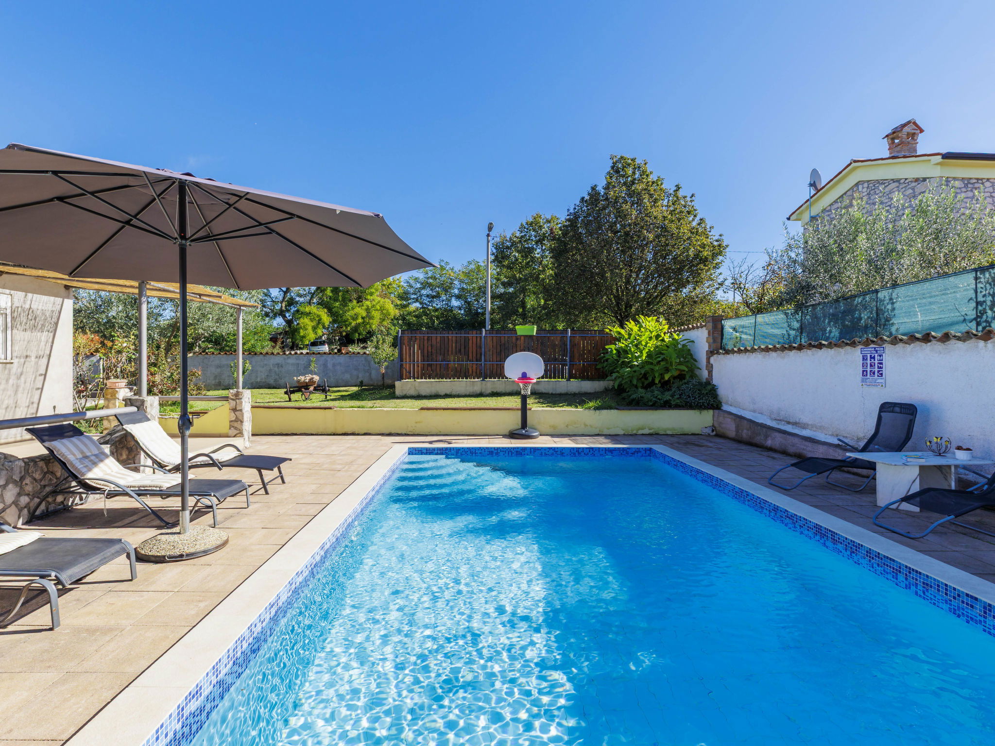 Single-family house "Sandra". In the hamlet Markoci 7 km from the centre of Labin, 12 km from the centre of Rabac, 12 km from the sea, 12 km from the beach, in the countryside. Private: property 700 m2 (fenced), lawn and wildlife garden, swimming pool angular (7 x 4 m, depth 140 cm, seasonal availability: 01.Apr. - 30.Oct.) with internal staircase. Outdoor shower, terrace (20 m2), garden furniture, barbecue, pool maintenance by the owner/gardener. In the house: internet access, washing machine. Parking (for 2 cars) at the house on the premises. Shop 2 km, supermarket 7 km, restaurant 2 km, bus stop "Labin" 12 km, pebble beach 12 km. Please note: airfield 50 m from the property.