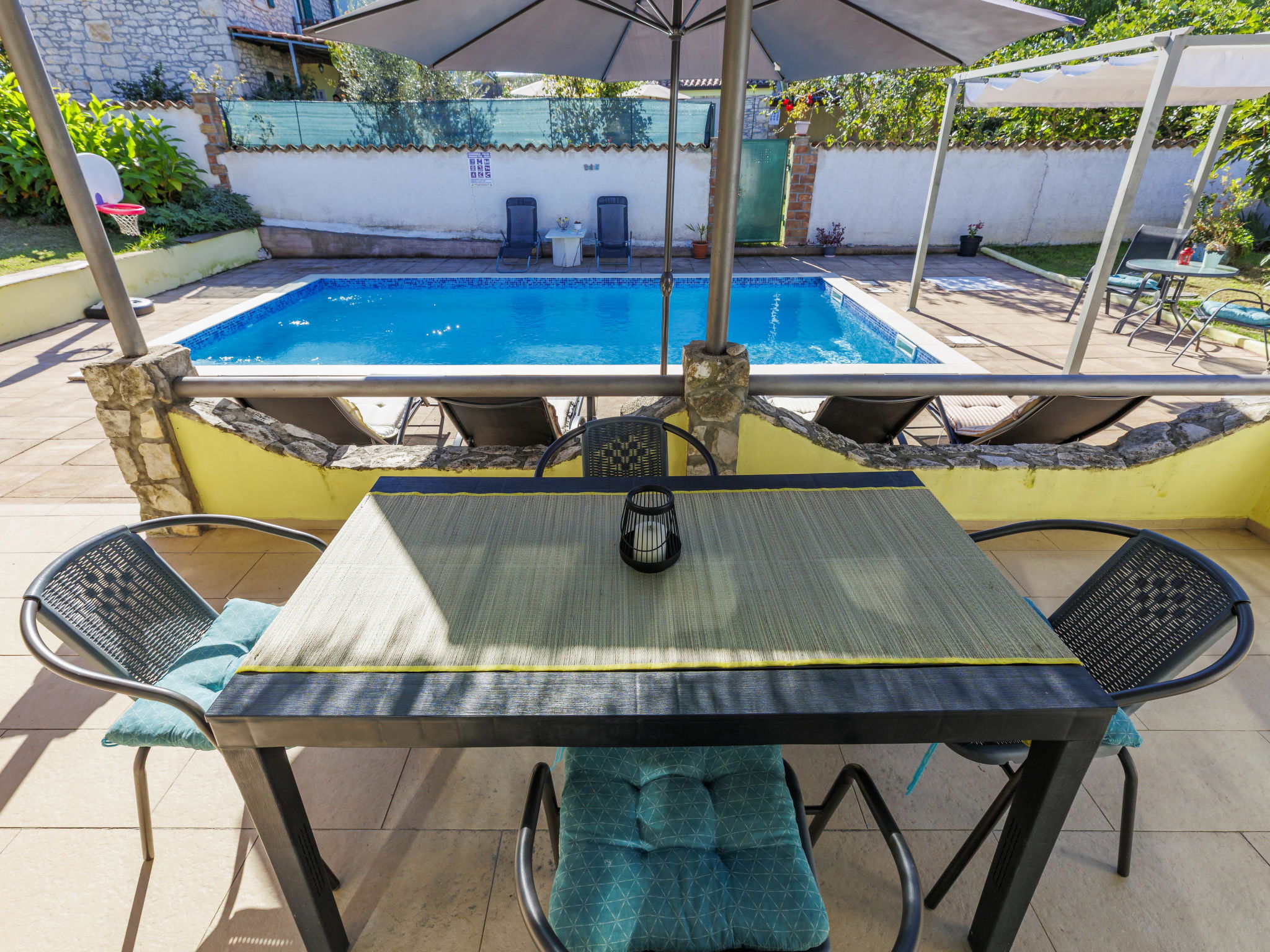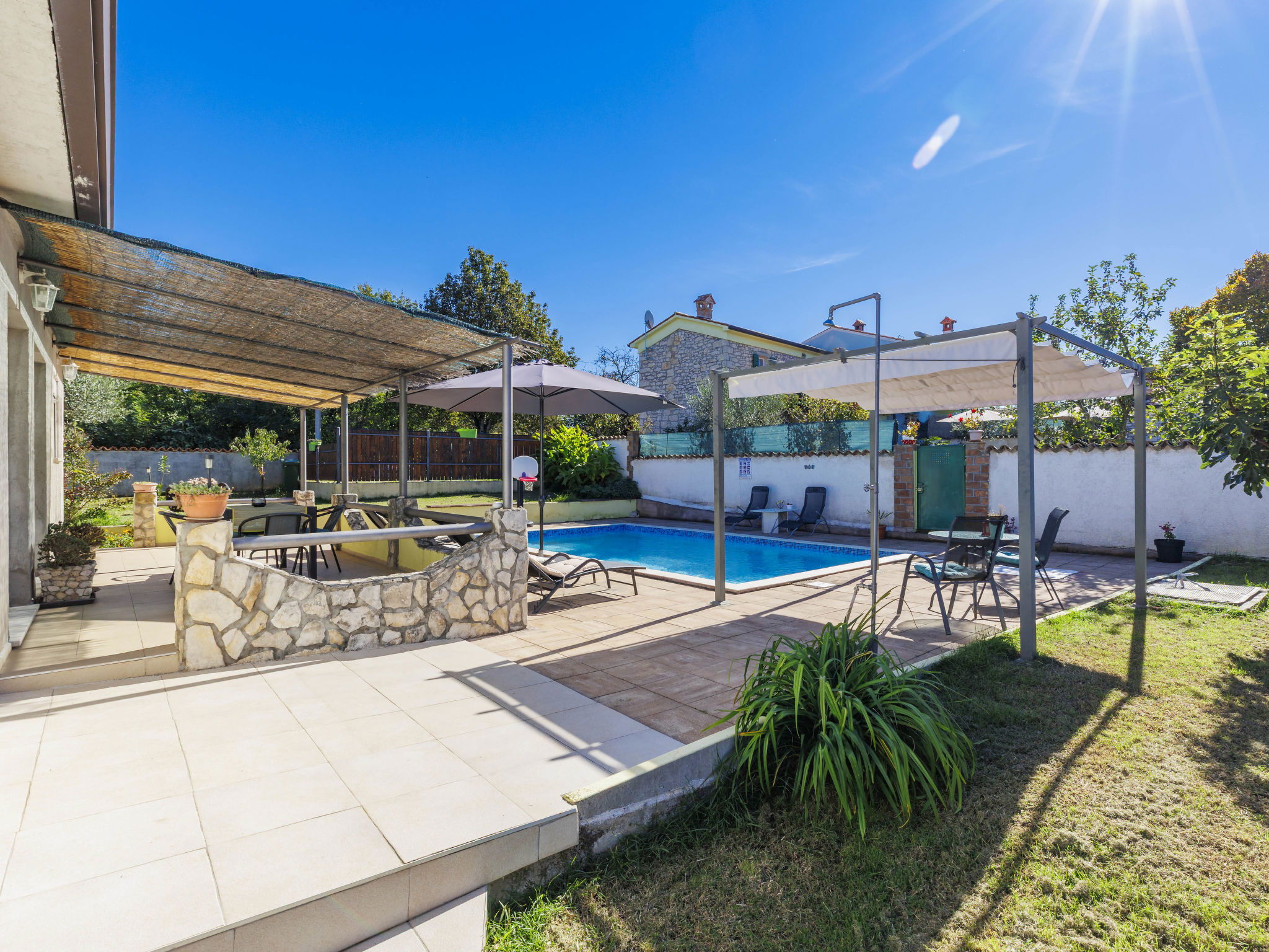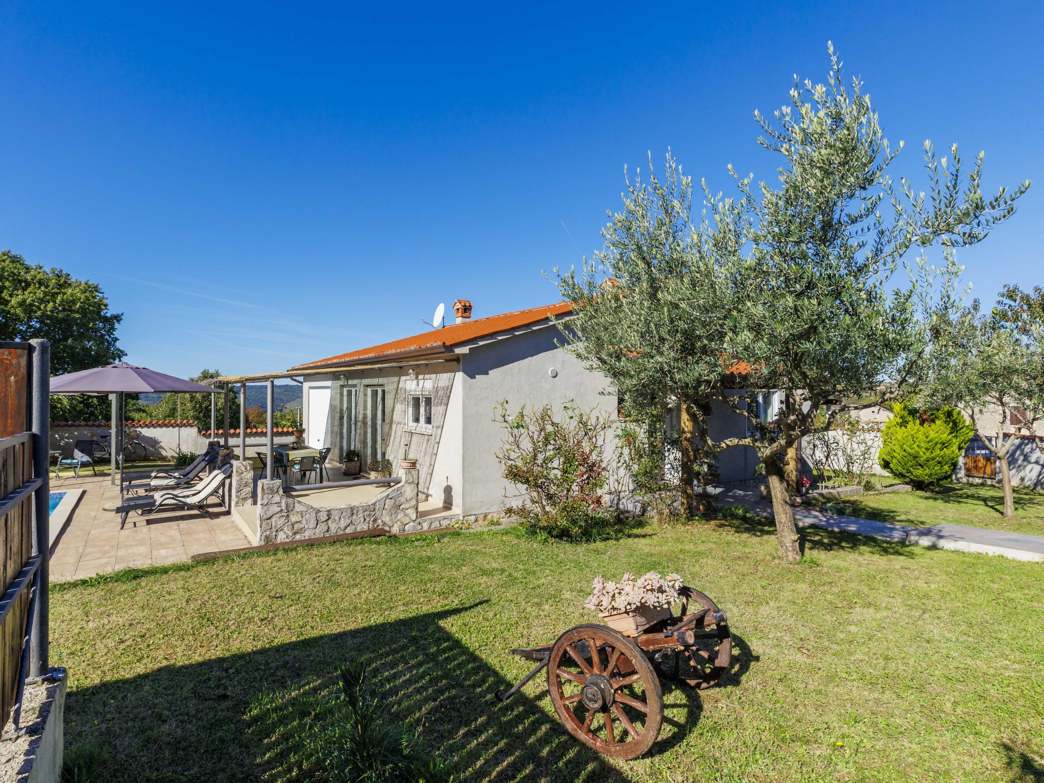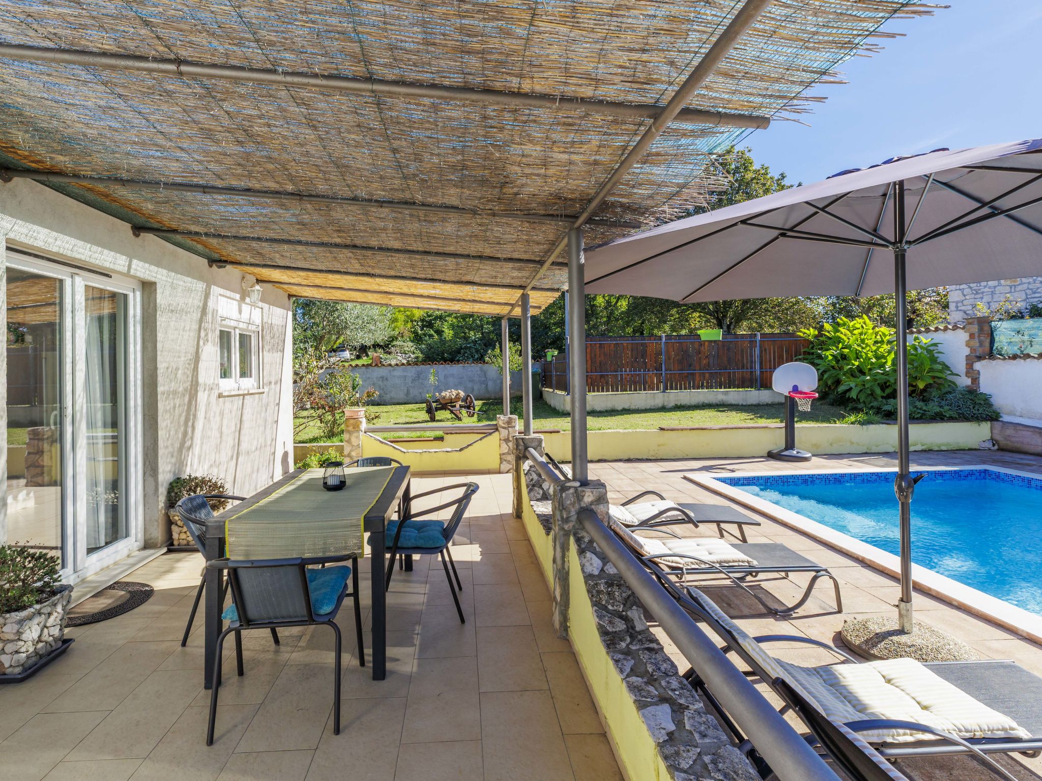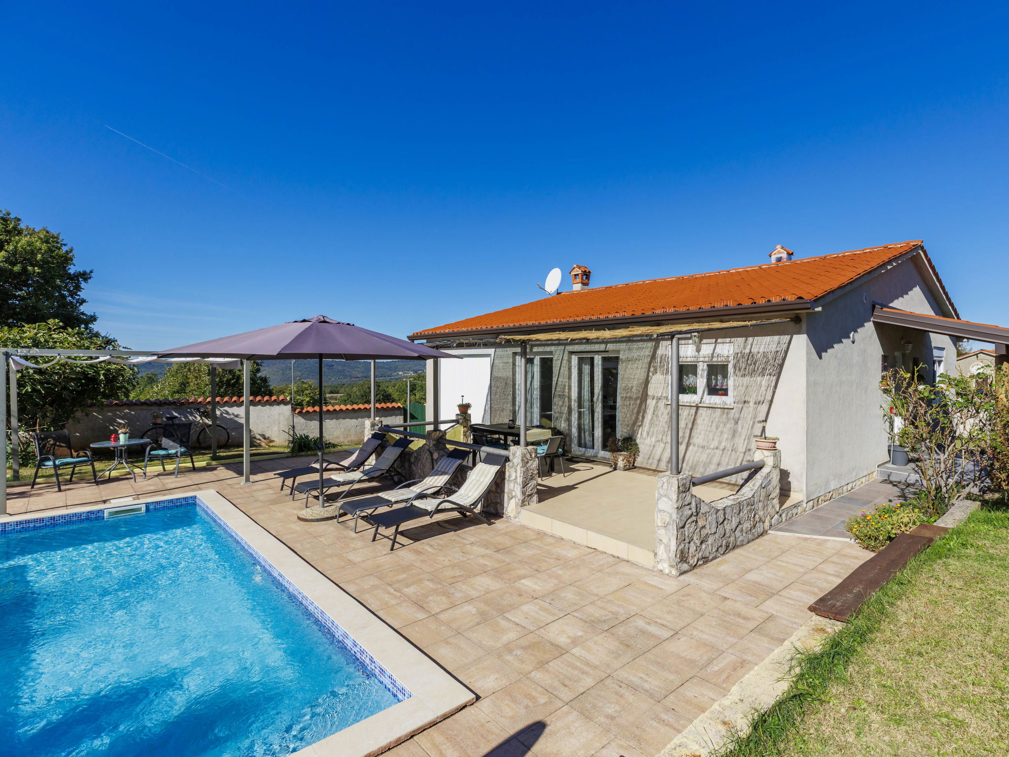 Single-family house "Sandra". In the hamlet Markoci 7 km from the centre of Labin, 12 km from the centre of Rabac, 12 km from the sea, 12 km from the beach, in the countryside. Private: property 700 m2 (fenced), lawn and wildlife garden, swimming pool angular (7 x 4 m, depth 140 cm, seasonal availability: 01.Apr. - 30.Oct.) with internal staircase. Outdoor shower, terrace (20 m2), garden furniture, barbecue, pool maintenance by the owner/gardener. In the house: internet access, washing machine. Parking (for 2 cars) at the house on the premises. Shop 2 km, supermarket 7 km, restaurant 2 km, bus stop "Labin" 12 km, pebble beach 12 km. Please note: airfield 50 m from the property.