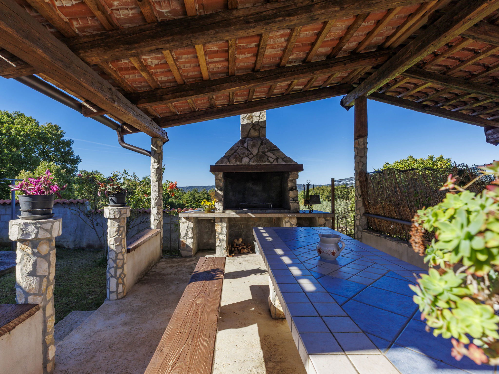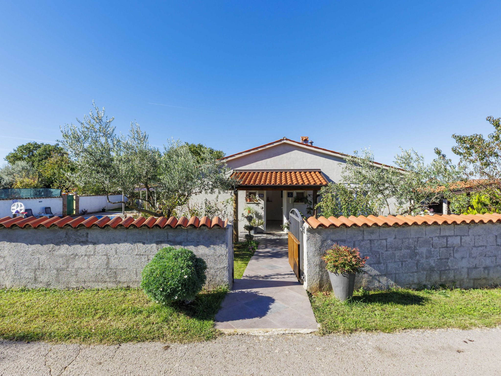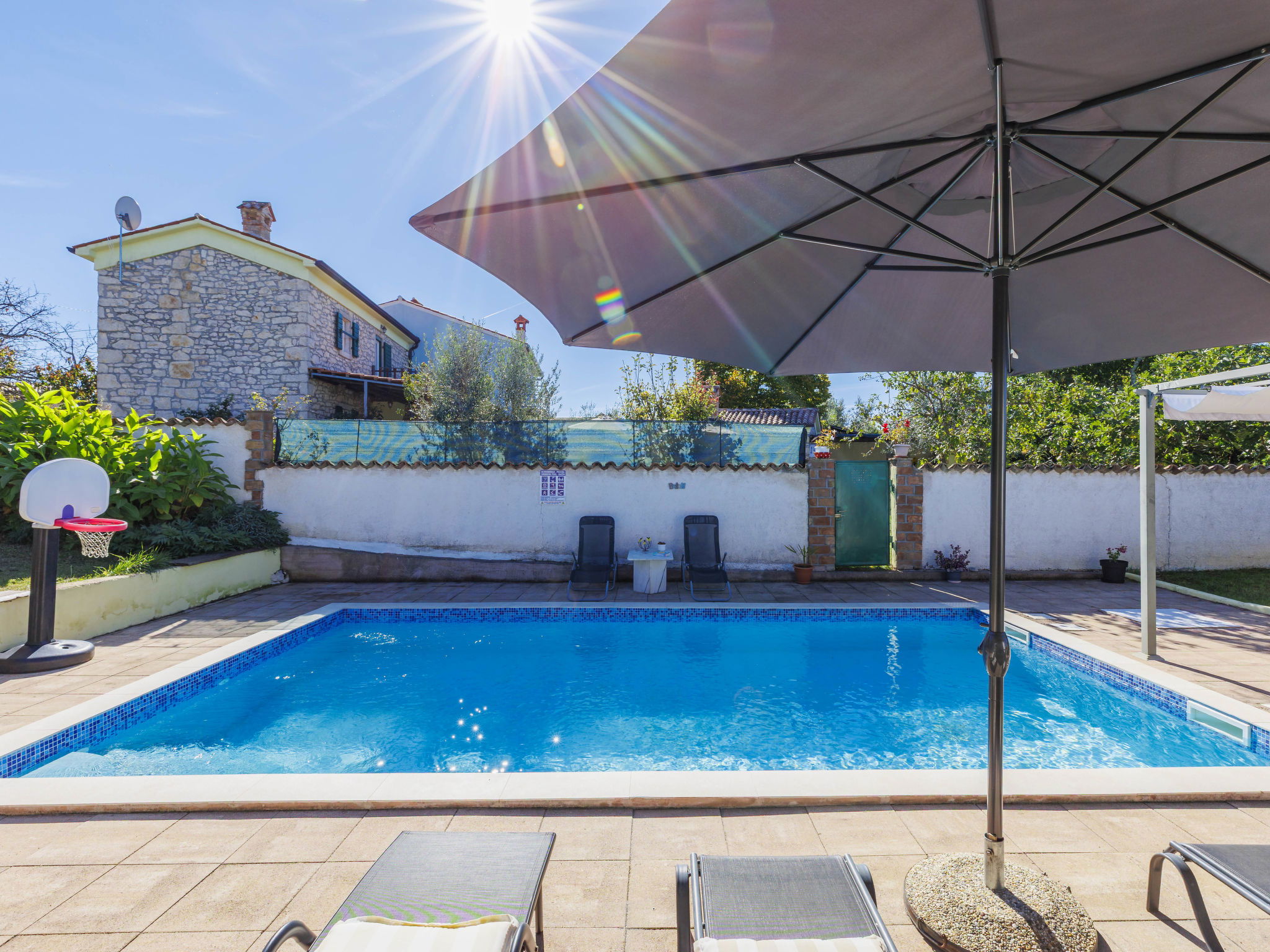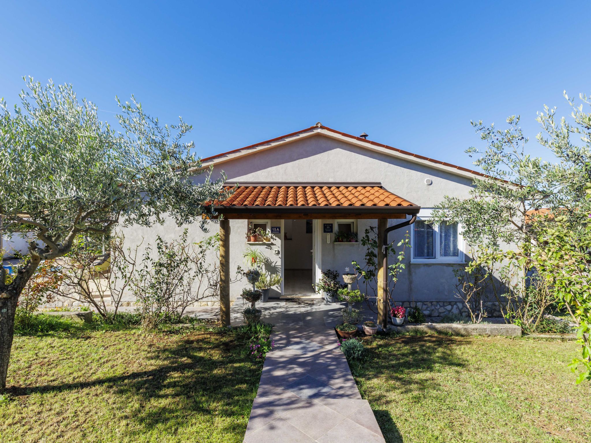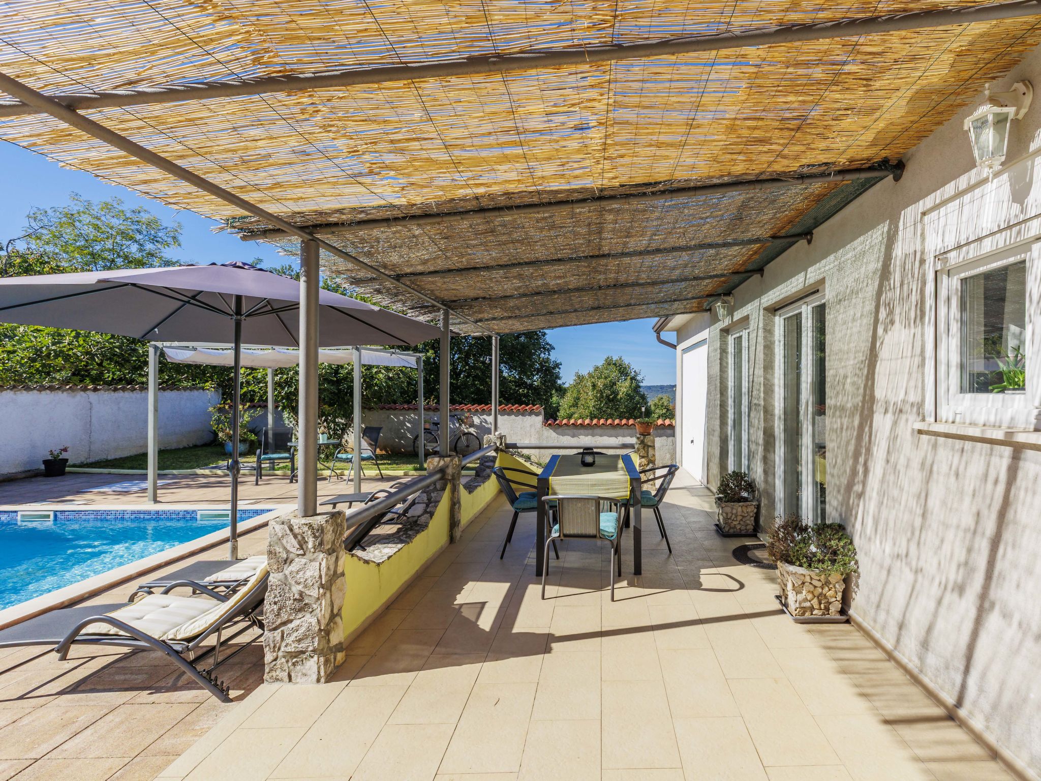 Single-family house "Sandra". In the hamlet Markoci 7 km from the centre of Labin, 12 km from the centre of Rabac, 12 km from the sea, 12 km from the beach, in the countryside. Private: property 700 m2 (fenced), lawn and wildlife garden, swimming pool angular (7 x 4 m, depth 140 cm, seasonal availability: 01.Apr. - 30.Oct.) with internal staircase. Outdoor shower, terrace (20 m2), garden furniture, barbecue, pool maintenance by the owner/gardener. In the house: internet access, washing machine. Parking (for 2 cars) at the house on the premises. Shop 2 km, supermarket 7 km, restaurant 2 km, bus stop "Labin" 12 km, pebble beach 12 km. Please note: airfield 50 m from the property.