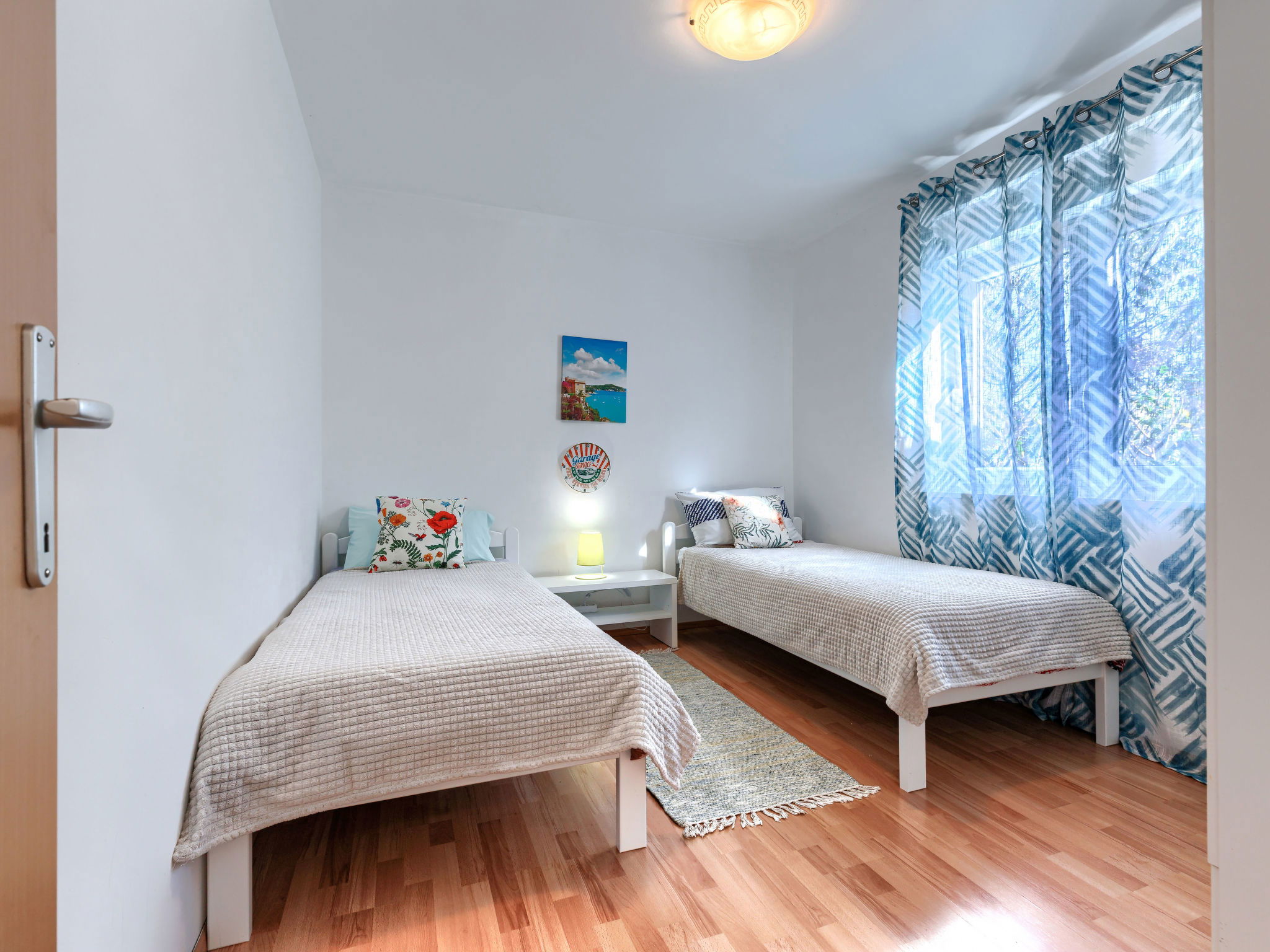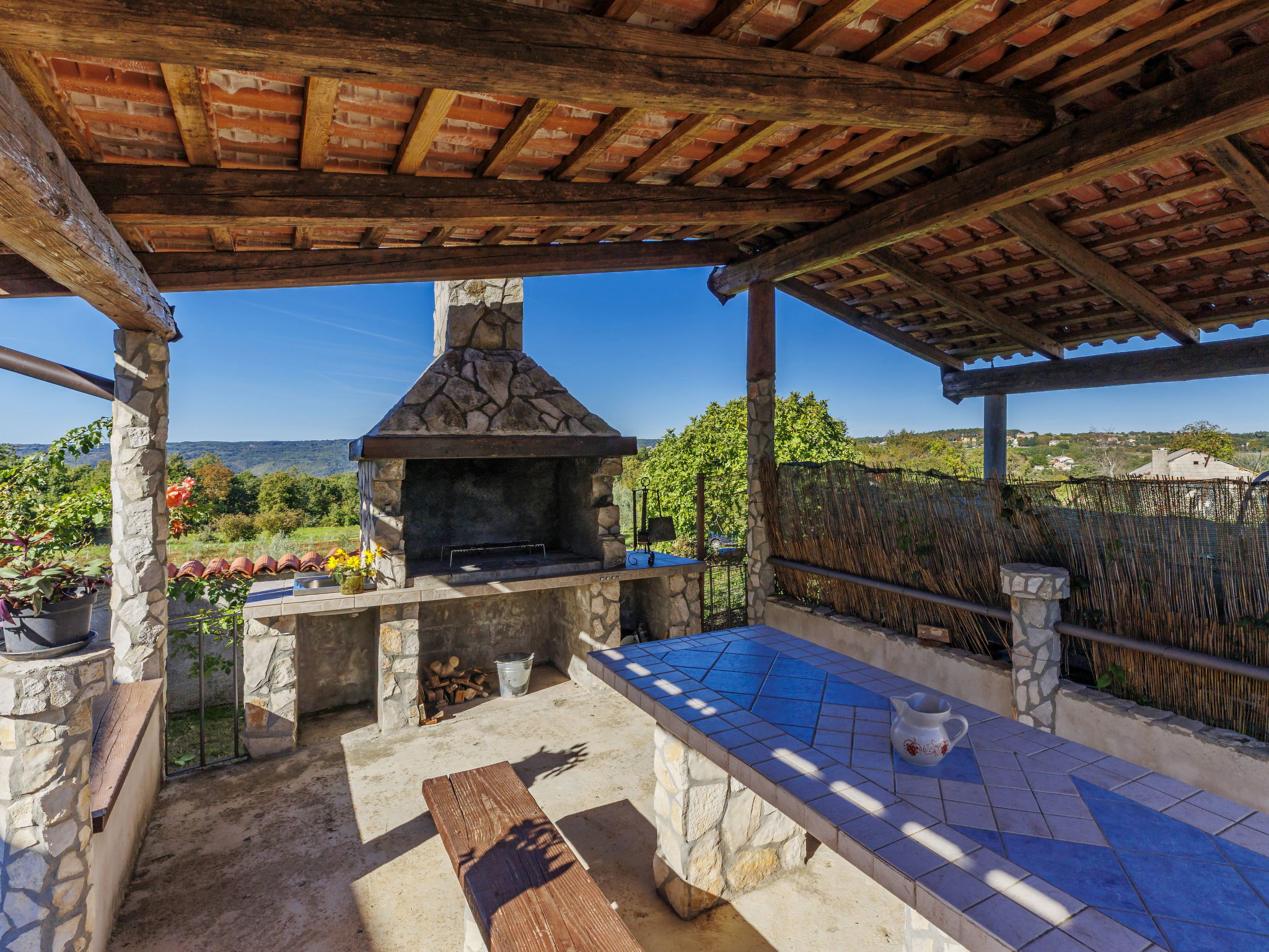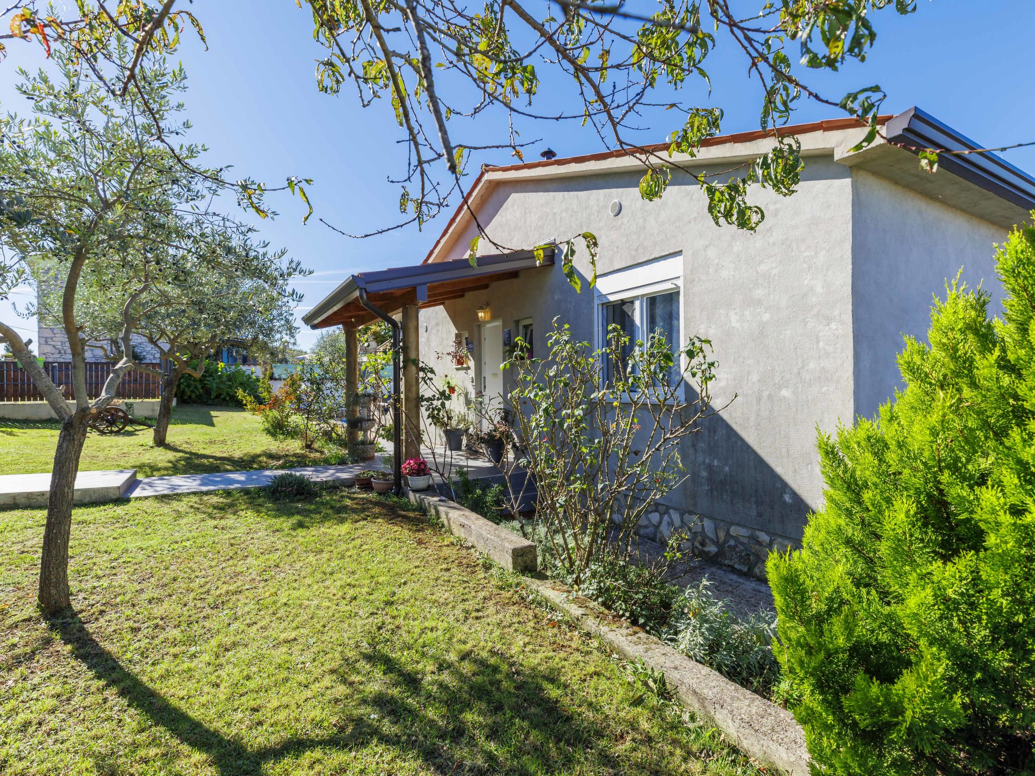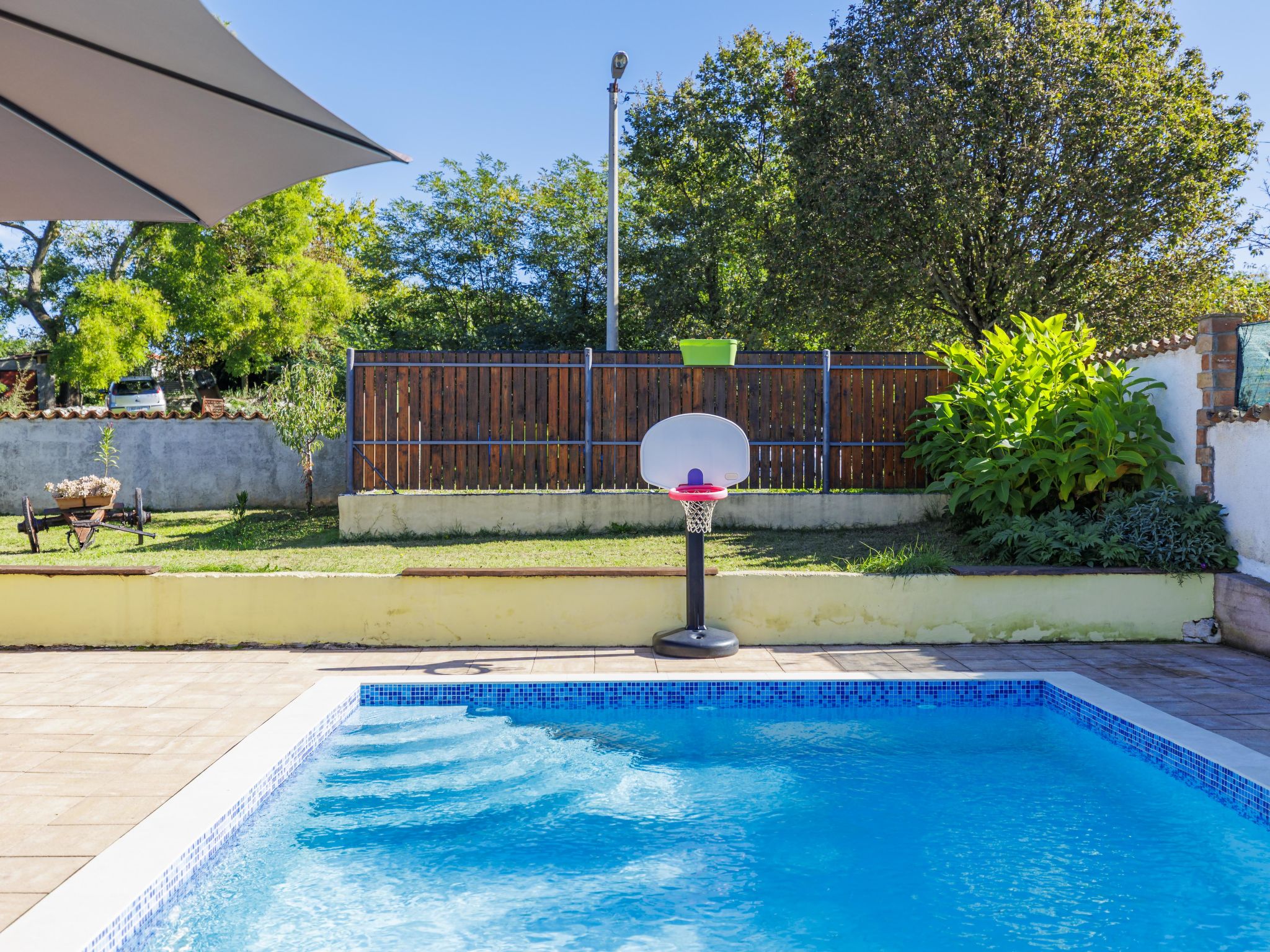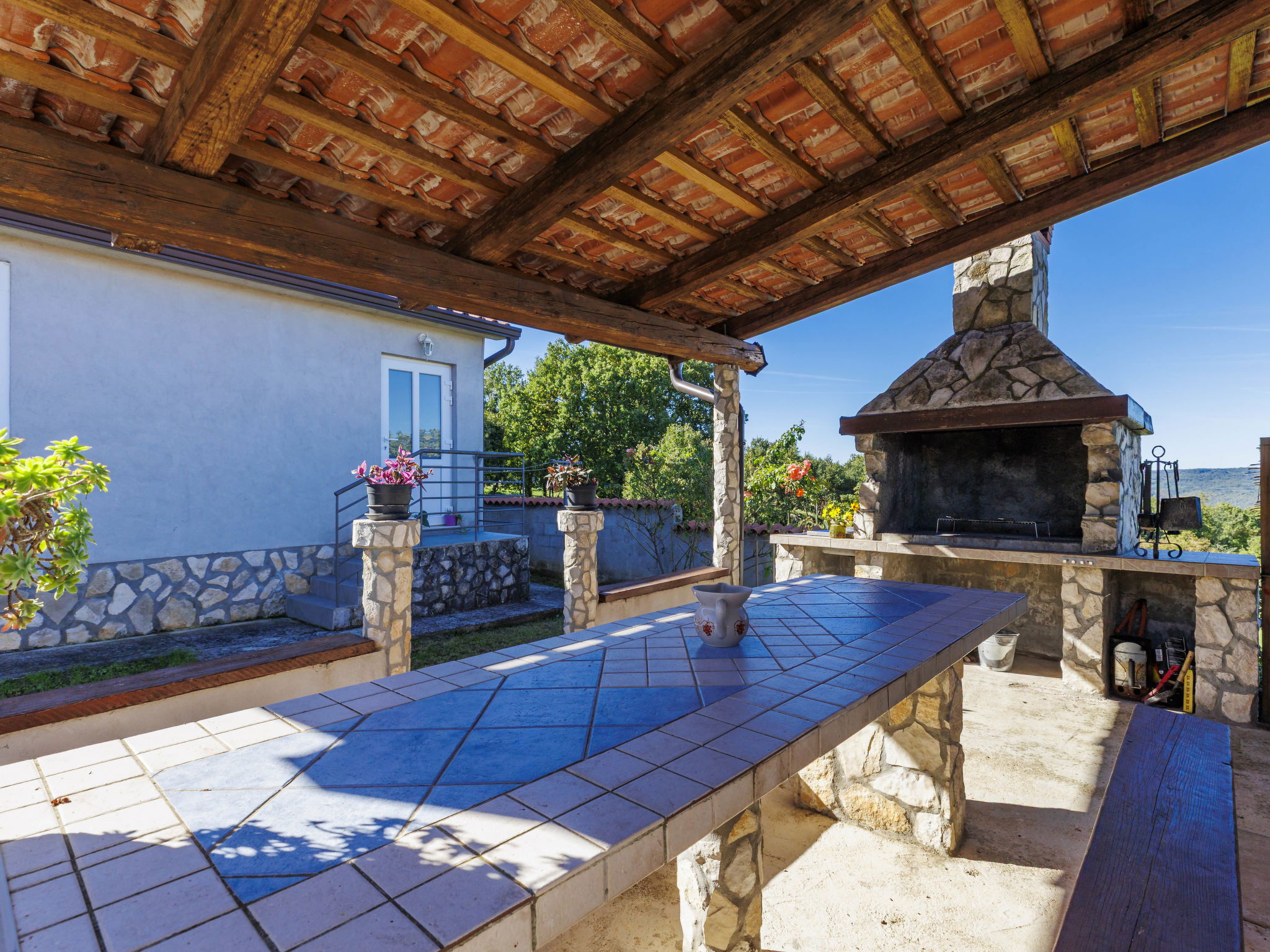 Single-family house "Sandra". In the hamlet Markoci 7 km from the centre of Labin, 12 km from the centre of Rabac, 12 km from the sea, 12 km from the beach, in the countryside. Private: property 700 m2 (fenced), lawn and wildlife garden, swimming pool angular (7 x 4 m, depth 140 cm, seasonal availability: 01.Apr. - 30.Oct.) with internal staircase. Outdoor shower, terrace (20 m2), garden furniture, barbecue, pool maintenance by the owner/gardener. In the house: internet access, washing machine. Parking (for 2 cars) at the house on the premises. Shop 2 km, supermarket 7 km, restaurant 2 km, bus stop "Labin" 12 km, pebble beach 12 km. Please note: airfield 50 m from the property.