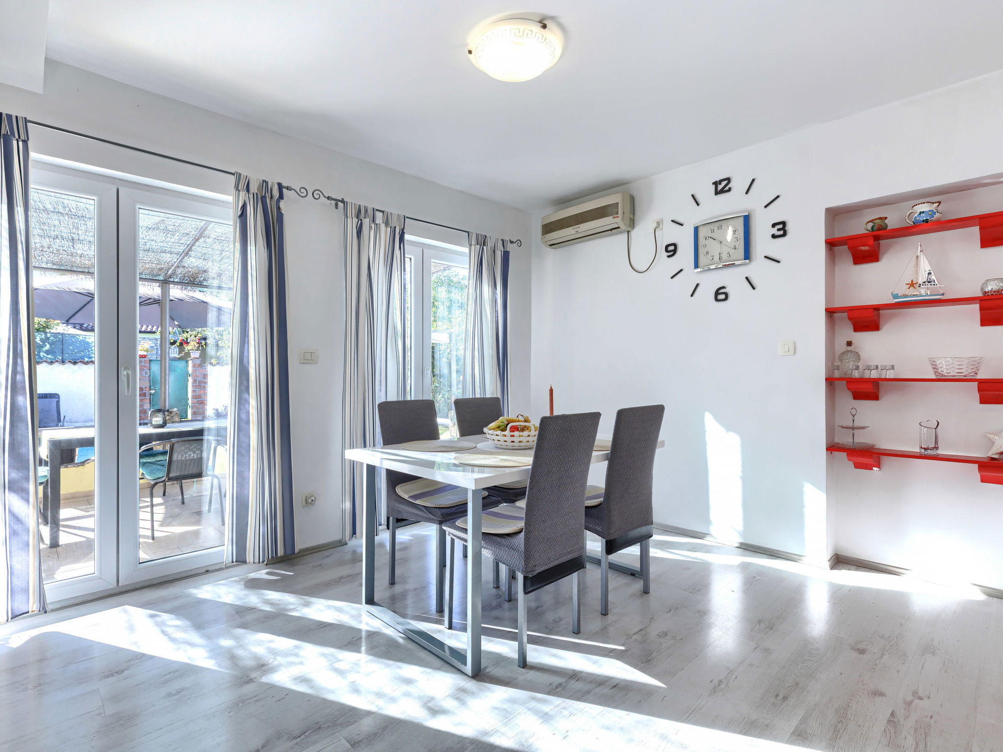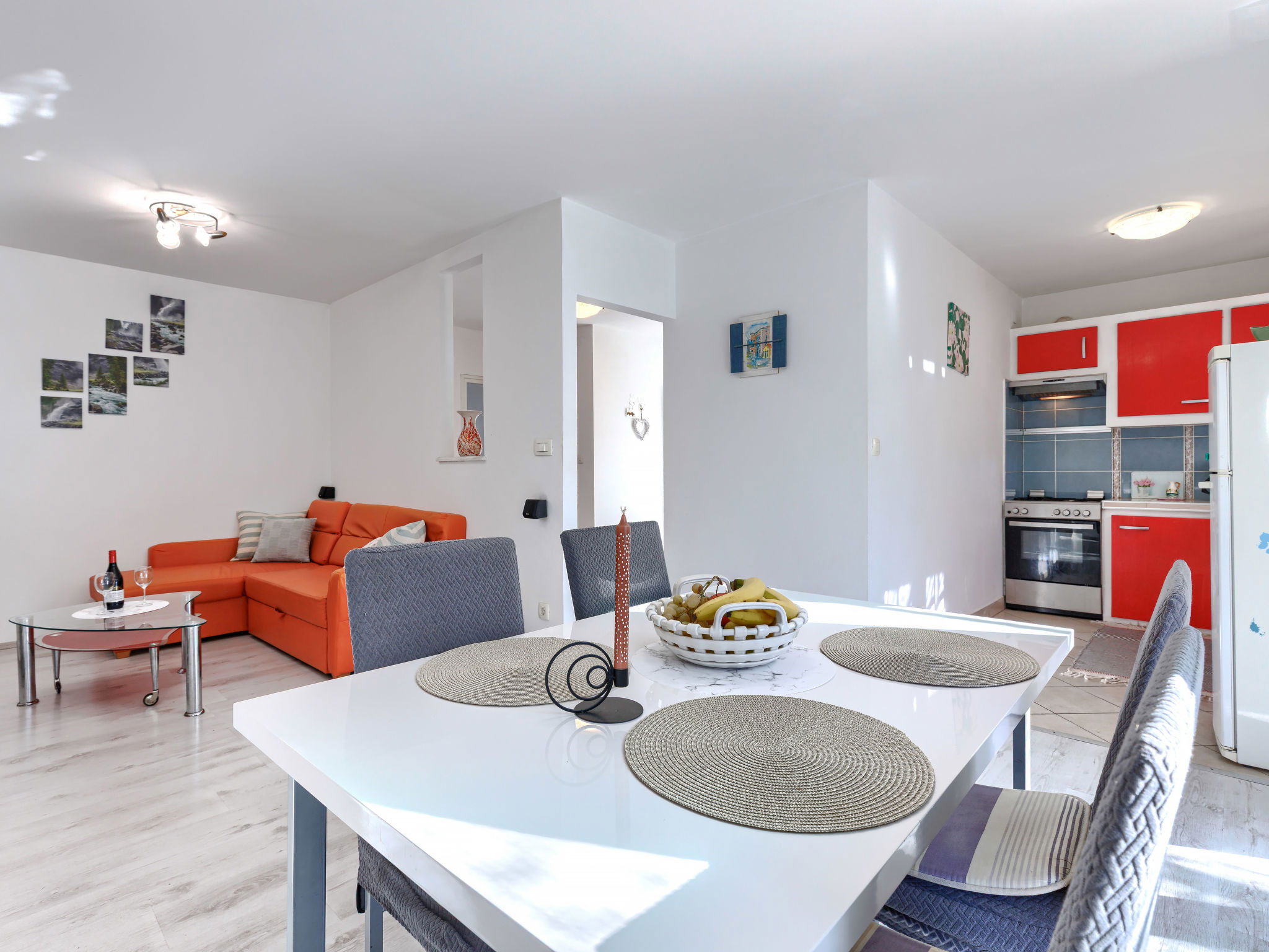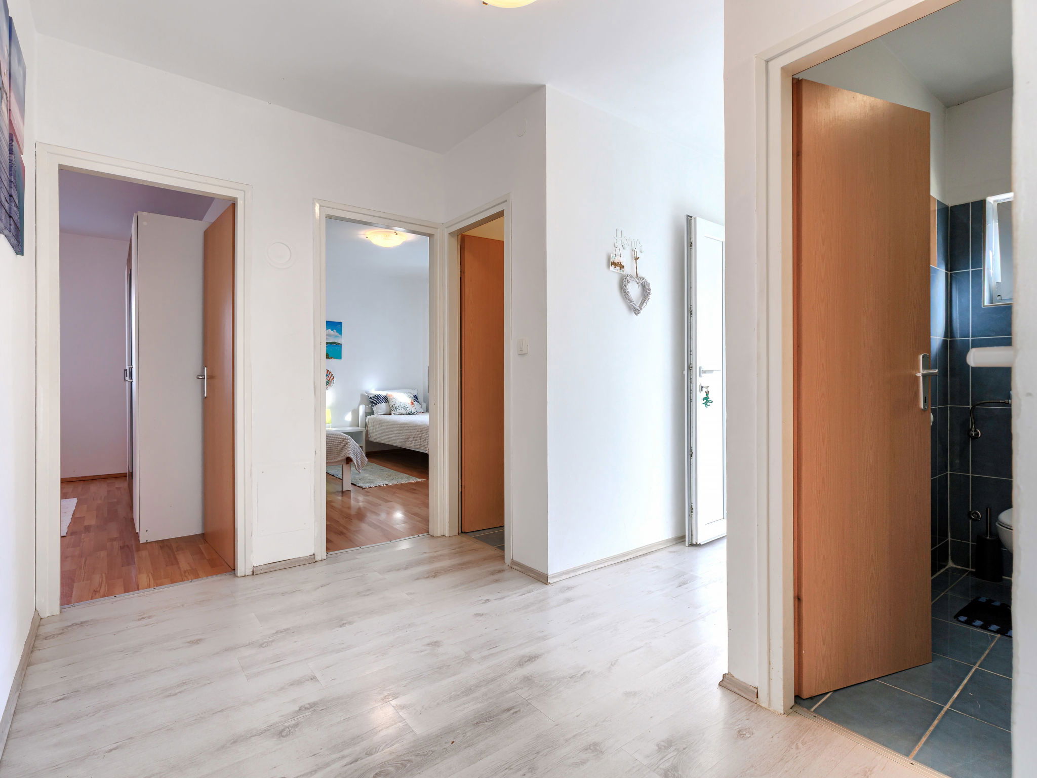 3-room house 70 m2. Living/dining room with satellite TV and air conditioning. Exit to the terrace. 1 room with 1 french bed (180 cm, length 200 cm). 1 room with 2 beds (90 cm, length 200 cm). Open kitchen (1 hot plate, oven, 3 gas rings, toaster, kettle, microwave, freezer, electric coffee machine). Shower/WC, sep. WC. No heating option. Deck chairs. Facilities: iron, hair dryer. Internet (WiFi, free). Please note: non-smoking house. Maximum 2 pets/ dogs allowed.