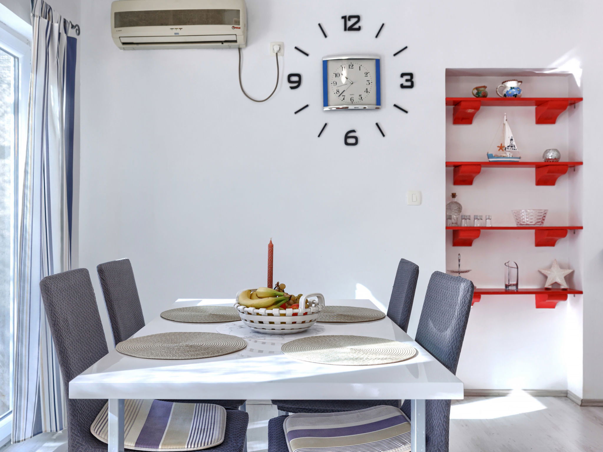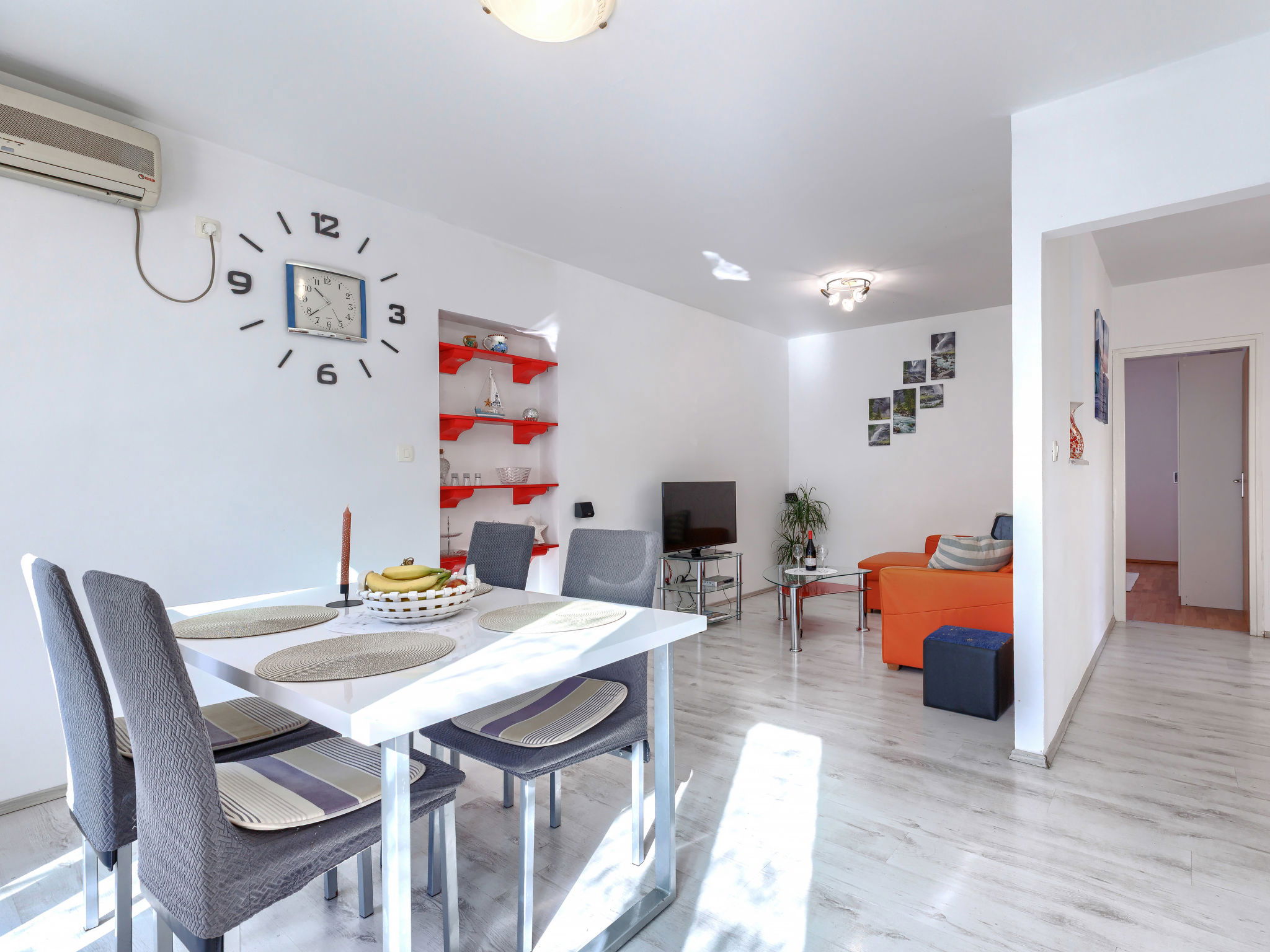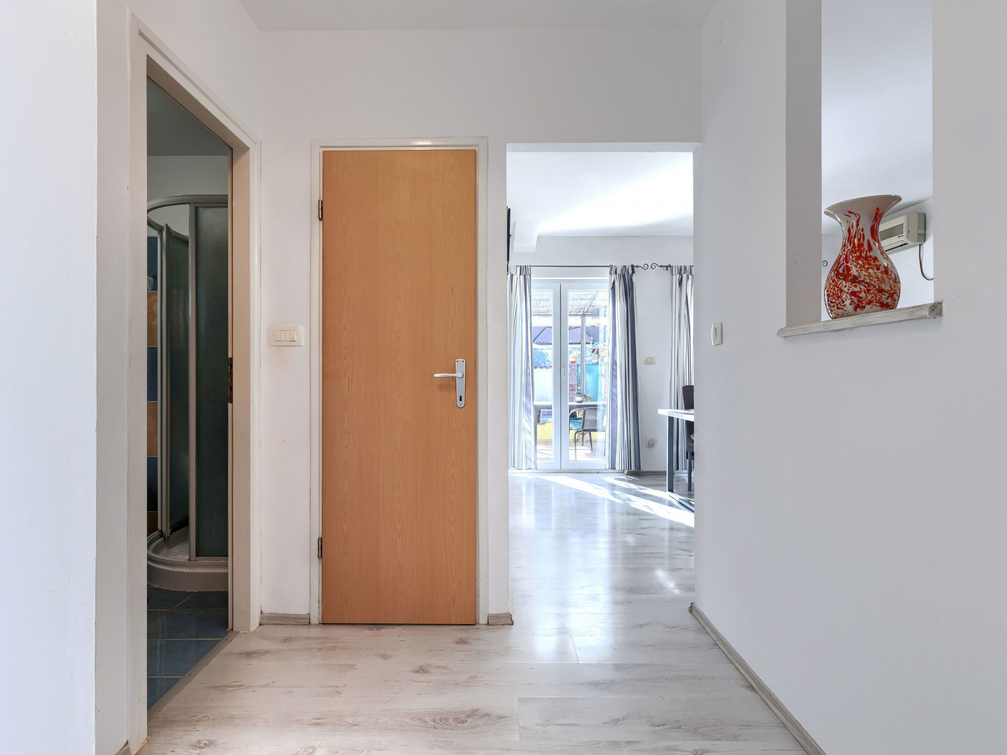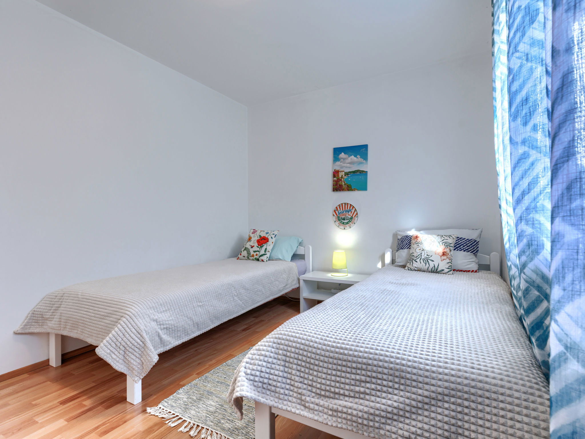 3-room house 70 m2. Living/dining room with satellite TV and air conditioning. Exit to the terrace. 1 room with 1 french bed (180 cm, length 200 cm). 1 room with 2 beds (90 cm, length 200 cm). Open kitchen (1 hot plate, oven, 3 gas rings, toaster, kettle, microwave, freezer, electric coffee machine). Shower/WC, sep. WC. No heating option. Deck chairs. Facilities: iron, hair dryer. Internet (WiFi, free). Please note: non-smoking house. Maximum 2 pets/ dogs allowed.