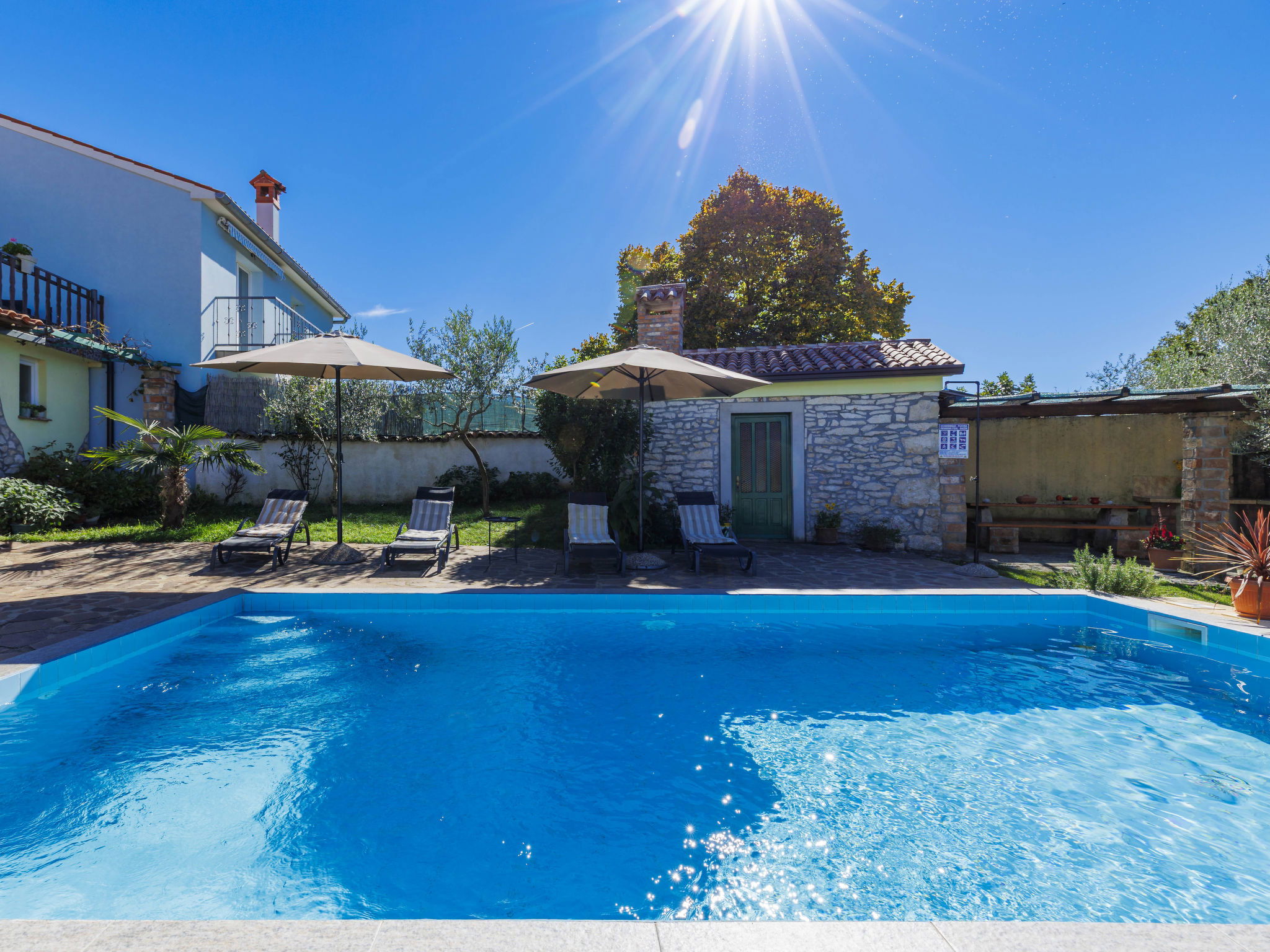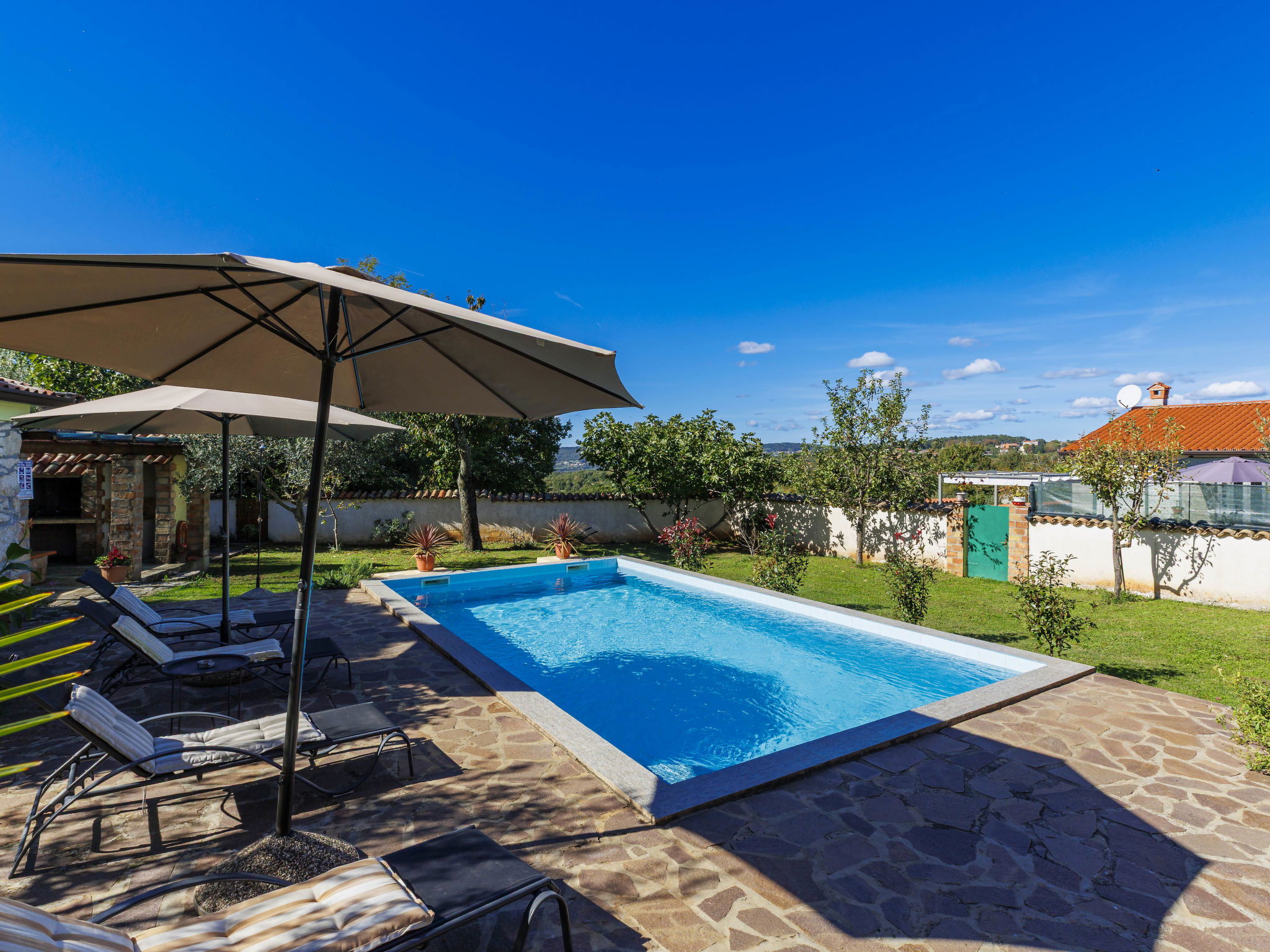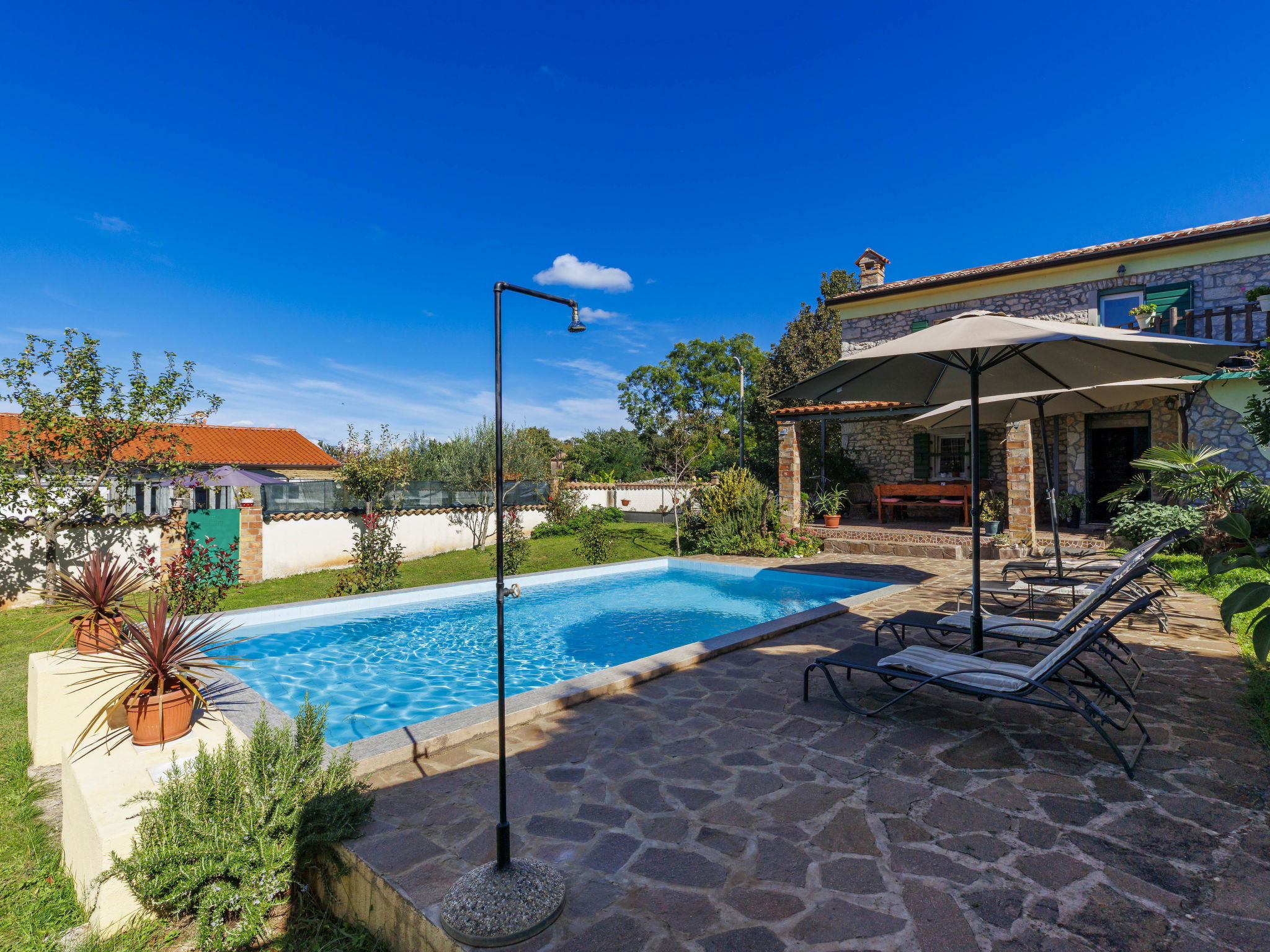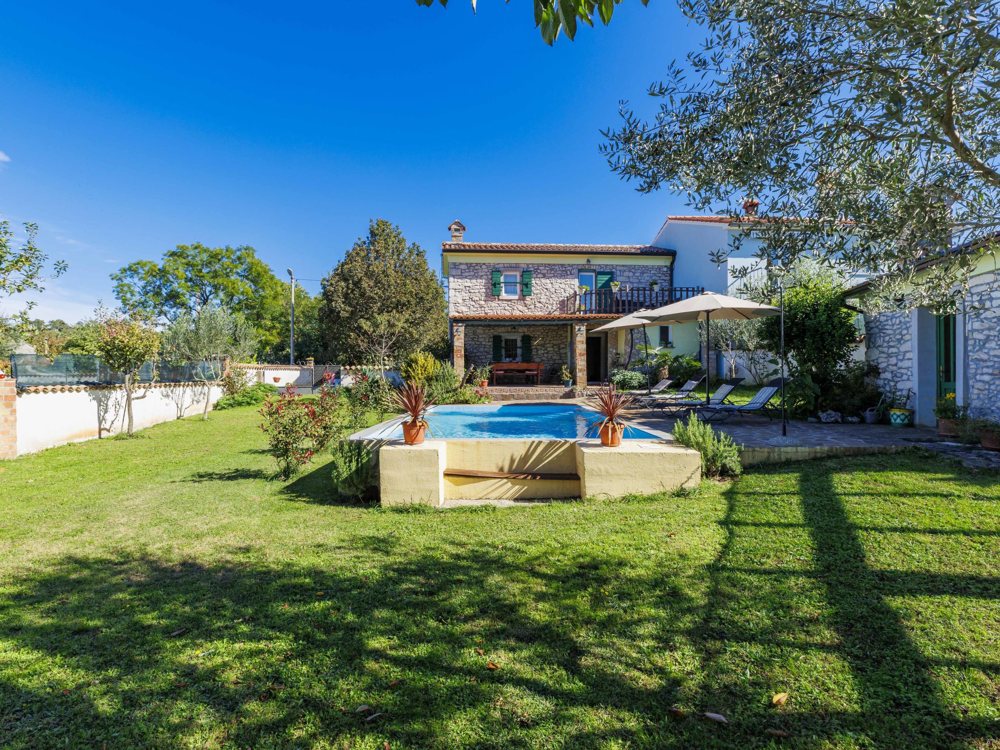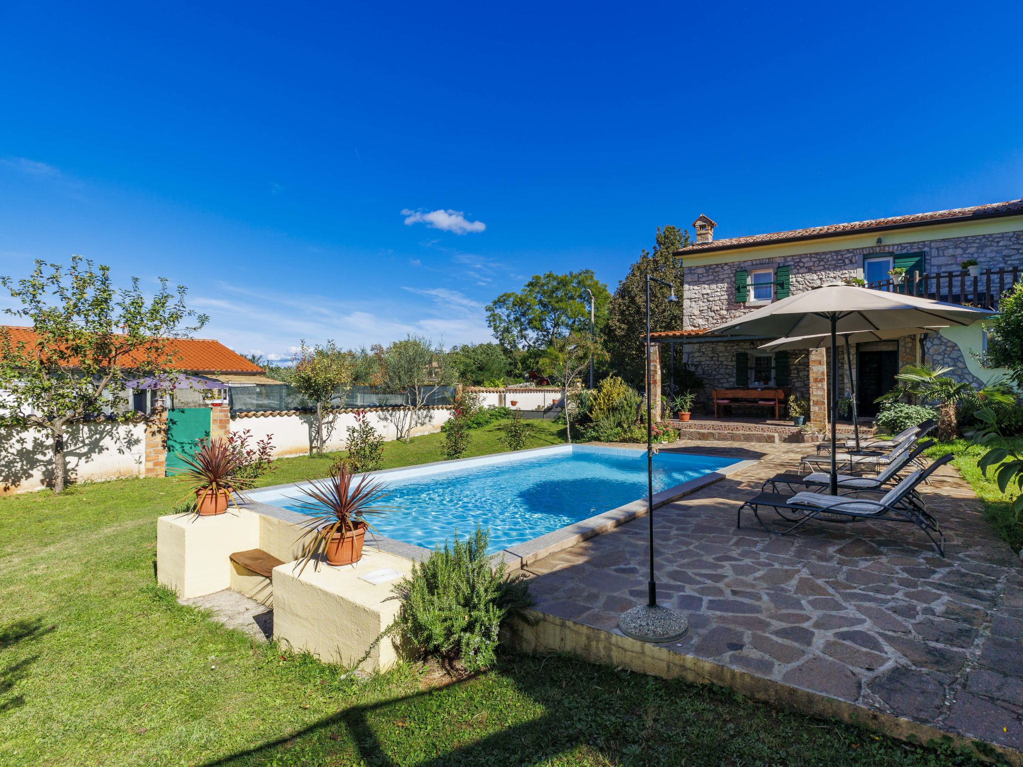 Rustic semi-detached house "Marija", 2 storeys. In the hamlet Markoci 7 km from the centre of Labin, 12 km from the centre of Rabac, 12 km from the sea, 12 km from the beach, in the countryside. Private: property 500 m2 (fenced), lawn and wildlife garden, swimming pool angular (7 x 4 m, depth 140 cm, seasonal availability: 01.Apr. - 30.Oct.) with internal staircase. Outdoor shower, terrace (20 m2), garden furniture, barbecue, pool maintenance by the owner/gardener. In the house: internet access, washing machine. Parking (for 2 cars) at the house on the premises. Shop 2 km, supermarket 7 km, restaurant 2 km, bus stop "Labin" 7 km, pebble beach 12 km. Please note: airfield 50 km from the property.