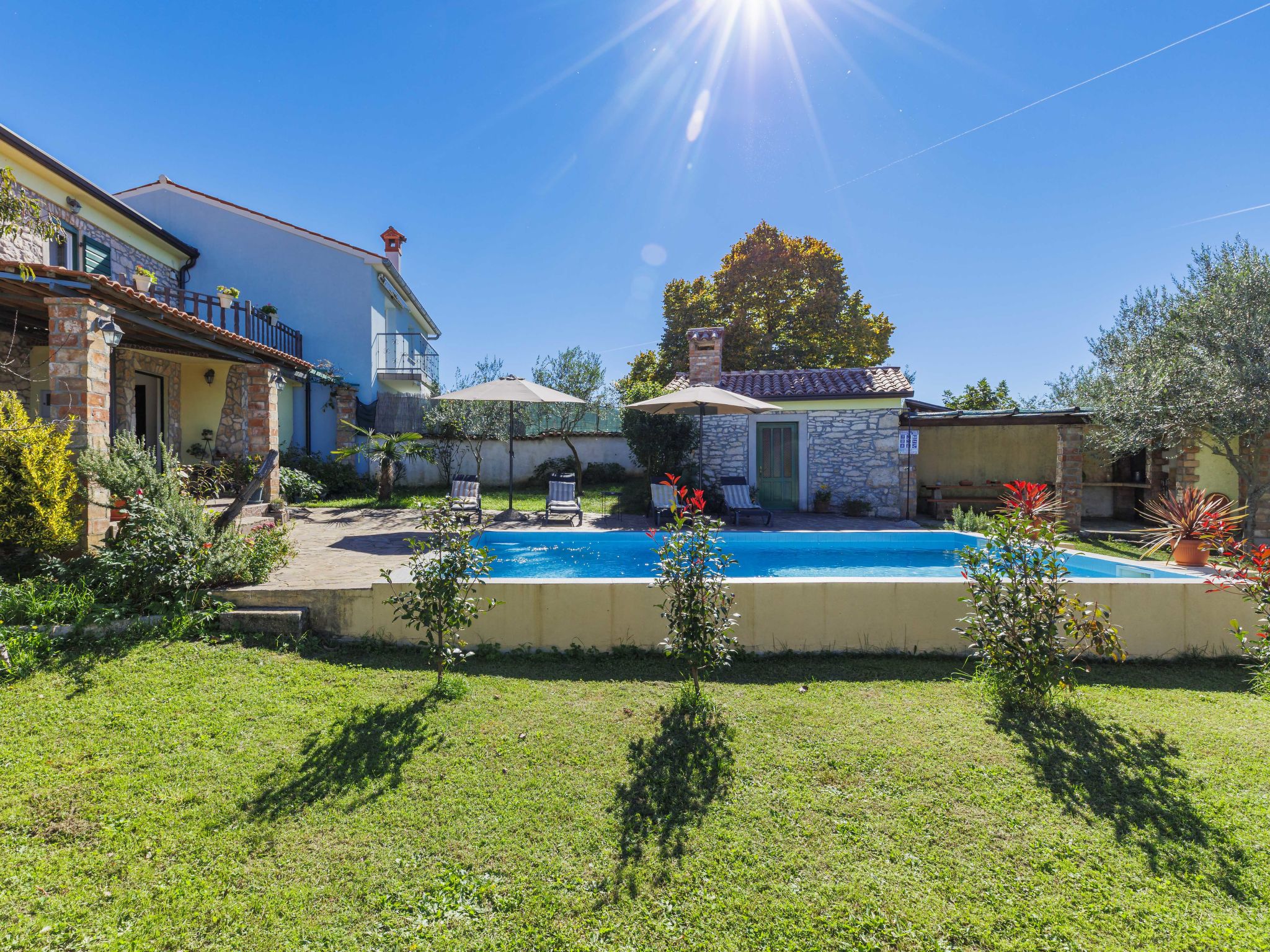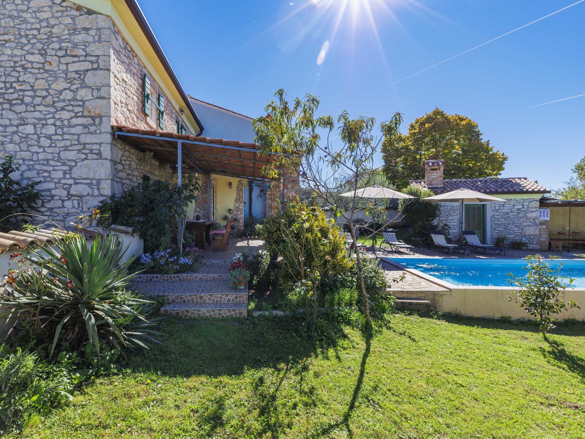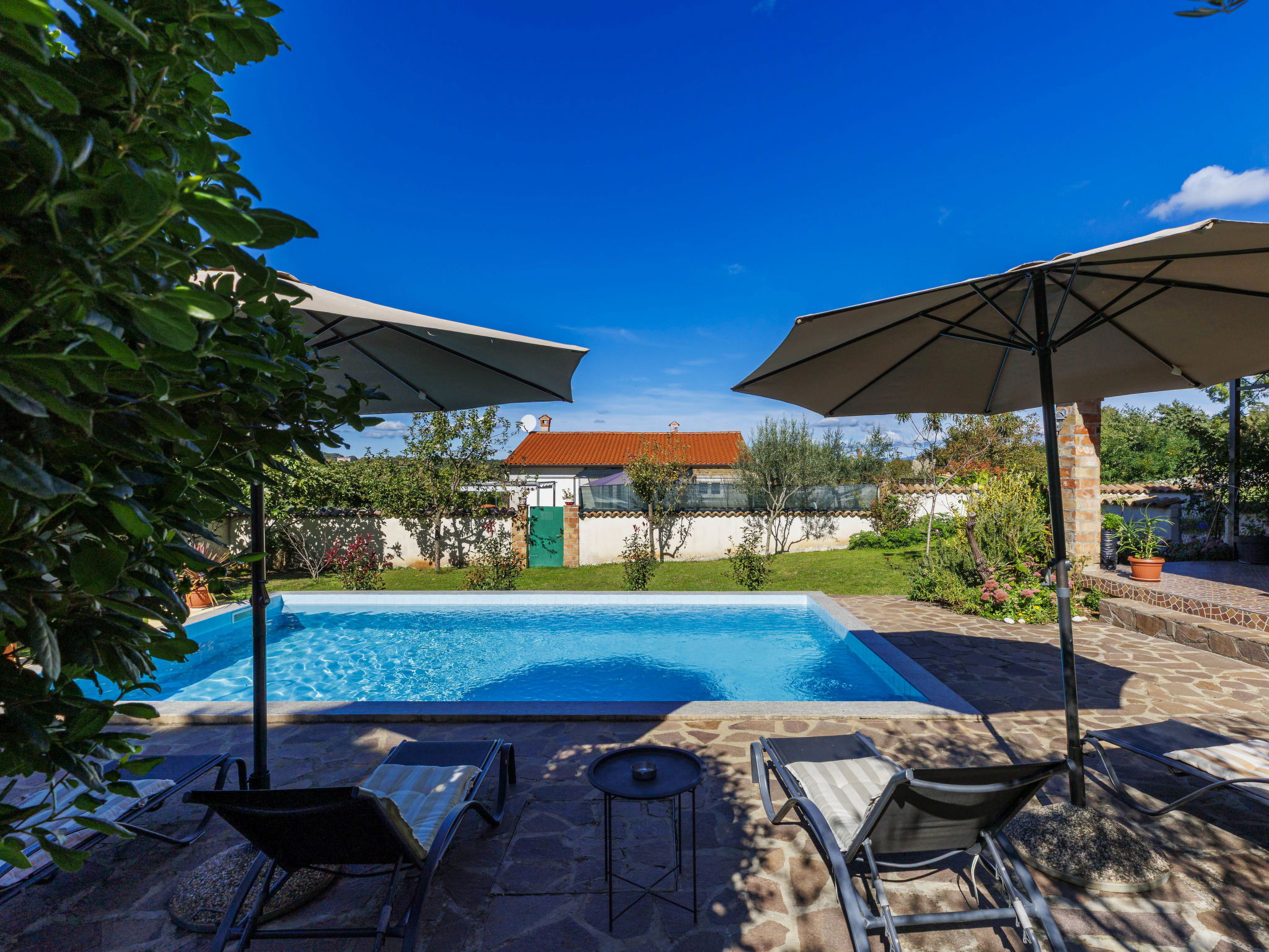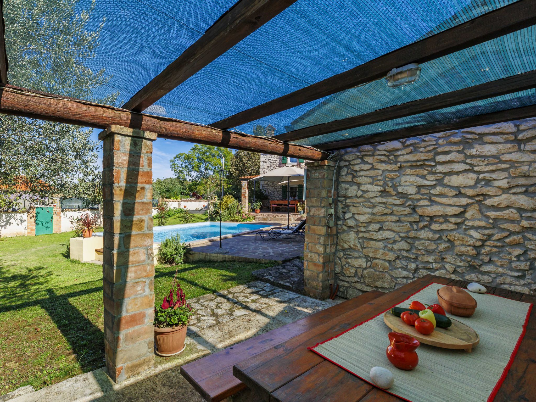 Rustic semi-detached house "Marija", 2 storeys. In the hamlet Markoci 7 km from the centre of Labin, 12 km from the centre of Rabac, 12 km from the sea, 12 km from the beach, in the countryside. Private: property 500 m2 (fenced), lawn and wildlife garden, swimming pool angular (7 x 4 m, depth 140 cm, seasonal availability: 01.Apr. - 30.Oct.) with internal staircase. Outdoor shower, terrace (20 m2), garden furniture, barbecue, pool maintenance by the owner/gardener. In the house: internet access, washing machine. Parking (for 2 cars) at the house on the premises. Shop 2 km, supermarket 7 km, restaurant 2 km, bus stop "Labin" 7 km, pebble beach 12 km. Please note: airfield 50 km from the property.