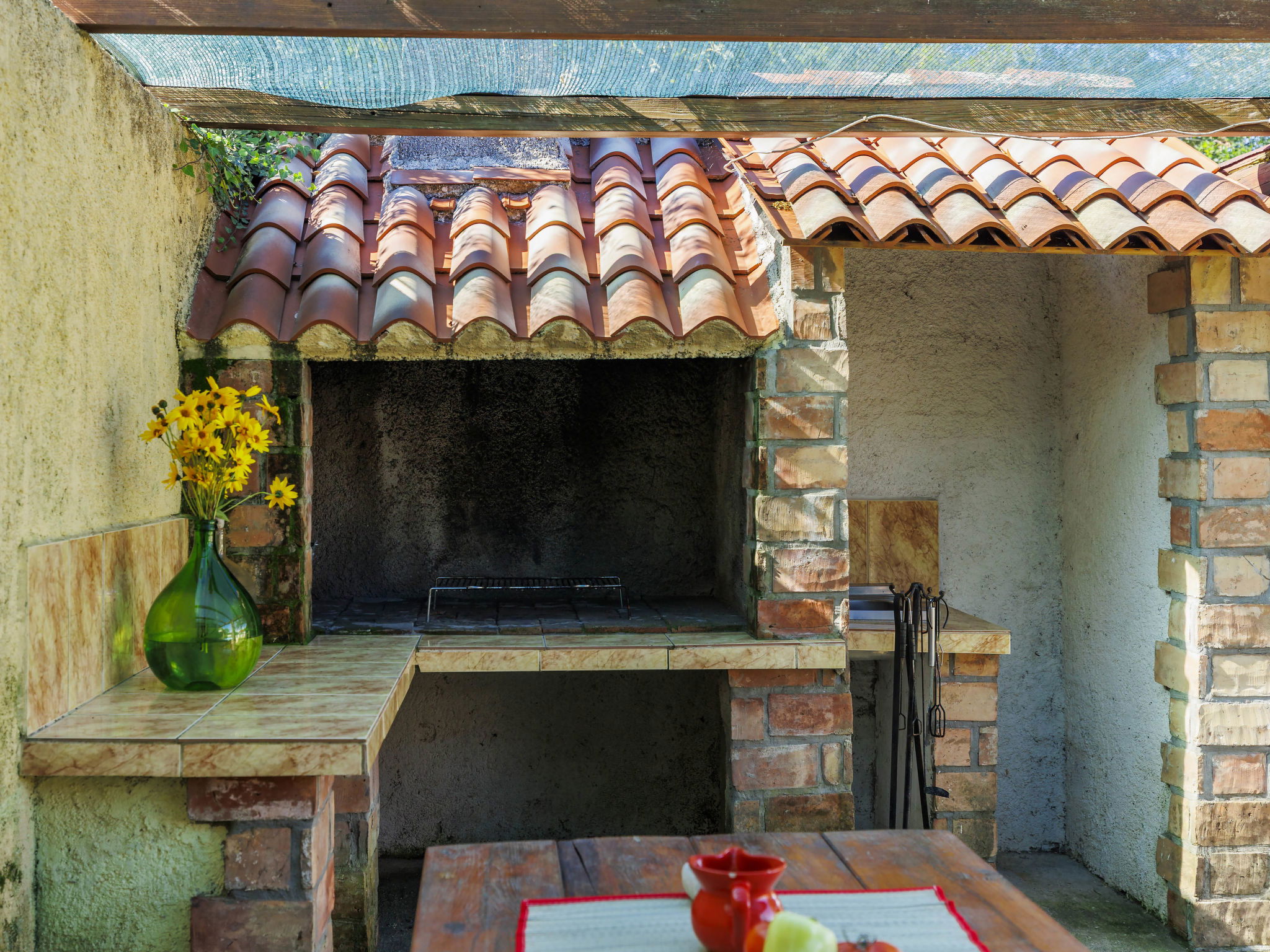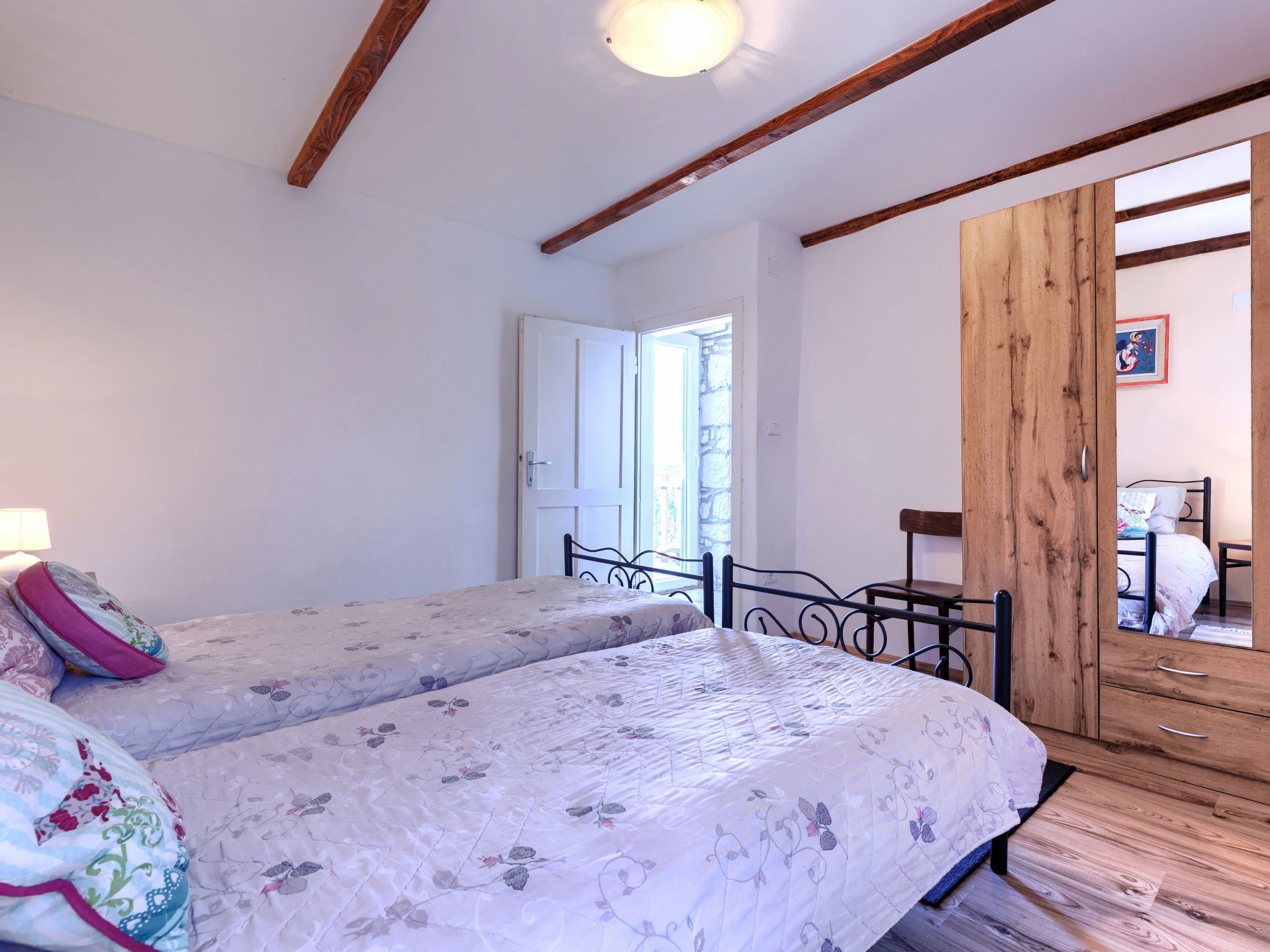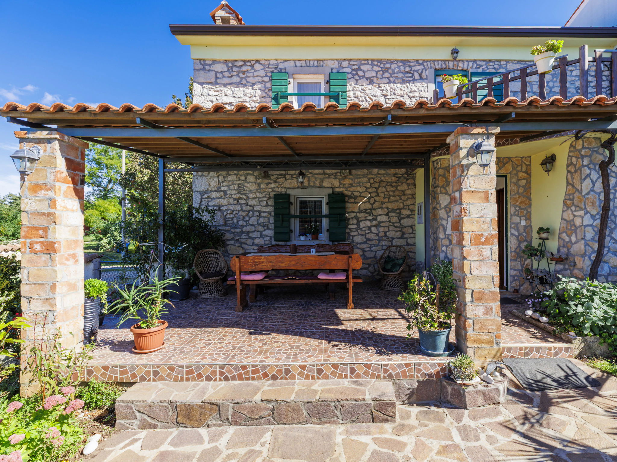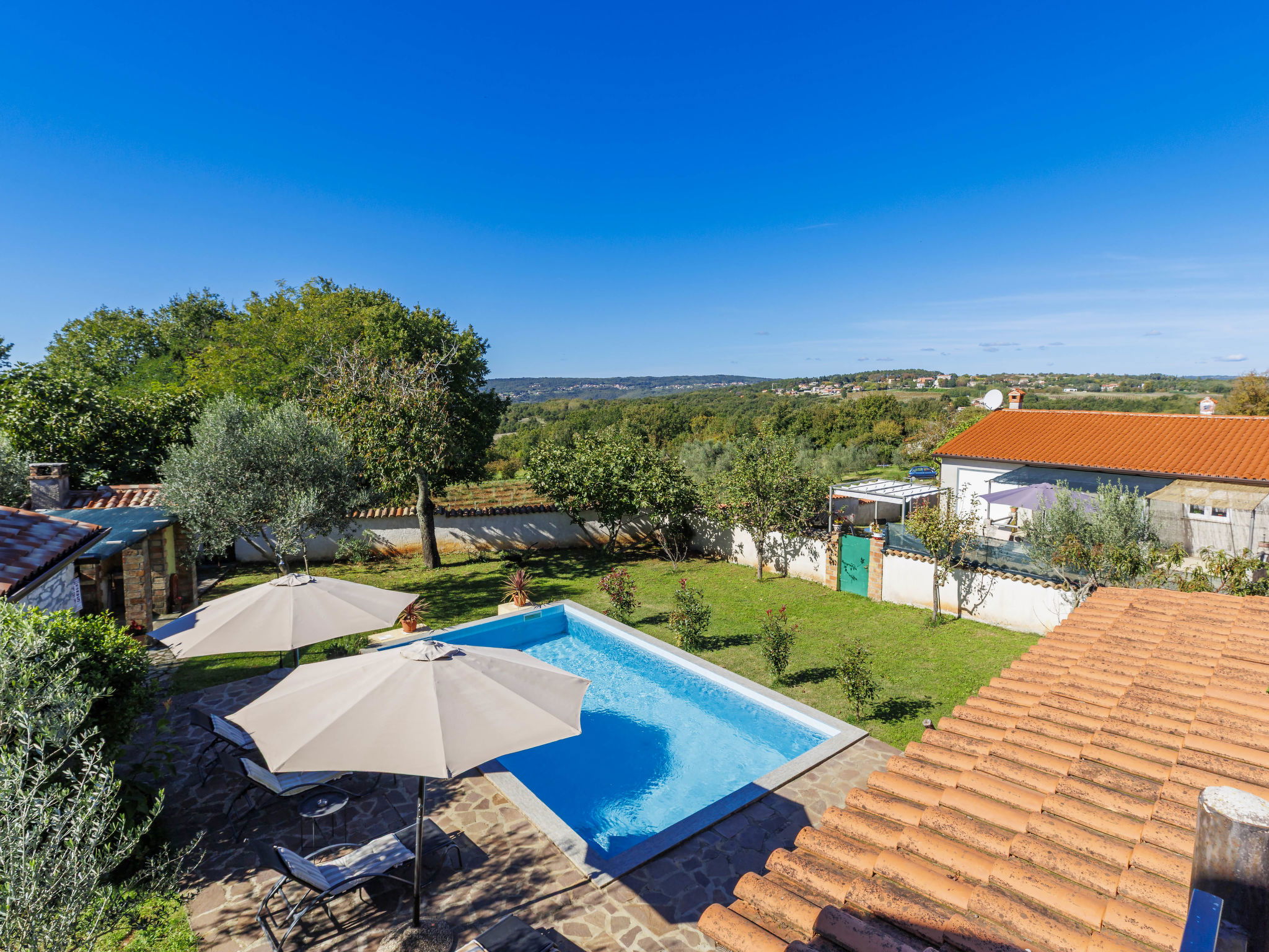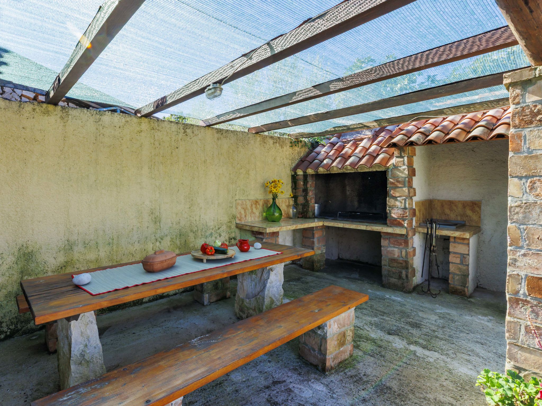 Rustic semi-detached house "Marija", 2 storeys. In the hamlet Markoci 7 km from the centre of Labin, 12 km from the centre of Rabac, 12 km from the sea, 12 km from the beach, in the countryside. Private: property 500 m2 (fenced), lawn and wildlife garden, swimming pool angular (7 x 4 m, depth 140 cm, seasonal availability: 01.Apr. - 30.Oct.) with internal staircase. Outdoor shower, terrace (20 m2), garden furniture, barbecue, pool maintenance by the owner/gardener. In the house: internet access, washing machine. Parking (for 2 cars) at the house on the premises. Shop 2 km, supermarket 7 km, restaurant 2 km, bus stop "Labin" 7 km, pebble beach 12 km. Please note: airfield 50 km from the property.