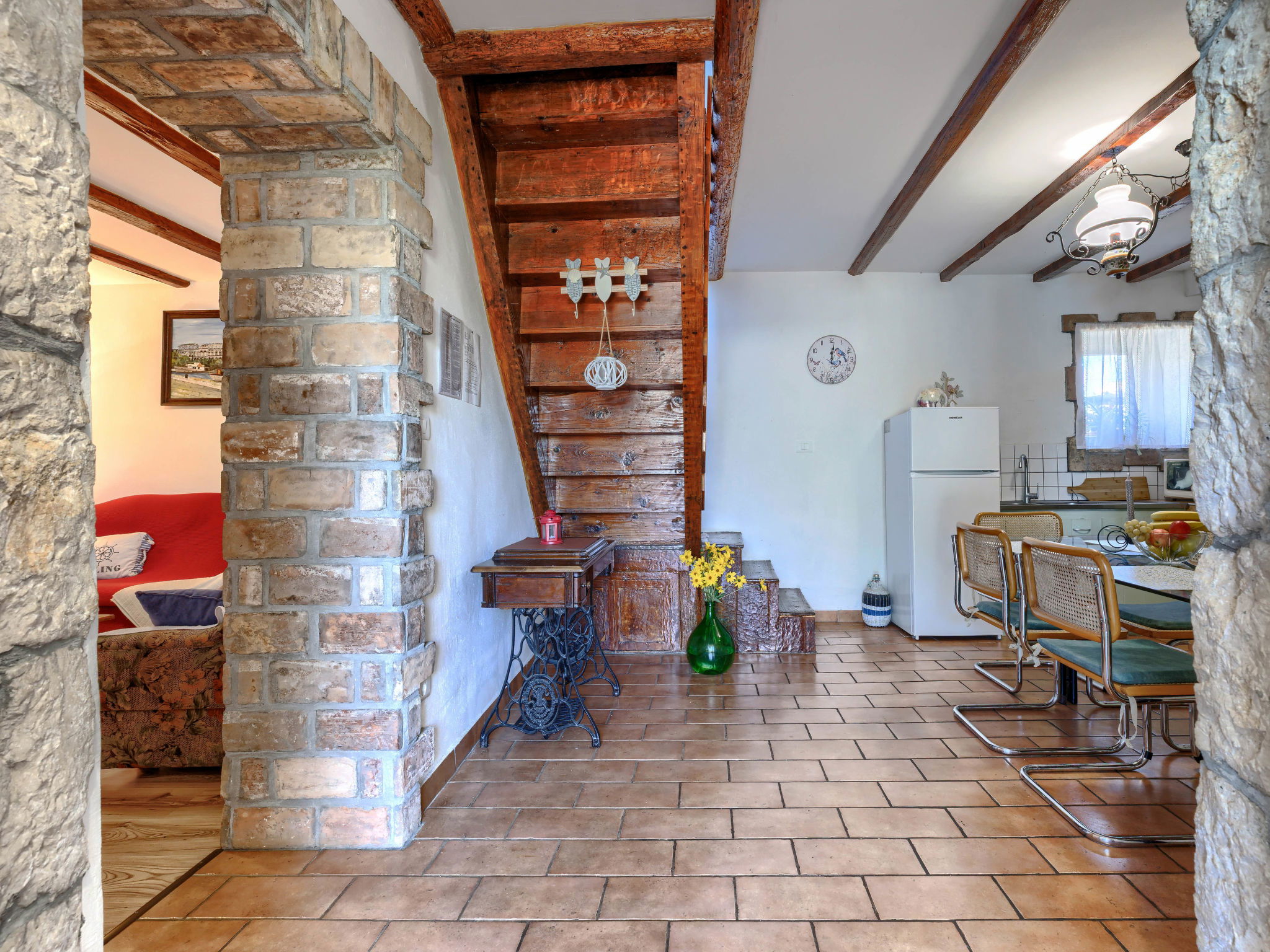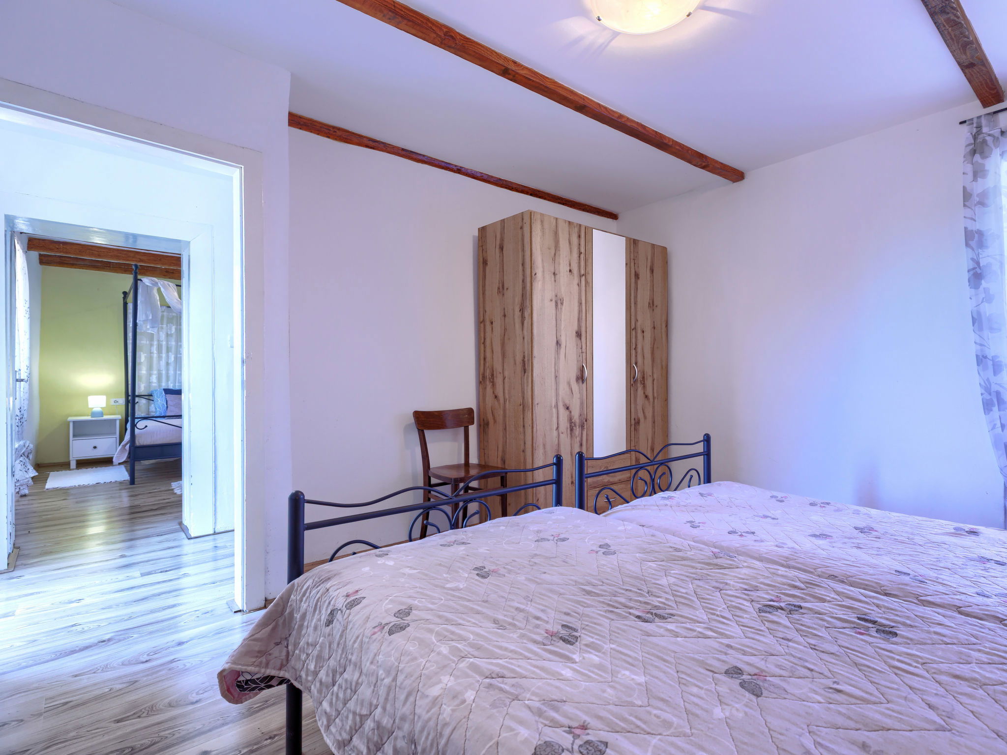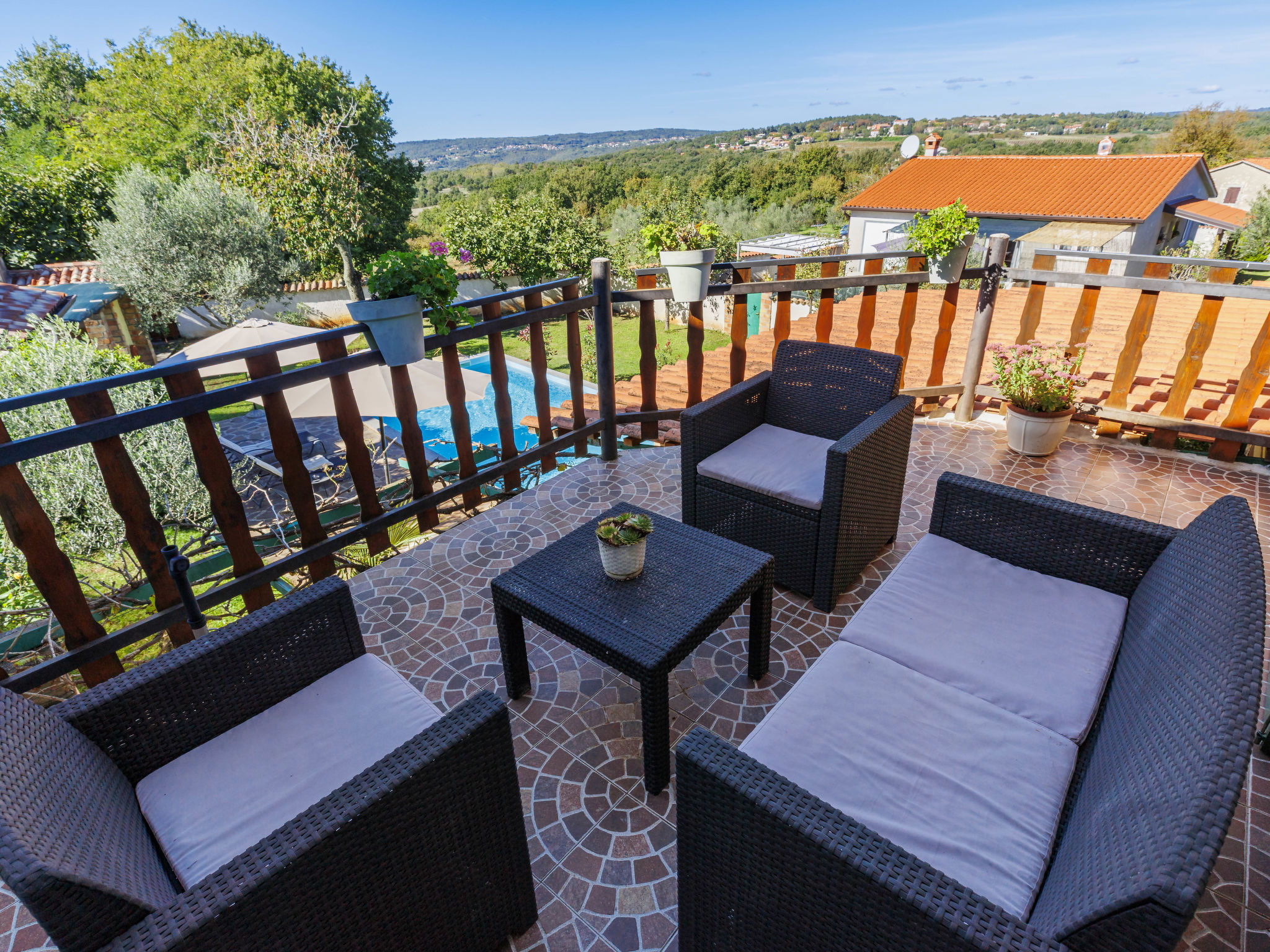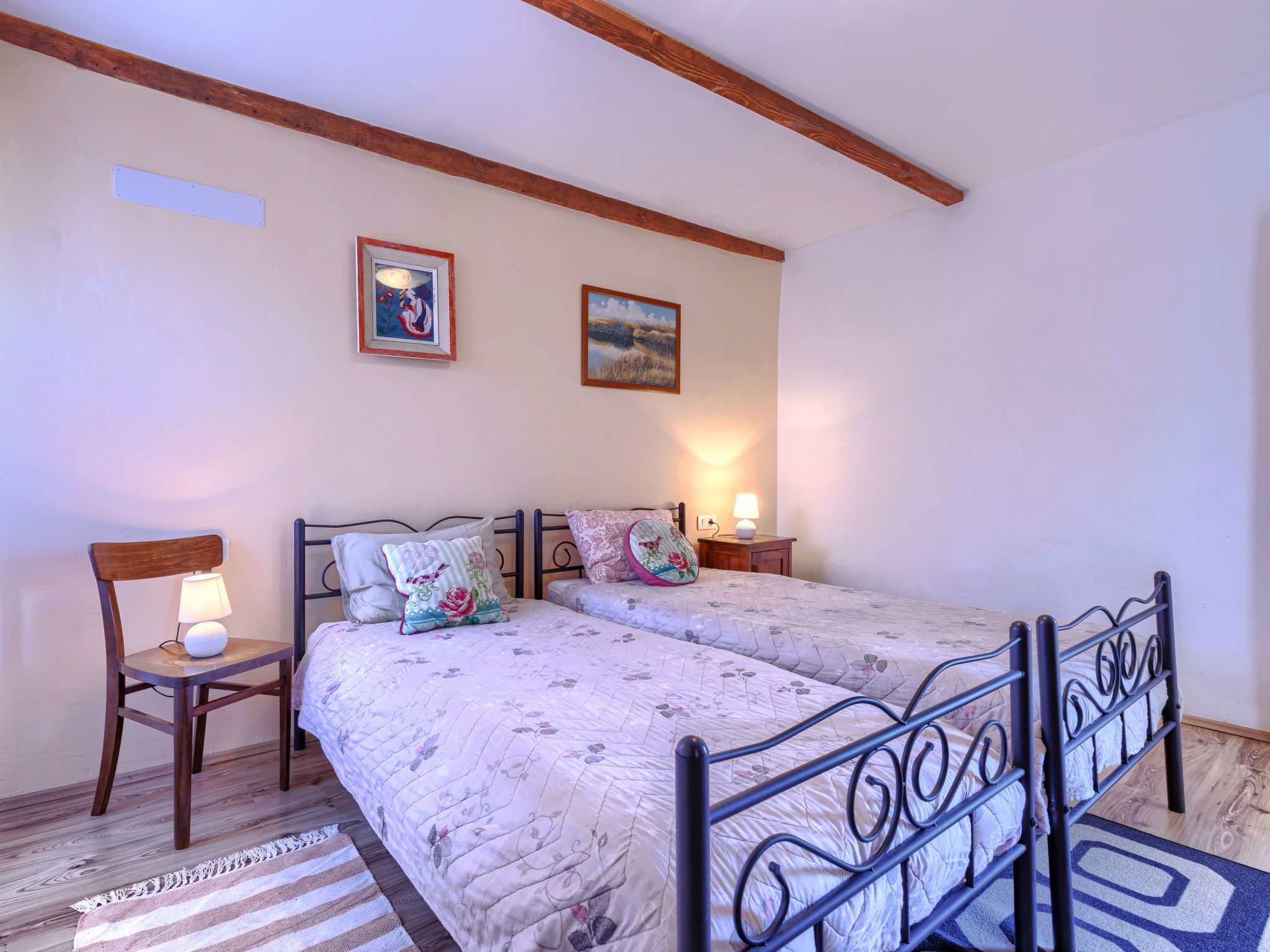 Rustic semi-detached house "Marija", 2 storeys. In the hamlet Markoci 7 km from the centre of Labin, 12 km from the centre of Rabac, 12 km from the sea, 12 km from the beach, in the countryside. Private: property 500 m2 (fenced), lawn and wildlife garden, swimming pool angular (7 x 4 m, depth 140 cm, seasonal availability: 01.Apr. - 30.Oct.) with internal staircase. Outdoor shower, terrace (20 m2), garden furniture, barbecue, pool maintenance by the owner/gardener. In the house: internet access, washing machine. Parking (for 2 cars) at the house on the premises. Shop 2 km, supermarket 7 km, restaurant 2 km, bus stop "Labin" 7 km, pebble beach 12 km. Please note: airfield 50 km from the property.